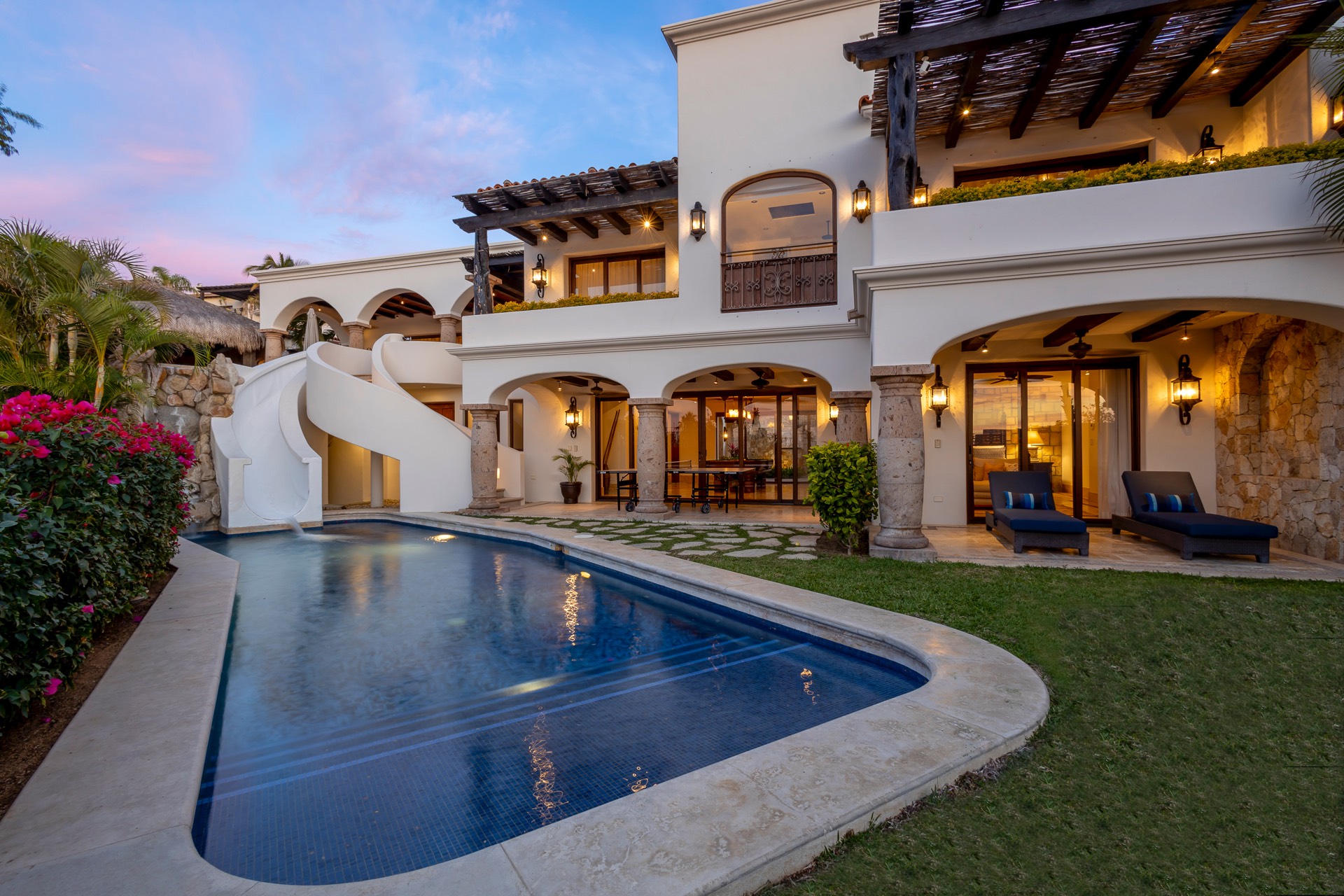 This luxurious retreat features two master bedrooms, three guest bedrooms, a dedicated kids’ room area, and a separate casita with its own kitchen and living room off the garage. Highlights include a gourmet kitchen, a butler’s kitchen, two pools with a water slide and swim-up Palapa pool bar, a poolside Palapa living area, and an oversized fire pit area perfect for evening gatherings. Guests can enjoy quality time with family and friends in the game room with a pool table and media room, ensuring endless entertainment options for all ages. Whether planning a large family vacation or a corporate retreat, Casa JoJo offers the perfect blend of comfort and sophistication.