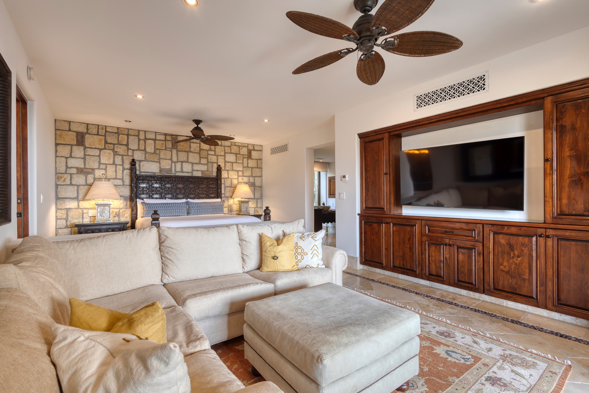 In the lower junior main bedroom, guests will find a king-size bed, blending luxury and coziness seamlessly.