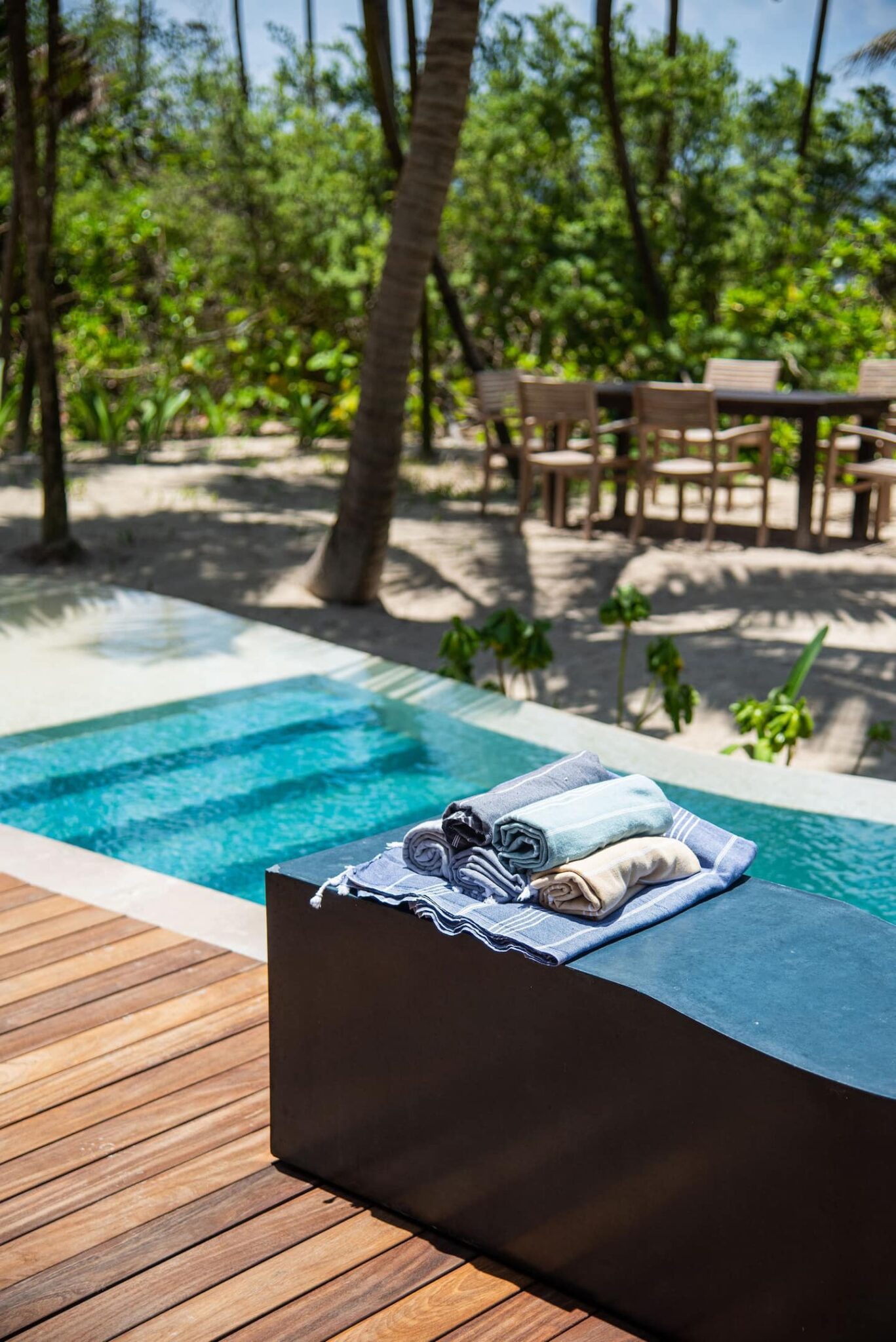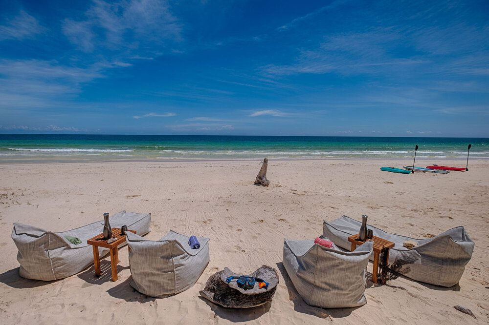 This four-bedroom residence is arranged to comfortably host families or small groups, with spaces that feel generous yet human in scale. The open-plan interiors extend outward to a broad deck and pool area, creating a continuous living environment that moves easily from inside to out. A 100-meter stretch of private beachfront anchors the property, while the overall layout balances shared gathering areas with quieter corners for retreat.