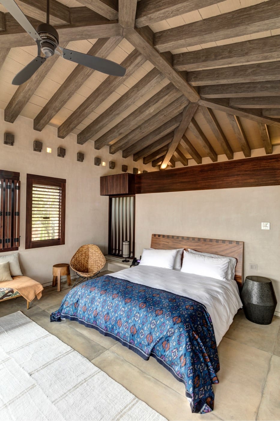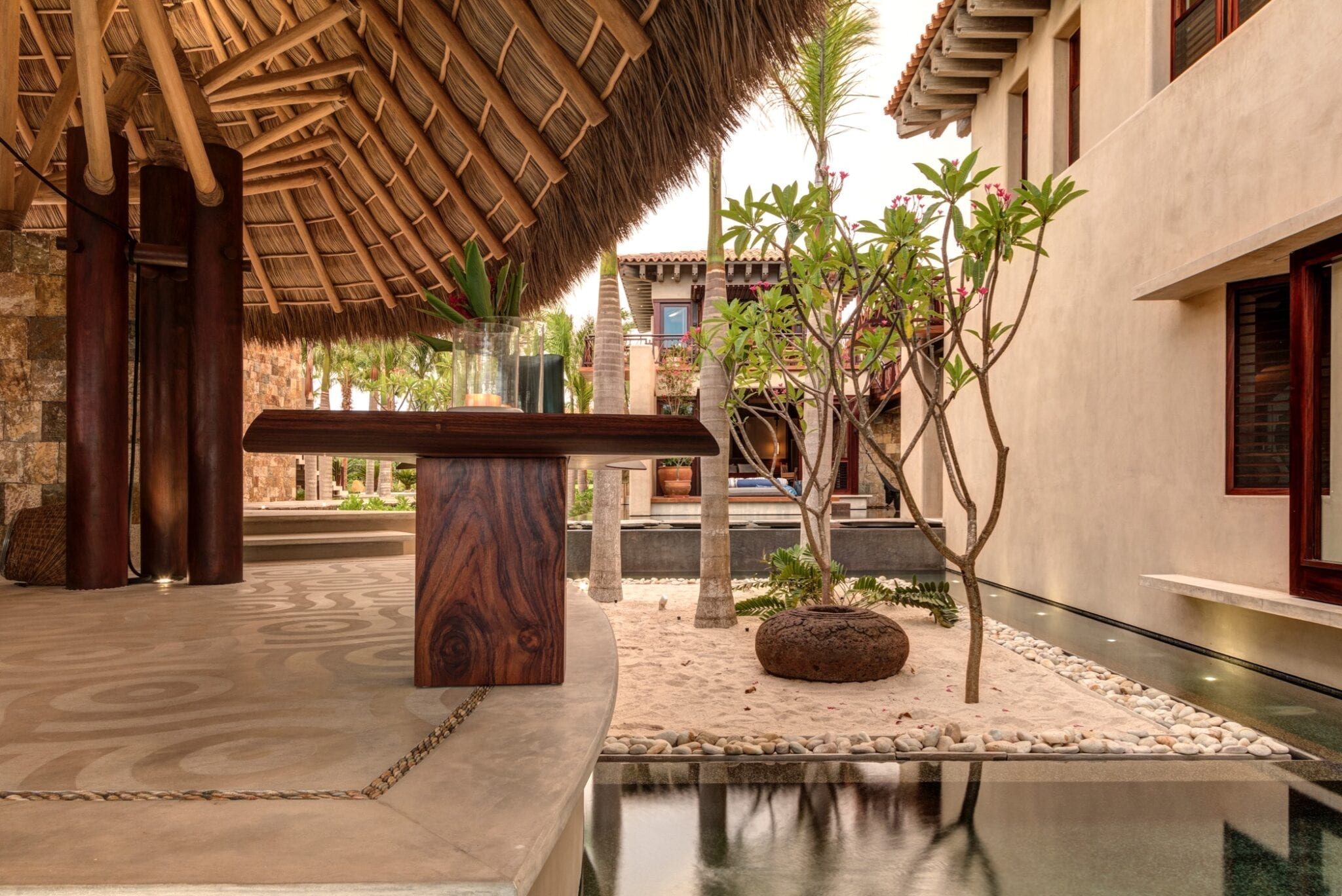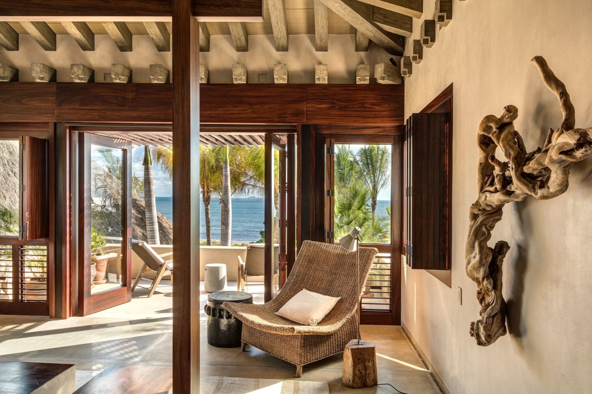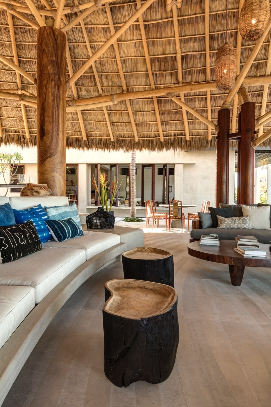 The atmosphere at Casa Koko is that of a stately outpost in an exotic corner of the world. Wooden beams and bed canopies, palm‑thatched dining spaces, and carefully curated decor create interiors that feel both warm and sophisticated. Every space is composed with impeccable taste, balancing natural textures and open-air living with a polished, high-end aesthetic.