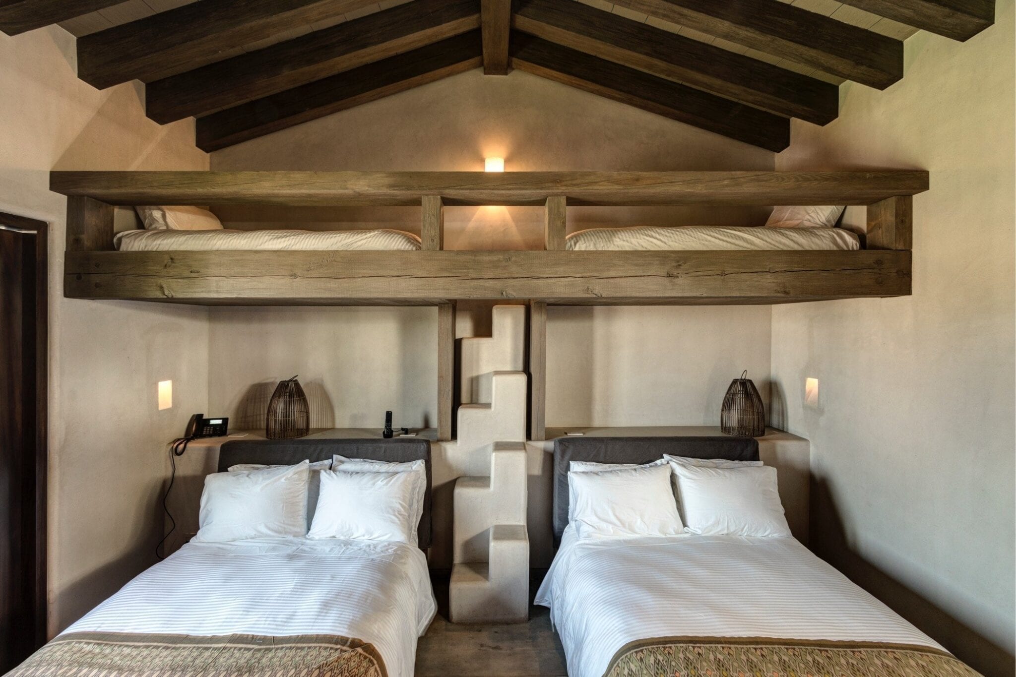 Two bunk beds and two queen-size beds. The suite features a 65” 4K flat-screen TV with SkyTV (US channels), Apple TV, Netflix, digitally controlled air-conditioning, ceiling fans, blackout curtains, and a lighting system. The ensuite bathroom includes a shower. Additional features include garden views, a high-quality independent sound system with Bluetooth and AirPlay, a Nespresso machine, robes, a safety box, and Wi-Fi access.