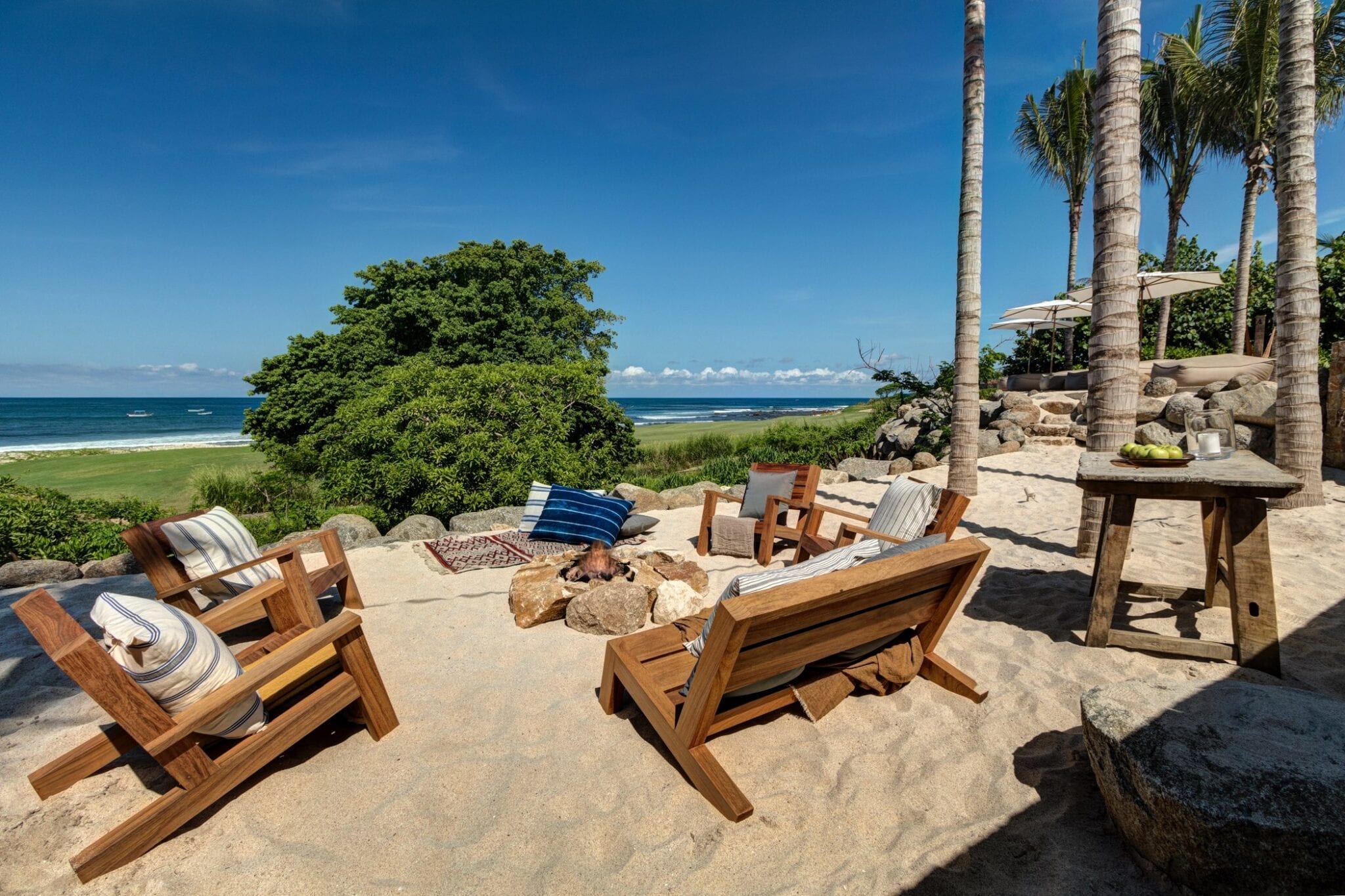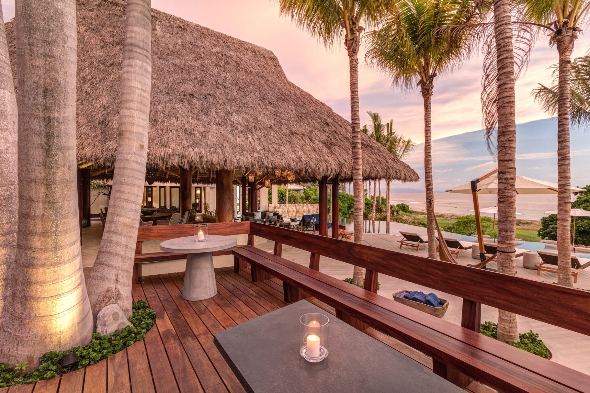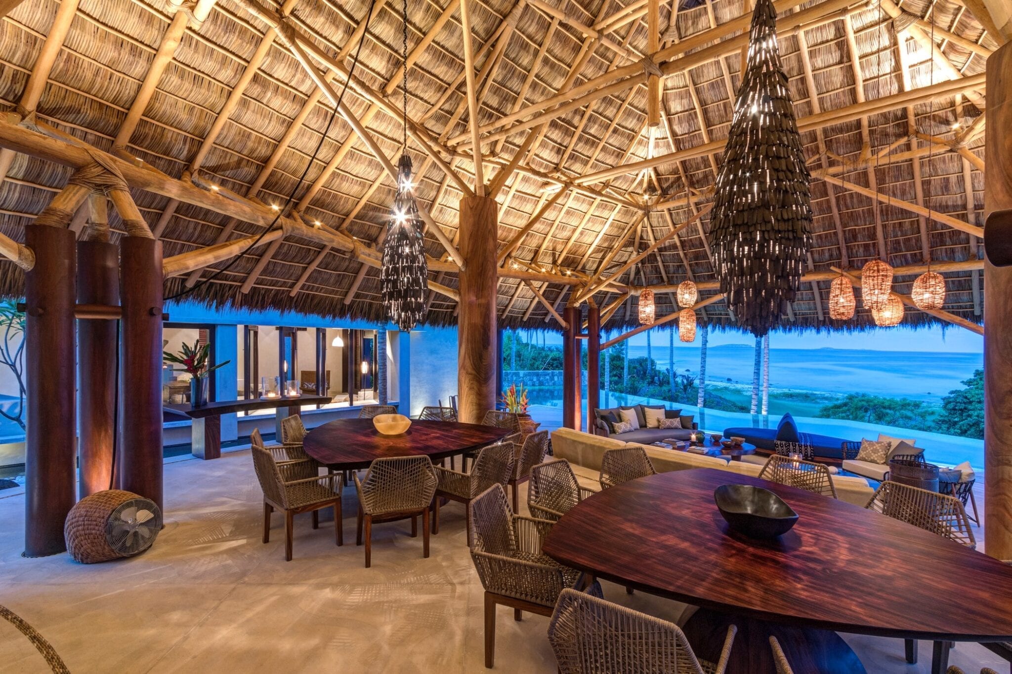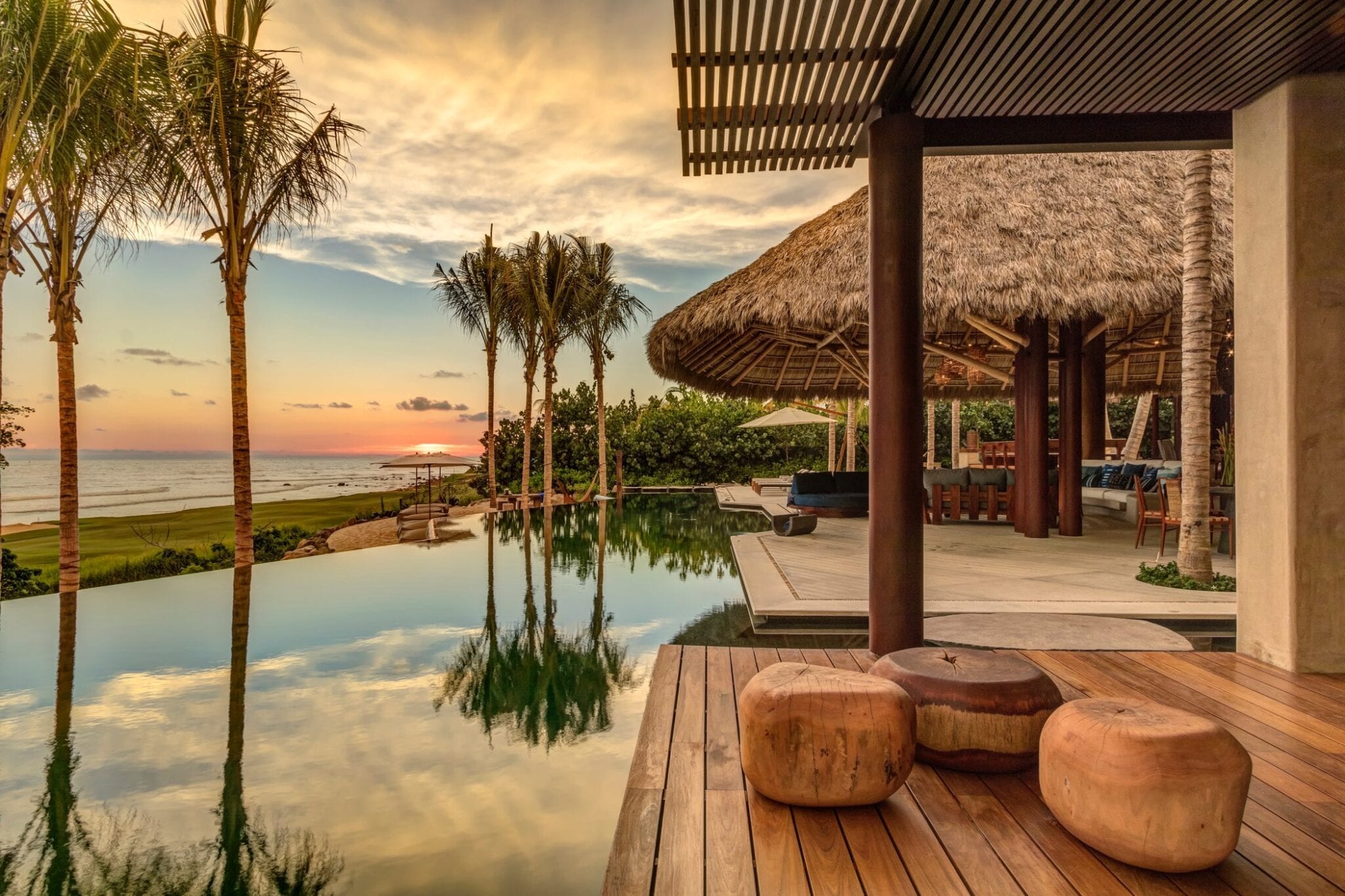 Outdoors, the infinity pool appears to spill into the ocean, blurring the boundary between the property and the coastline. A jacuzzi offers another vantage point to take in the views, while the beachside fire pit becomes a natural gathering place after sunset. The poolside palapa, with its regal proportions, anchors the outdoor living area as a dramatic yet relaxed social hub.