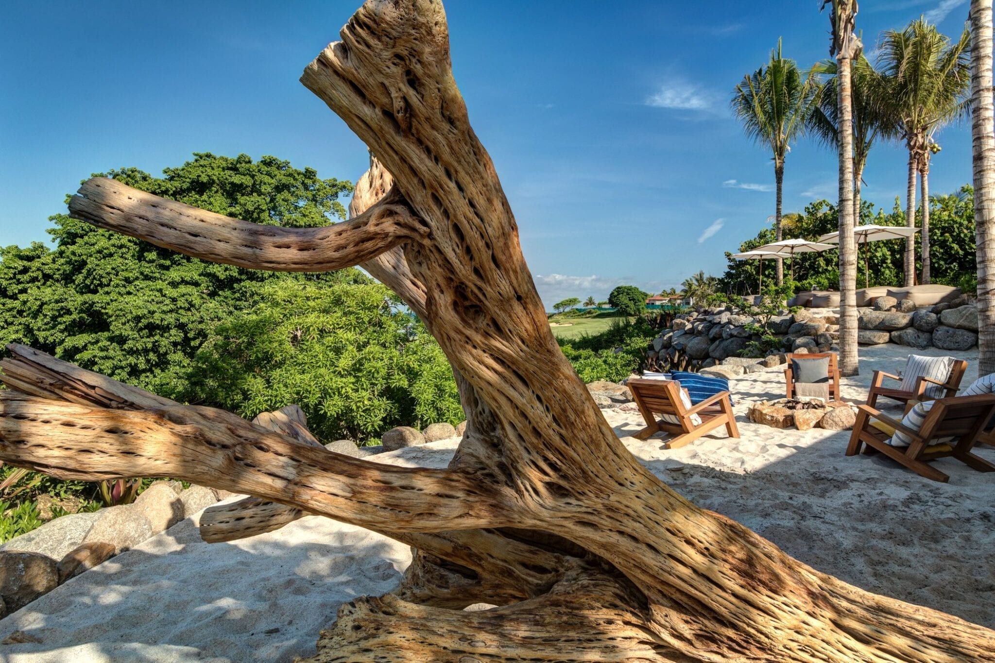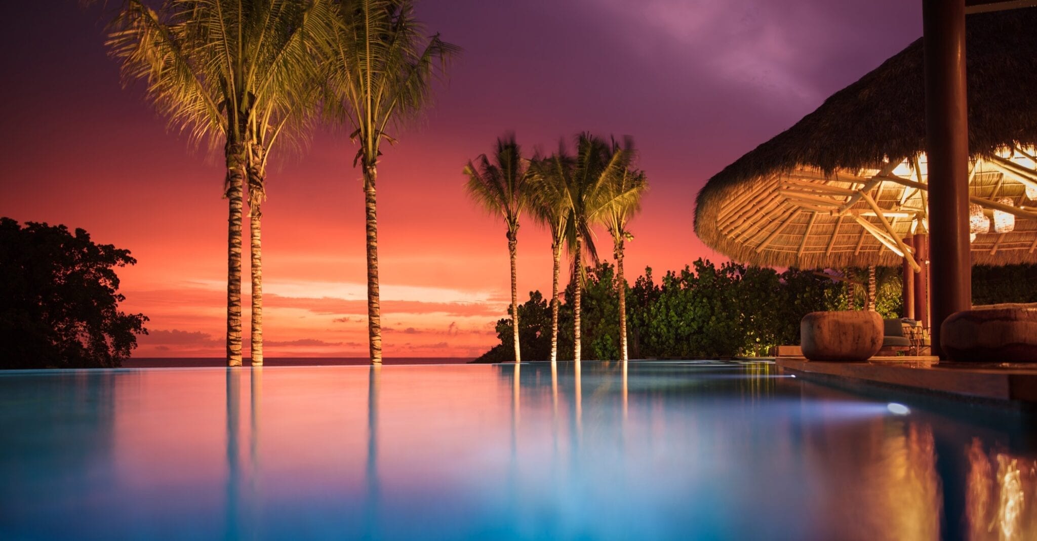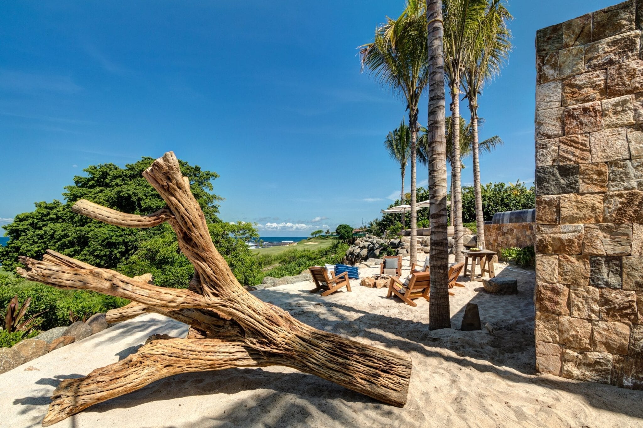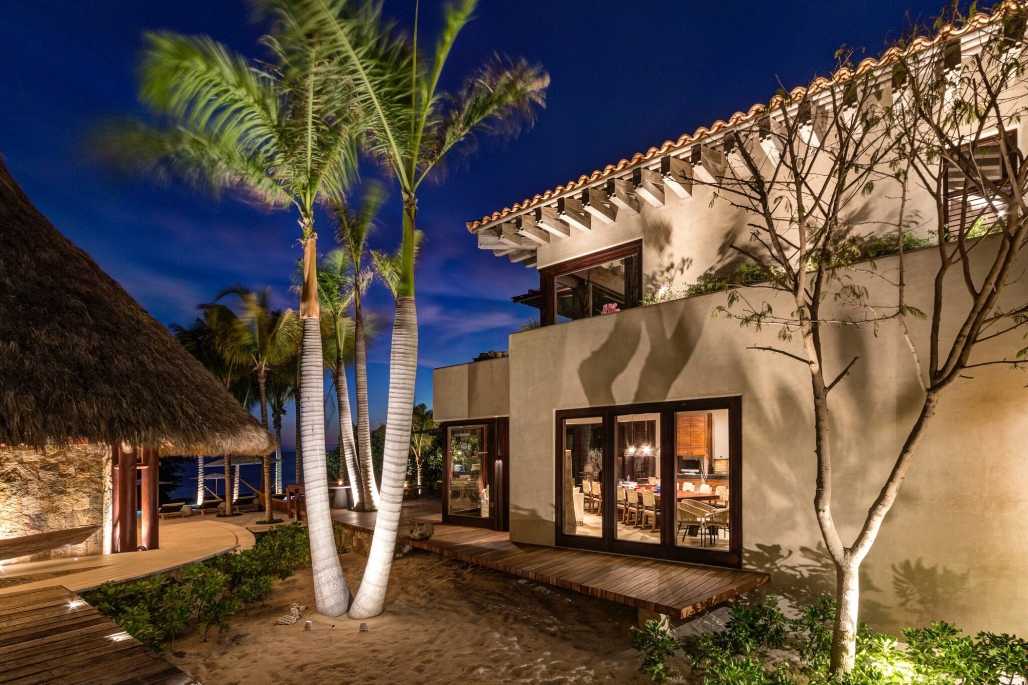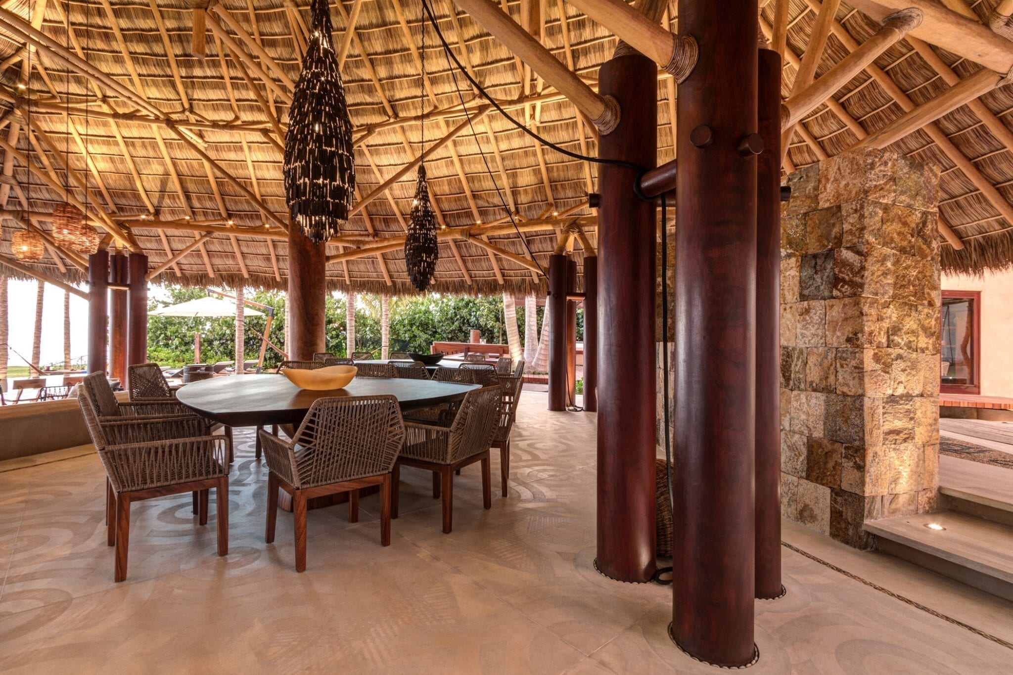 Outdoors, the infinity pool appears to spill into the ocean, blurring the boundary between the property and the coastline. A jacuzzi offers another vantage point to take in the views, while the beachside fire pit becomes a natural gathering place after sunset. The poolside palapa, with its regal proportions, anchors the outdoor living area as a dramatic yet relaxed social hub.