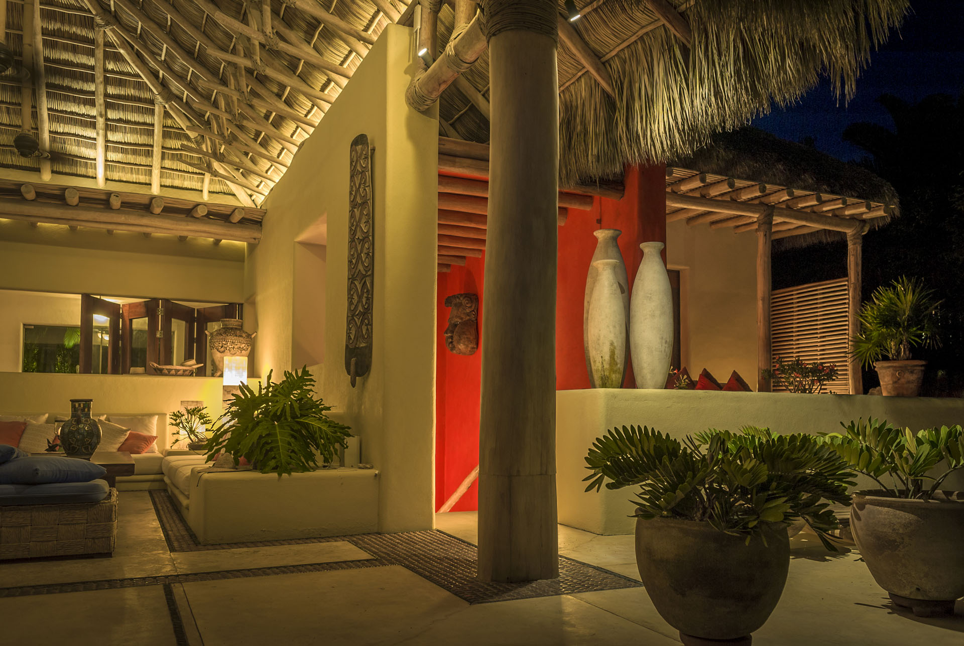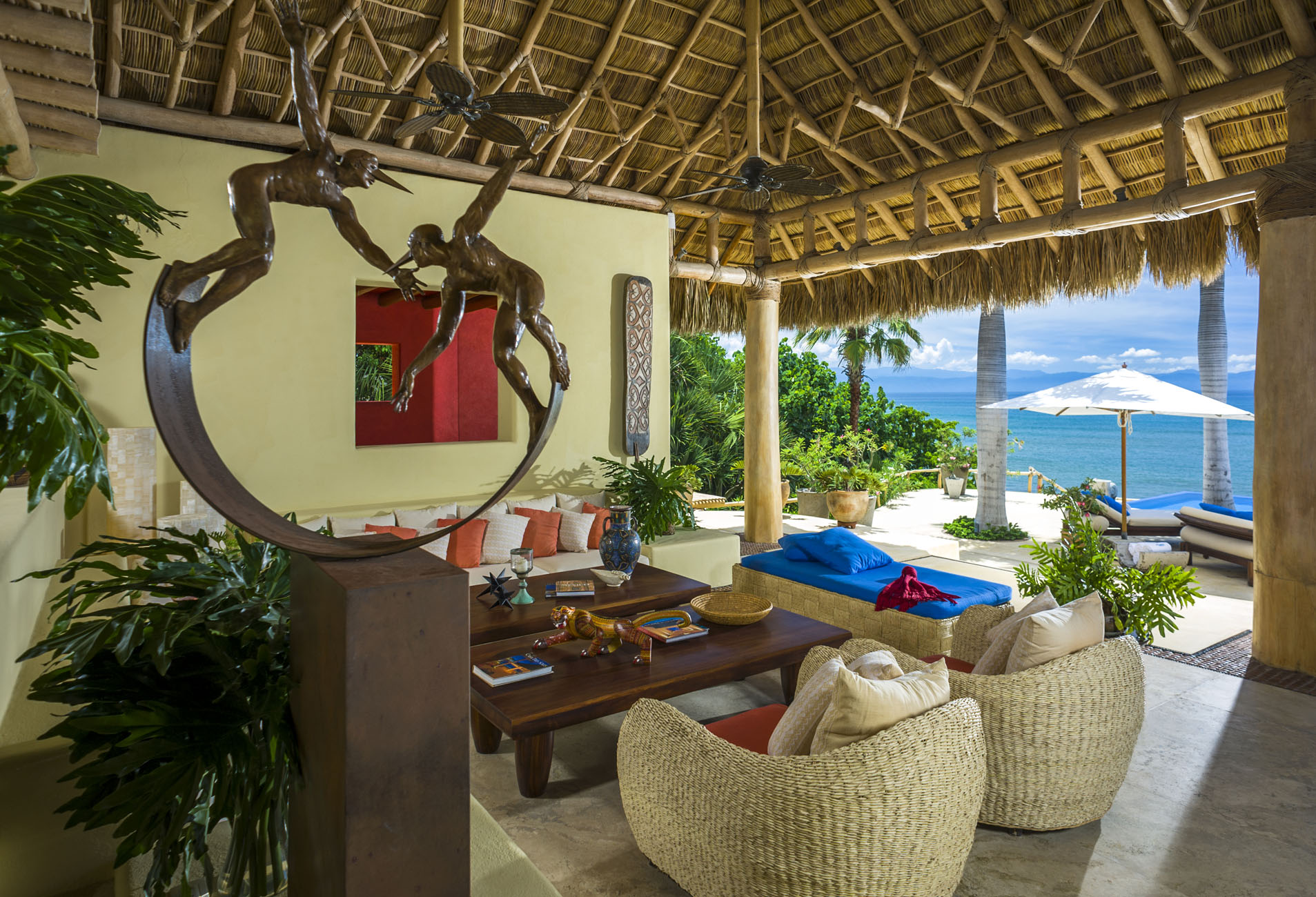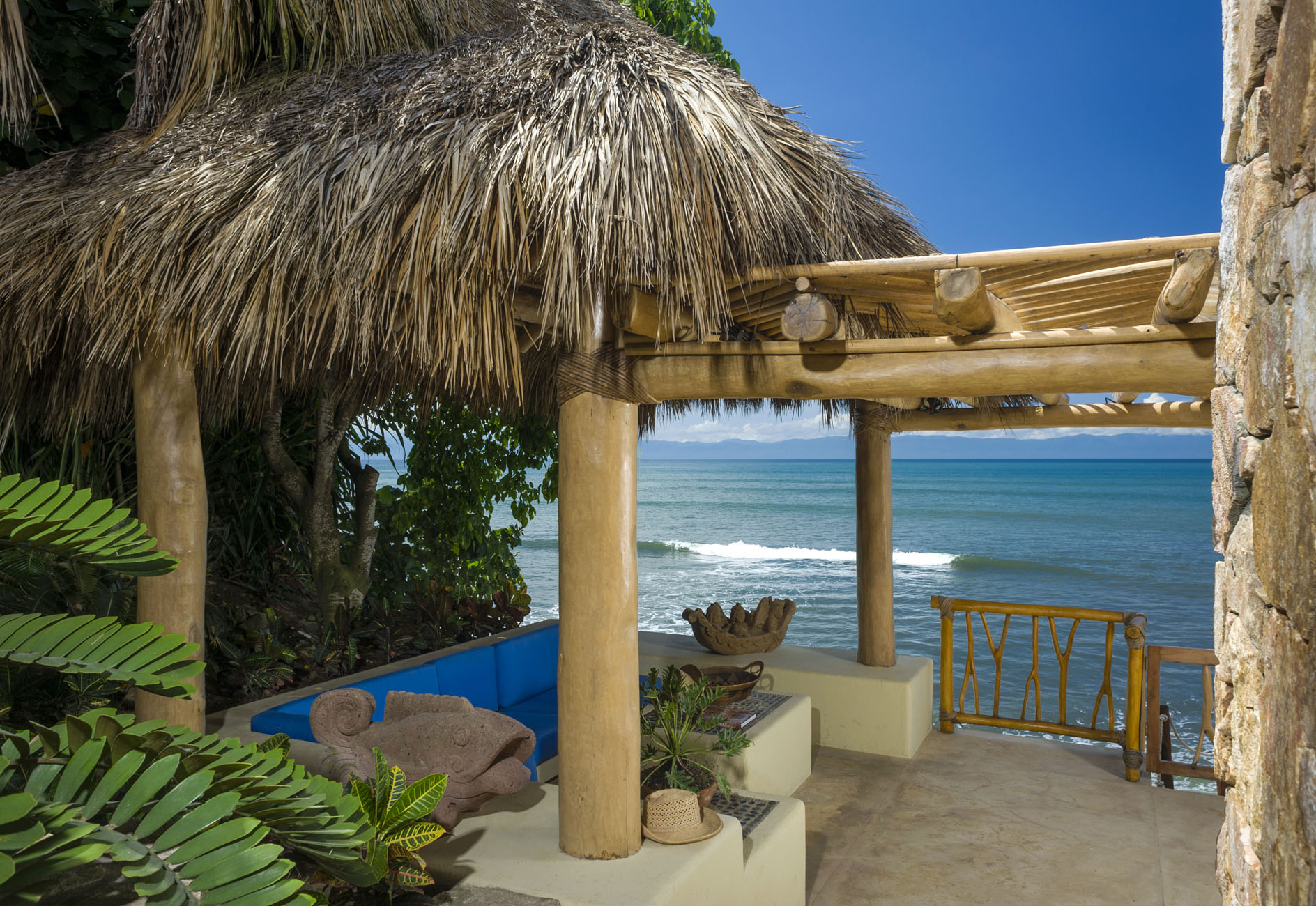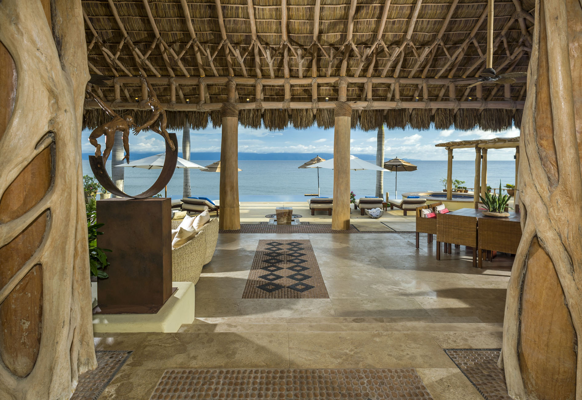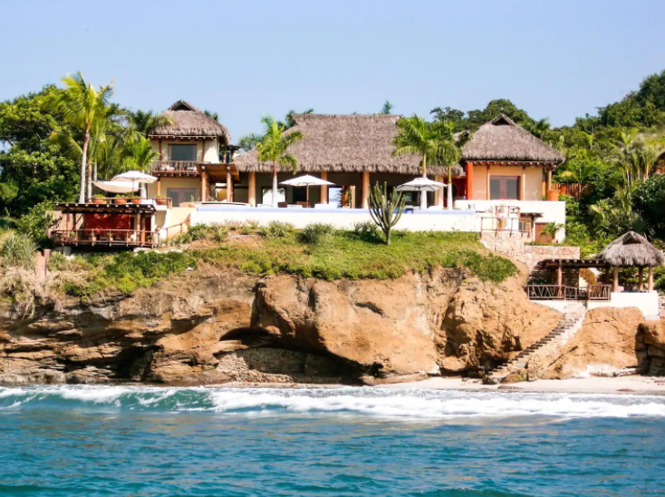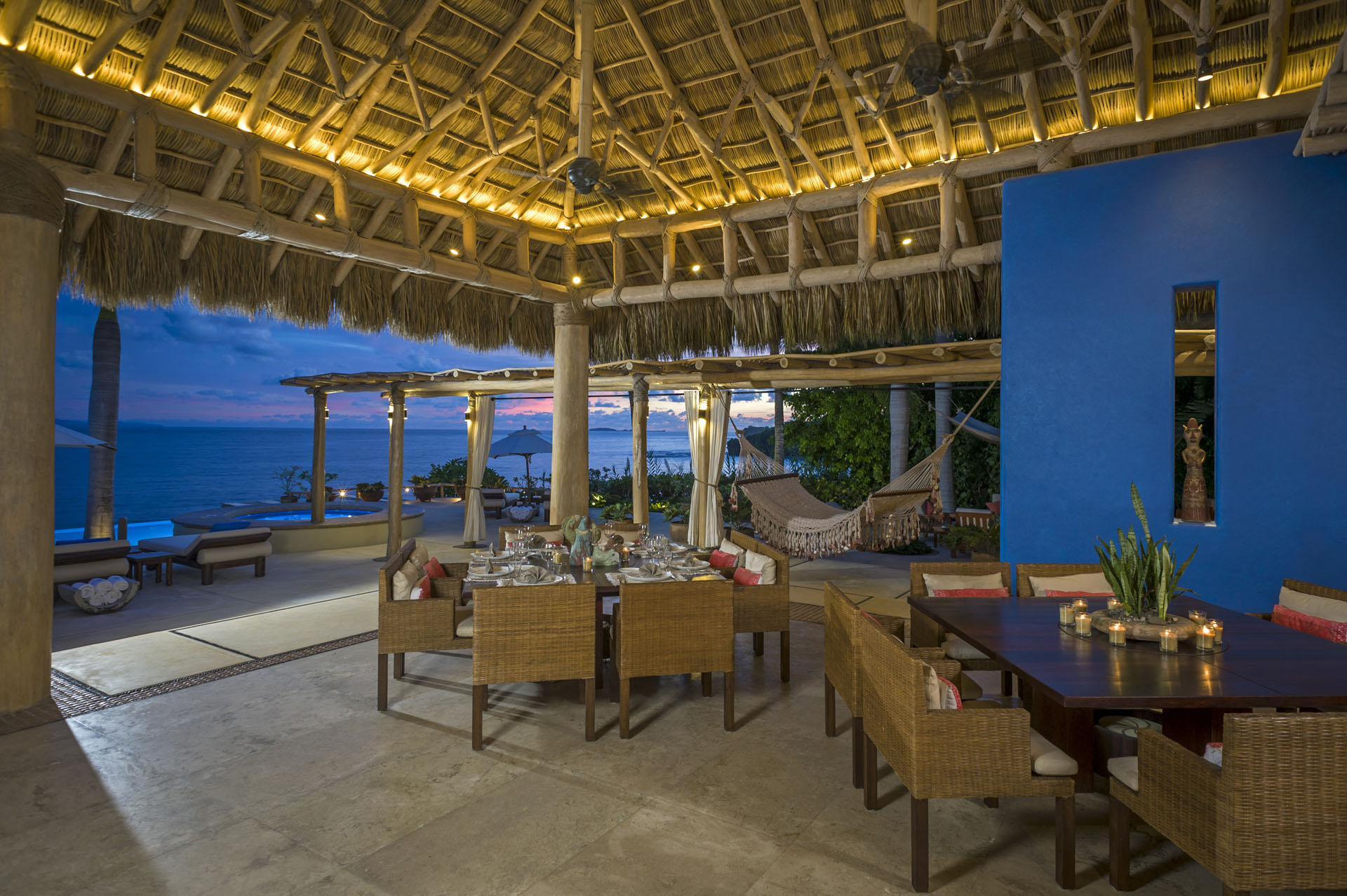 Expert artisans and architects masterfully crafted La Caleta. Together, they harmoniously blended 12,400 square feet of indoor and outdoor spaces. Above all, its distinctive palapa-style thatched roof makes it a true standout. Furthermore, the kitchen, a chef’s dream, boasts state-of-the-art appliances. And for those al fresco meal desires? A well-positioned outdoor pizza oven and grill await.