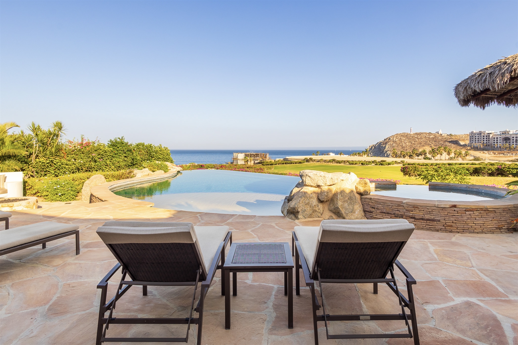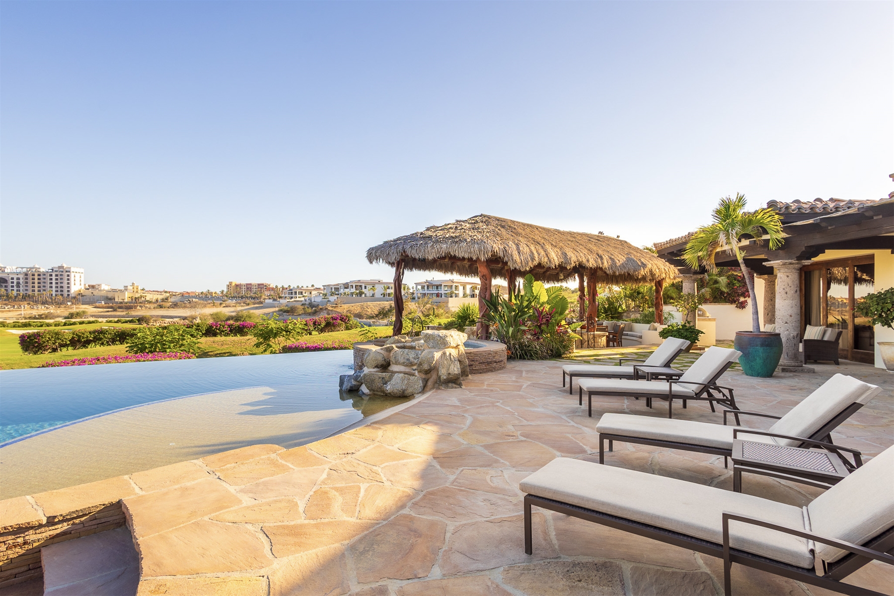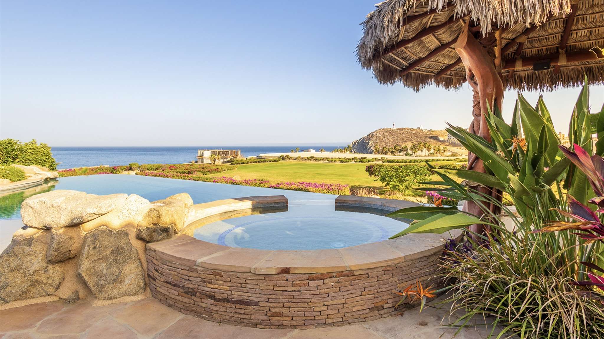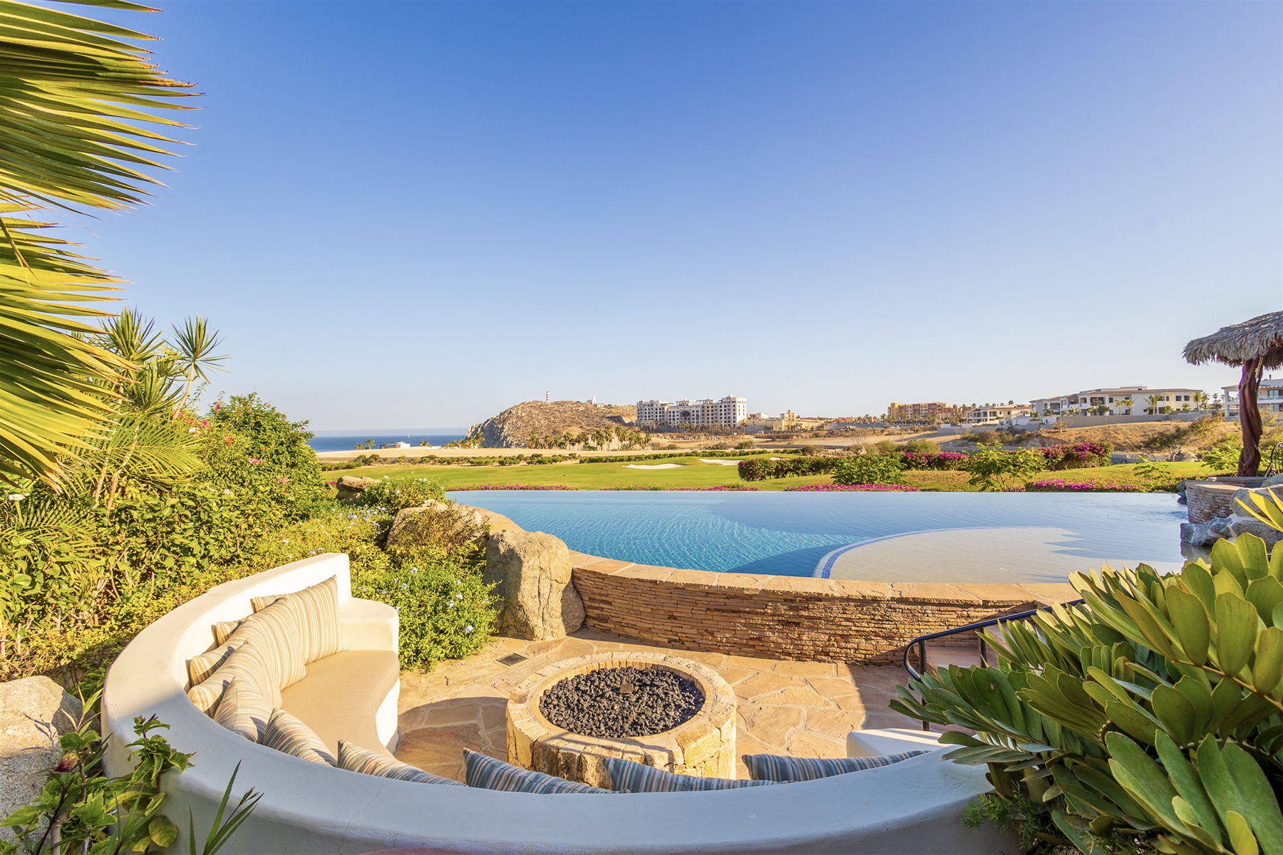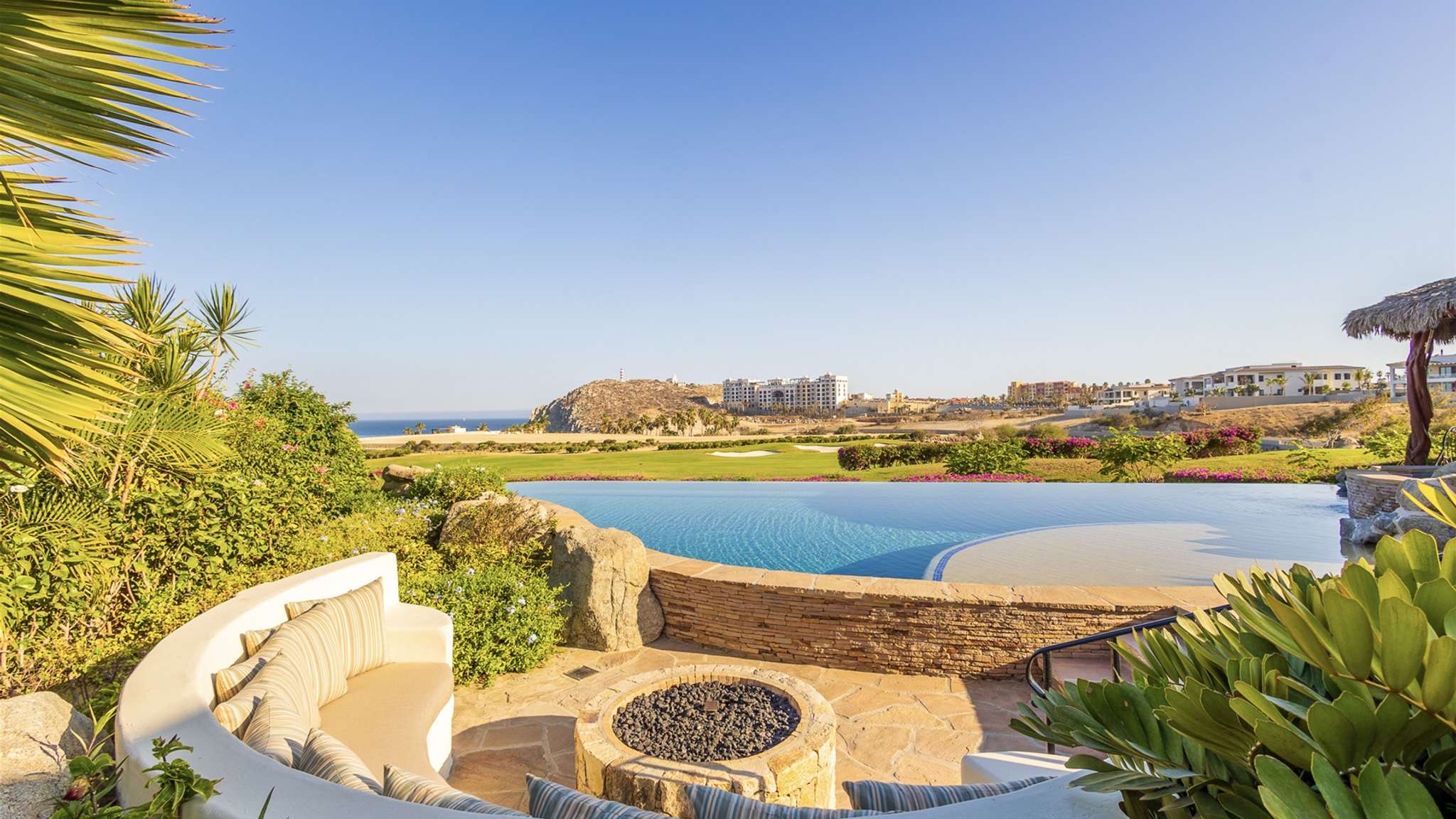 Casa Lomboy features six bedrooms and 6.5 bathrooms, spanning 5,500 square feet of modern finishes blended with old-world architecture. Surrounded by lush gardens, the villa overlooks the 16th hole of the world-renowned Jack Nicklaus Ocean Golf Course and offers impressive views of the Sea of Cortes and Punta Ballena.