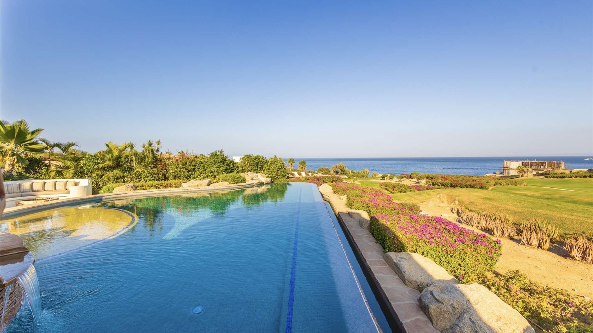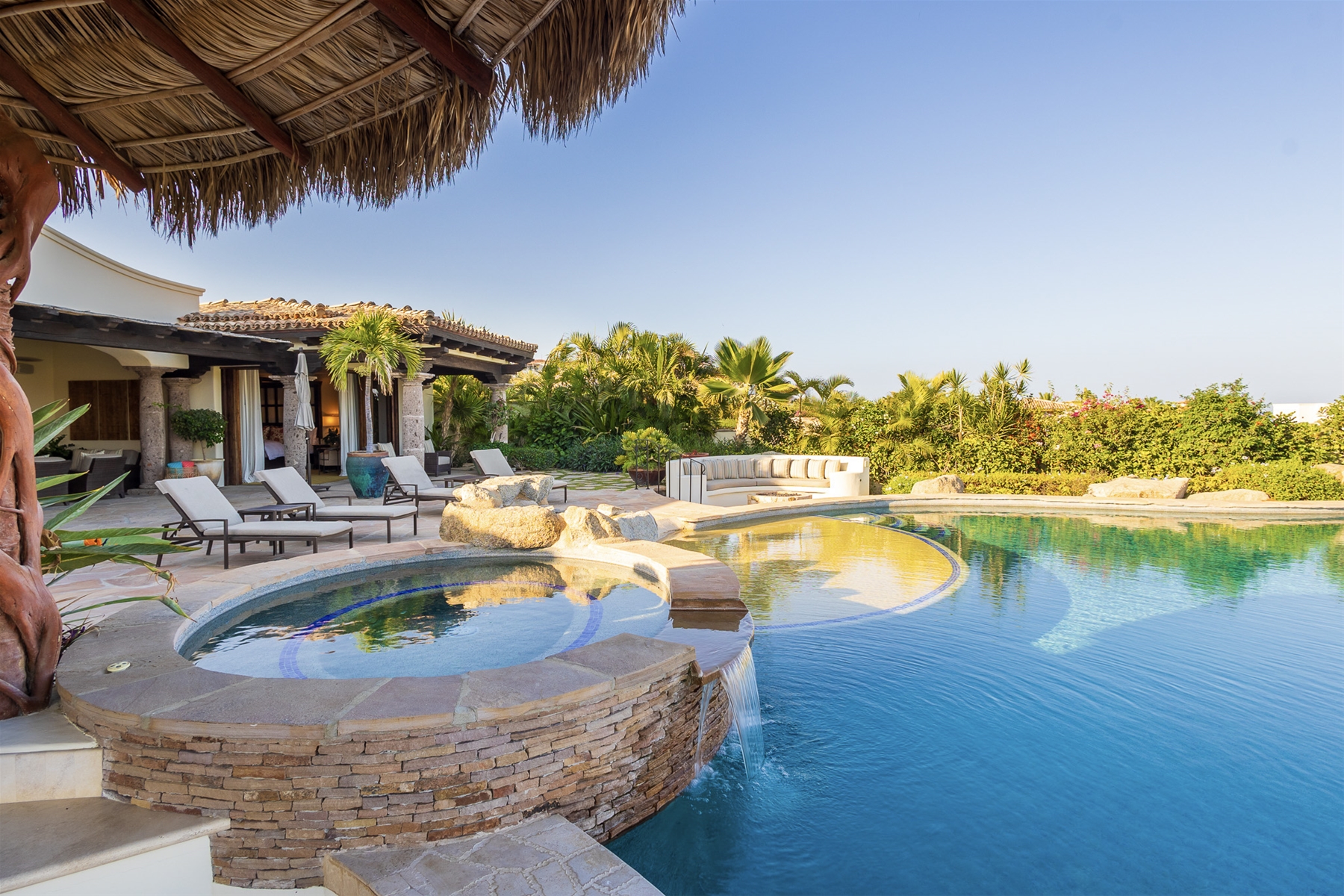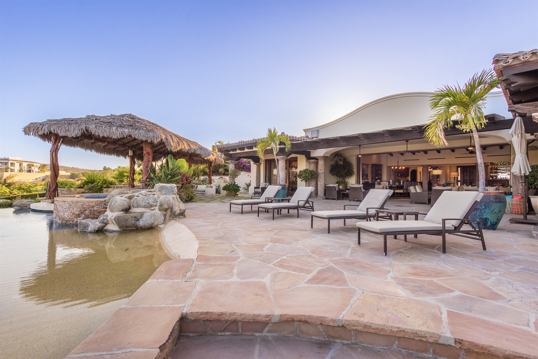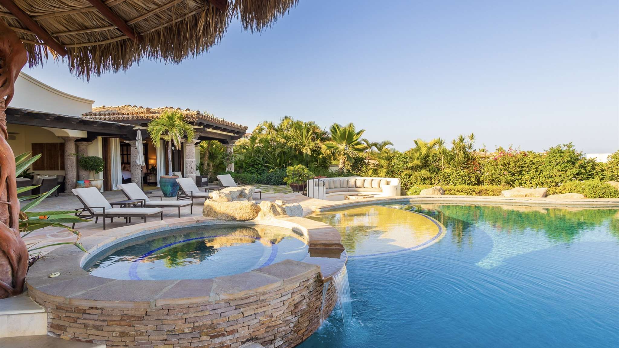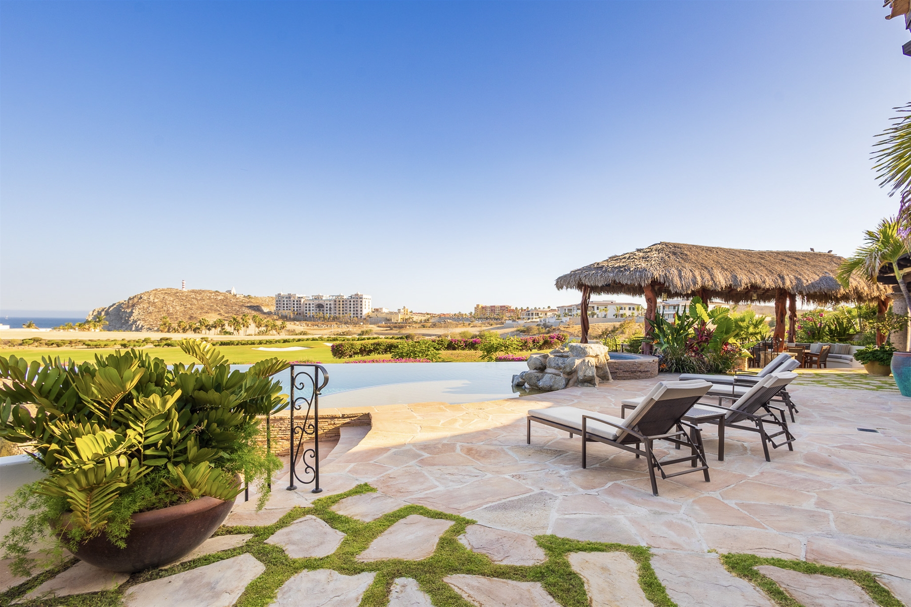 Casa Lomboy features six bedrooms and 6.5 bathrooms, spanning 5,500 square feet of modern finishes blended with old-world architecture. Surrounded by lush gardens, the villa overlooks the 16th hole of the world-renowned Jack Nicklaus Ocean Golf Course and offers impressive views of the Sea of Cortes and Punta Ballena.