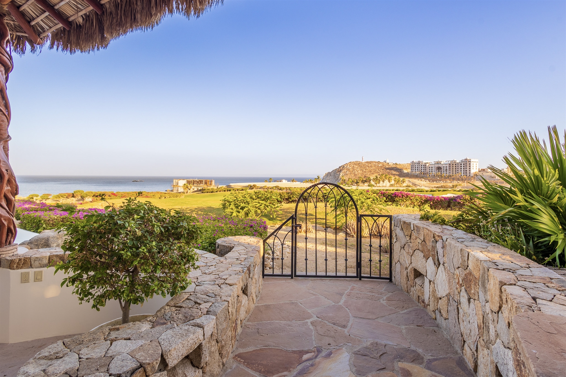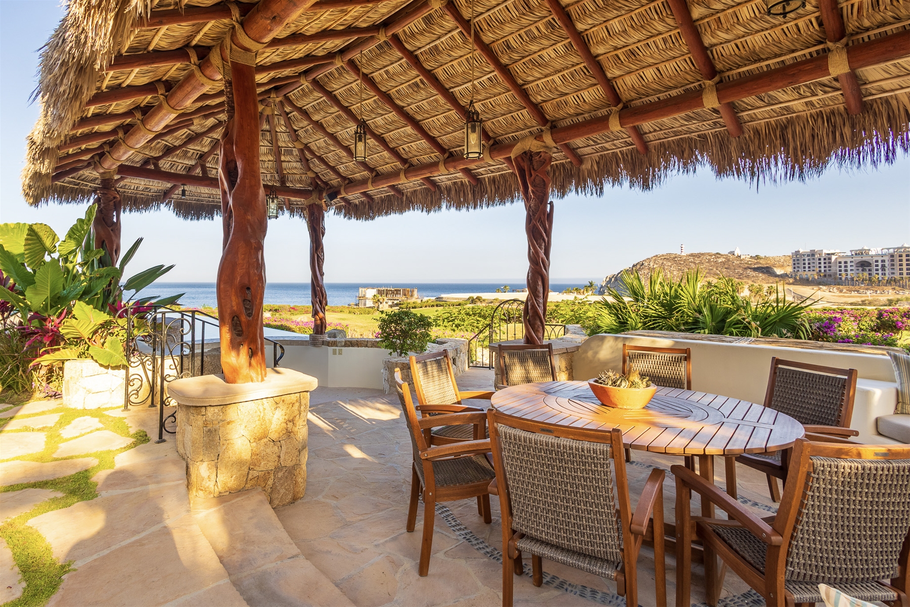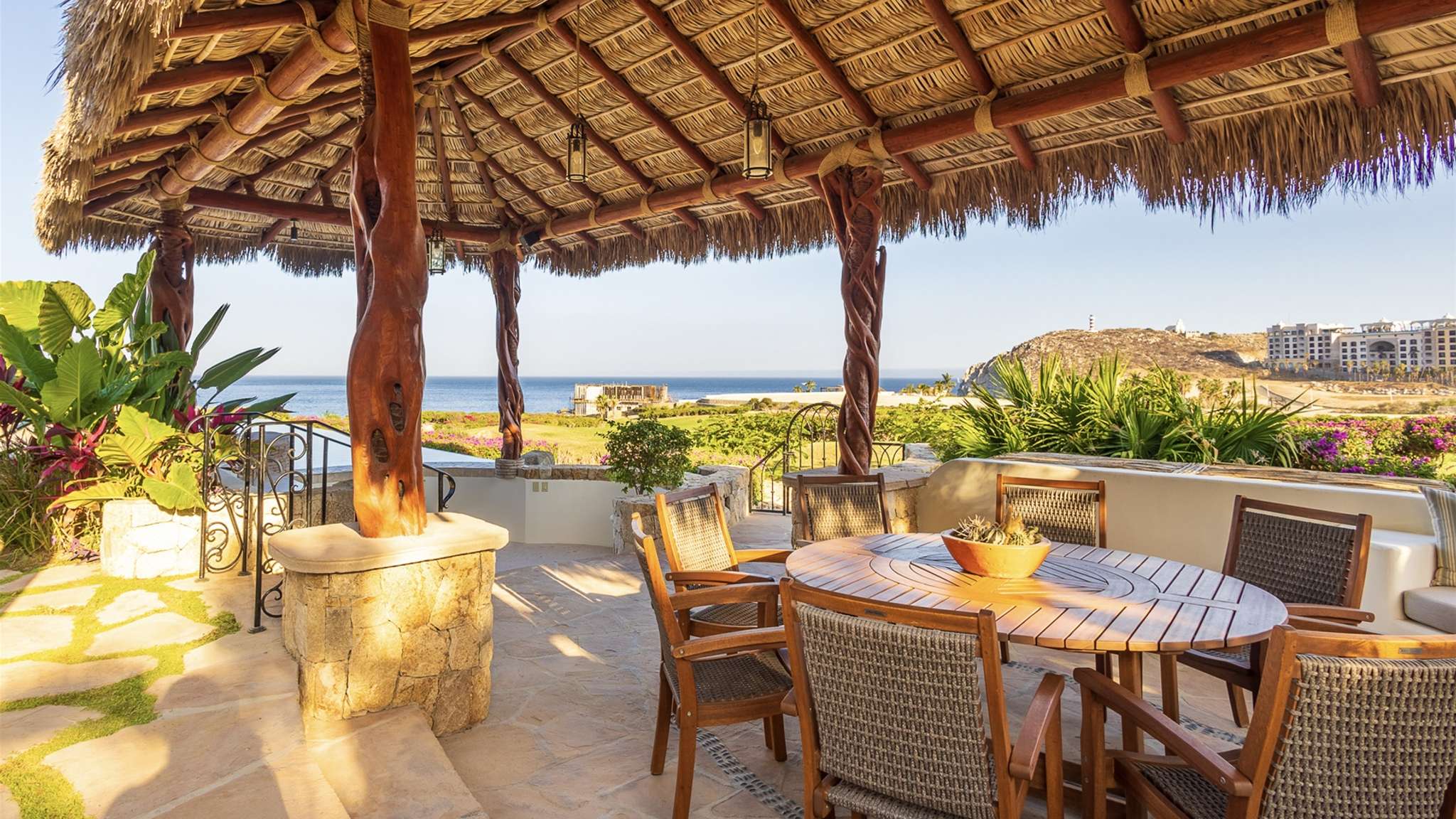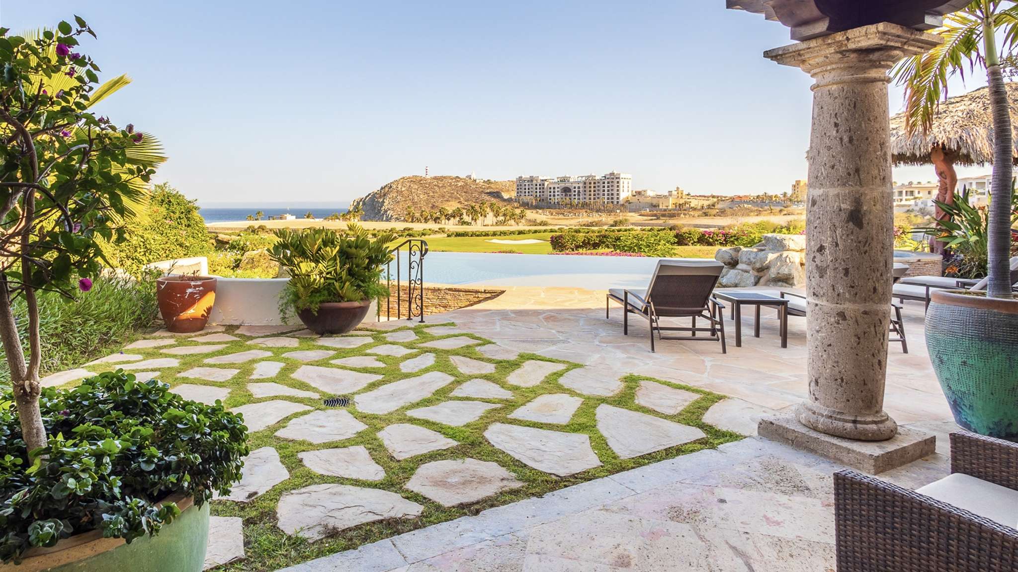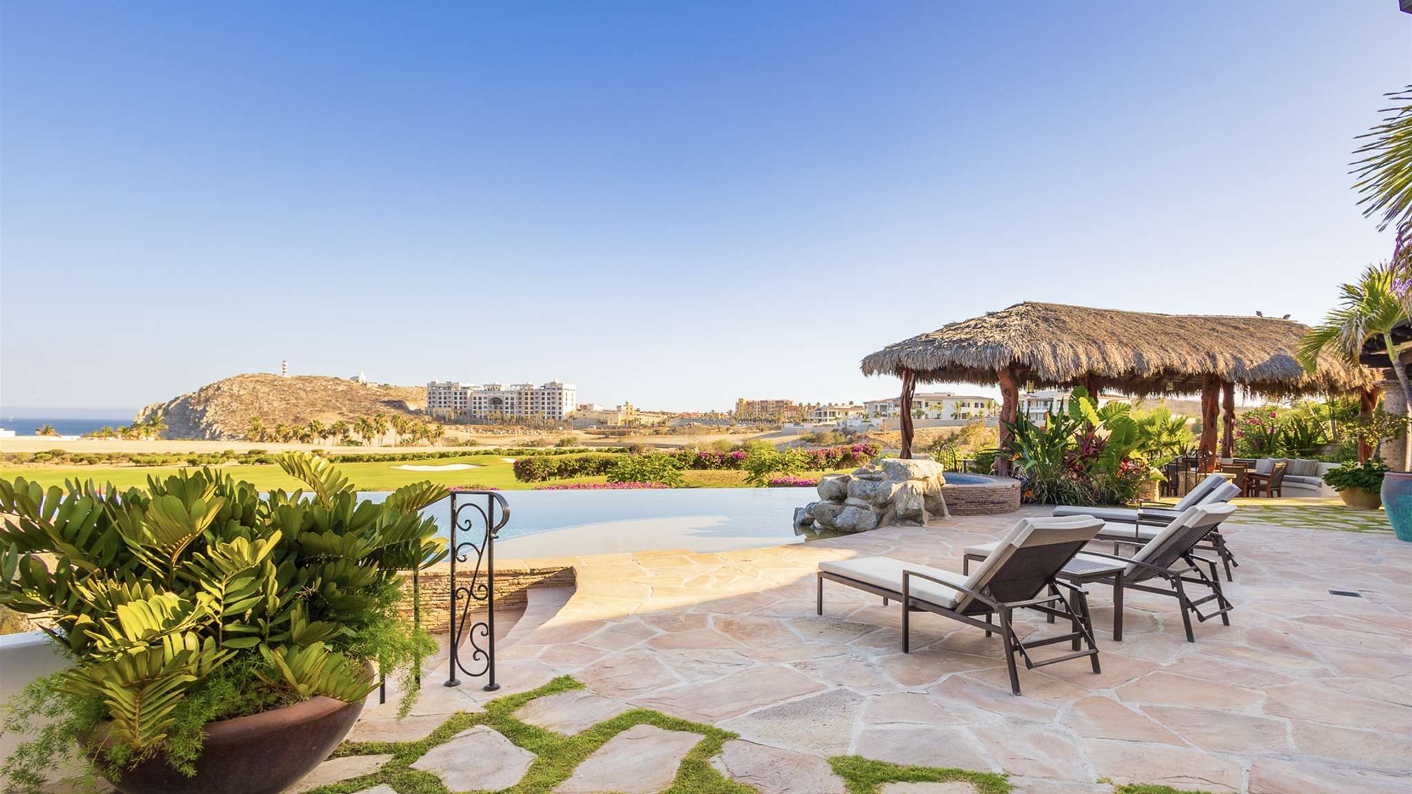 Casa Lomboy features six bedrooms and 6.5 bathrooms, spanning 5,500 square feet of modern finishes blended with old-world architecture. Surrounded by lush gardens, the villa overlooks the 16th hole of the world-renowned Jack Nicklaus Ocean Golf Course and offers impressive views of the Sea of Cortes and Punta Ballena.