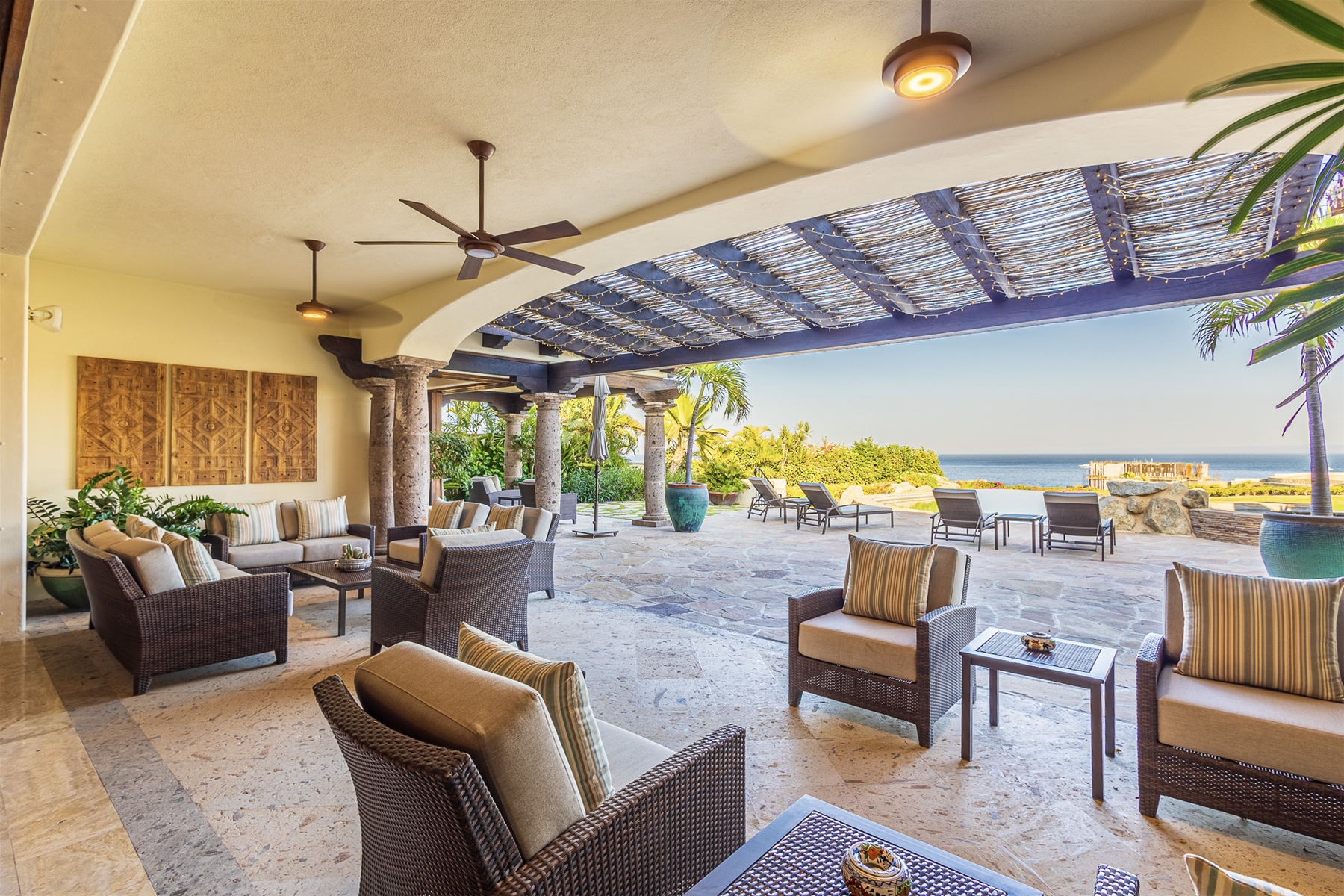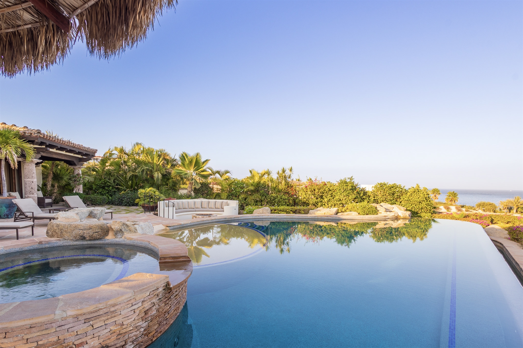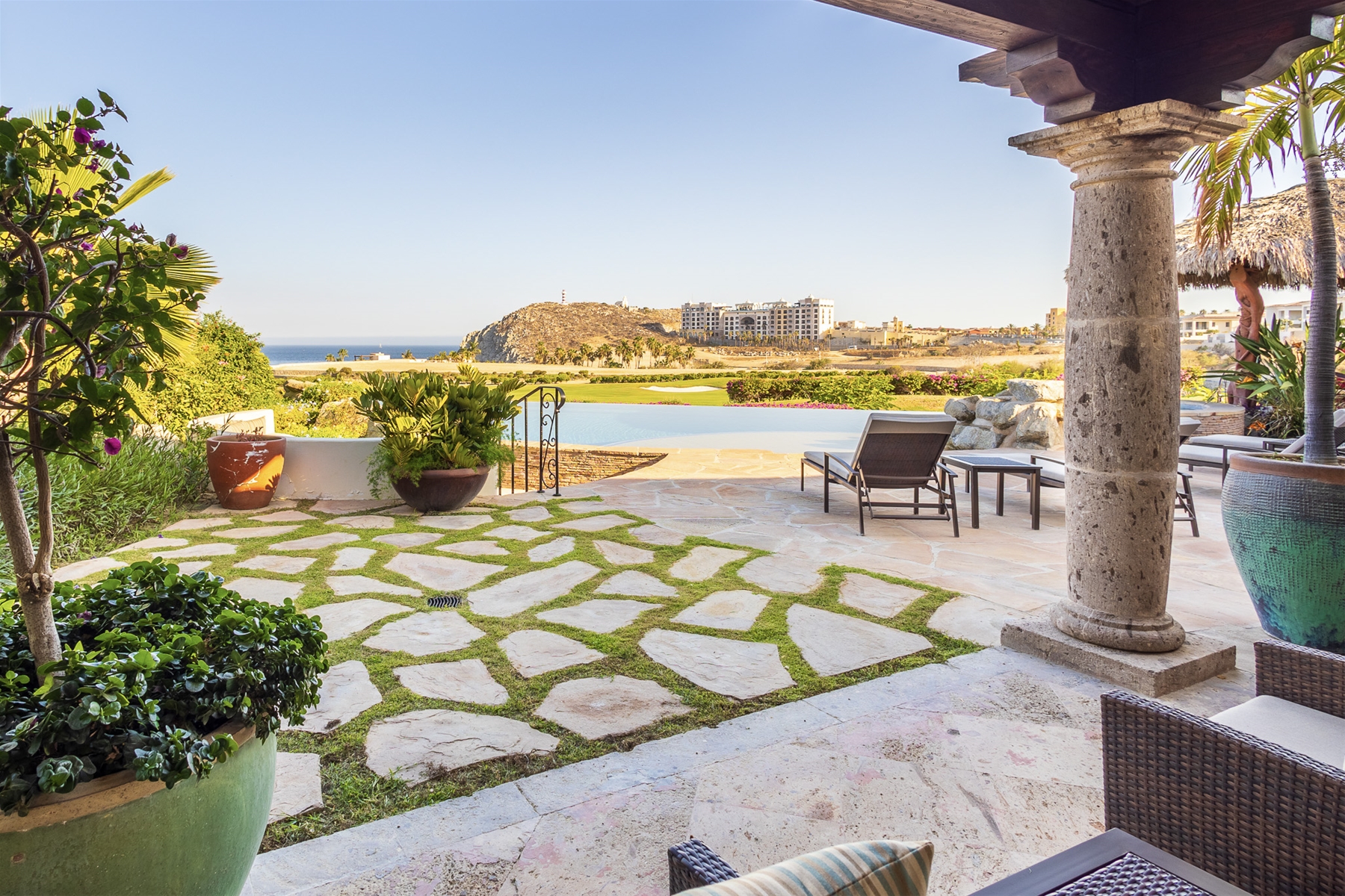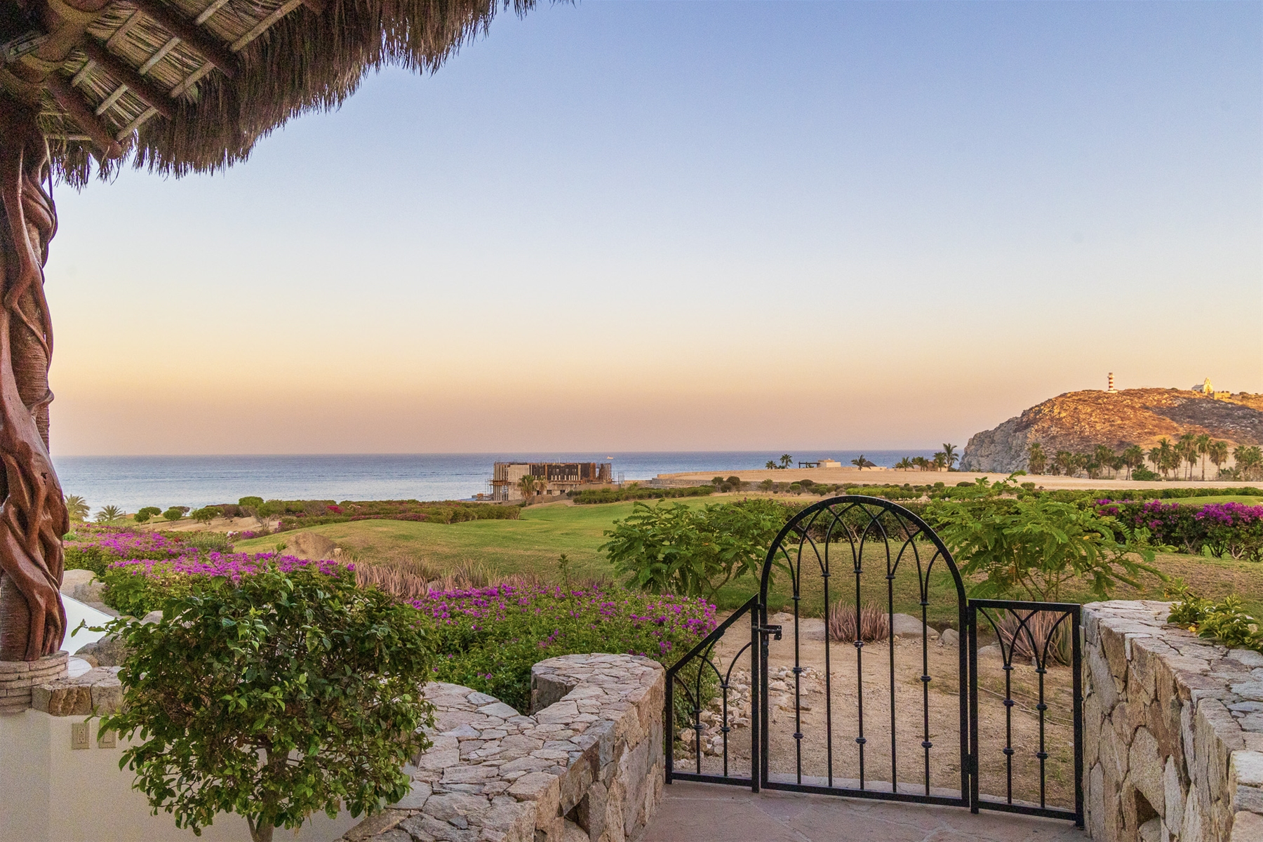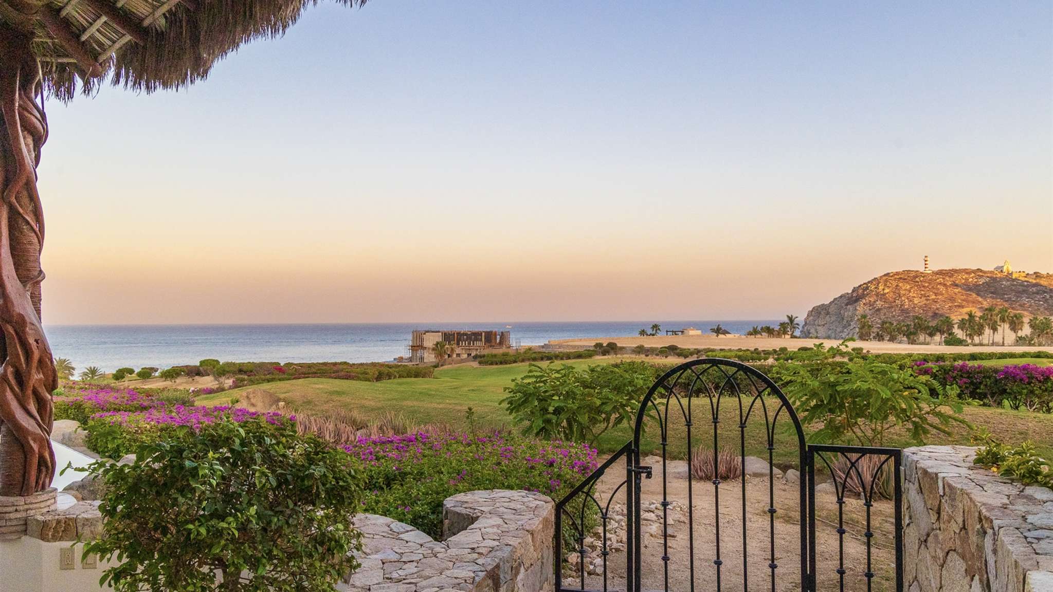 Casa Lomboy features six bedrooms and 6.5 bathrooms, spanning 5,500 square feet of modern finishes blended with old-world architecture. Surrounded by lush gardens, the villa overlooks the 16th hole of the world-renowned Jack Nicklaus Ocean Golf Course and offers impressive views of the Sea of Cortes and Punta Ballena.