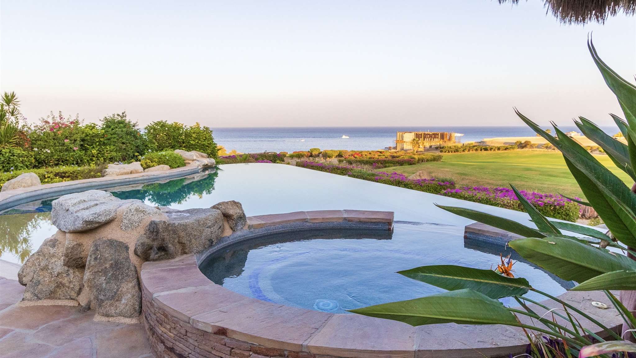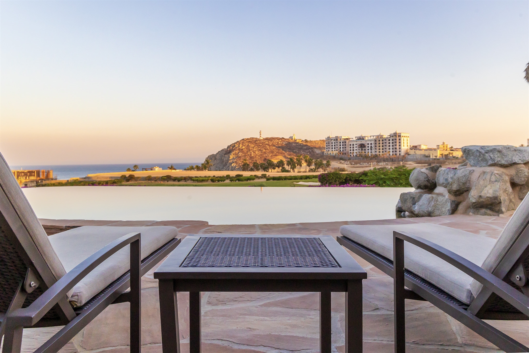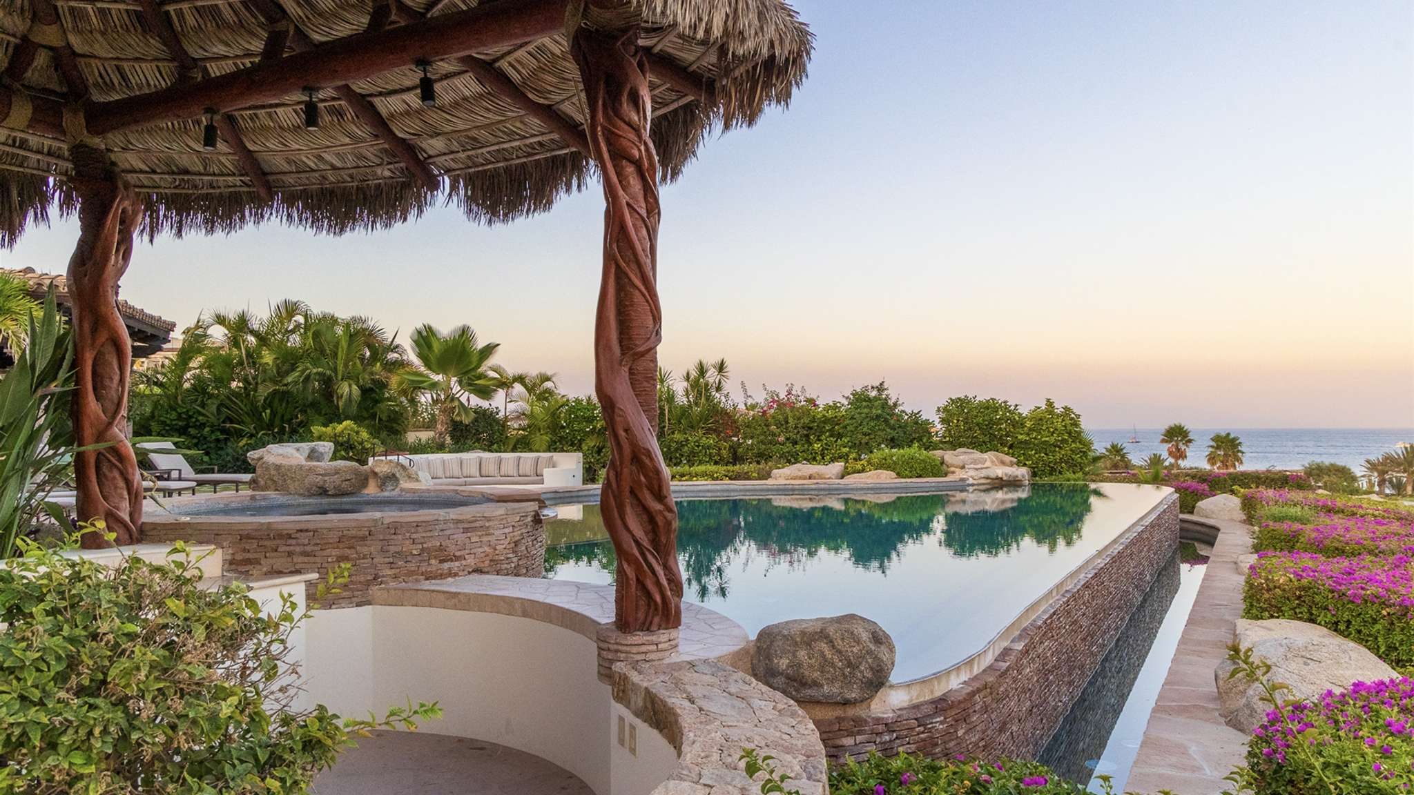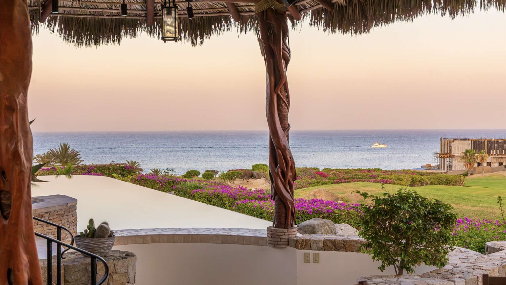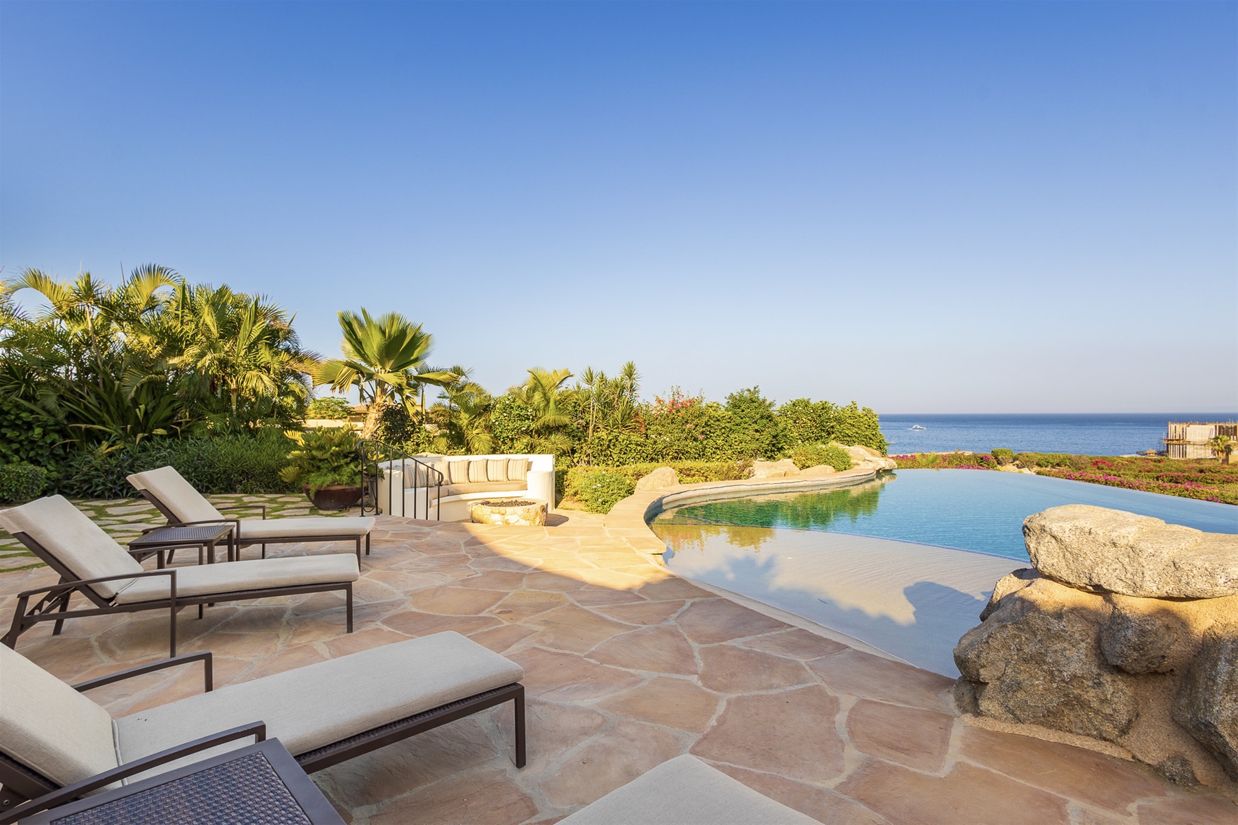 Casa Lomboy features six bedrooms and 6.5 bathrooms, spanning 5,500 square feet of modern finishes blended with old-world architecture. Surrounded by lush gardens, the villa overlooks the 16th hole of the world-renowned Jack Nicklaus Ocean Golf Course and offers impressive views of the Sea of Cortes and Punta Ballena.