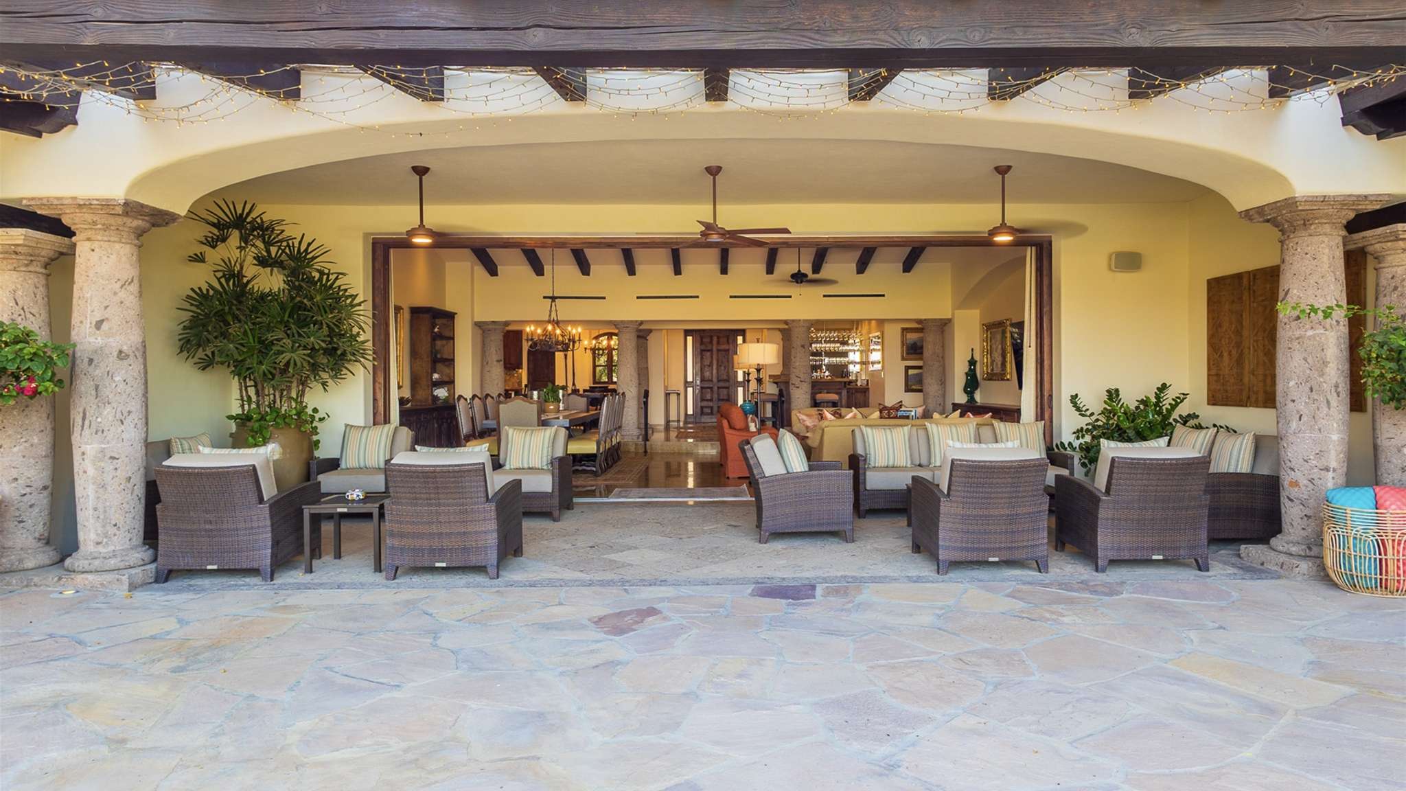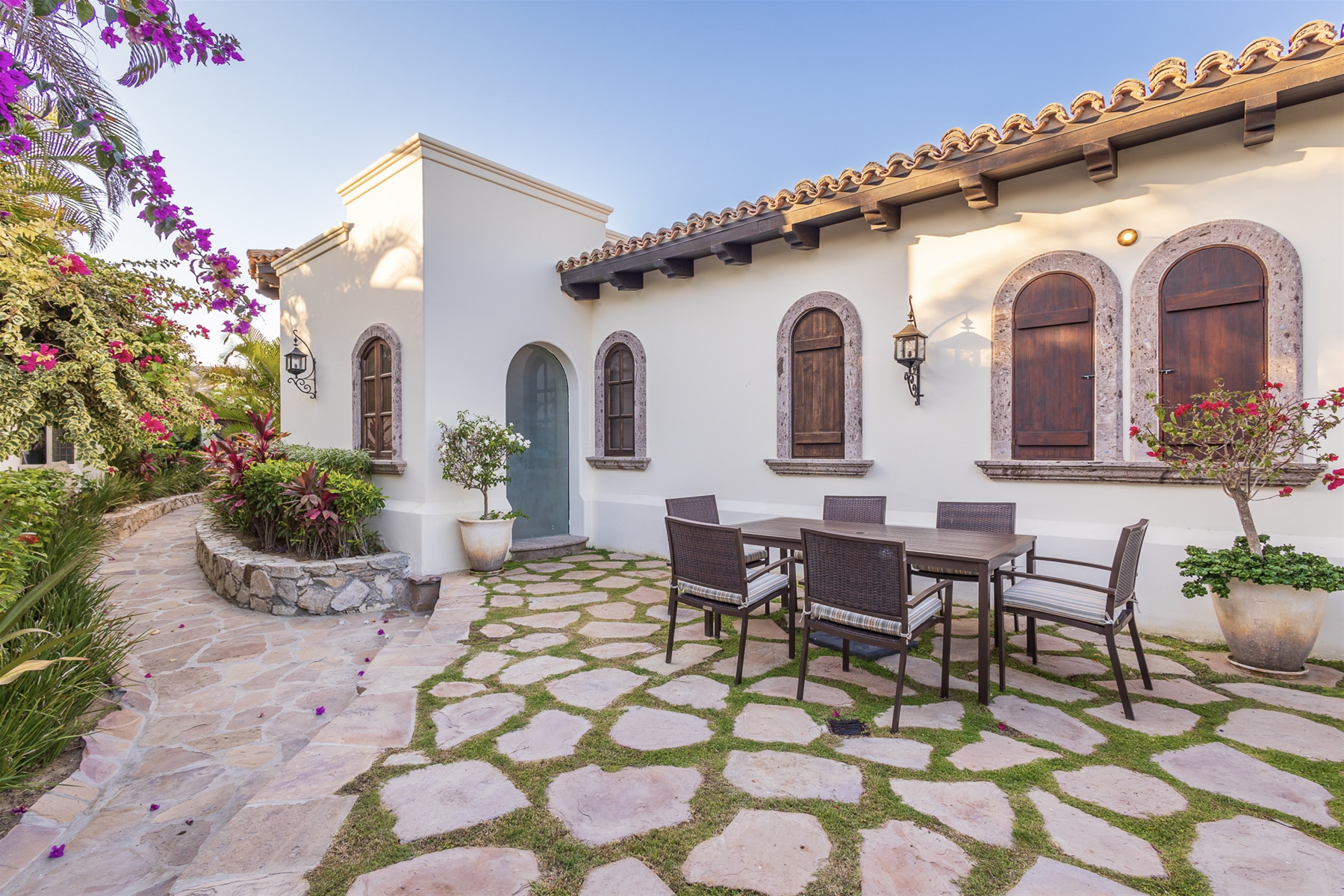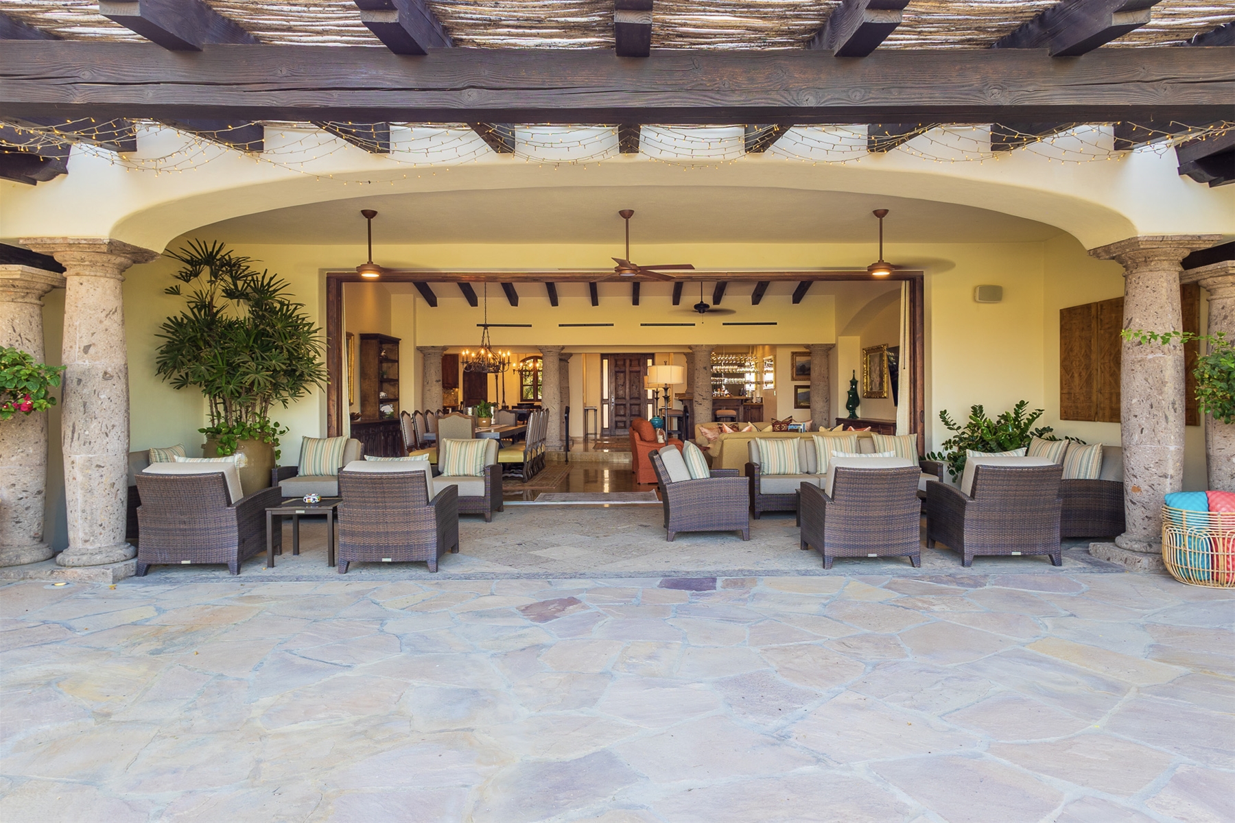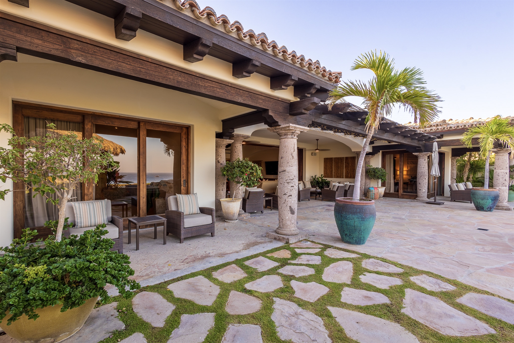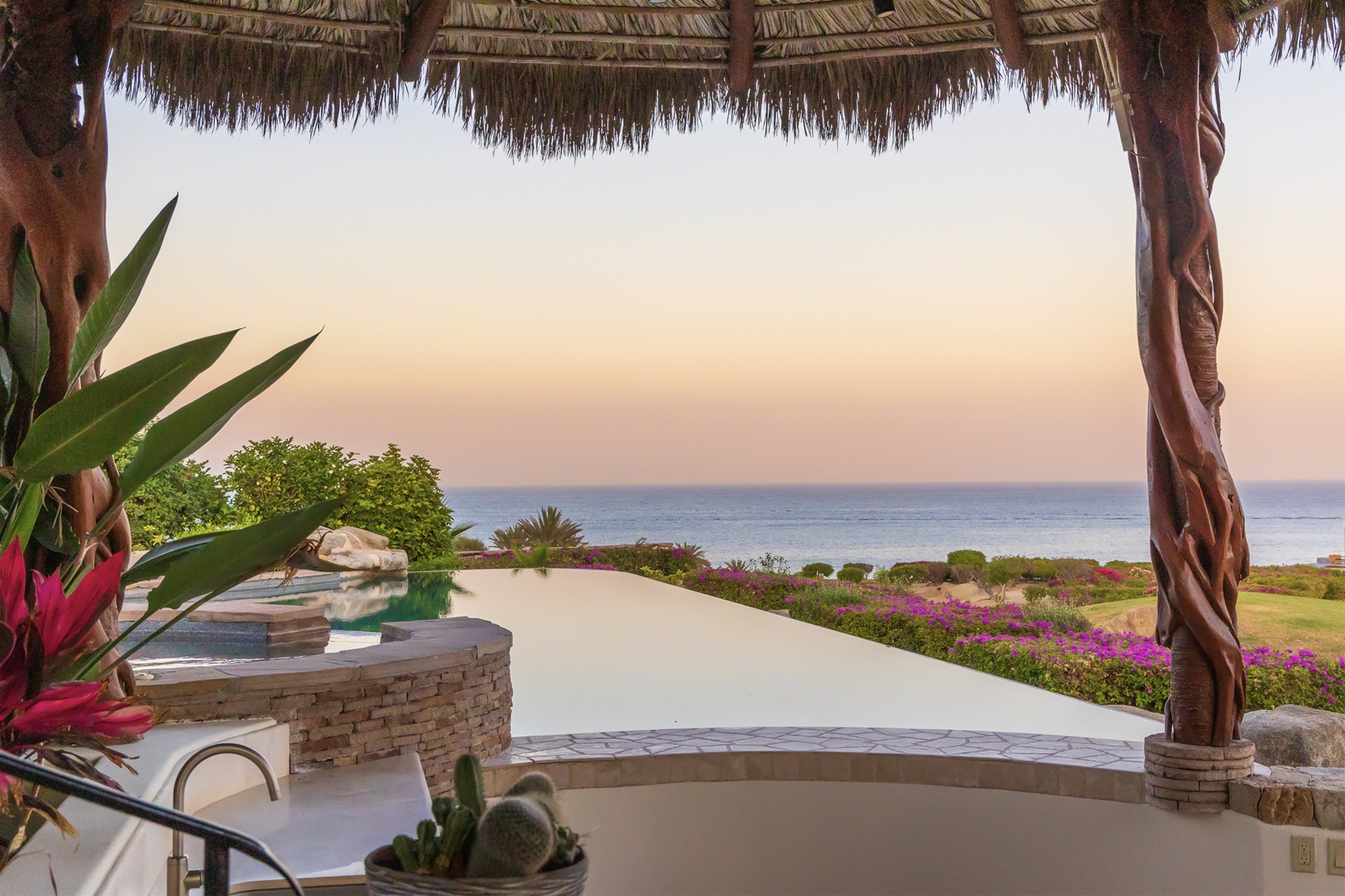 Casa Lomboy features six bedrooms and 6.5 bathrooms, spanning 5,500 square feet of modern finishes blended with old-world architecture. Surrounded by lush gardens, the villa overlooks the 16th hole of the world-renowned Jack Nicklaus Ocean Golf Course and offers impressive views of the Sea of Cortes and Punta Ballena.