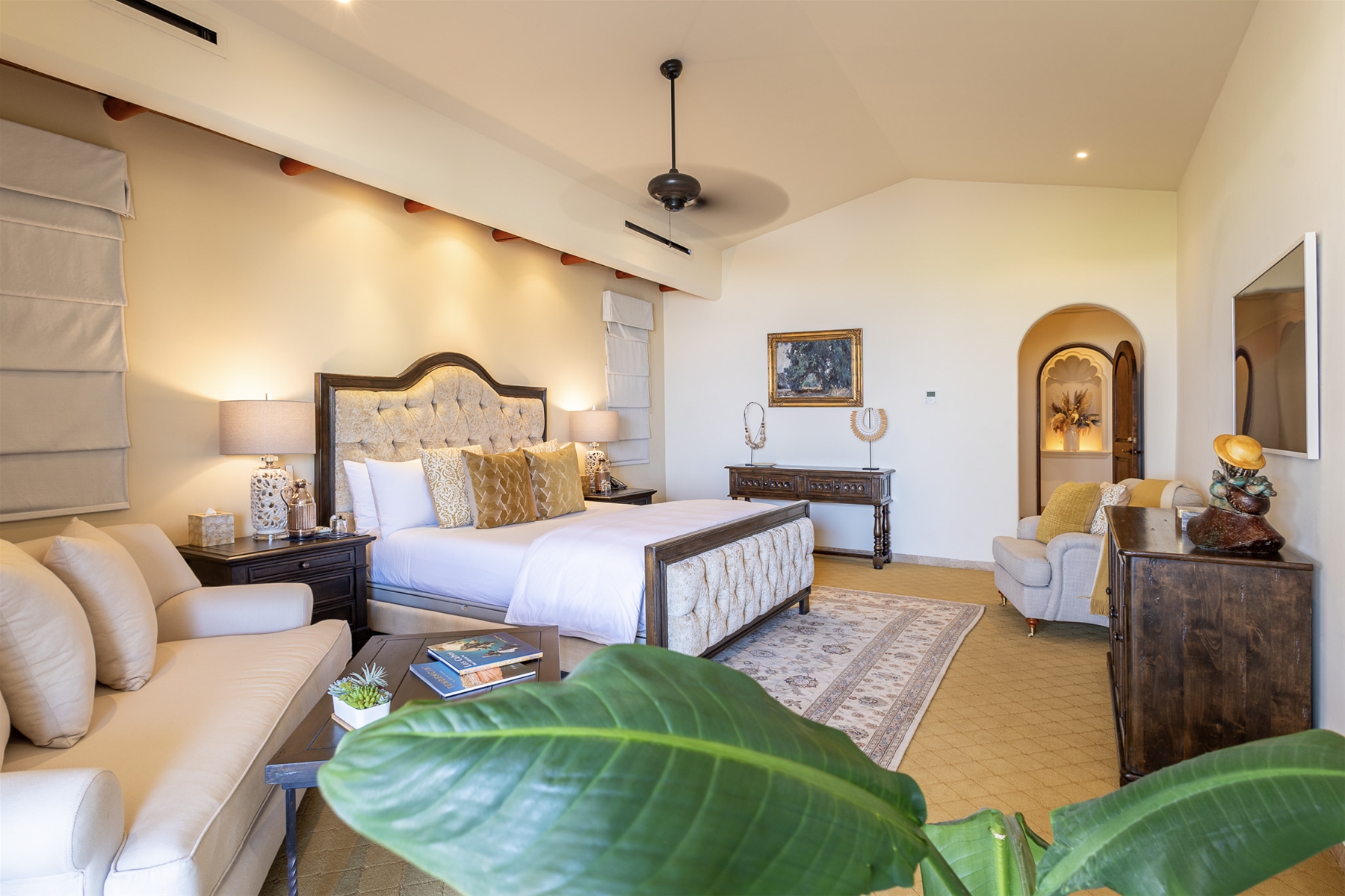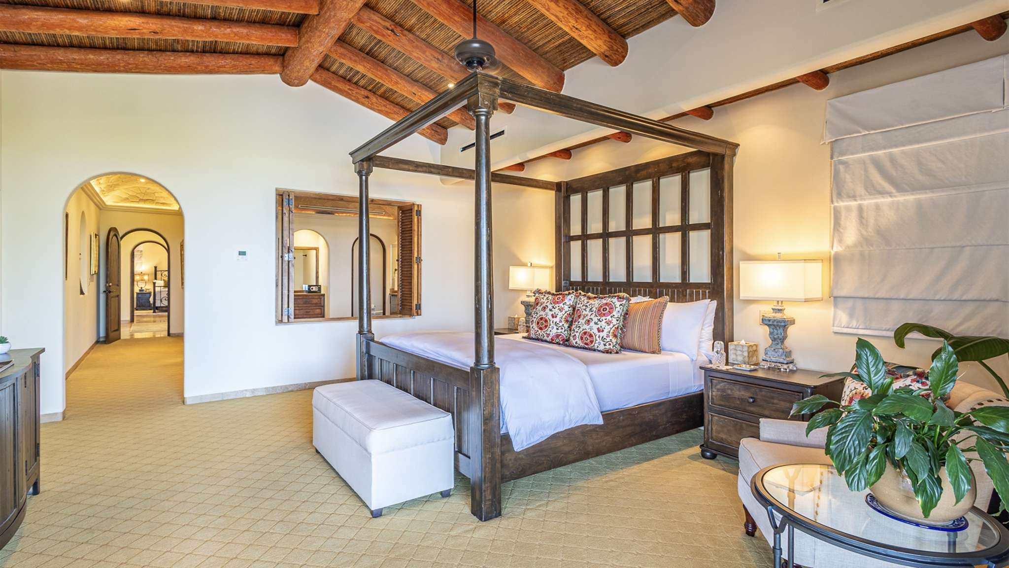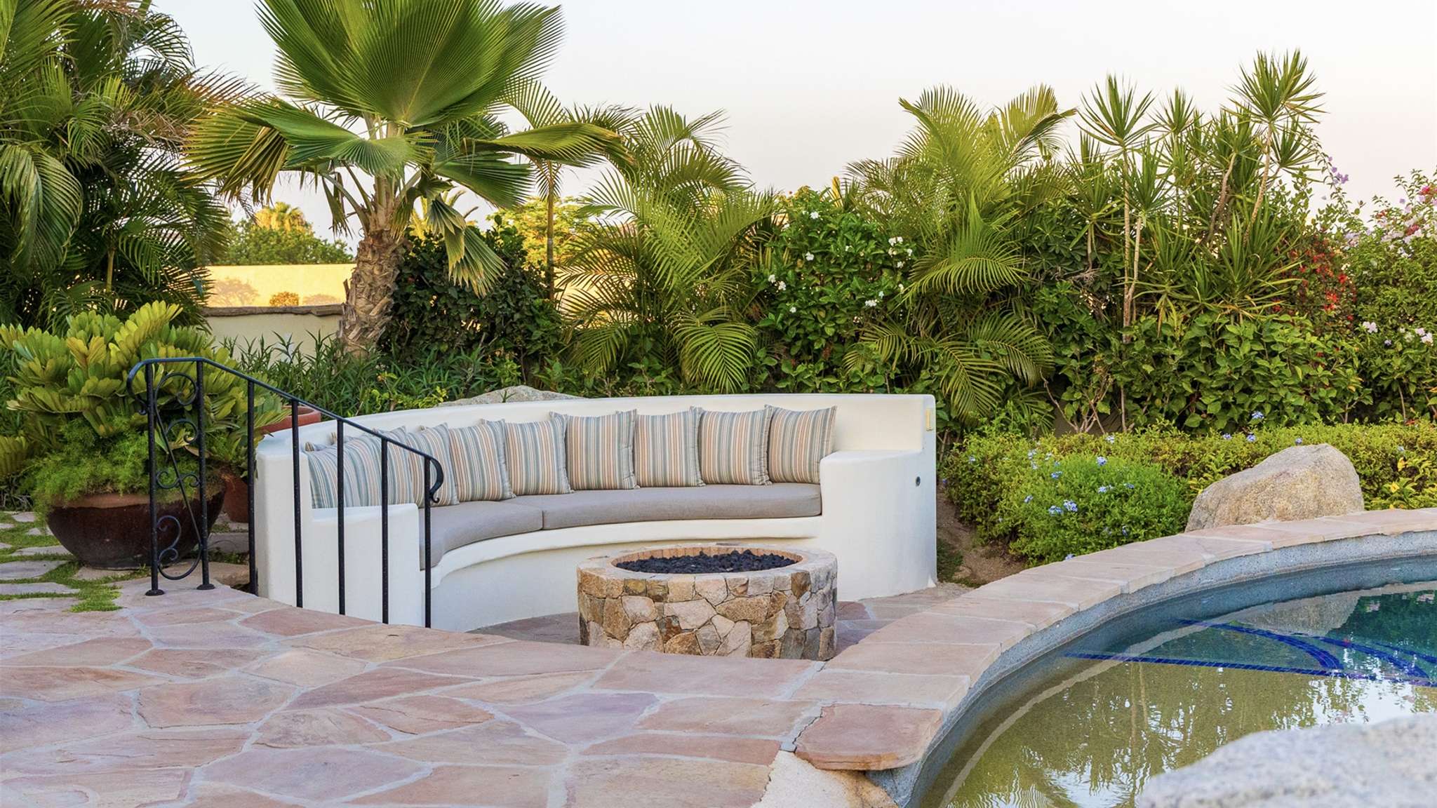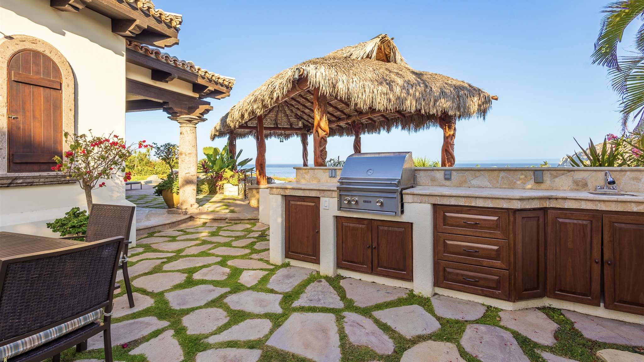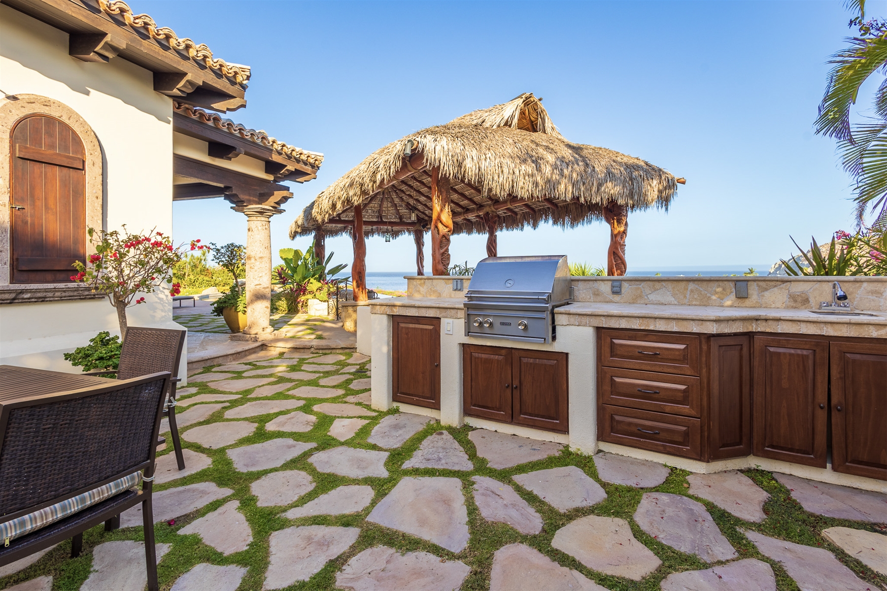 Casa Lomboy features six bedrooms and 6.5 bathrooms, spanning 5,500 square feet of modern finishes blended with old-world architecture. Surrounded by lush gardens, the villa overlooks the 16th hole of the world-renowned Jack Nicklaus Ocean Golf Course and offers impressive views of the Sea of Cortes and Punta Ballena.