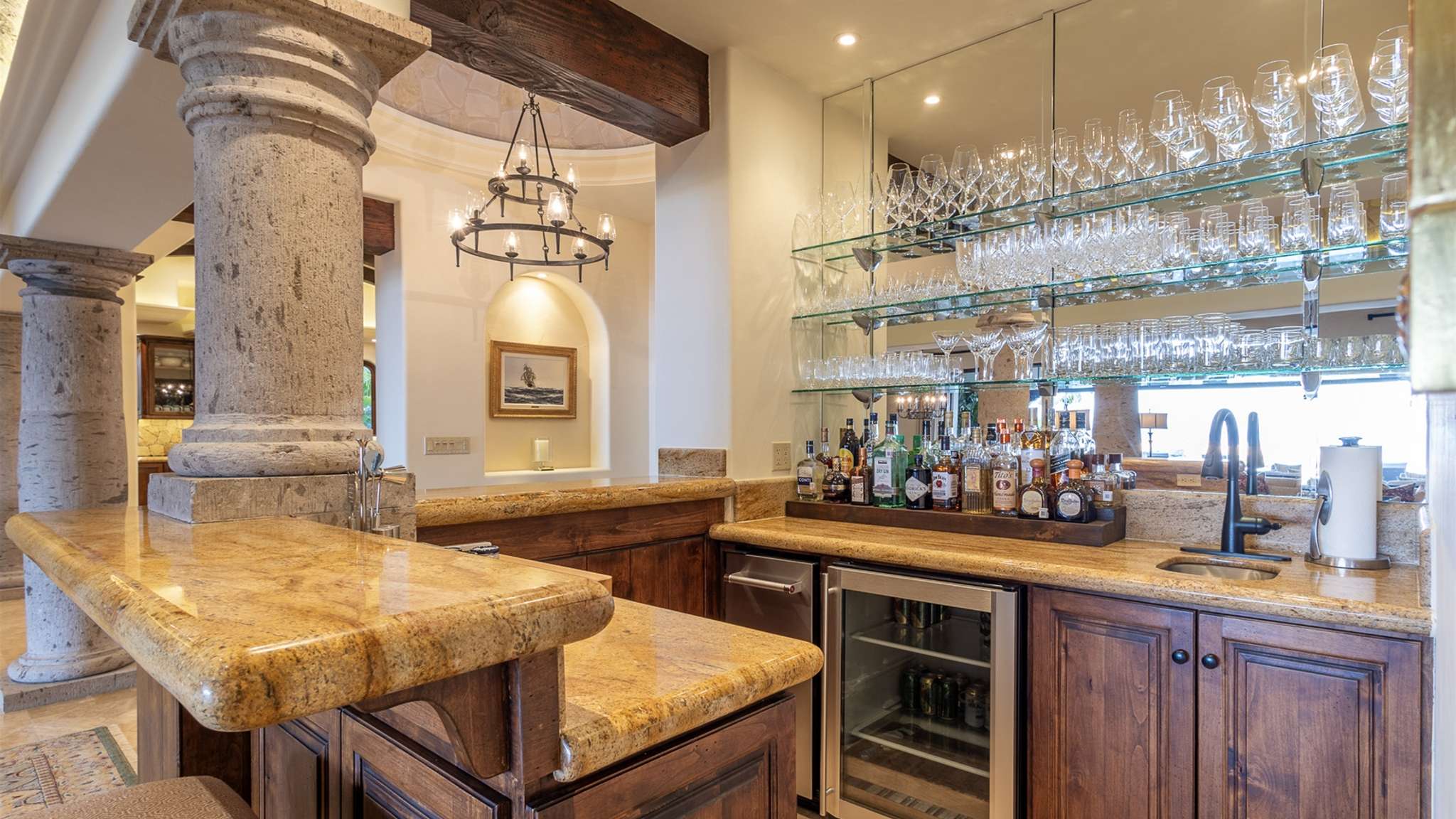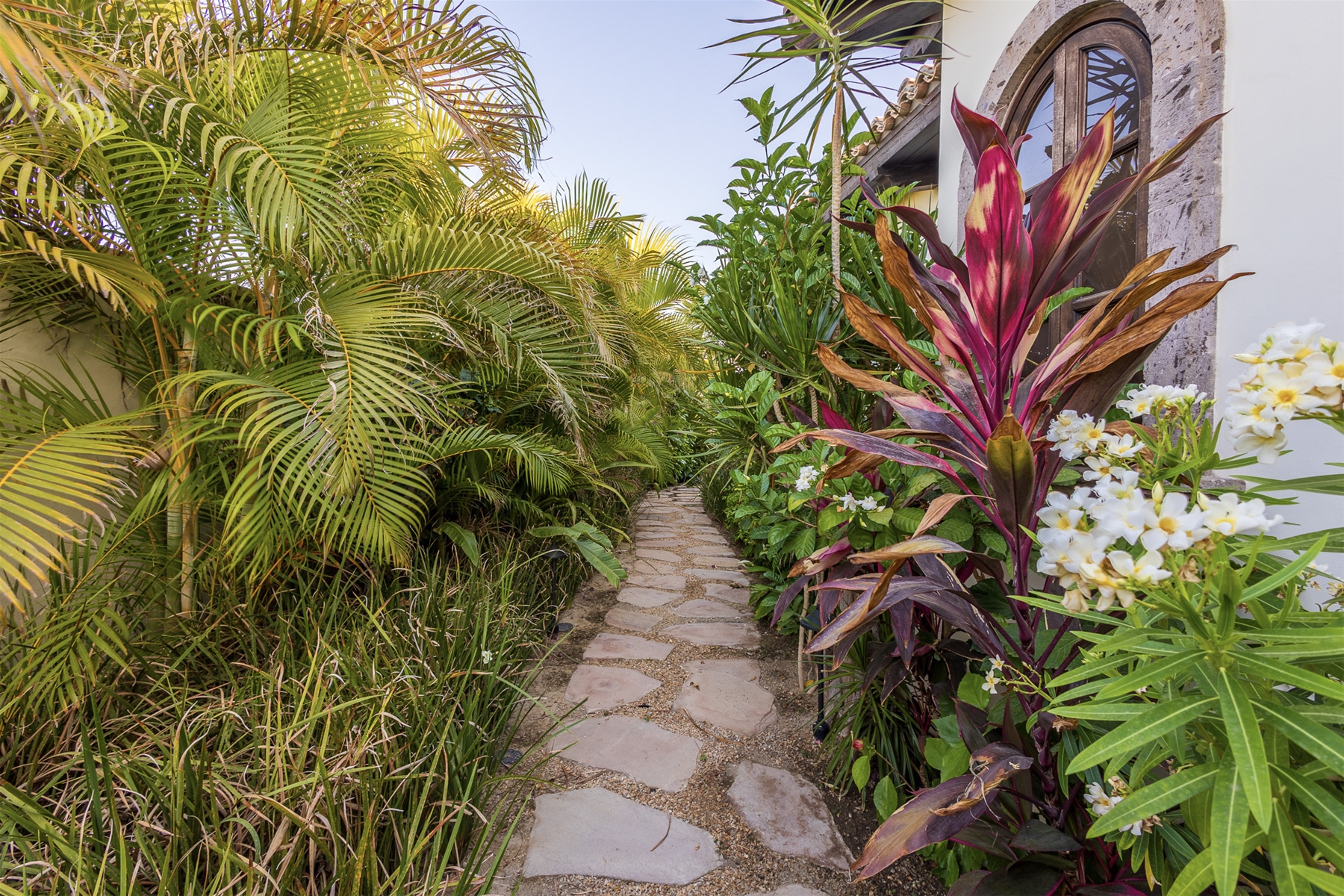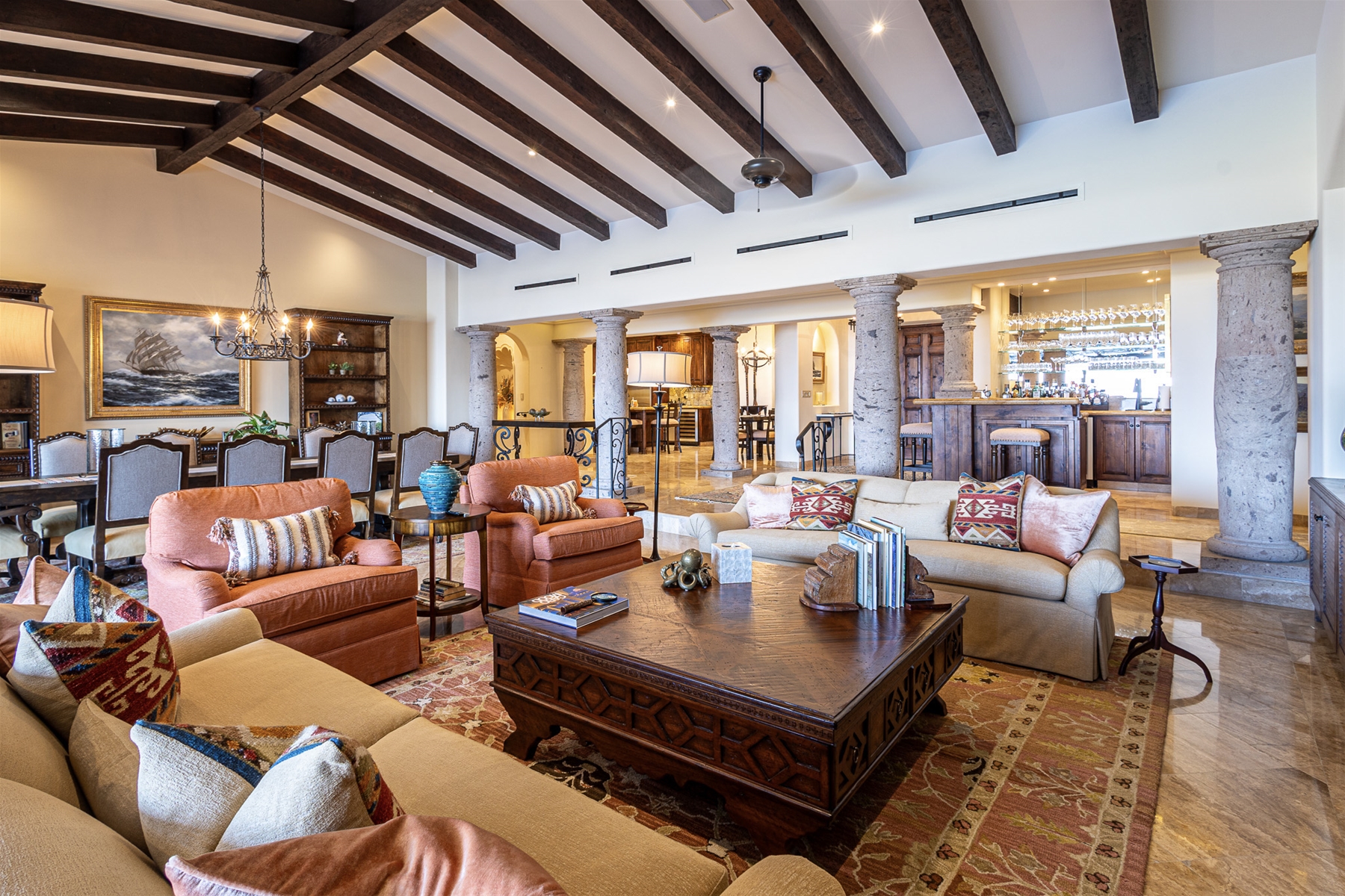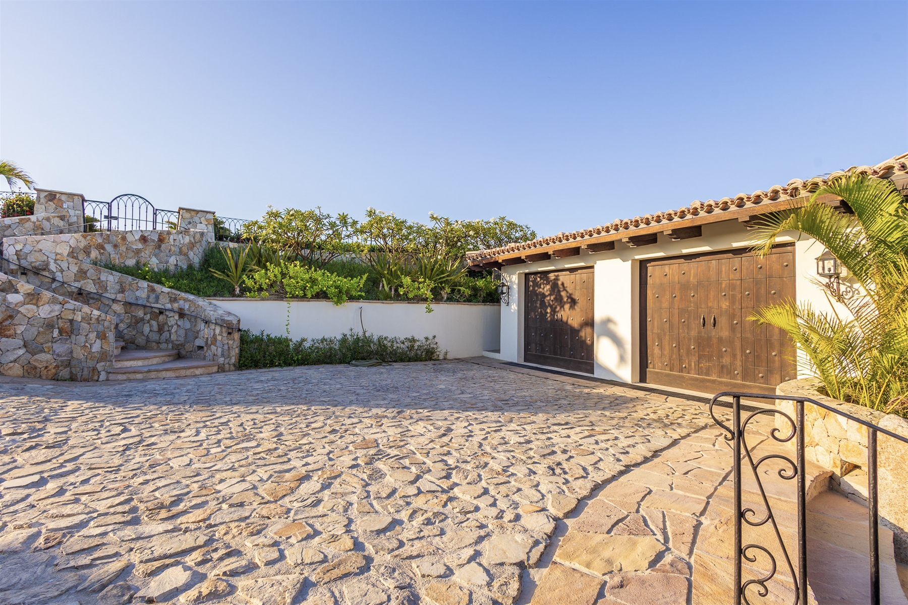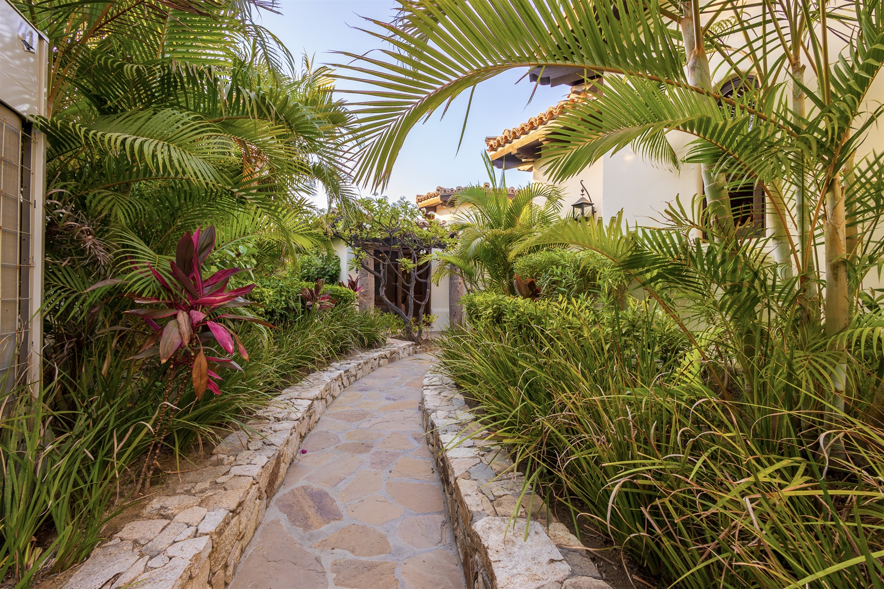 Casa Lomboy features six bedrooms and 6.5 bathrooms, spanning 5,500 square feet of modern finishes blended with old-world architecture. Surrounded by lush gardens, the villa overlooks the 16th hole of the world-renowned Jack Nicklaus Ocean Golf Course and offers impressive views of the Sea of Cortes and Punta Ballena.