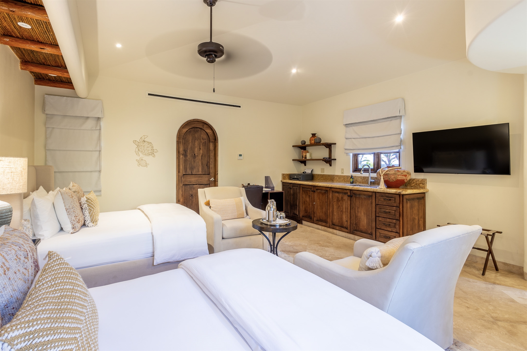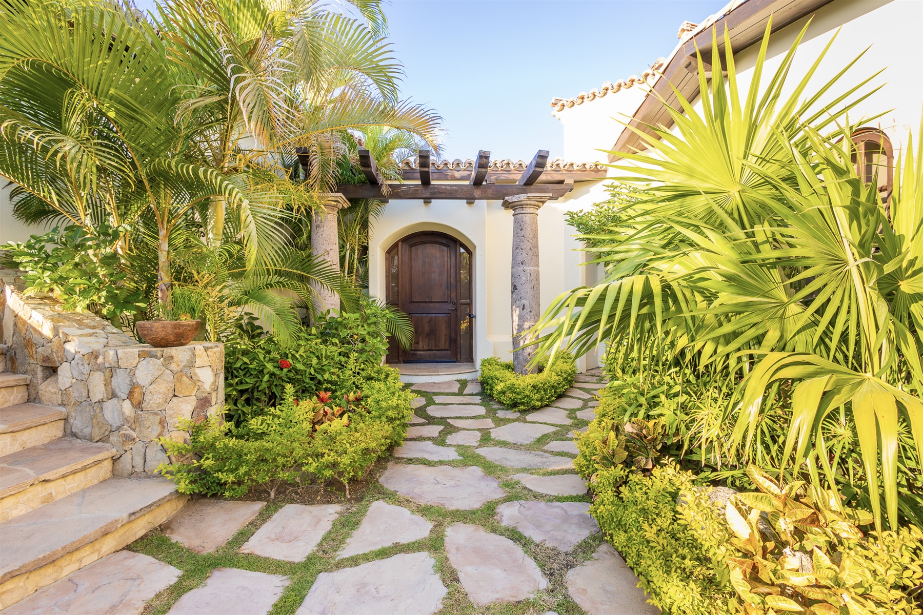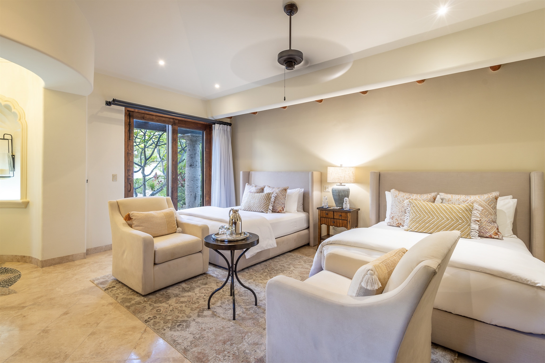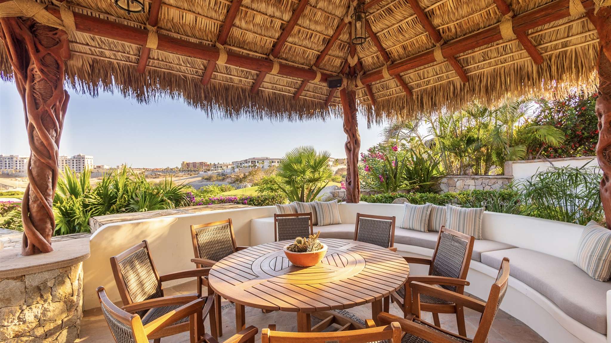 Located in the double-gated community of Cabo del Sol, Casa Lomboy is as close to the beach as you can get, just a 2-minute walk away. The tasteful decorations throughout the villa enhance its charm, and each bedroom has a private pergola, perfect for reading and taking siestas. All bedrooms have en-suite bathrooms with travertine and modern fixtures.