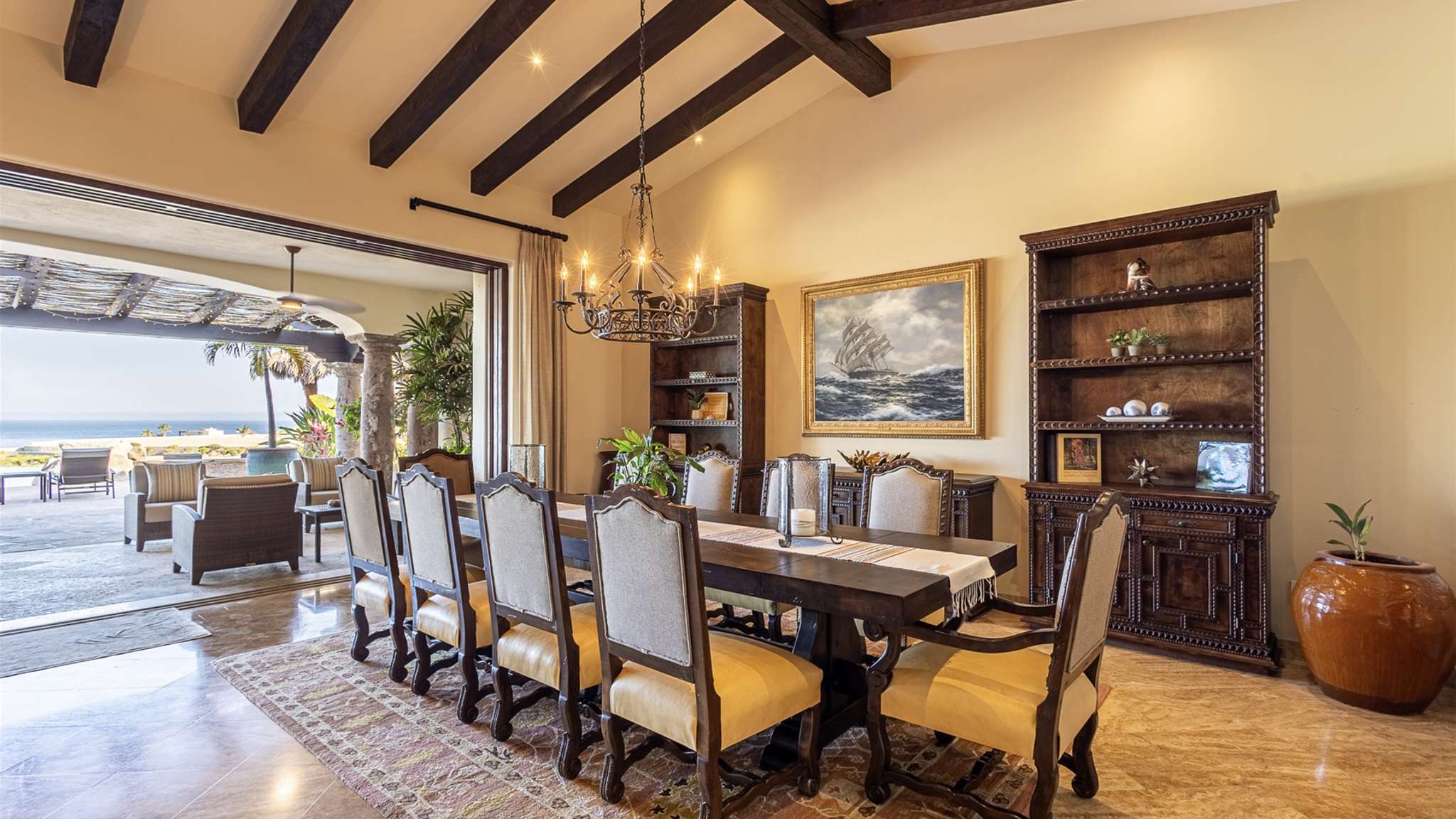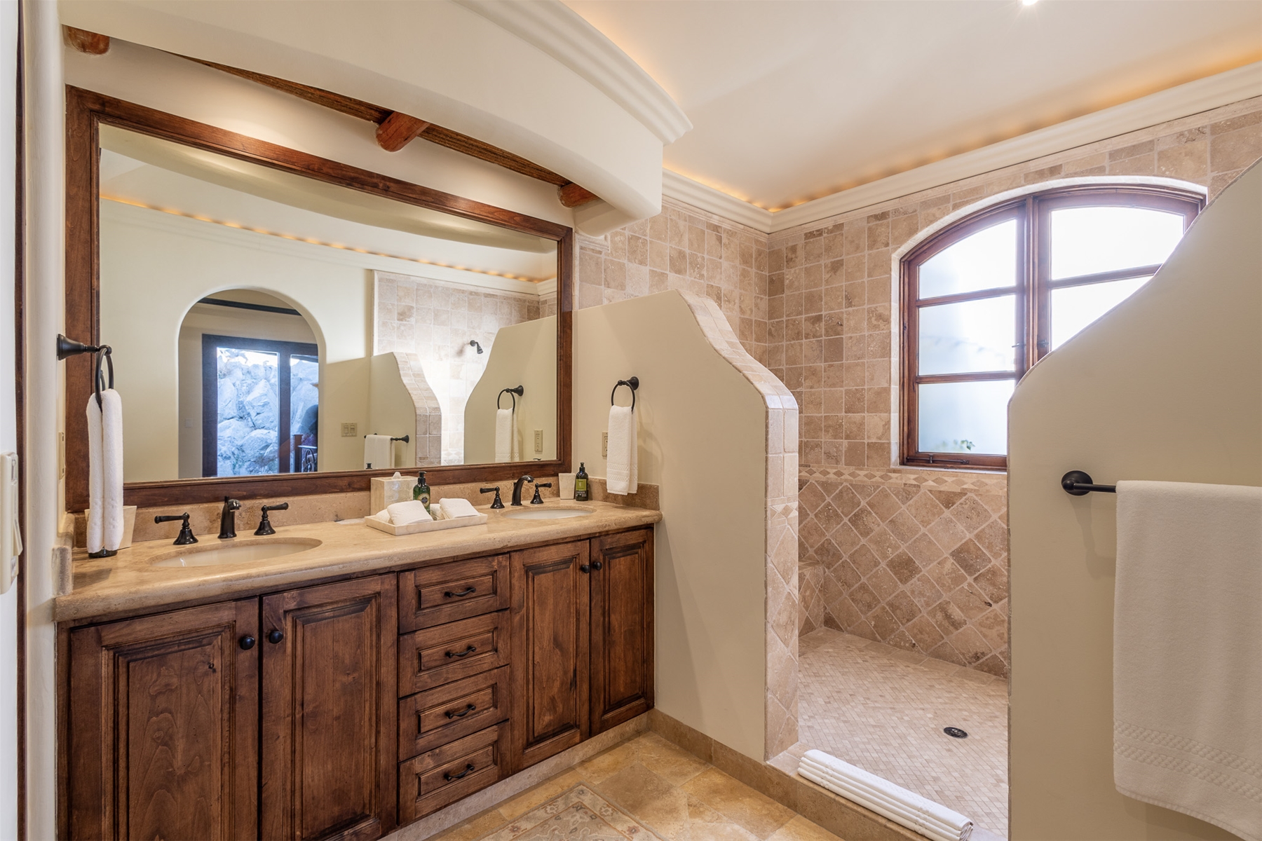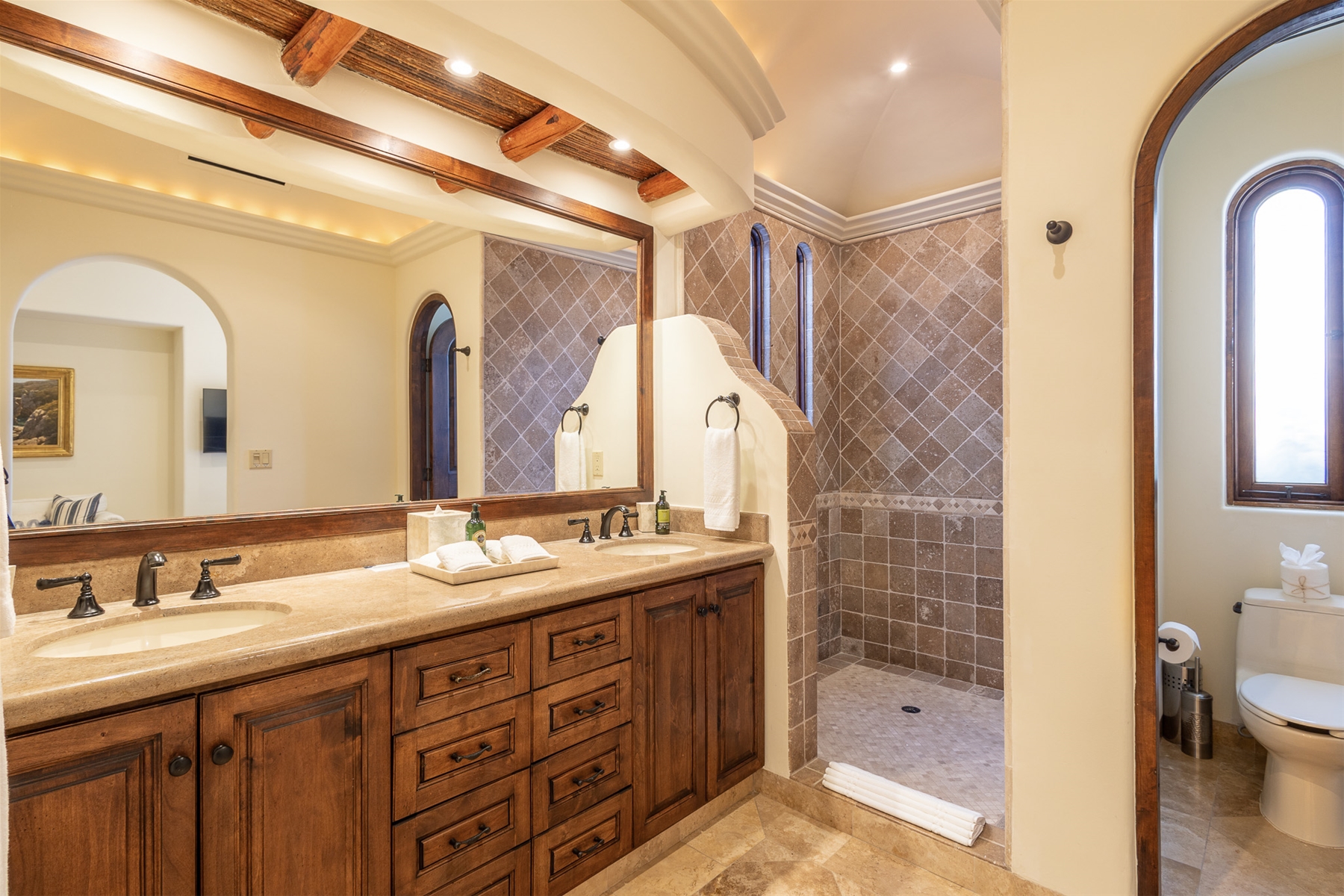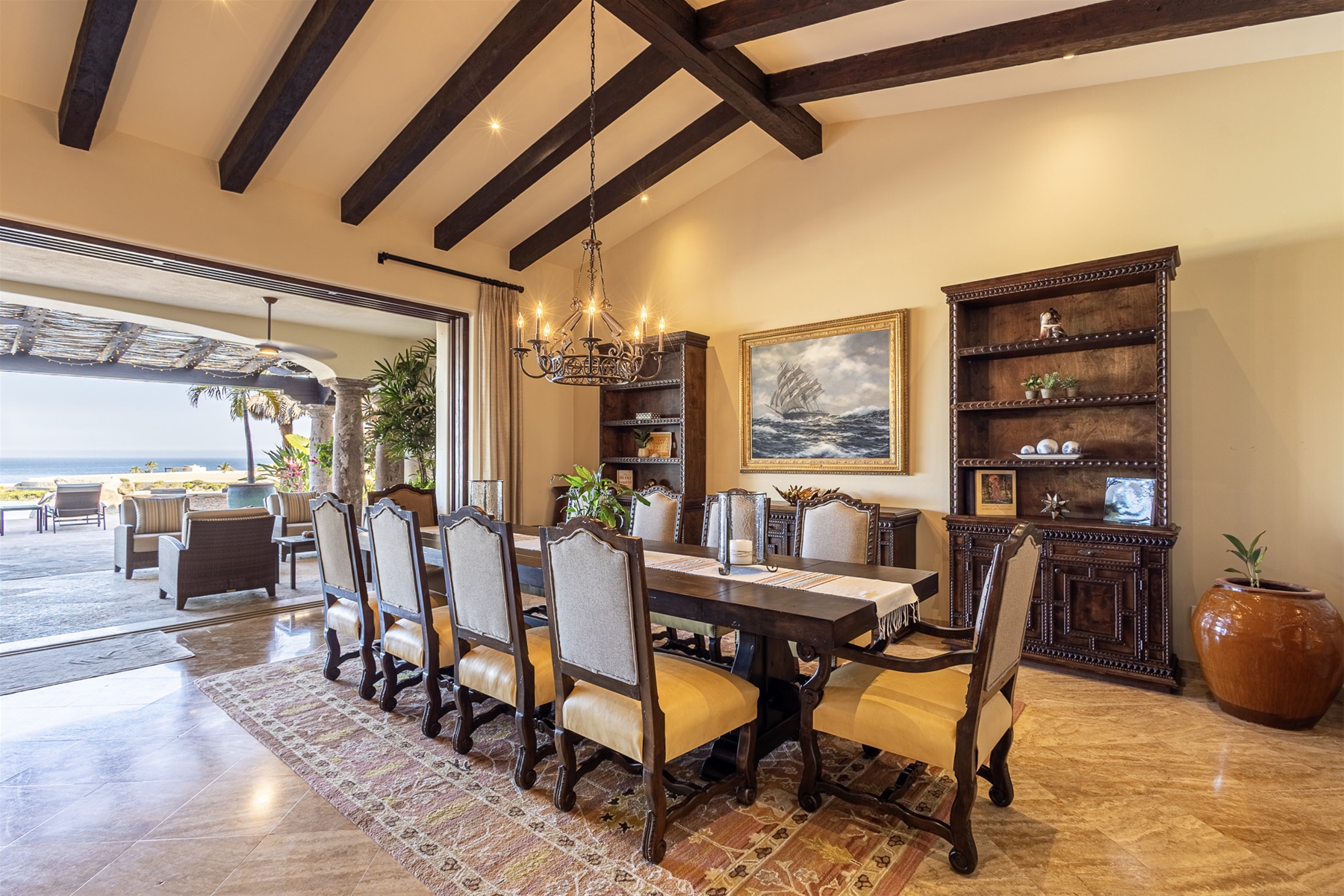 Located in the double-gated community of Cabo del Sol, Casa Lomboy is as close to the beach as you can get, just a 2-minute walk away. The tasteful decorations throughout the villa enhance its charm, and each bedroom has a private pergola, perfect for reading and taking siestas. All bedrooms have en-suite bathrooms with travertine and modern fixtures.