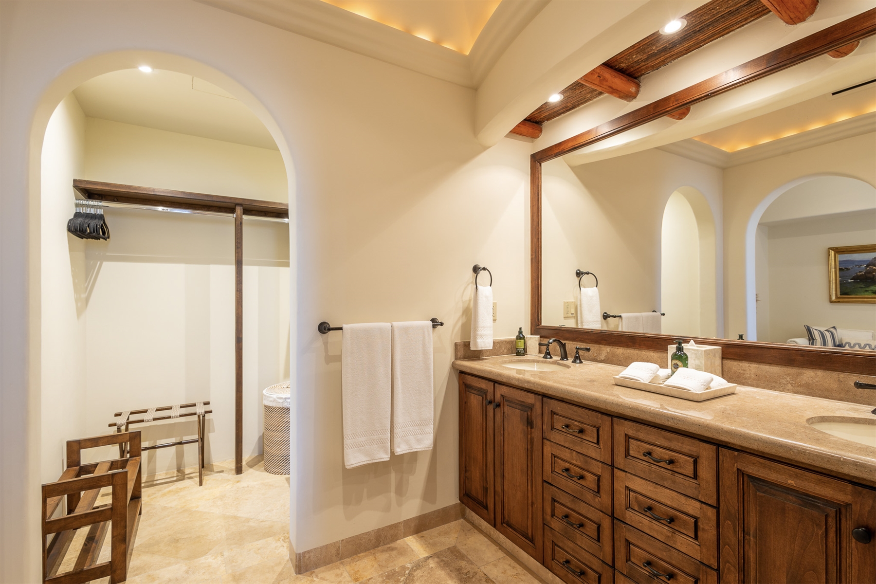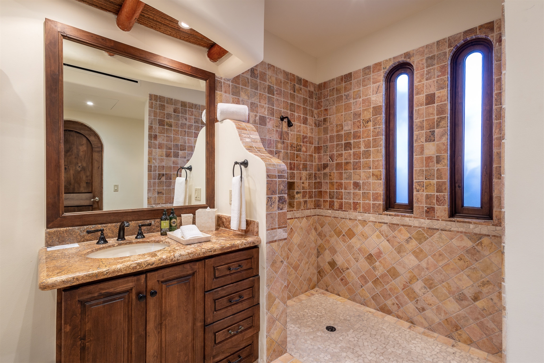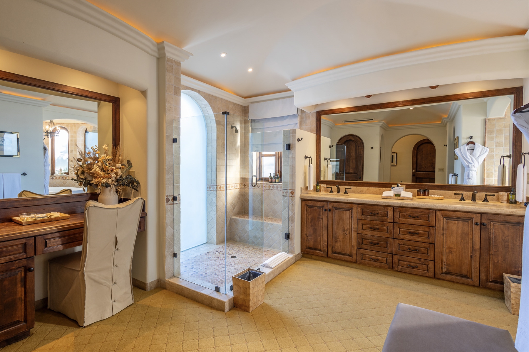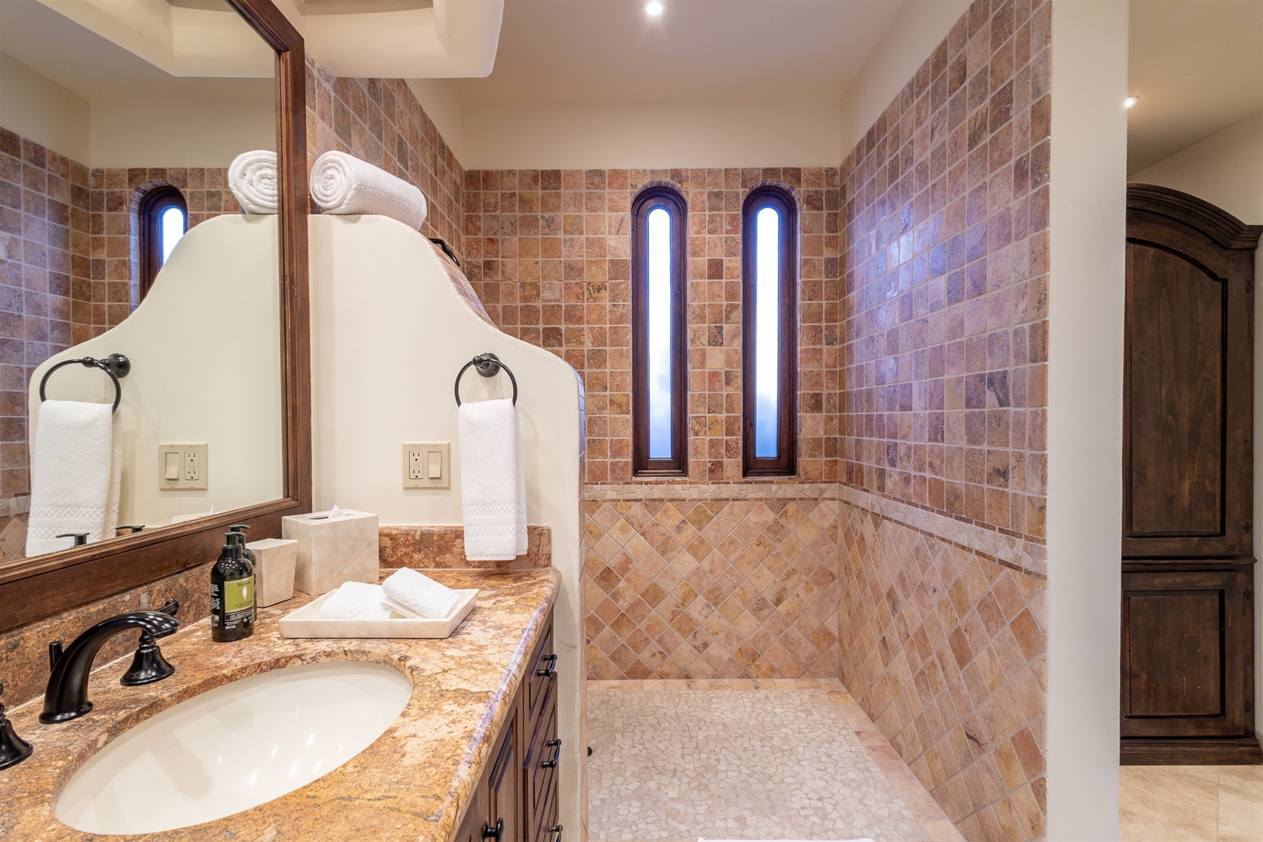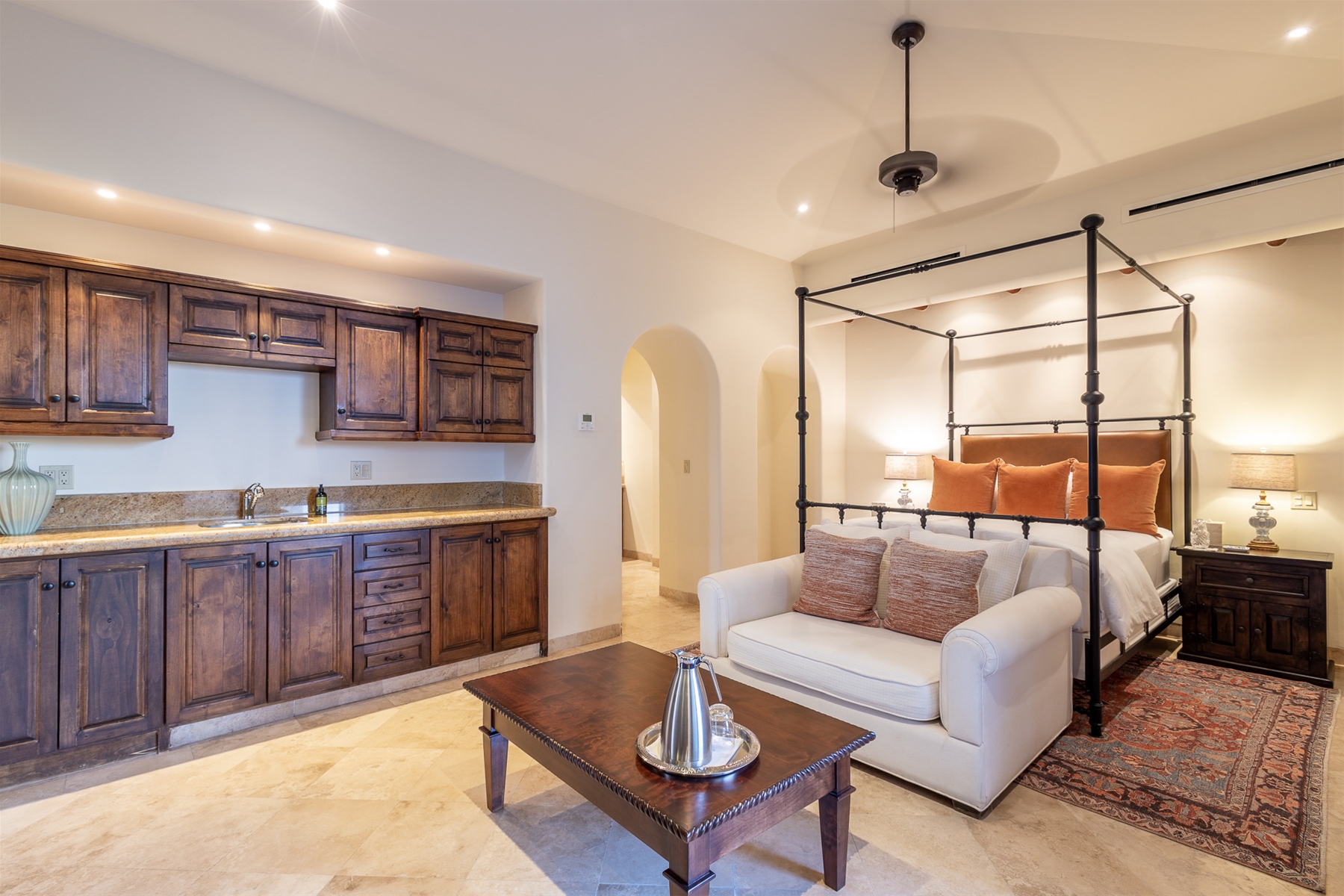Located in the double-gated community of Cabo del Sol, Casa Lomboy is as close to the beach as you can get, just a 2-minute walk away. The tasteful decorations throughout the villa enhance its charm, and each bedroom has a private pergola, perfect for reading and taking siestas. All bedrooms have en-suite bathrooms with travertine and modern fixtures.
