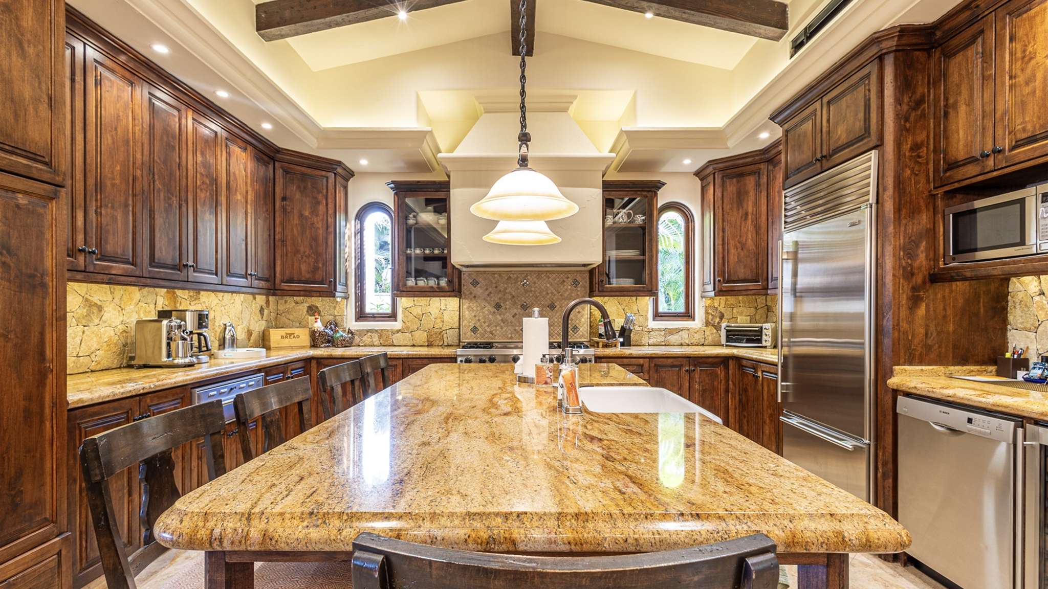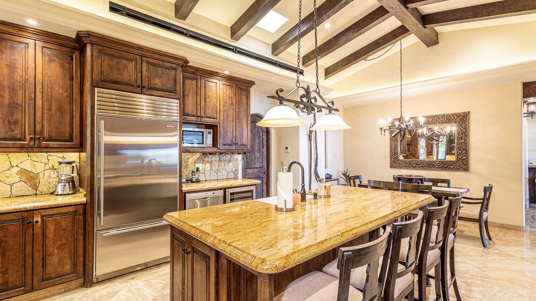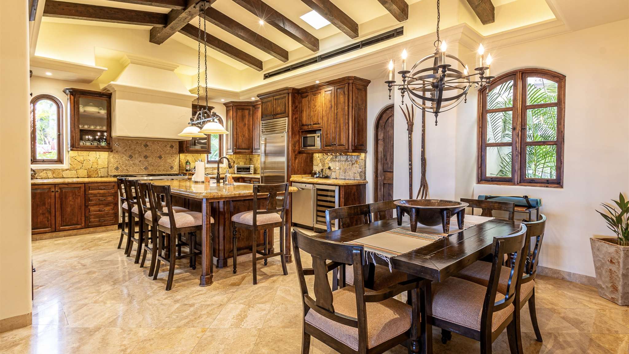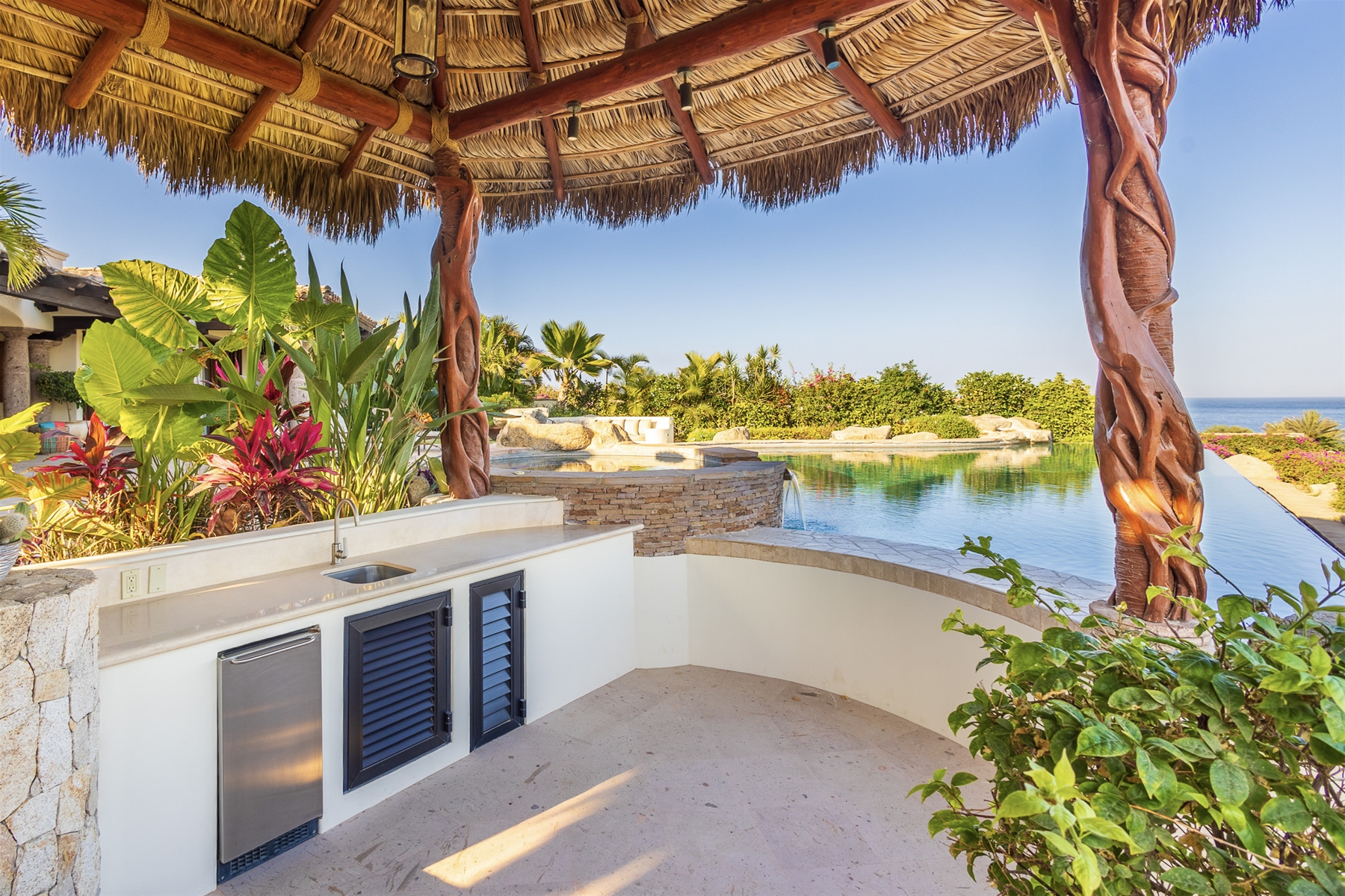 The kitchen is fully stocked with modern appliances and items, making your cooking experience easy and enjoyable. From the kitchen, you have direct access to the pool and quick access to the outdoor gas BBQ. The outdoor amenities at Casa Lomboy are exceptional, including a swim-up palapa wet bar, outdoor dining area, shaded living area, fire pit, infinity-edge pool, Jacuzzi, and plenty of sunbathing areas. A private cove is just a few steps away, perfect for a peaceful retreat.