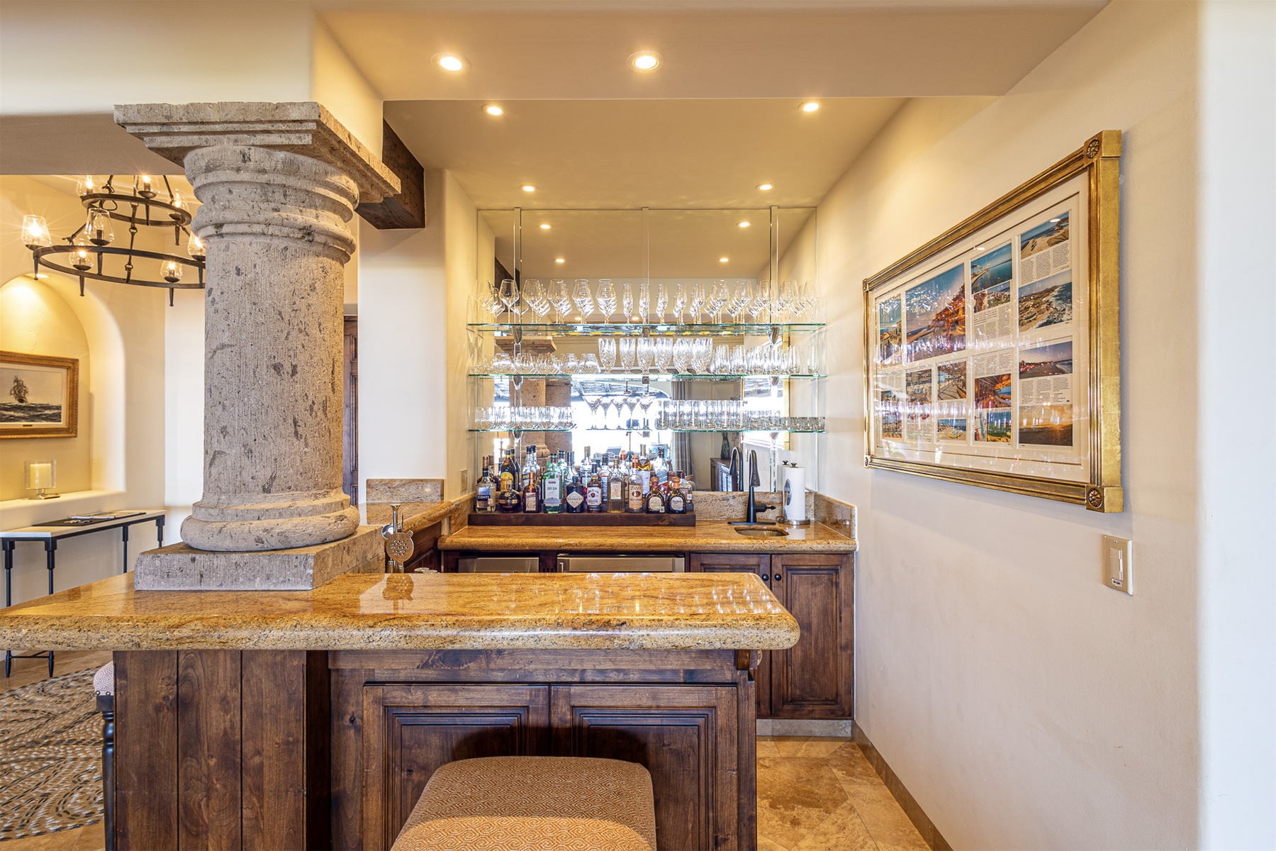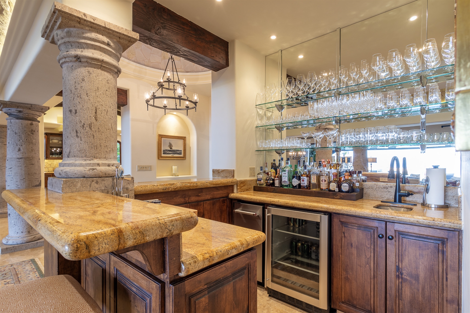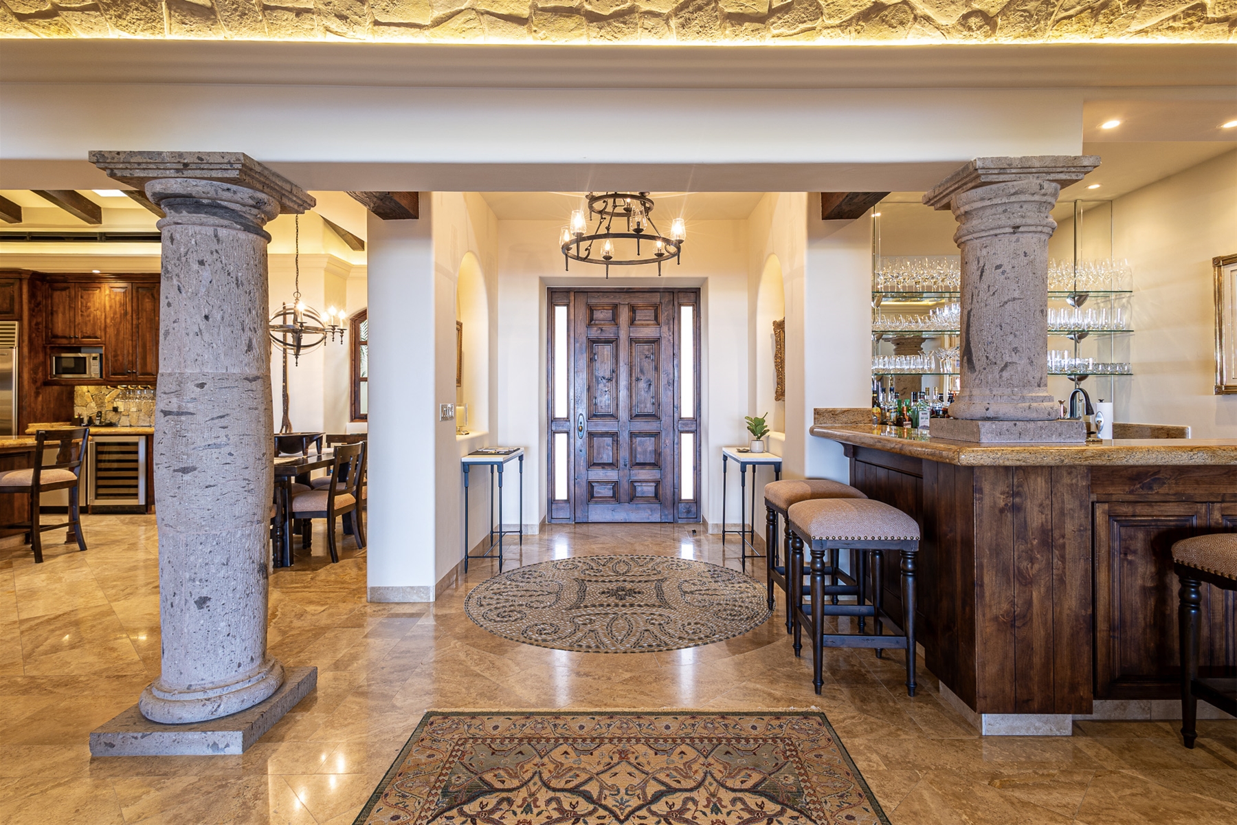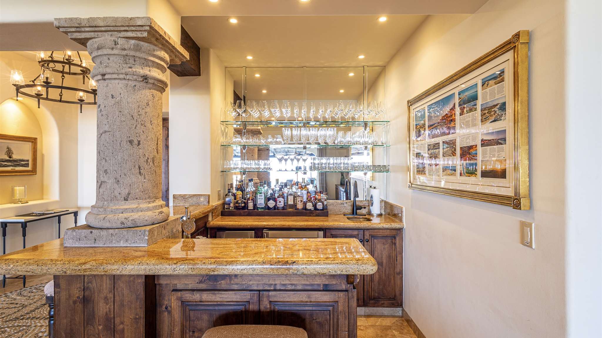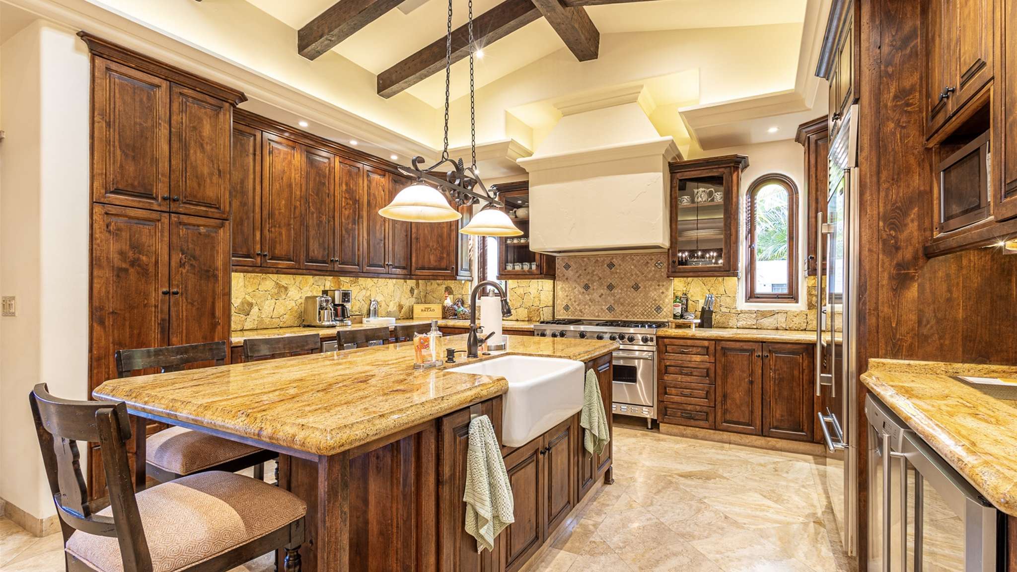 The kitchen is fully stocked with modern appliances and items, making your cooking experience easy and enjoyable. From the kitchen, you have direct access to the pool and quick access to the outdoor gas BBQ. The outdoor amenities at Casa Lomboy are exceptional, including a swim-up palapa wet bar, outdoor dining area, shaded living area, fire pit, infinity-edge pool, Jacuzzi, and plenty of sunbathing areas. A private cove is just a few steps away, perfect for a peaceful retreat.