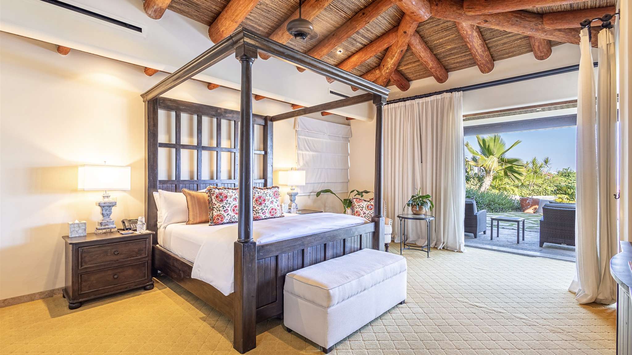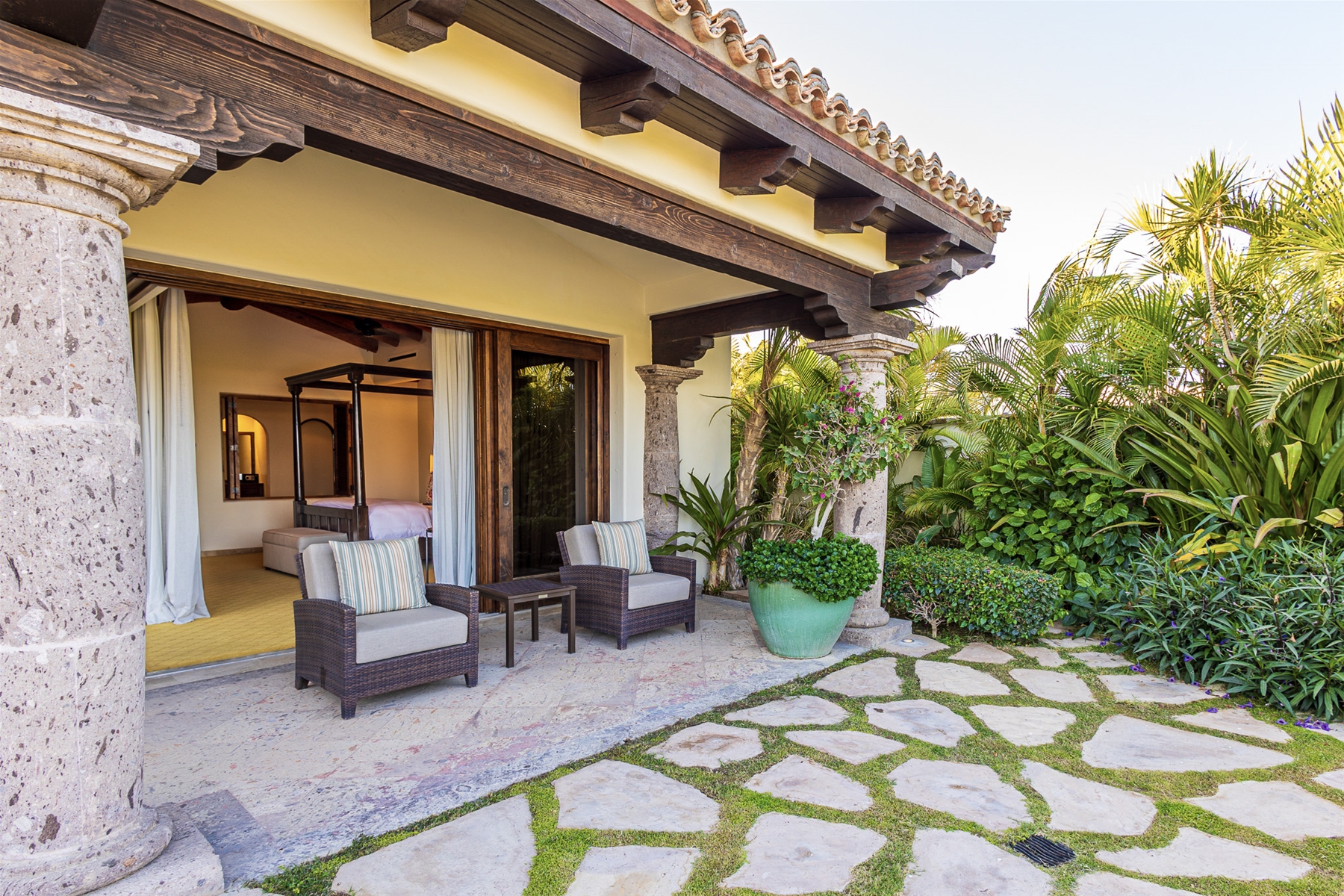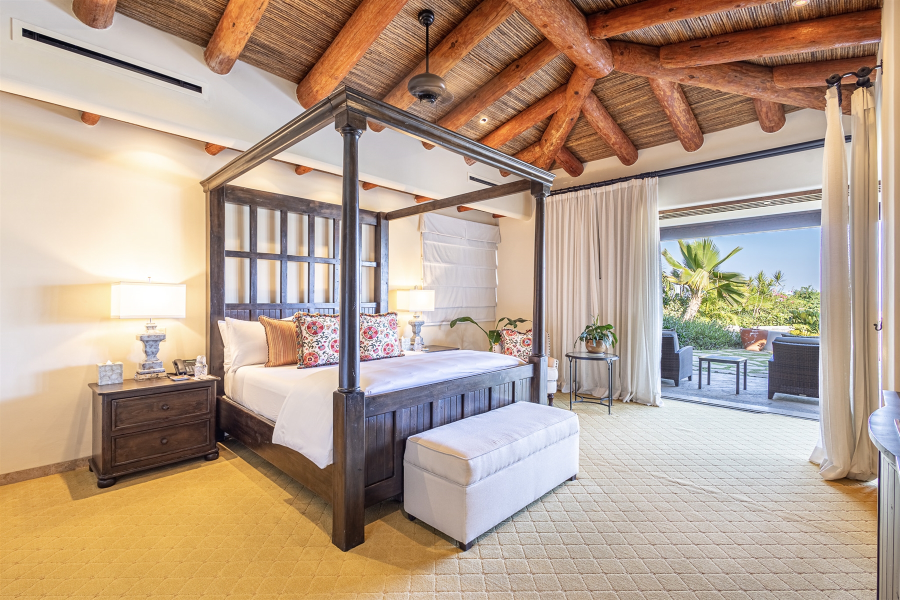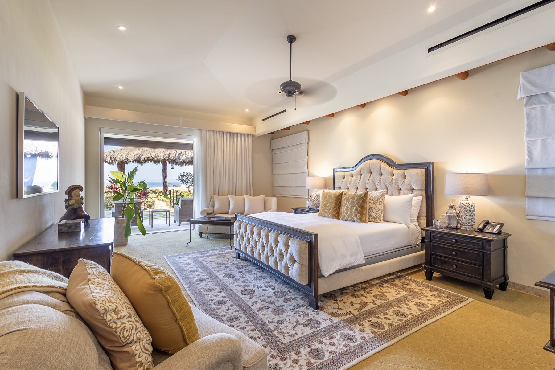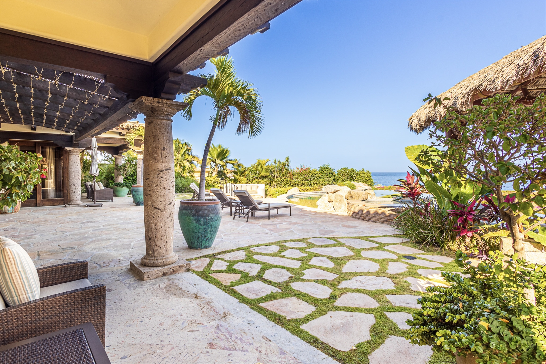 In the main house, there are four ocean-facing bedrooms. Two of these are master suites with access to the pool and a wonderful palapa area. The two back bedrooms face the ocean and are surrounded by lush gardens for added privacy. There are two separate casitas, each with en-suite bathrooms and inside and outside sitting areas. All bedrooms have access to the pool from their terraces.