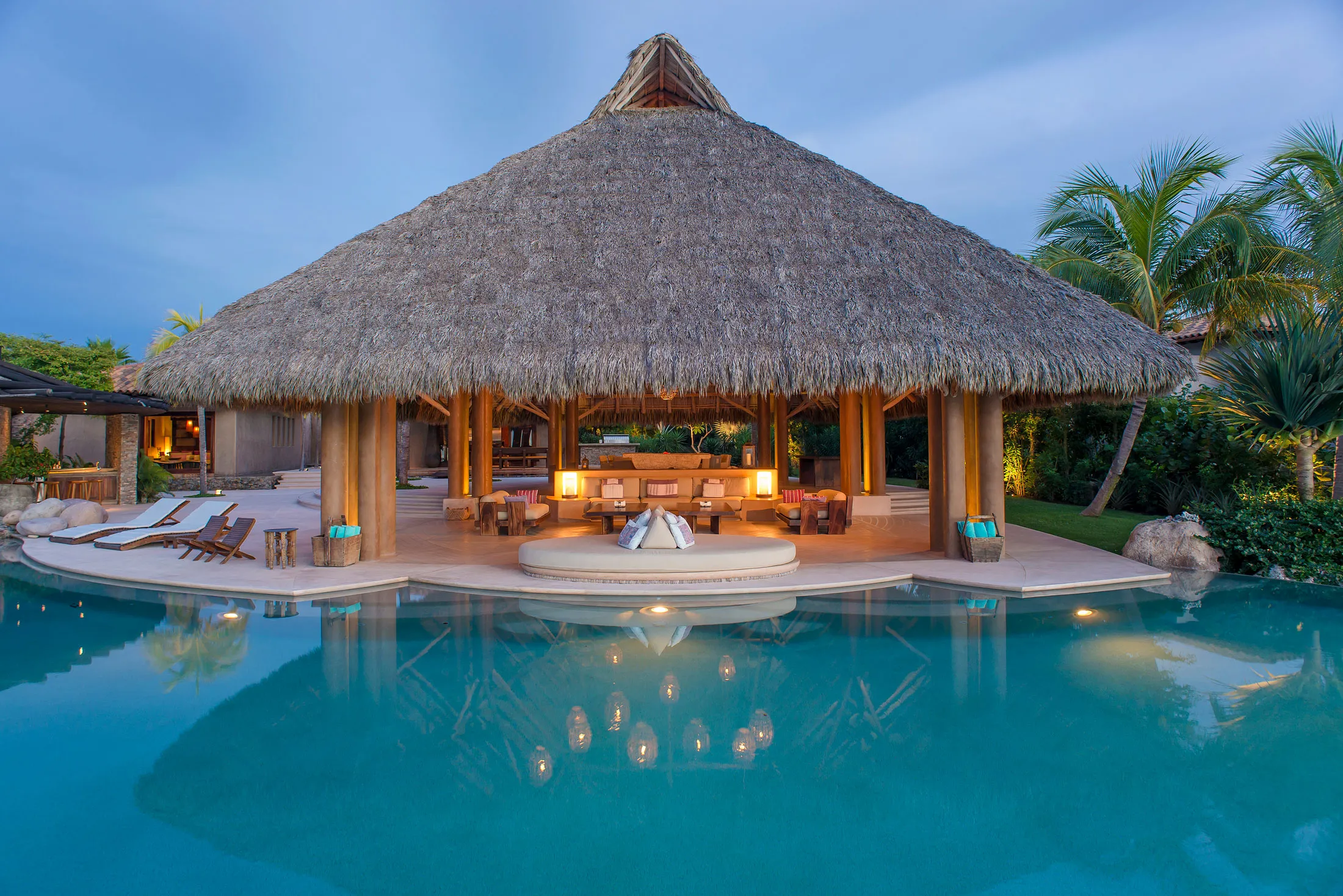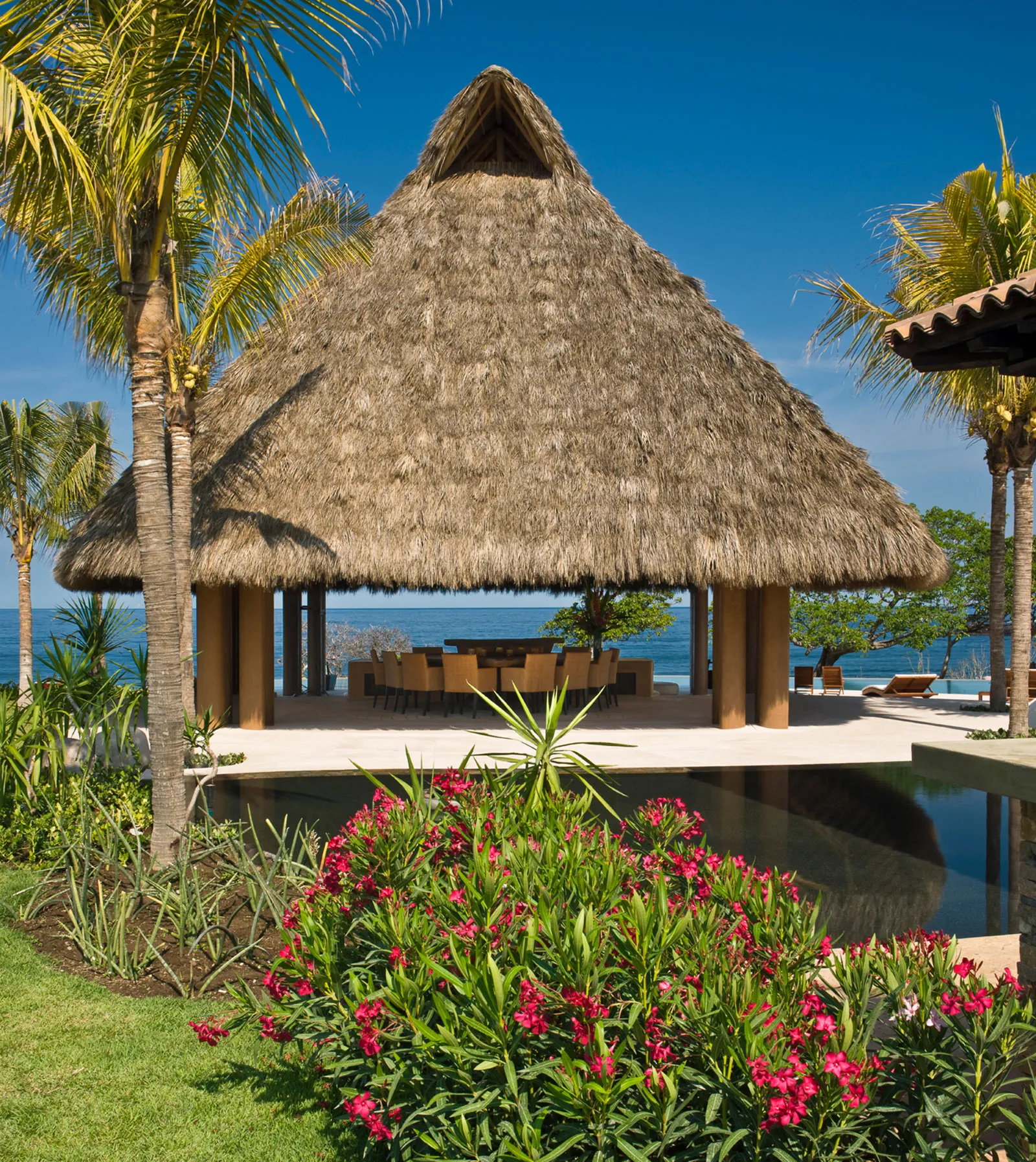 The villa’s soothing tempo extends into every corner. A dedicated yoga sanctuary offers a peaceful space for stretching, meditation, or quiet contemplation, attuned to the gentle soundtrack of the waves. Nearby, a grand dining palapa becomes the social heart of the home, where guests can gather under a soaring, open-air roof that frames the ocean breezes and coastal views.