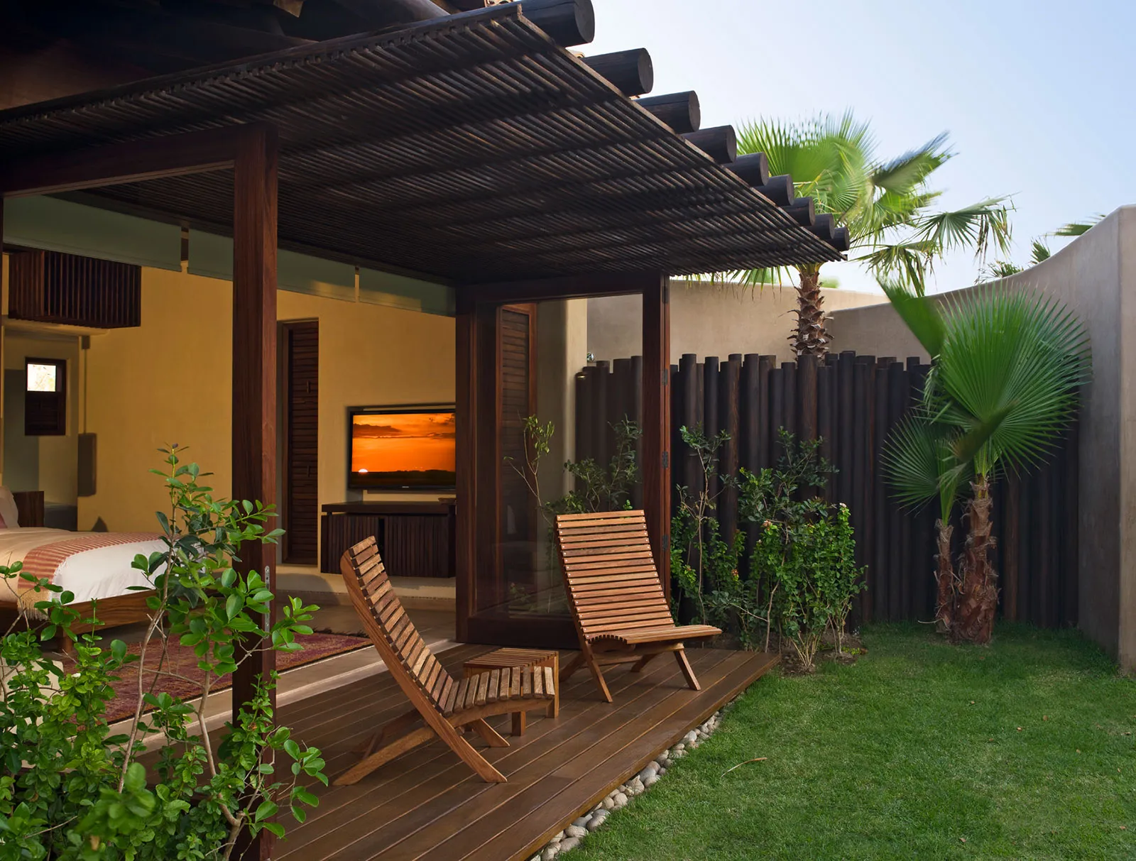King size bed, Air conditioning, Control 4 remote control & wireless music streaming system, Ensuite bathroom with indoor & outdoor shower, Flat screen satalite TV, Private patio with garden view, Wifi access