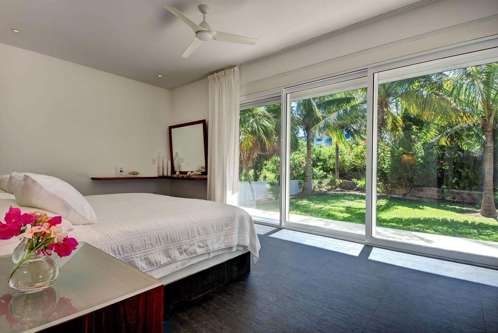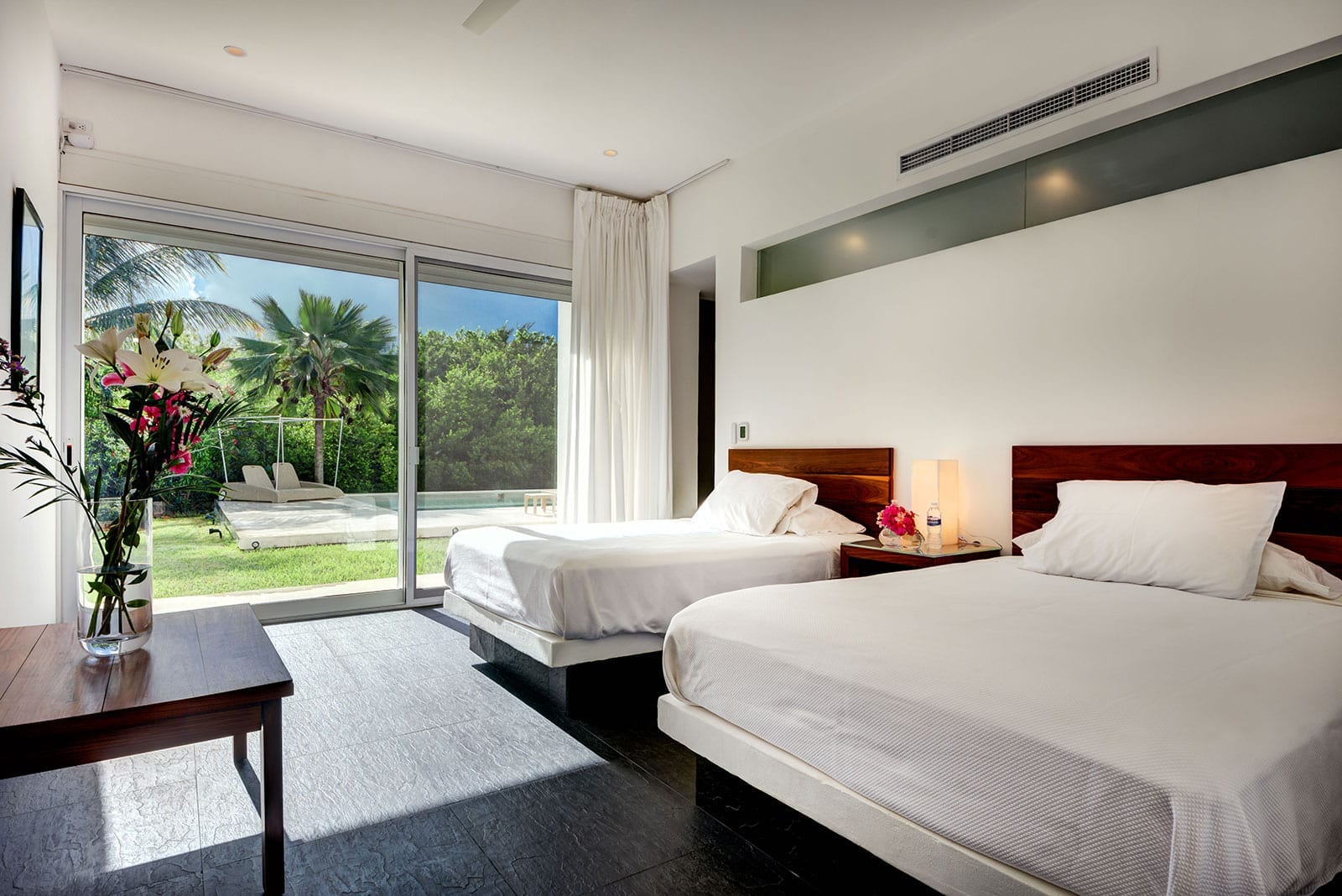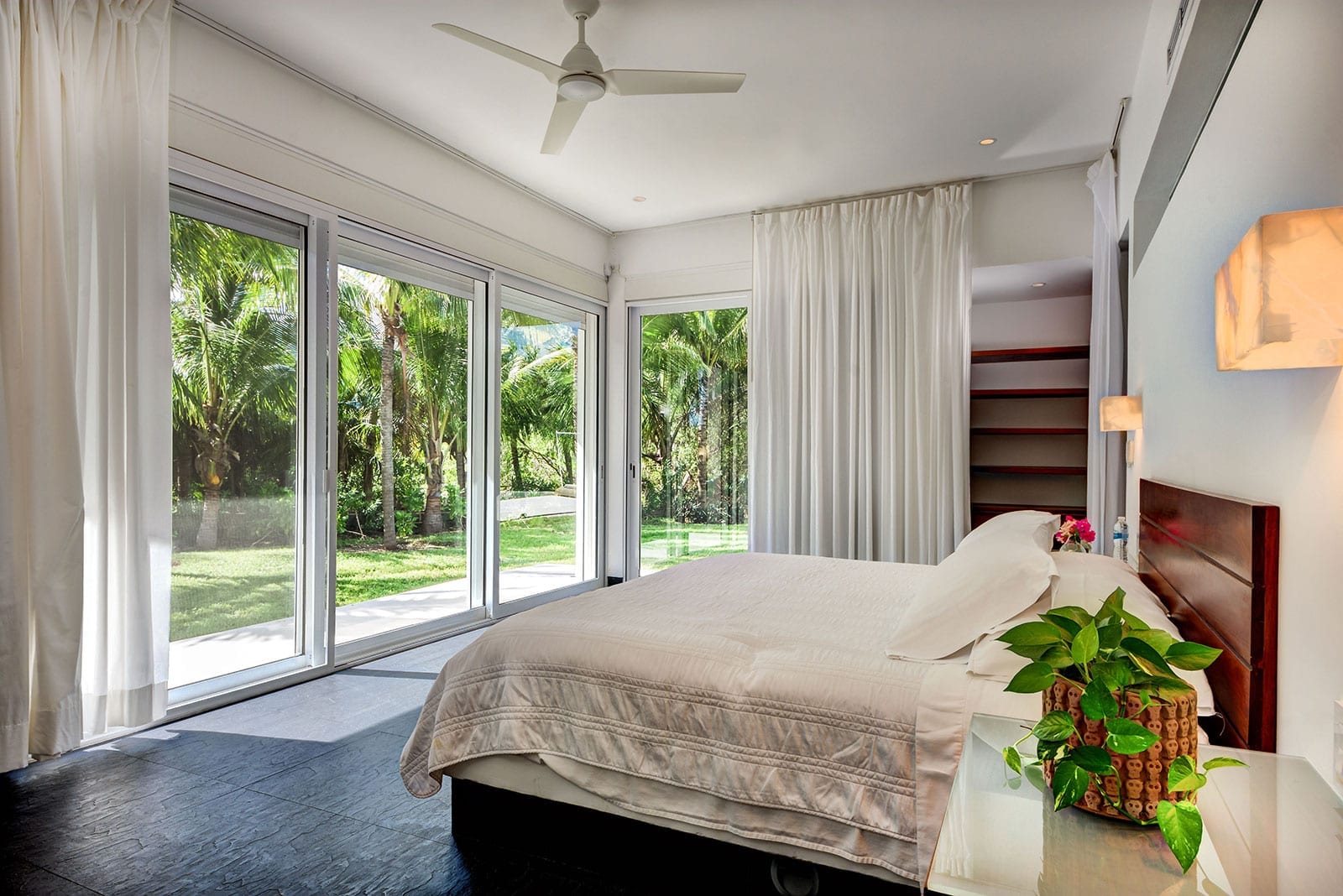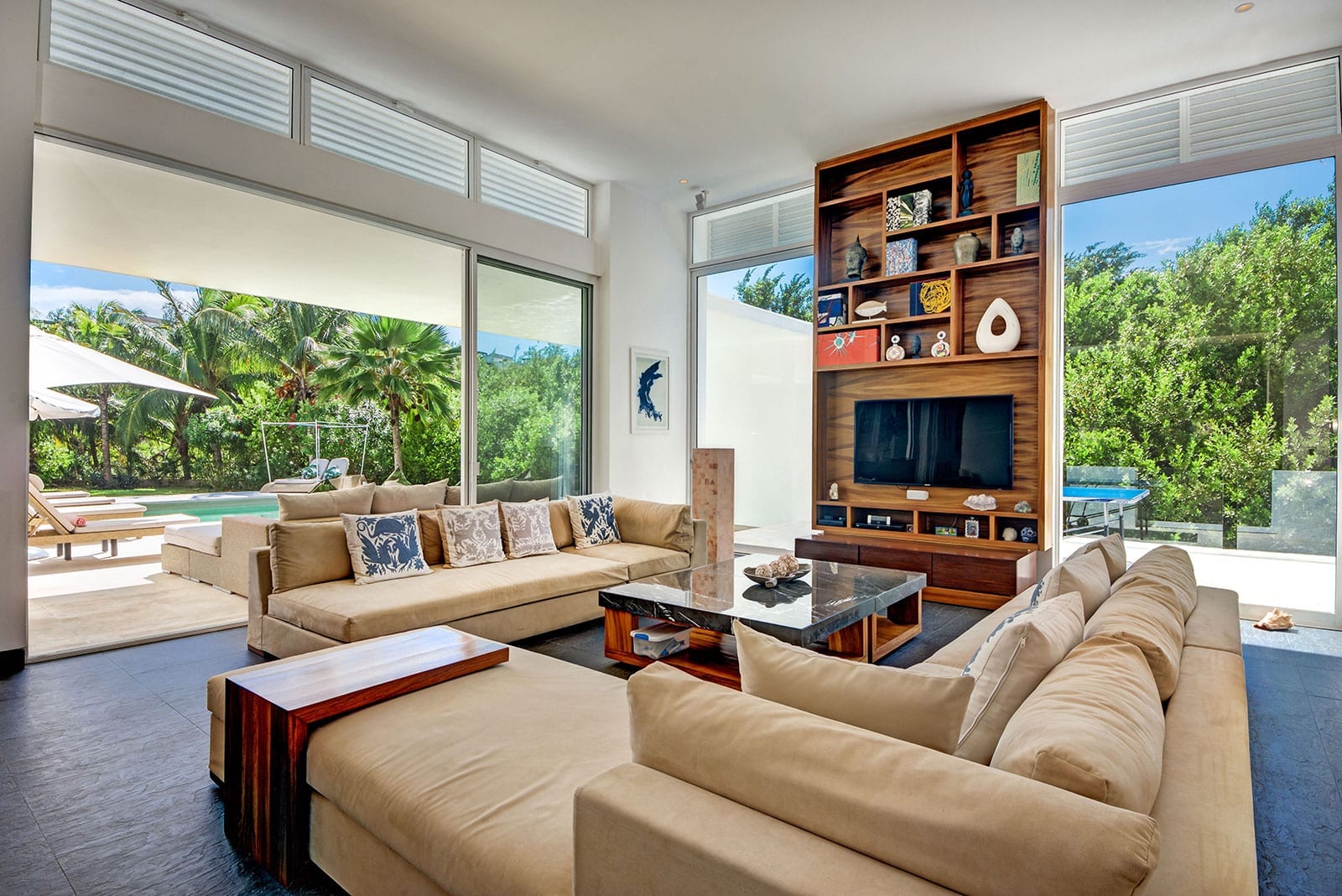 The villa sits within a prestigious enclave that feels sheltered yet connected, with a setting that emphasizes tranquility and a strong sense of safety. Floor-to-ceiling windows draw in the natural surroundings, while a lush tropical garden and private outdoor areas create a gentle transition between interior and exterior spaces. A nearby private beach with powdery white sand and clear waters adds a classic Caribbean dimension to the experience, complemented by a rustic palapa for shaded relaxation.