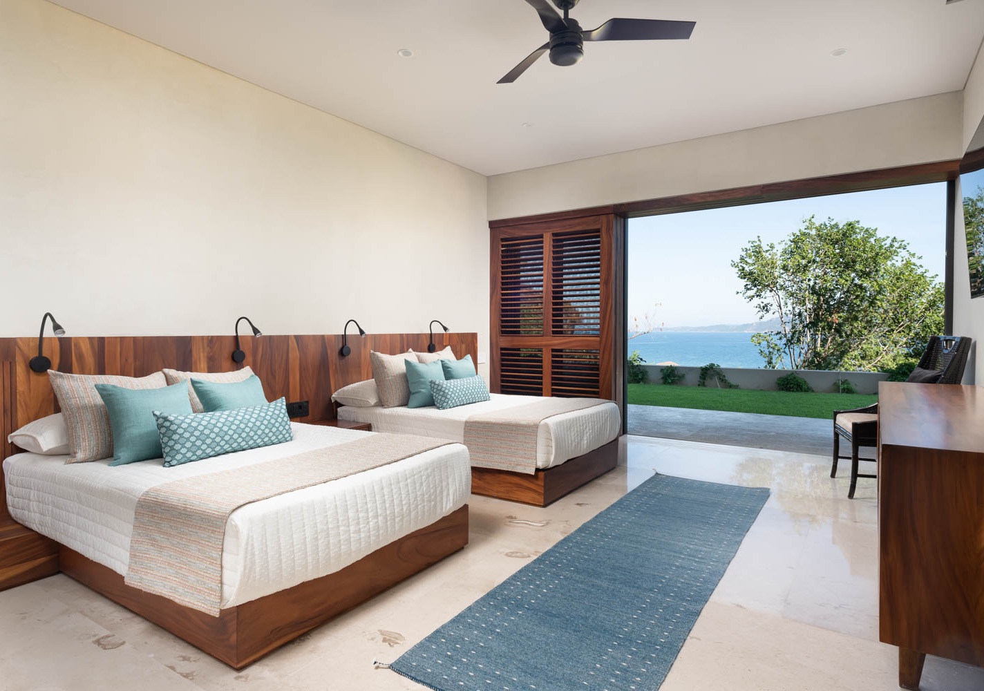 Relax and enjoy the ocean views in this spacious room, furnished with two full-size and two single beds. Two separate bathrooms, each featuring a shower and an additional outdoor shower, add to the comforts. You can also enjoy amenities like a television, air conditioning, ceiling fan, a lush garden, and inviting outdoor furniture.