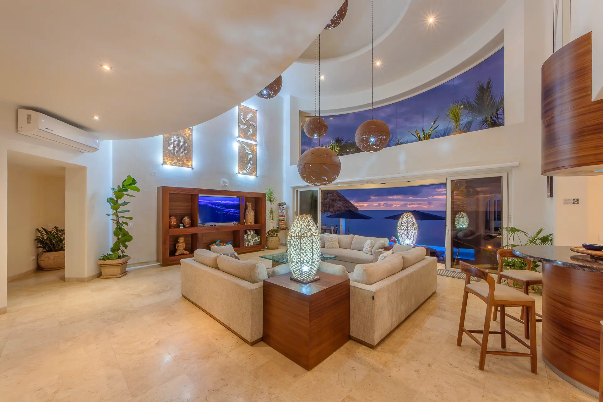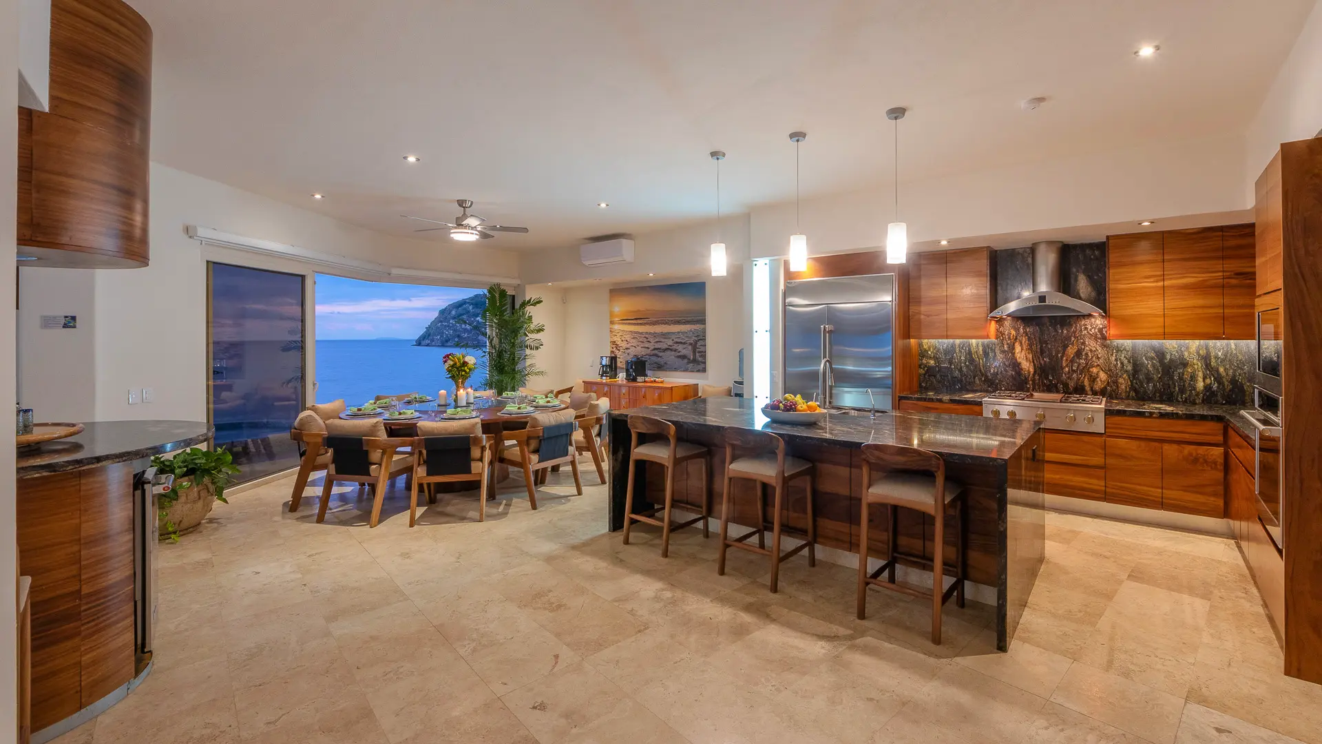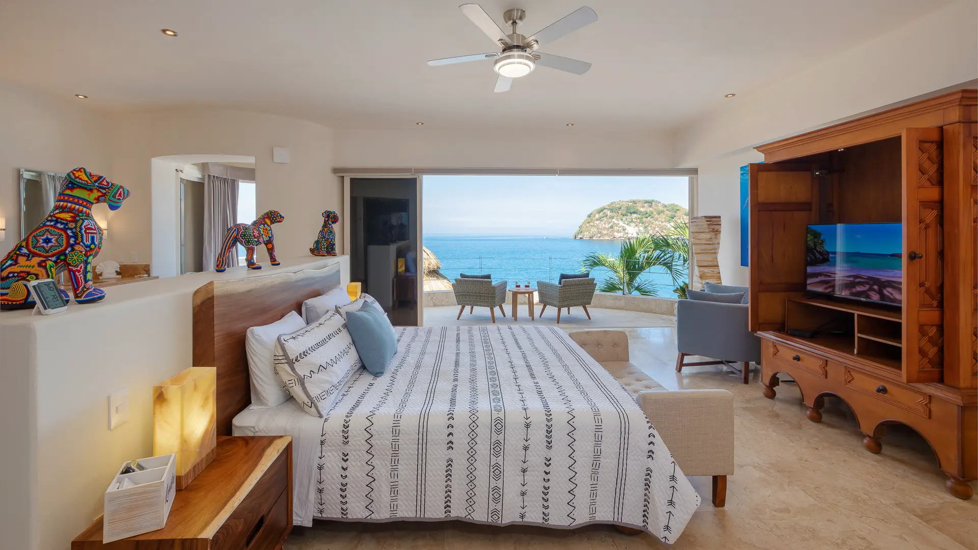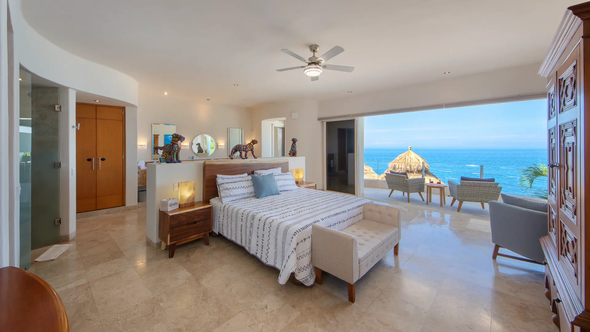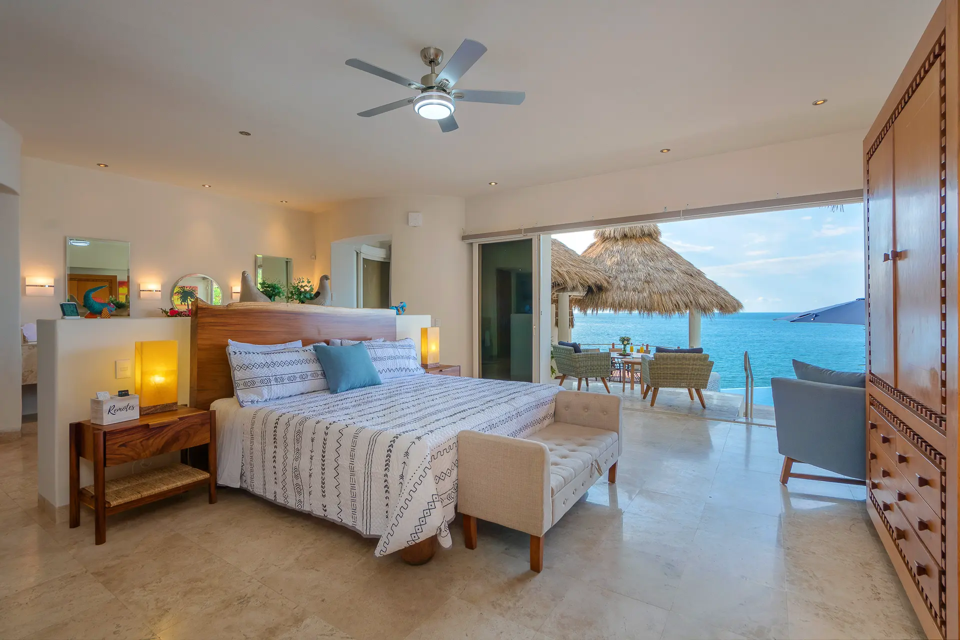 Daily life here naturally flows between indoor comfort and the open terrace, where an infinity pool extends the living space toward the bay. Guests might begin the day with a swim under the Mexican sun, transition to leisurely hours in the shaded outdoor lounge, and gather for alfresco meals as the light softens. The blend of modern amenities with traditional Mexican touches creates an inviting, lived-in elegance that suits both informal relaxation and more polished entertaining.
