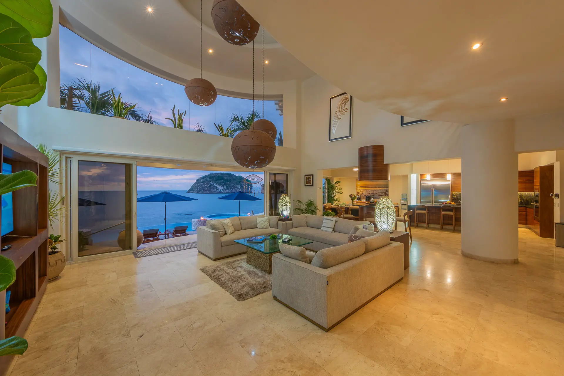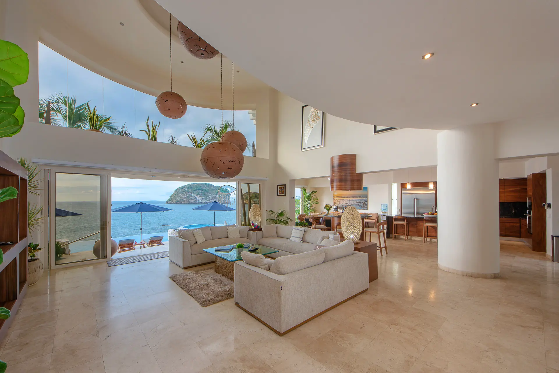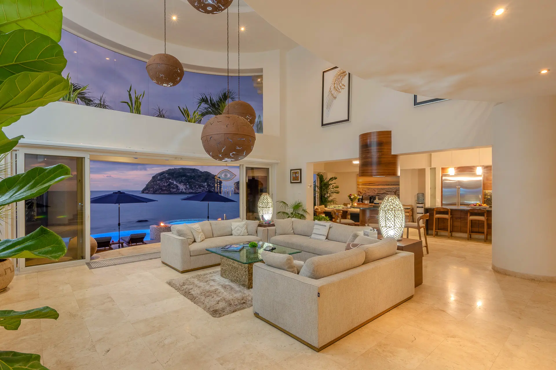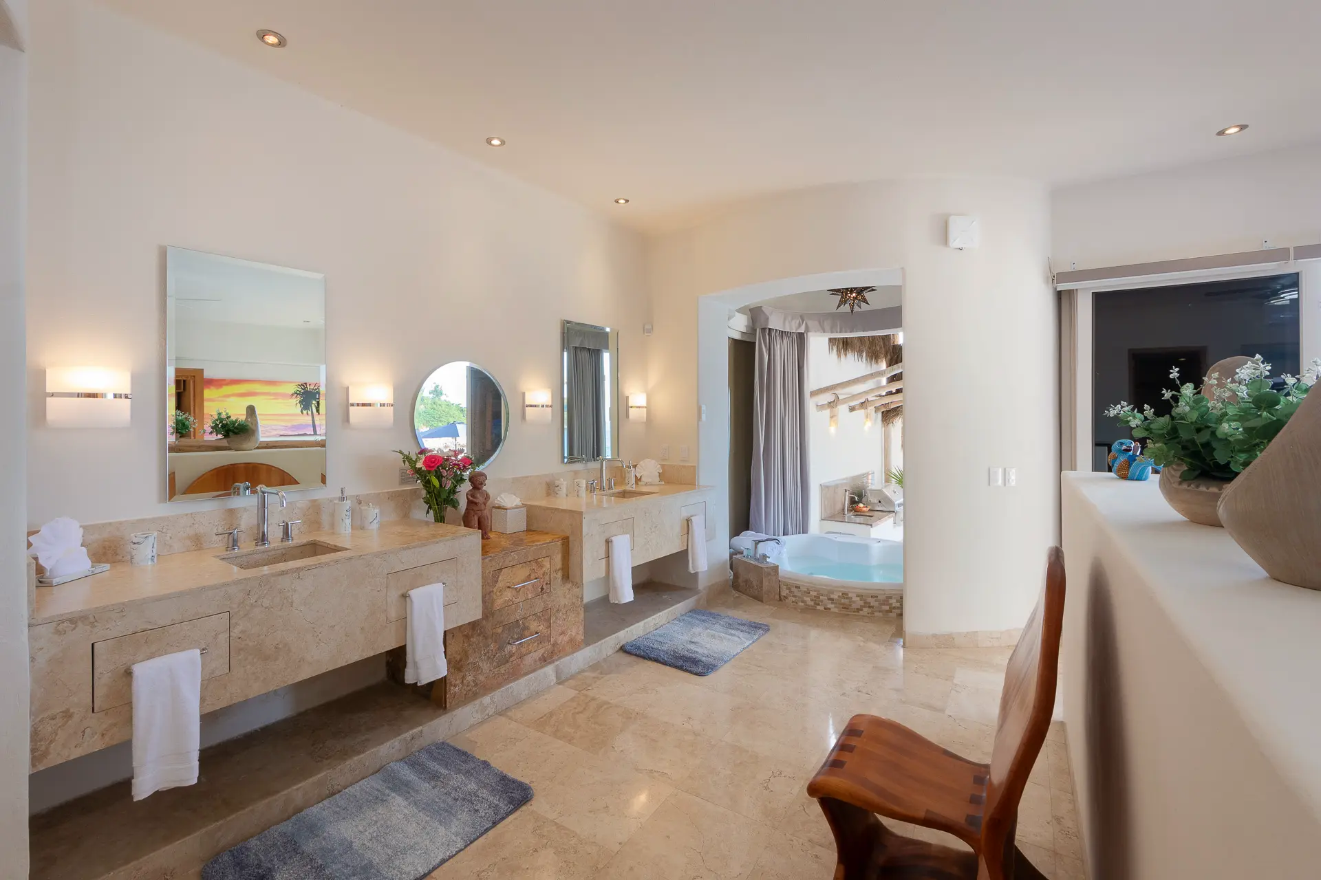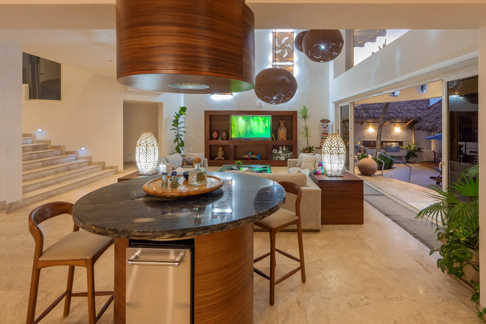 Daily life here naturally flows between indoor comfort and the open terrace, where an infinity pool extends the living space toward the bay. Guests might begin the day with a swim under the Mexican sun, transition to leisurely hours in the shaded outdoor lounge, and gather for alfresco meals as the light softens. The blend of modern amenities with traditional Mexican touches creates an inviting, lived-in elegance that suits both informal relaxation and more polished entertaining.