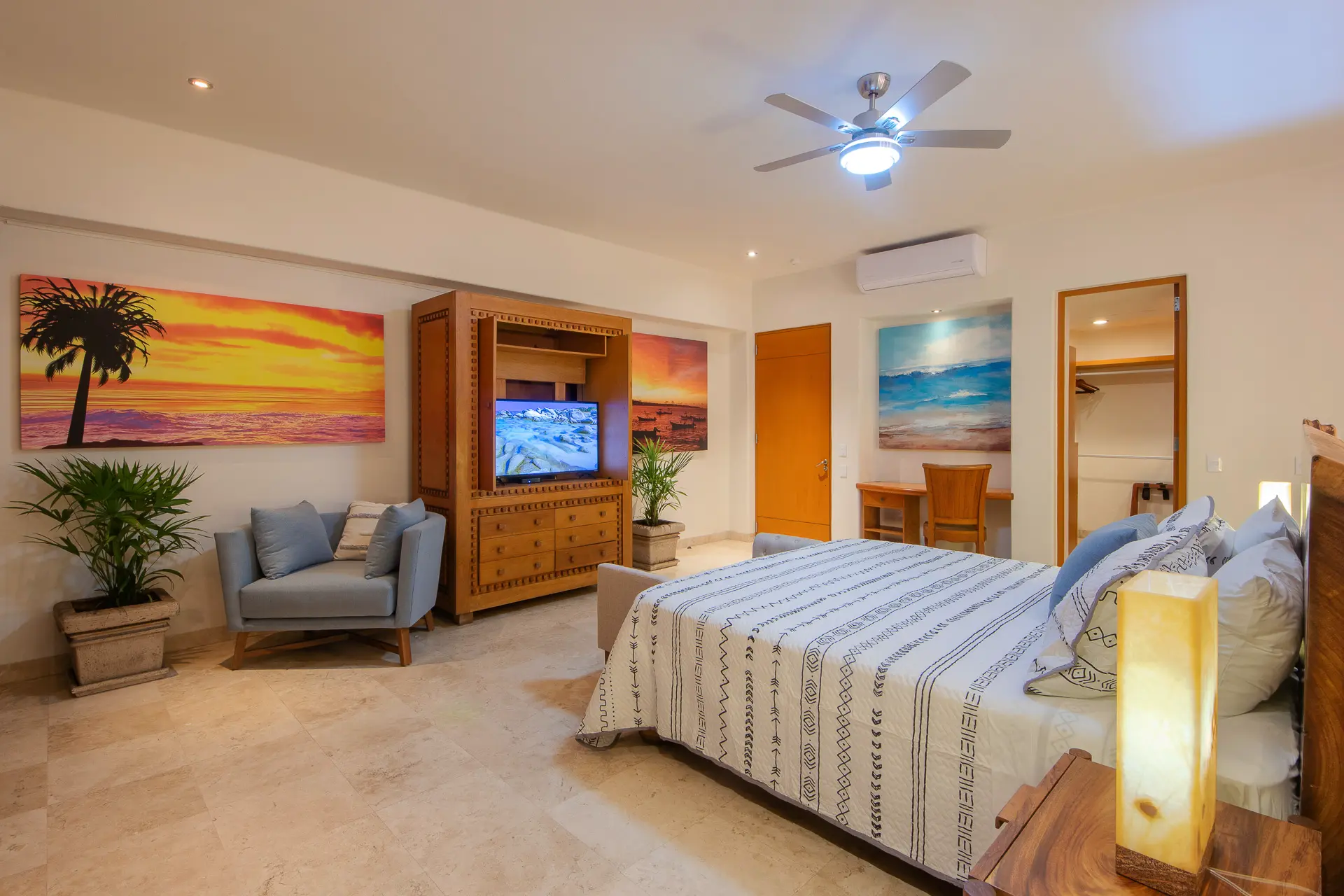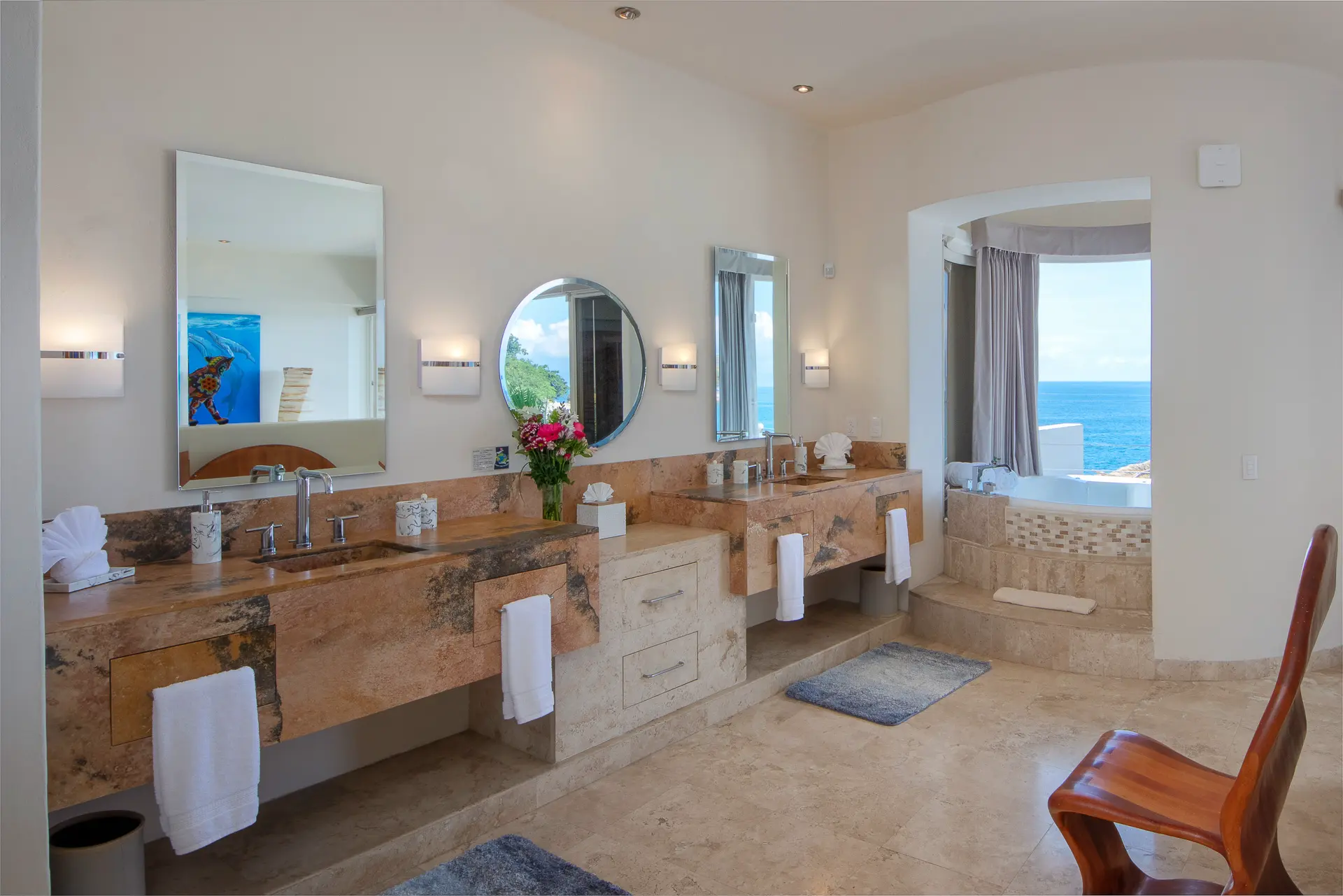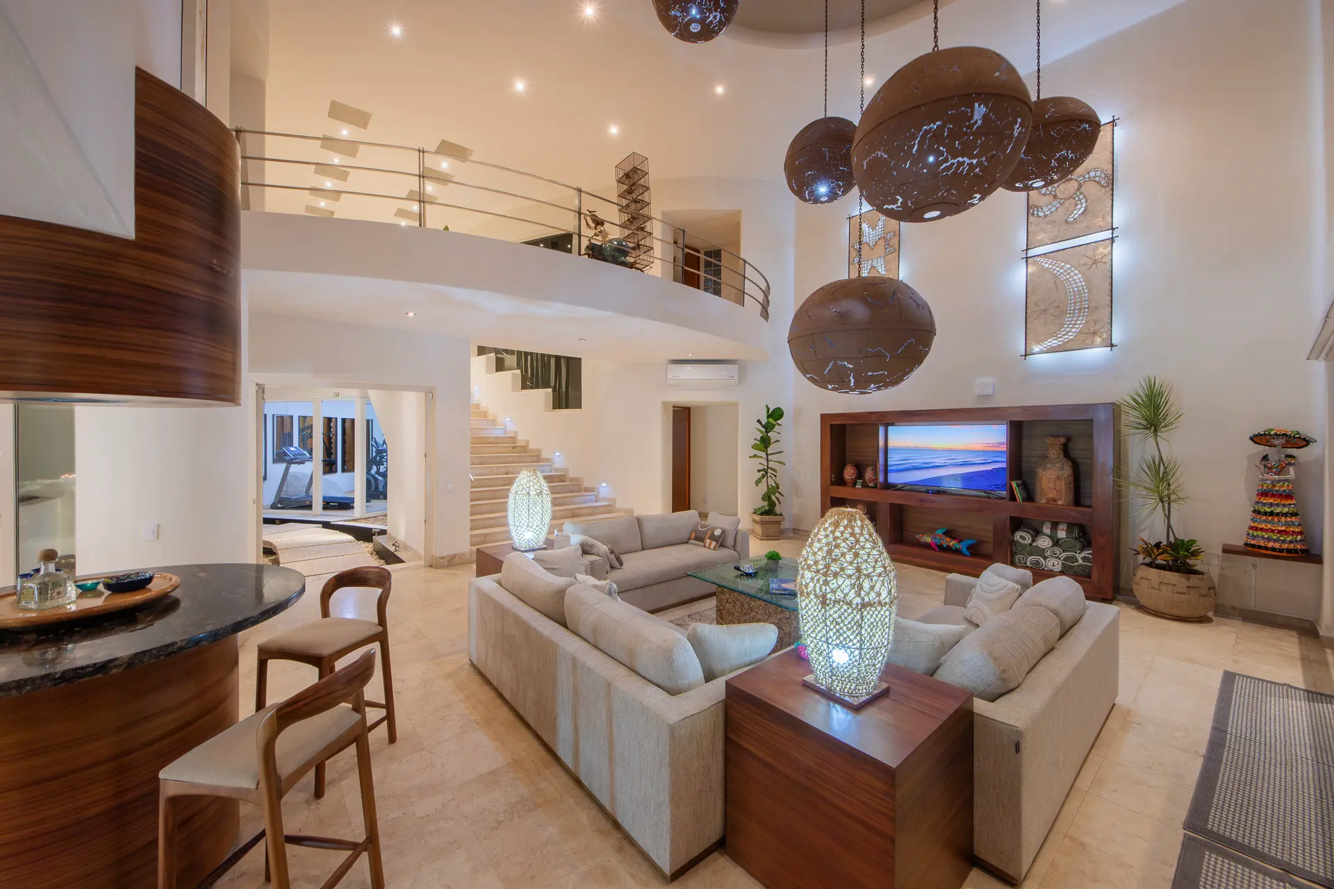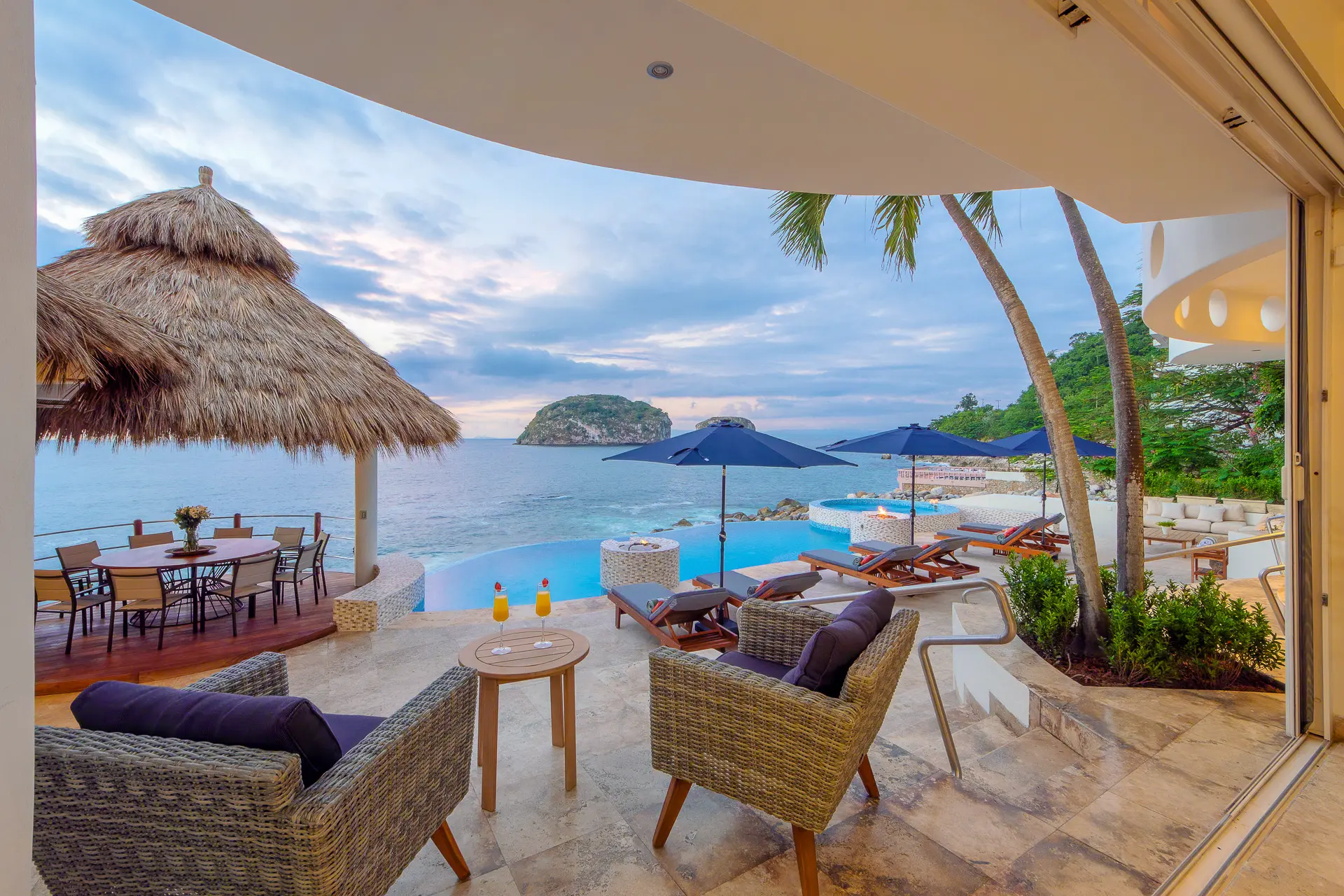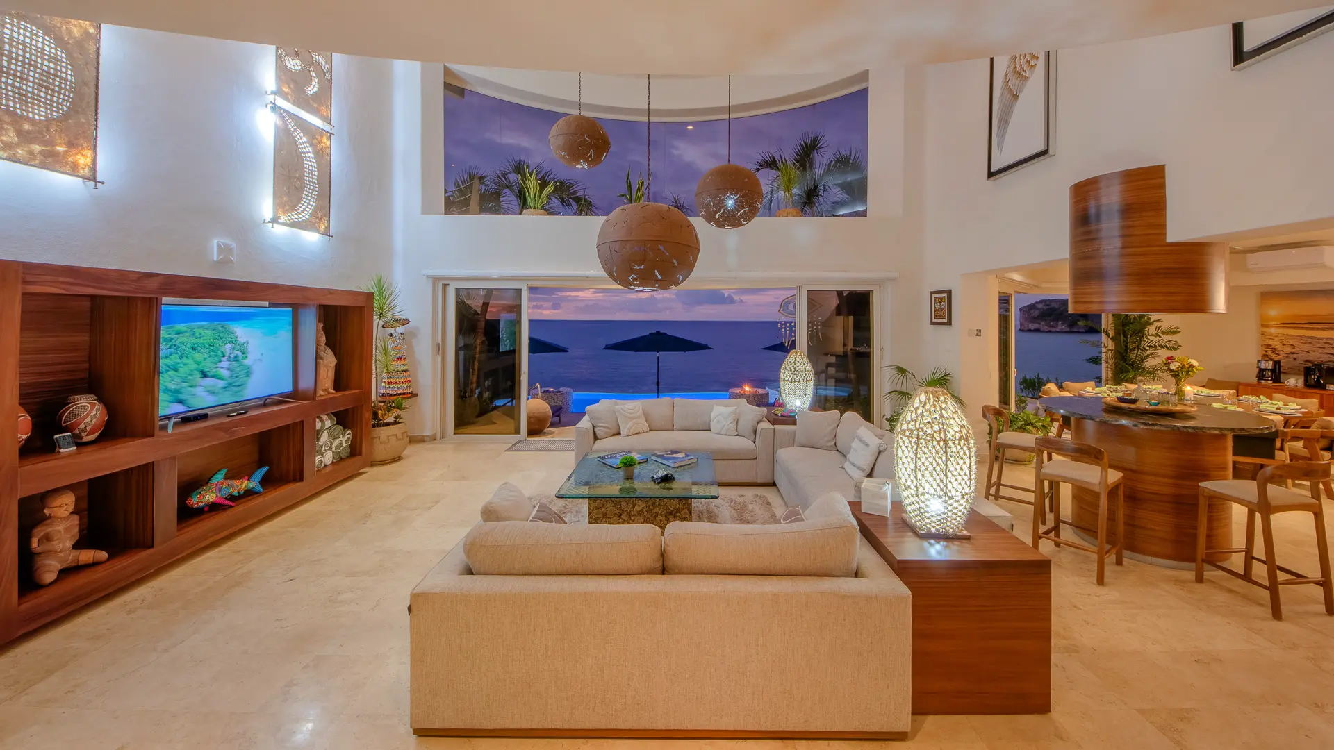 Daily life here naturally flows between indoor comfort and the open terrace, where an infinity pool extends the living space toward the bay. Guests might begin the day with a swim under the Mexican sun, transition to leisurely hours in the shaded outdoor lounge, and gather for alfresco meals as the light softens. The blend of modern amenities with traditional Mexican touches creates an inviting, lived-in elegance that suits both informal relaxation and more polished entertaining.