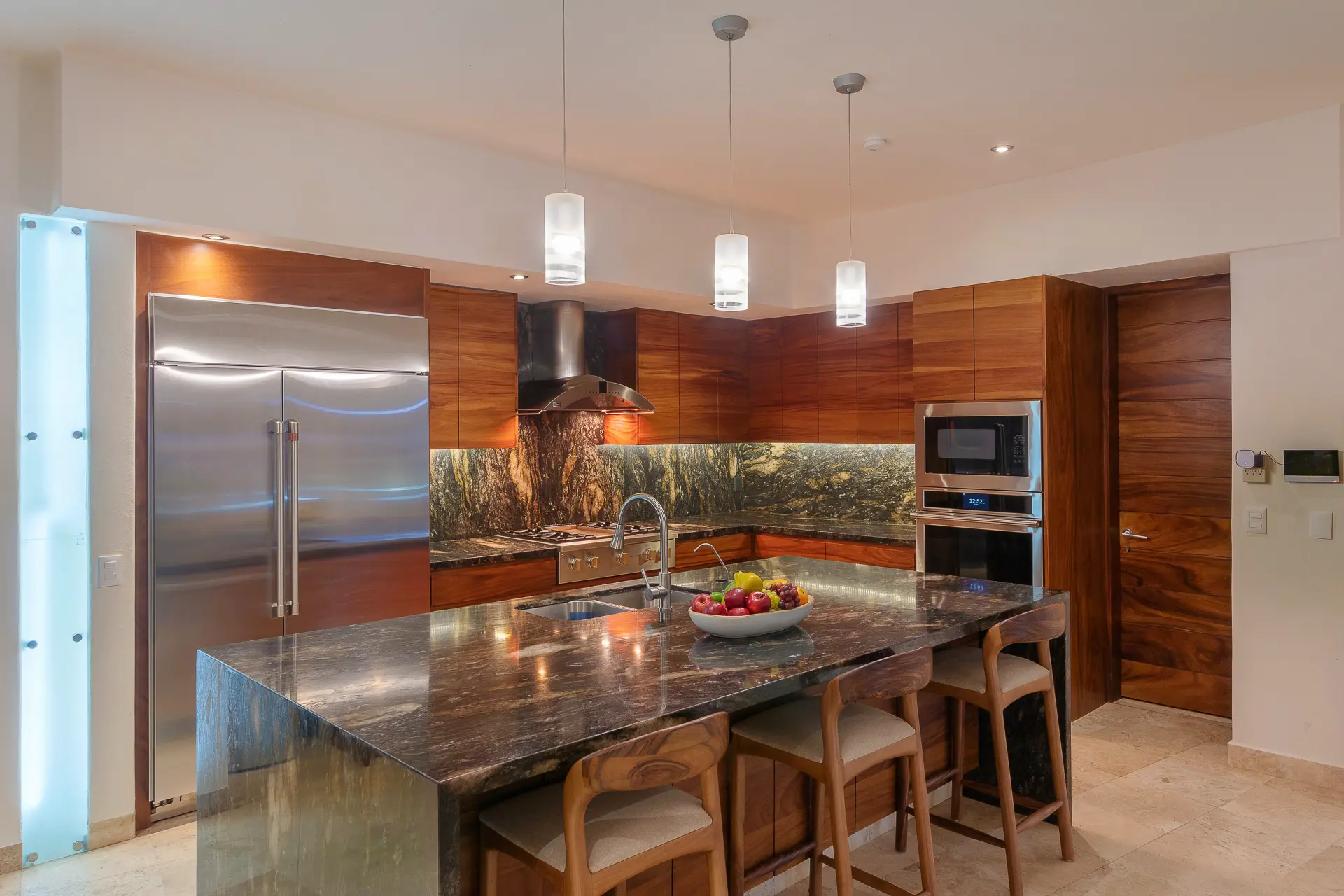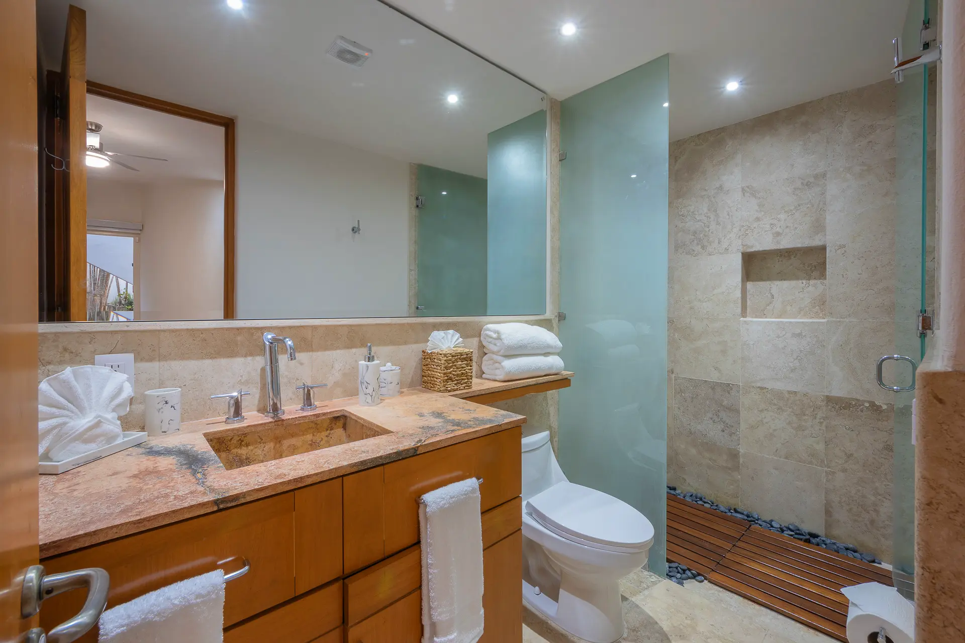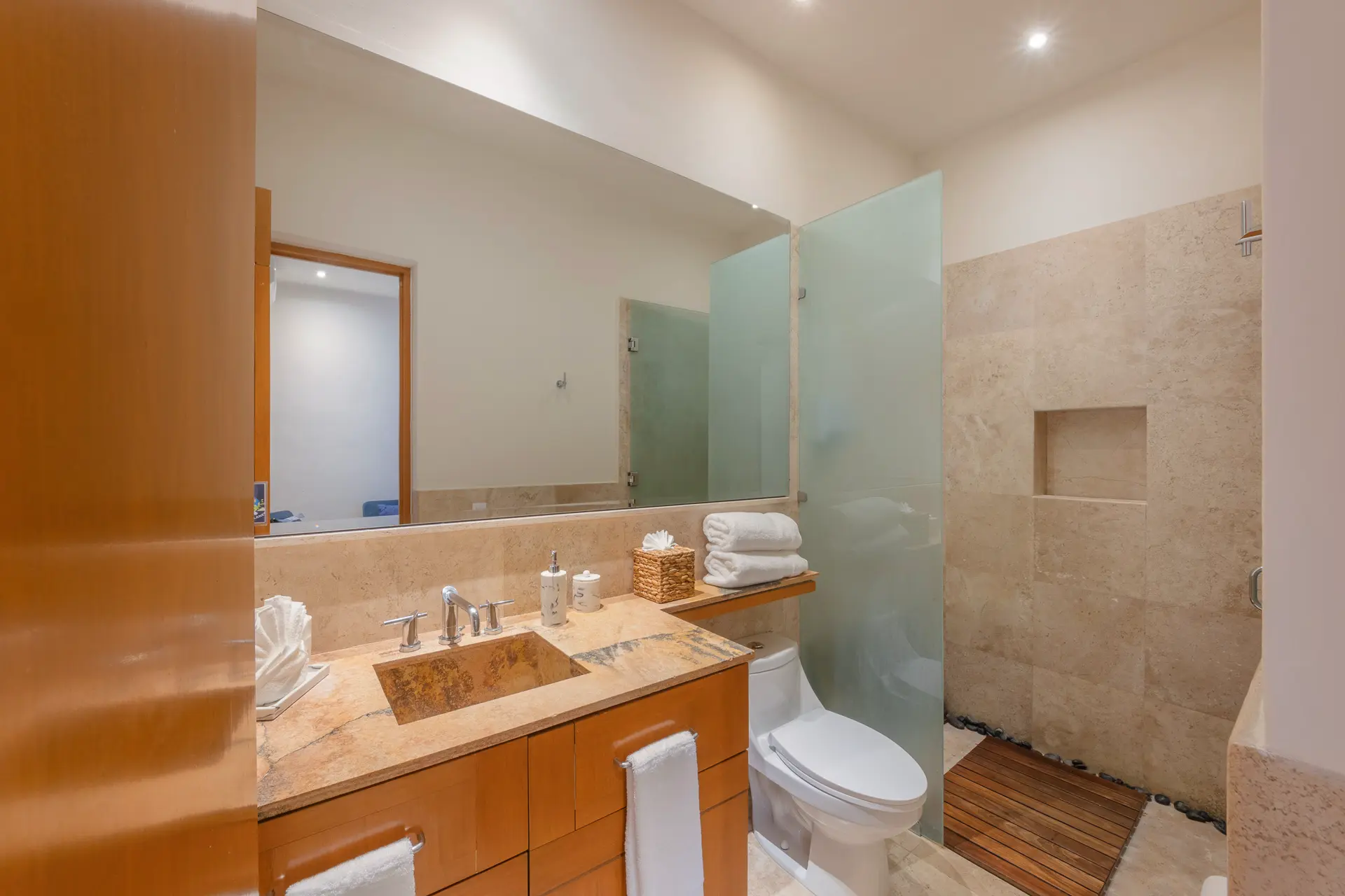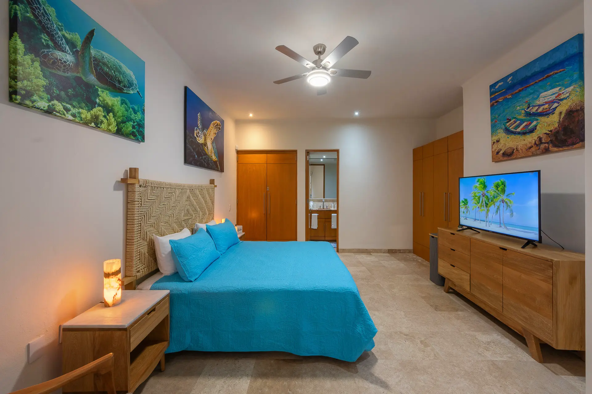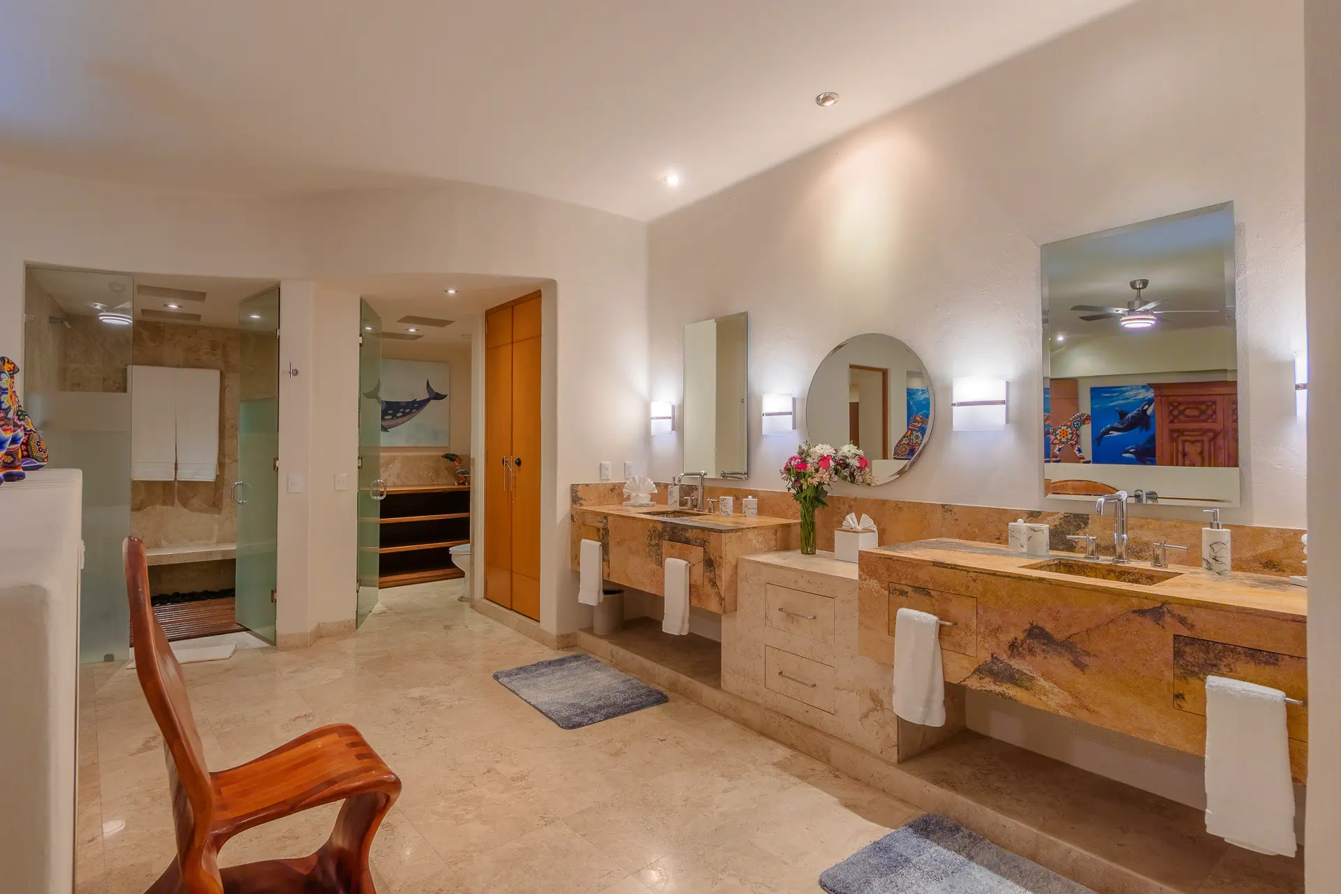 Daily life here naturally flows between indoor comfort and the open terrace, where an infinity pool extends the living space toward the bay. Guests might begin the day with a swim under the Mexican sun, transition to leisurely hours in the shaded outdoor lounge, and gather for alfresco meals as the light softens. The blend of modern amenities with traditional Mexican touches creates an inviting, lived-in elegance that suits both informal relaxation and more polished entertaining.