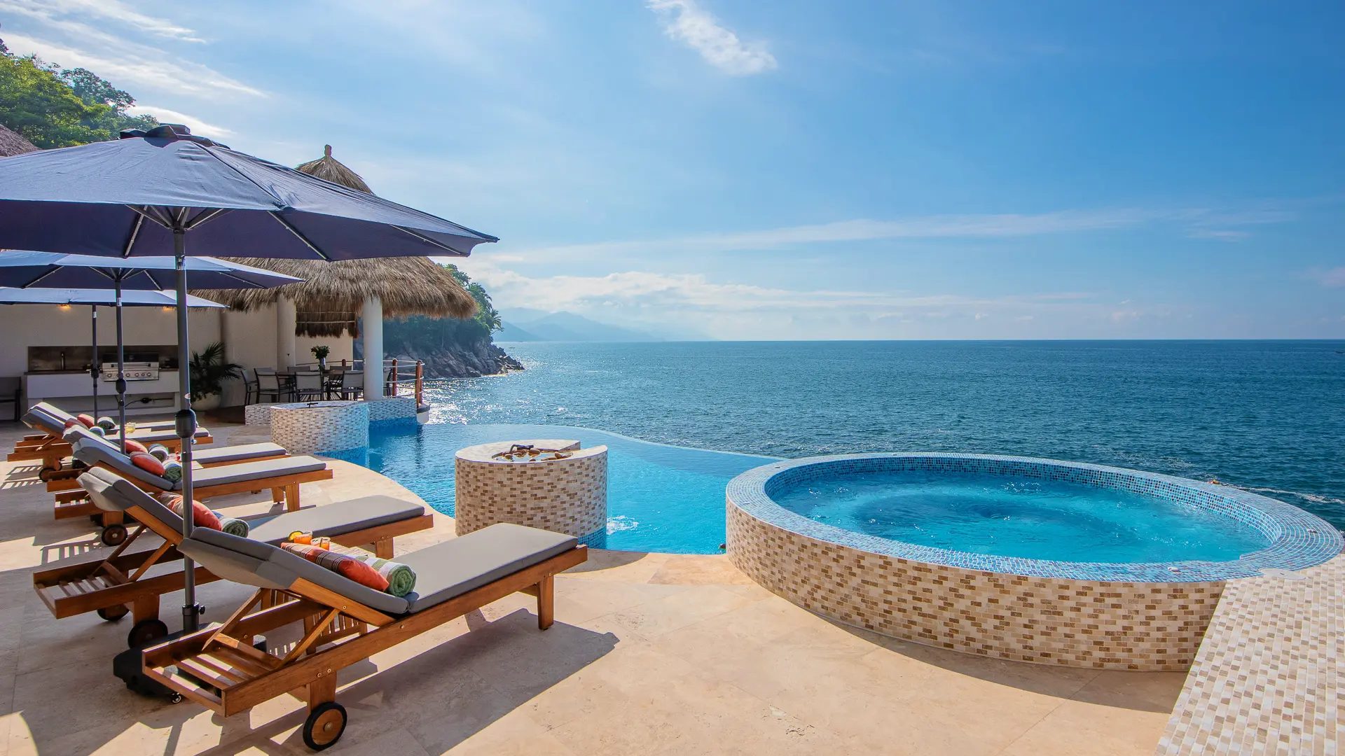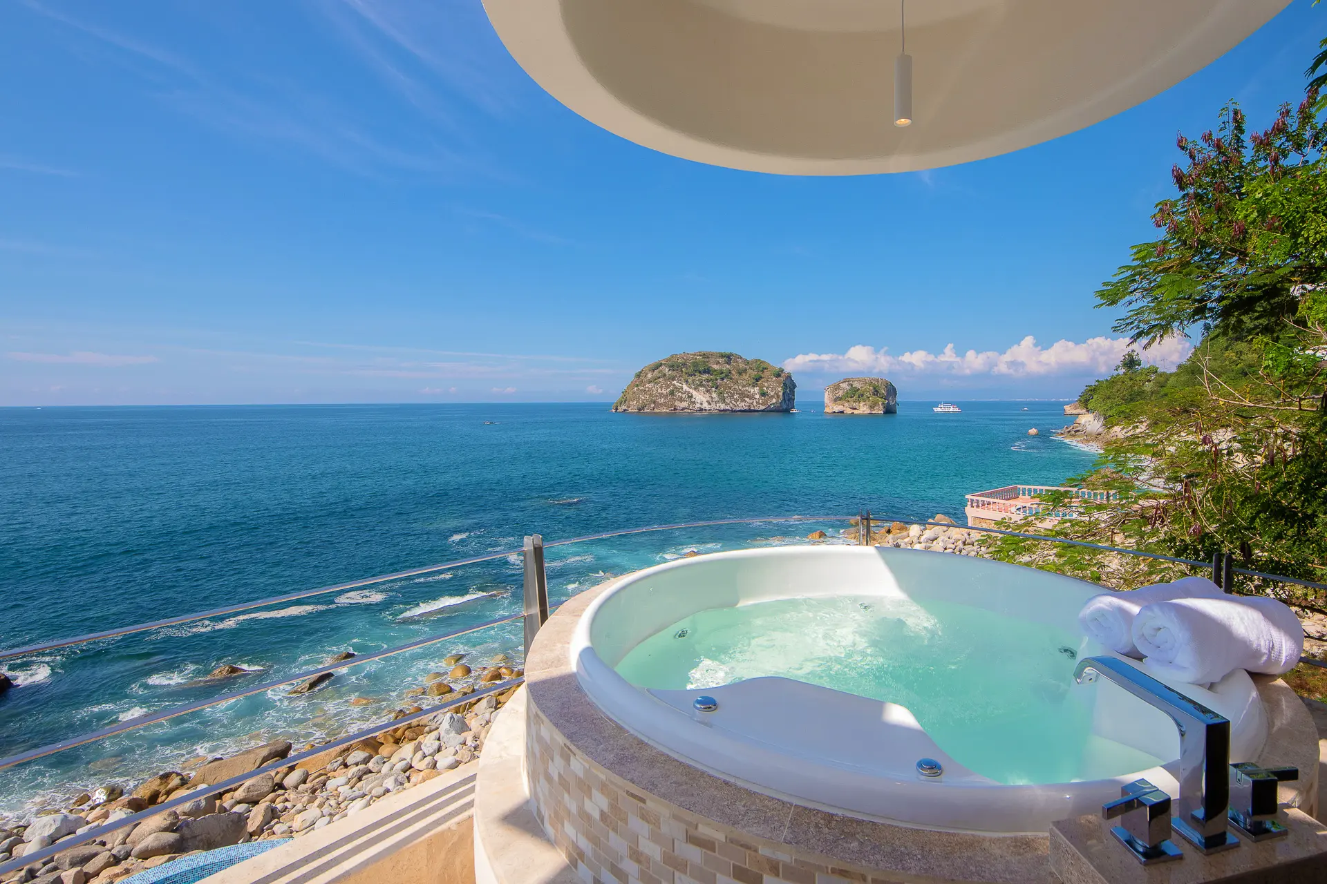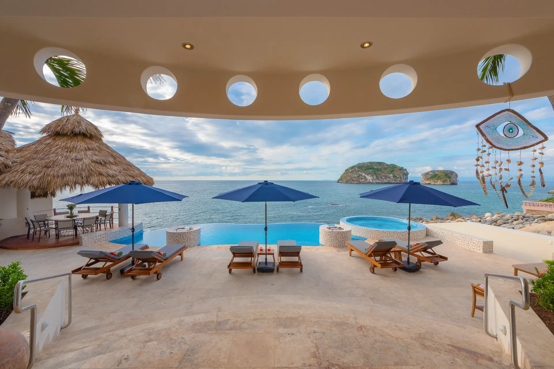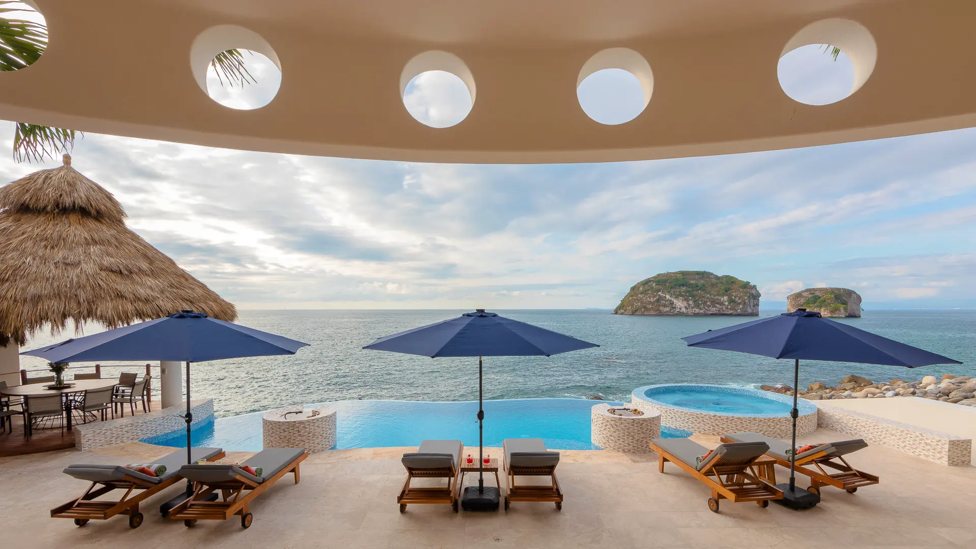 Set just a short distance from downtown, the villa sits above the waters of Banderas Bay, creating a discreet sanctuary close to the energy of the city yet distinctly apart from it. The surroundings emphasize a sense of seclusion, with the ocean as a constant backdrop and an atmosphere that invites unhurried days and tranquil evenings. Shaded outdoor areas and open-air living spaces connect guests to the coastal environment in a measured, unpretentious way.