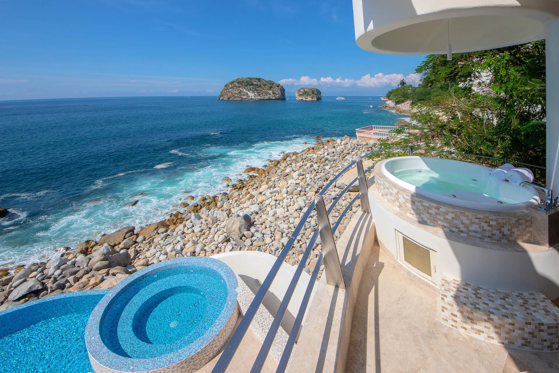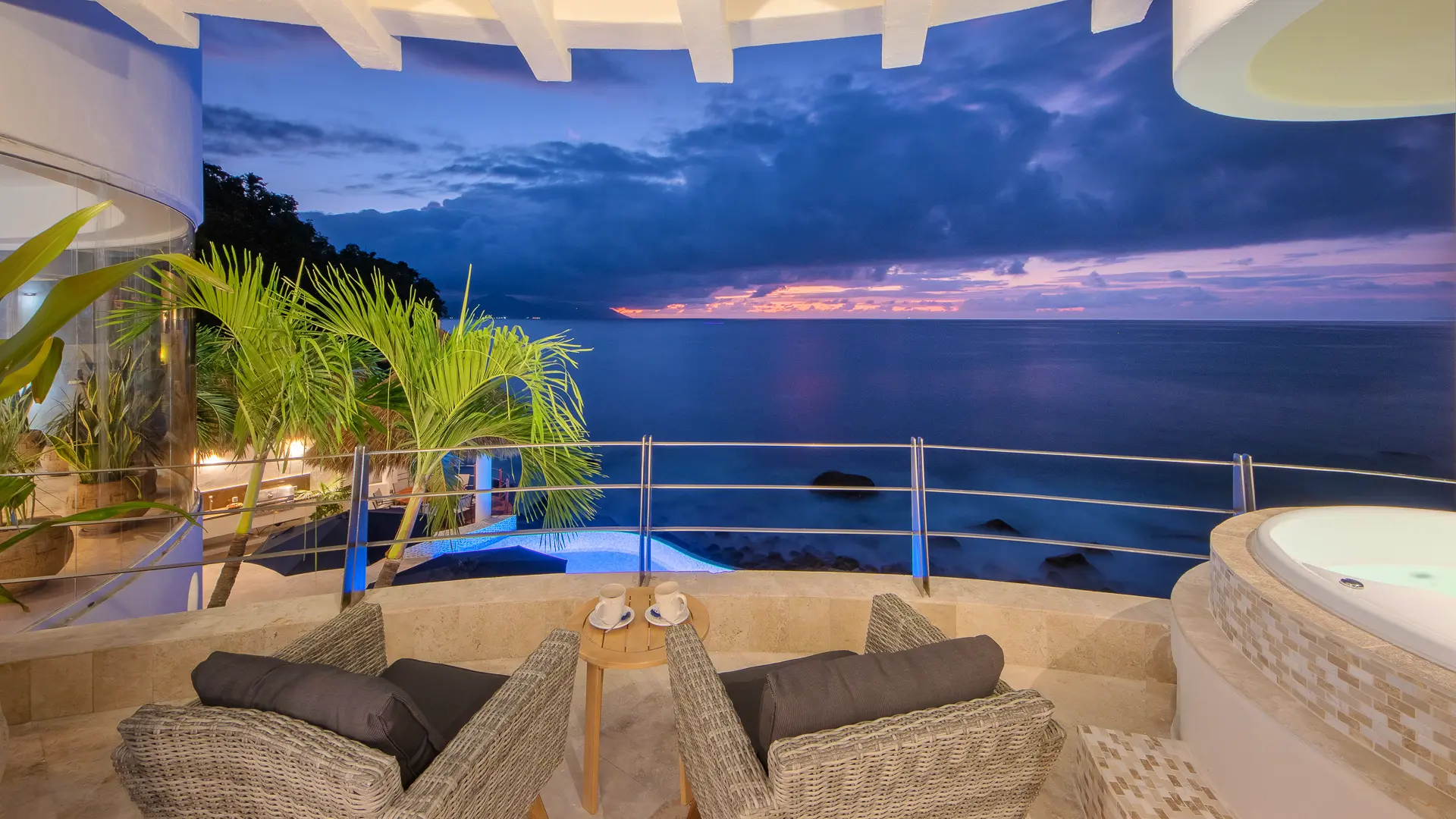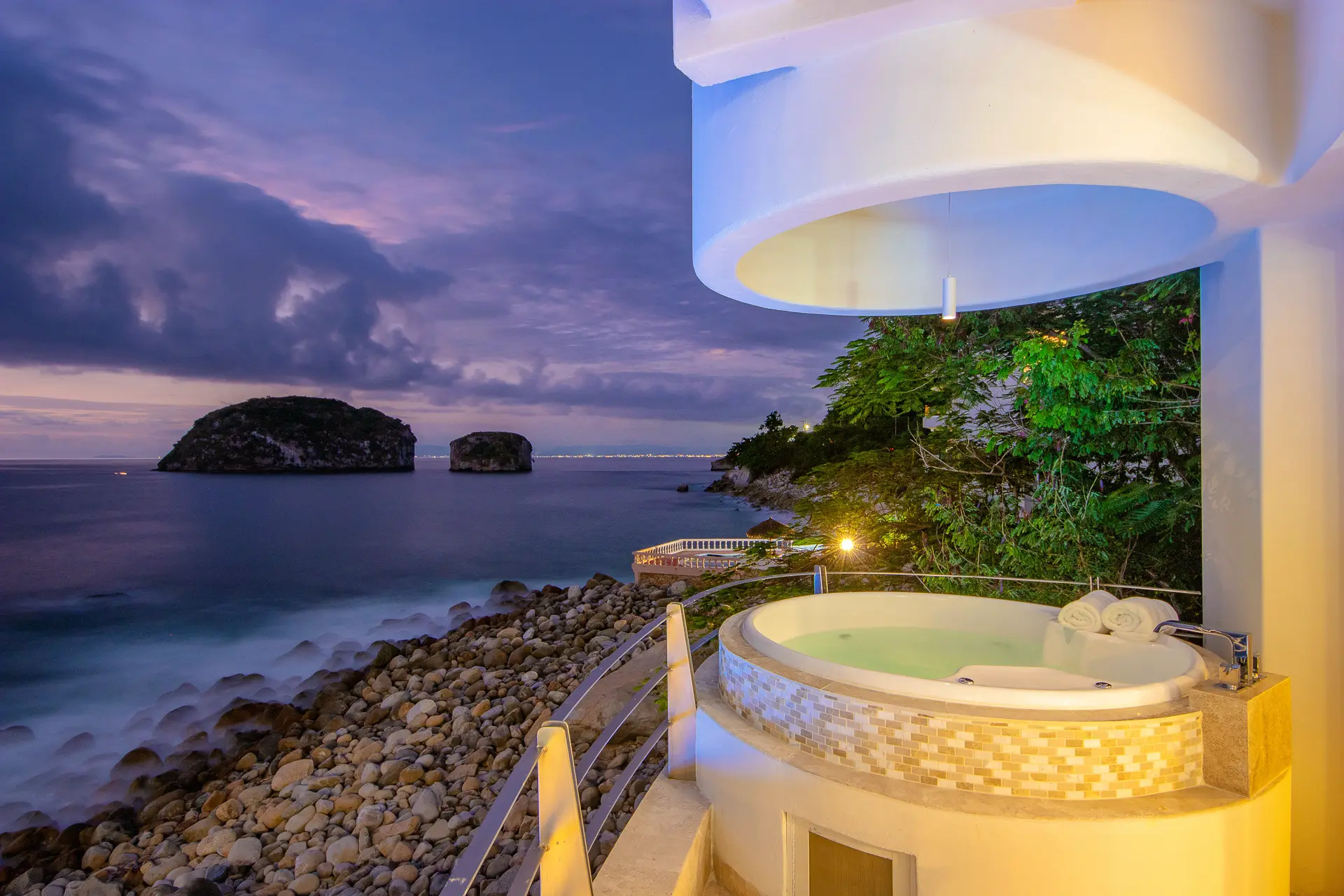 Set just a short distance from downtown, the villa sits above the waters of Banderas Bay, creating a discreet sanctuary close to the energy of the city yet distinctly apart from it. The surroundings emphasize a sense of seclusion, with the ocean as a constant backdrop and an atmosphere that invites unhurried days and tranquil evenings. Shaded outdoor areas and open-air living spaces connect guests to the coastal environment in a measured, unpretentious way.