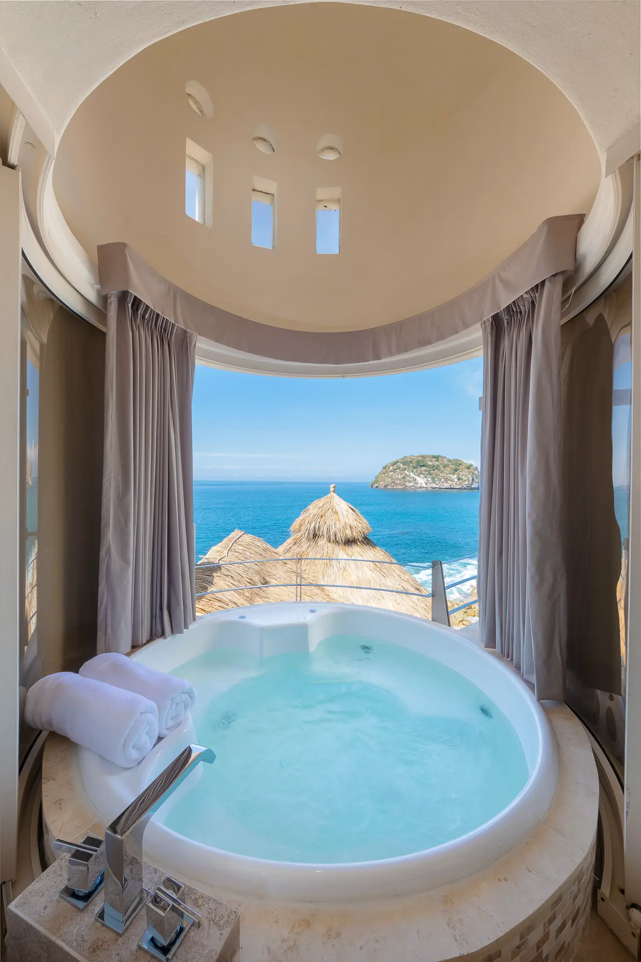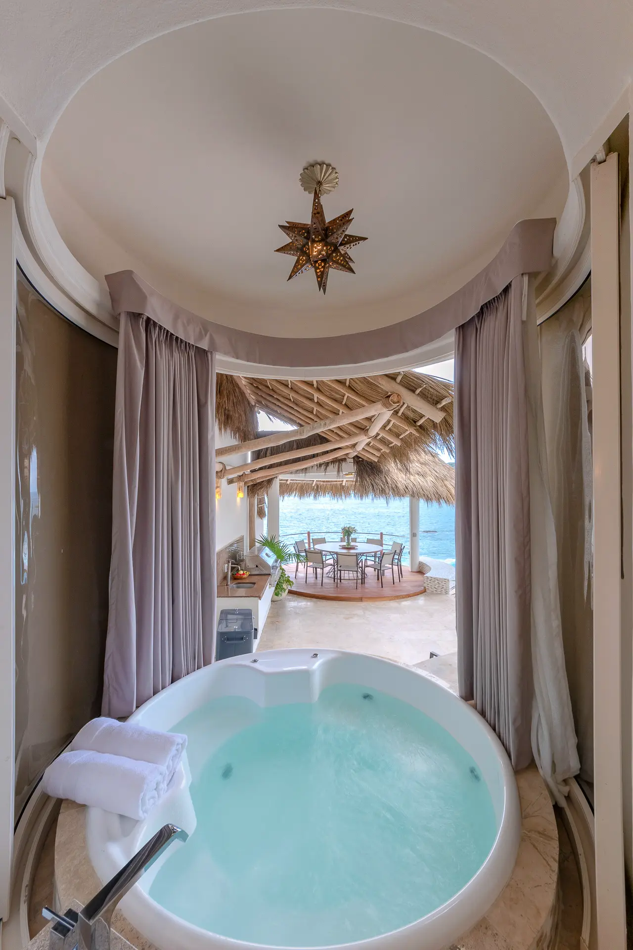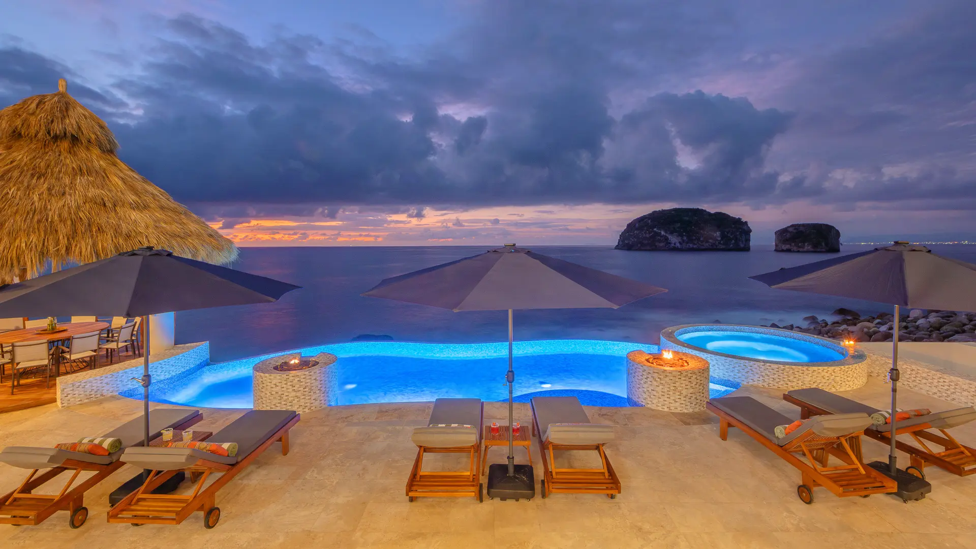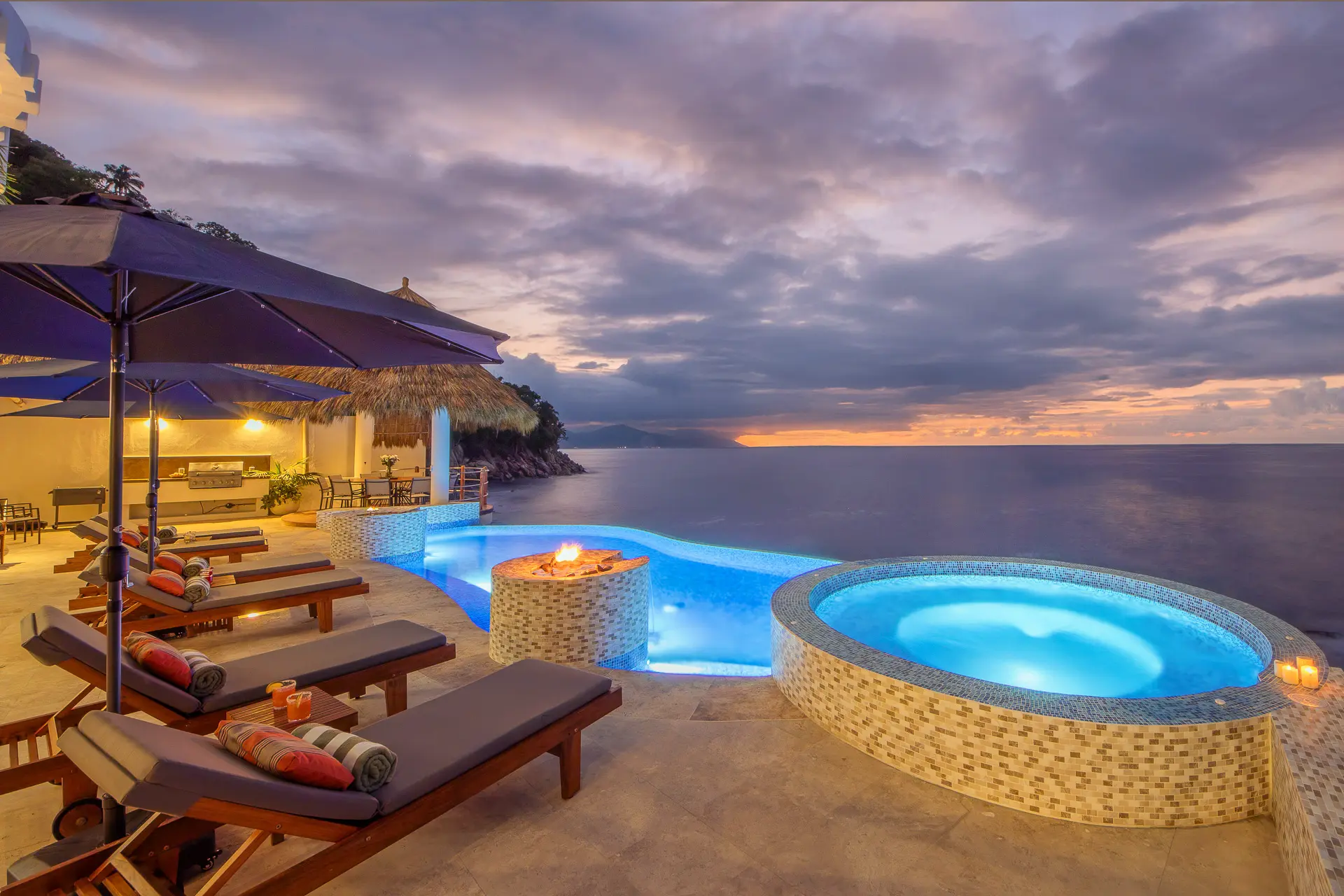 Set just a short distance from downtown, the villa sits above the waters of Banderas Bay, creating a discreet sanctuary close to the energy of the city yet distinctly apart from it. The surroundings emphasize a sense of seclusion, with the ocean as a constant backdrop and an atmosphere that invites unhurried days and tranquil evenings. Shaded outdoor areas and open-air living spaces connect guests to the coastal environment in a measured, unpretentious way.