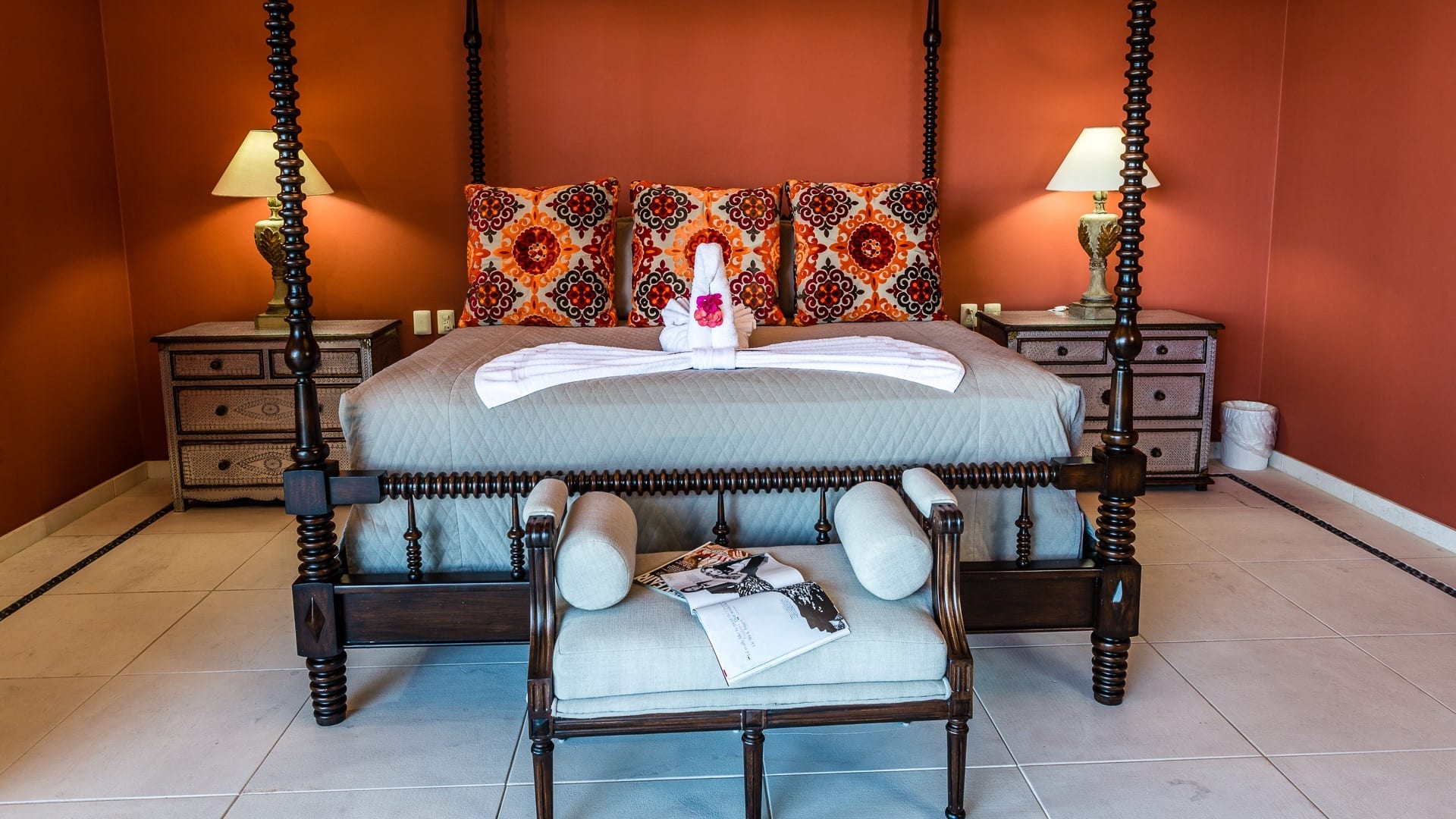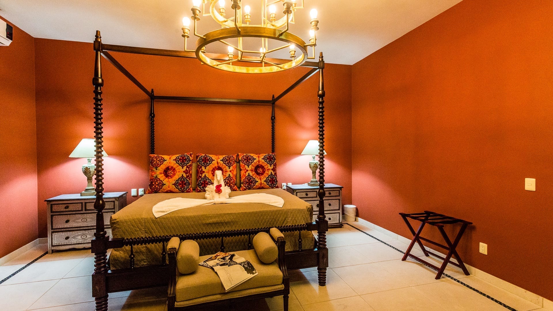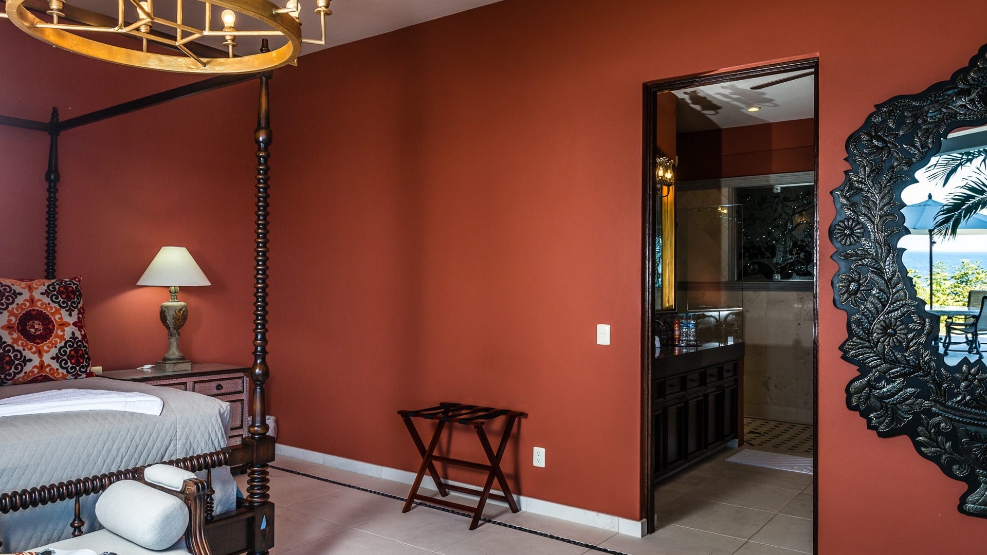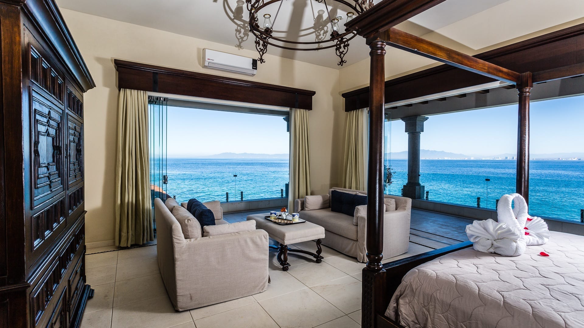 King-sized bed with an Ensuite that offers a bathtub and rain shower. Additionally, it boasts Dual Vanity, TV, AC, Terrace, and Ocean view.