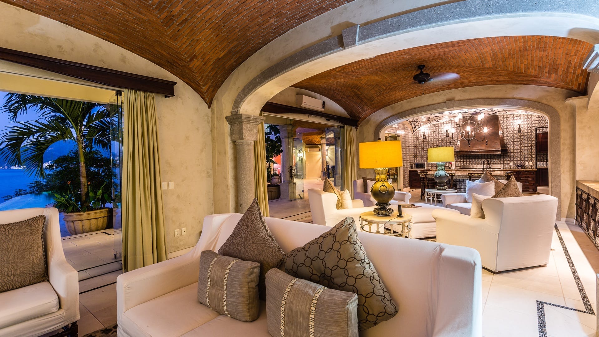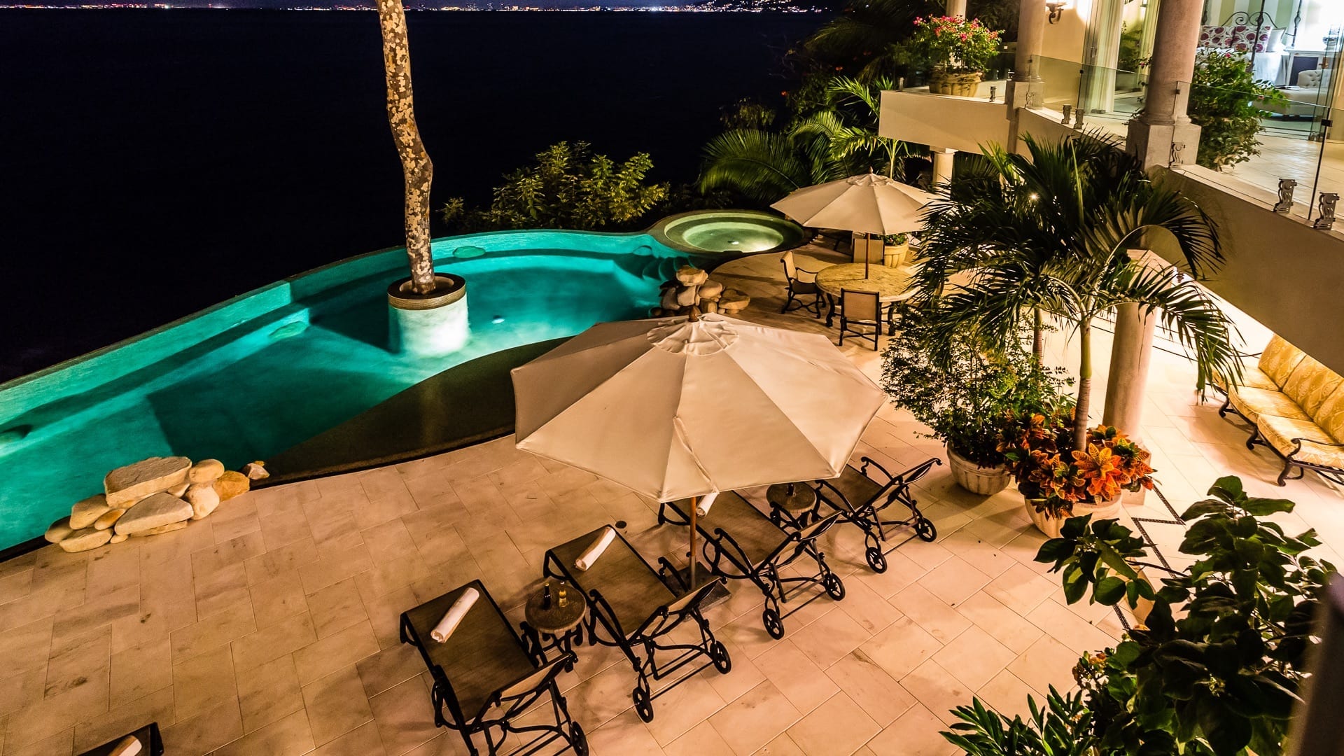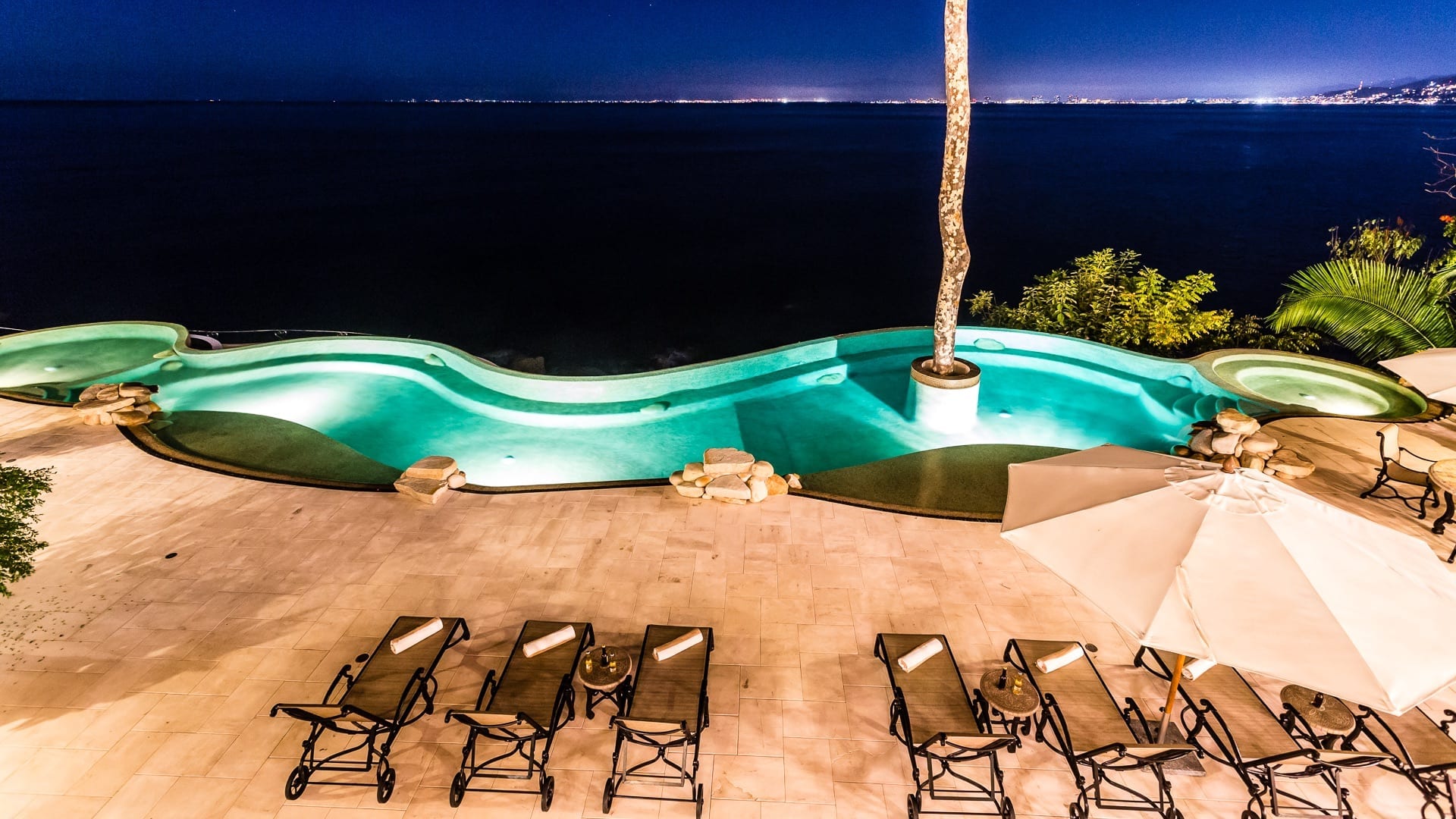 The formal dining can graciously host twelve. Furthermore, there’s alfresco dining and a kitchen breakfast bar, accommodating over 24 guests. Start your day on the main terrace, embracing the vast expanses of Puerto Vallarta. Later, the infinity pool, poised over the ocean, invites relaxation, especially with its adjoining bar and lounge chairs.