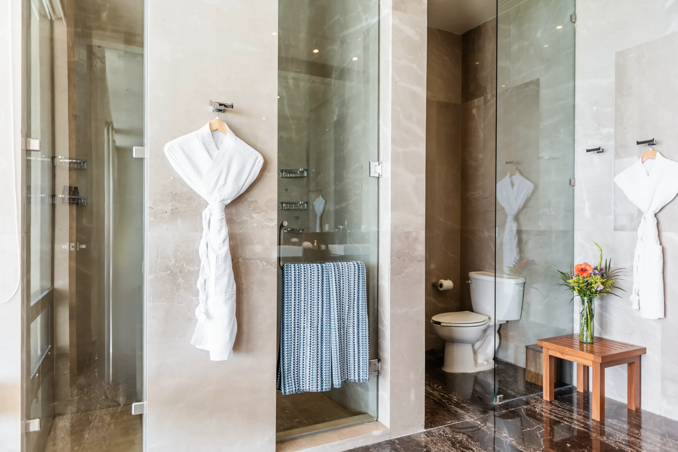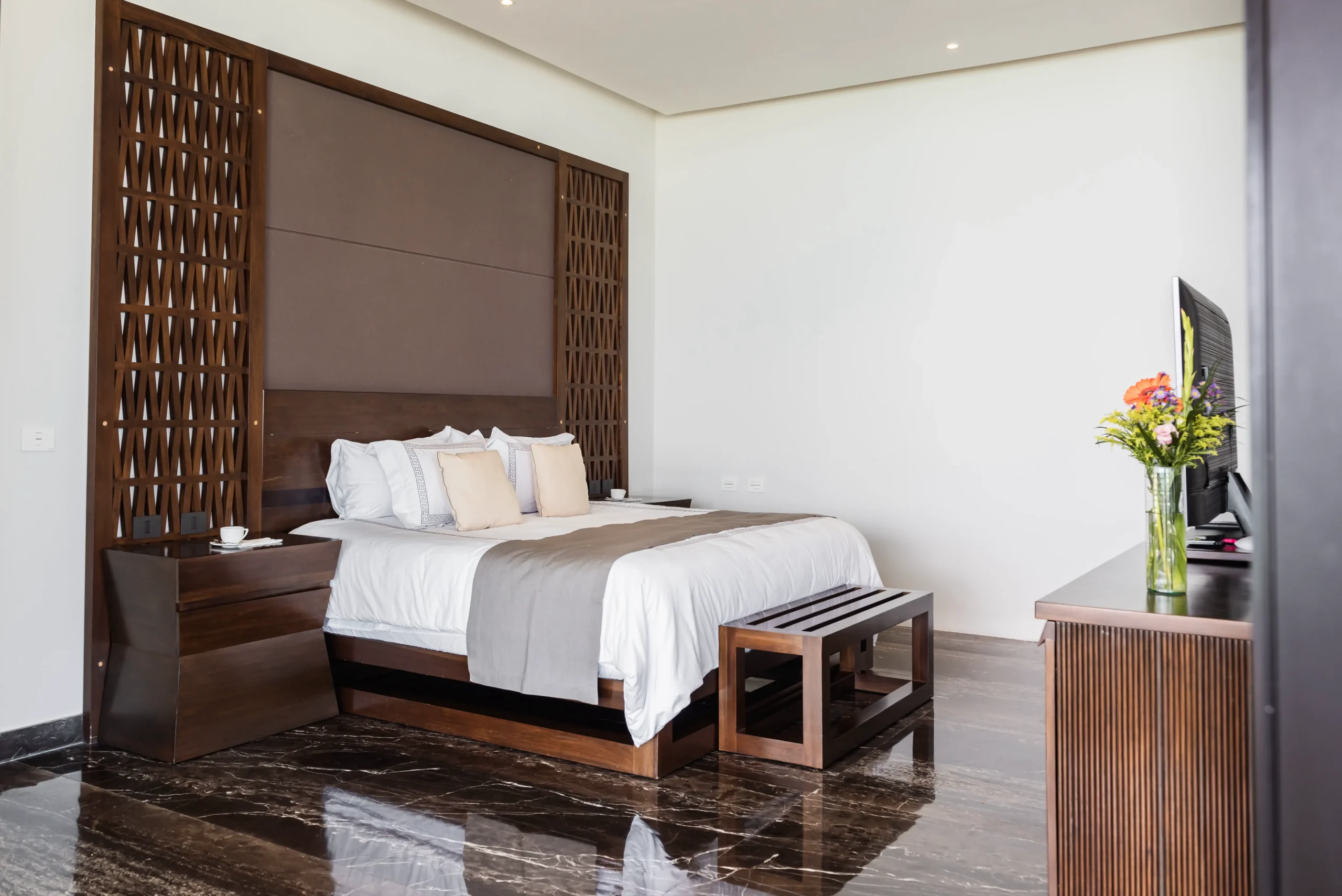 Indulge in a king-size bed with panoramic ocean views from your private terrace. This suite features a spa-like en-suite bathroom and a connecting studio/office that can be converted into an additional bedroom, ensuring both privacy and flexibility for your group.