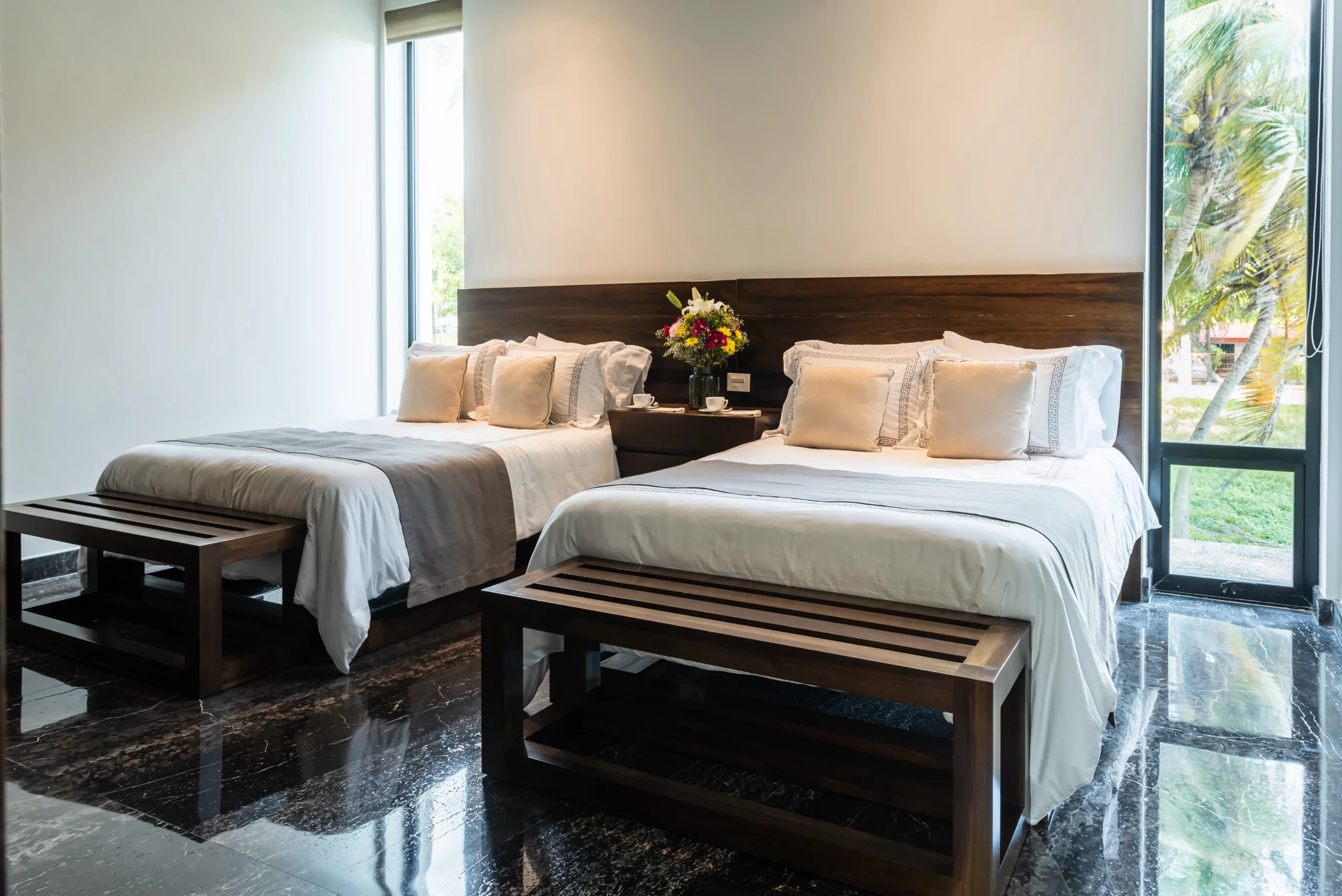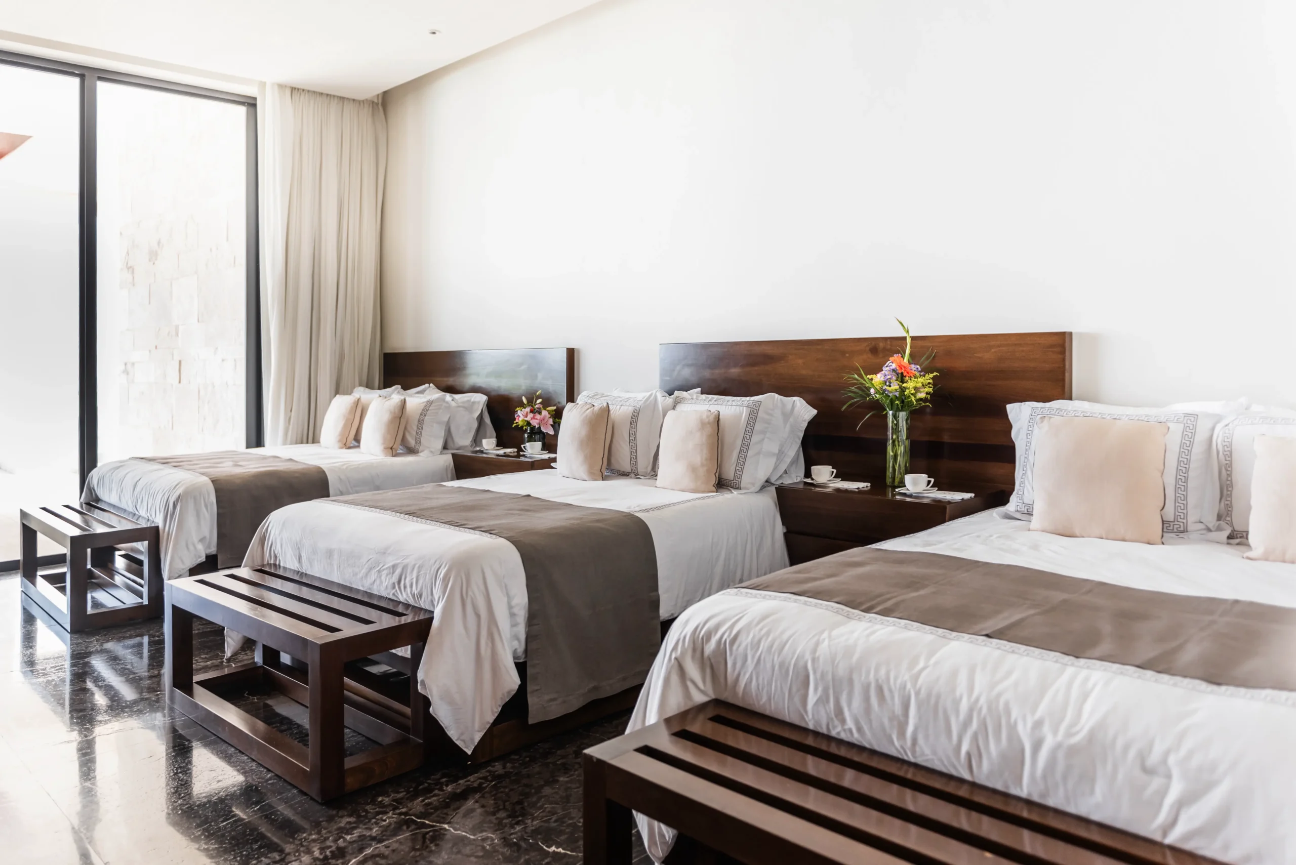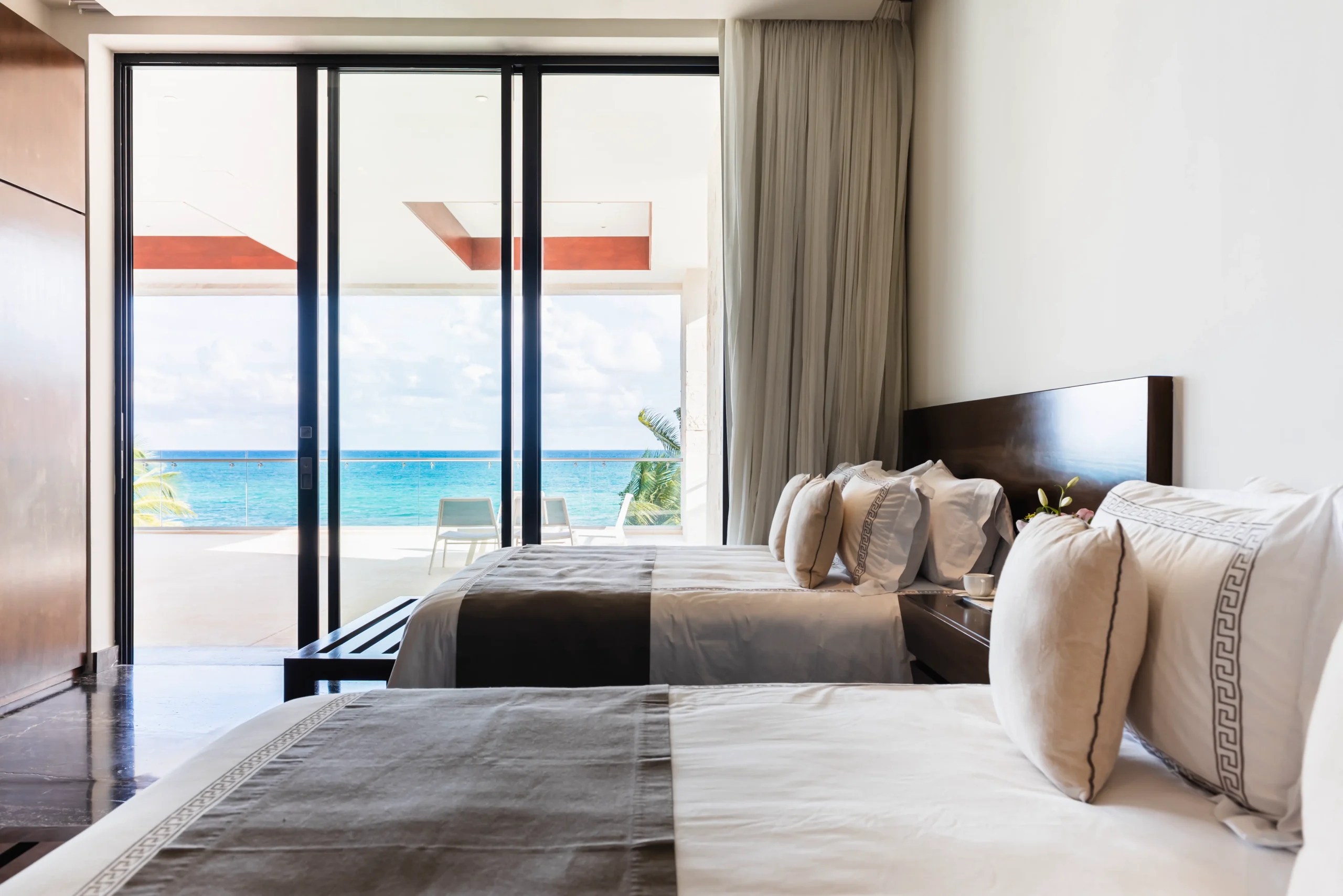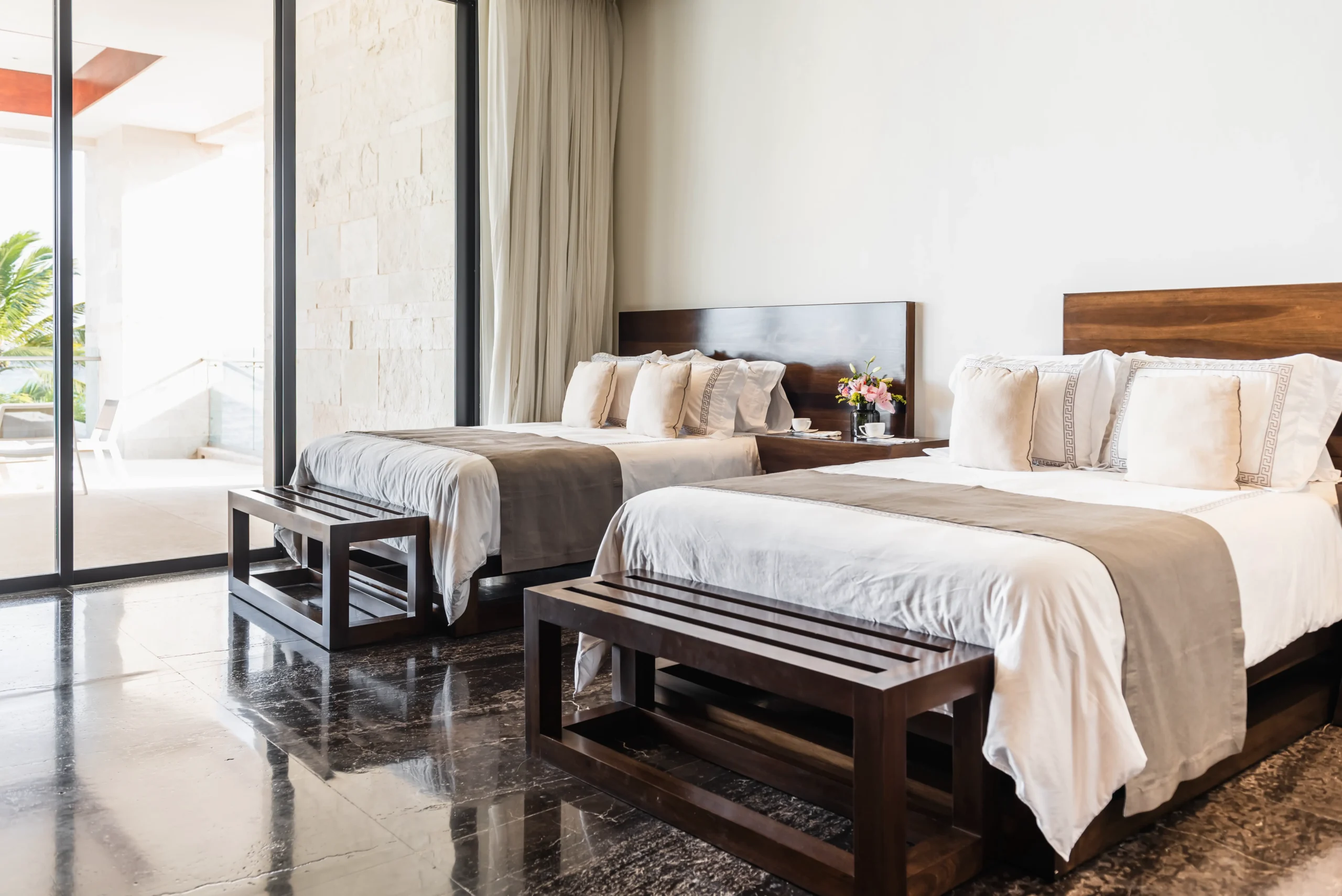 Featuring two full beds, this suite opens directly to the beach and poolside, offering a serene connection to the outdoors and easy access for a dip in the ocean.