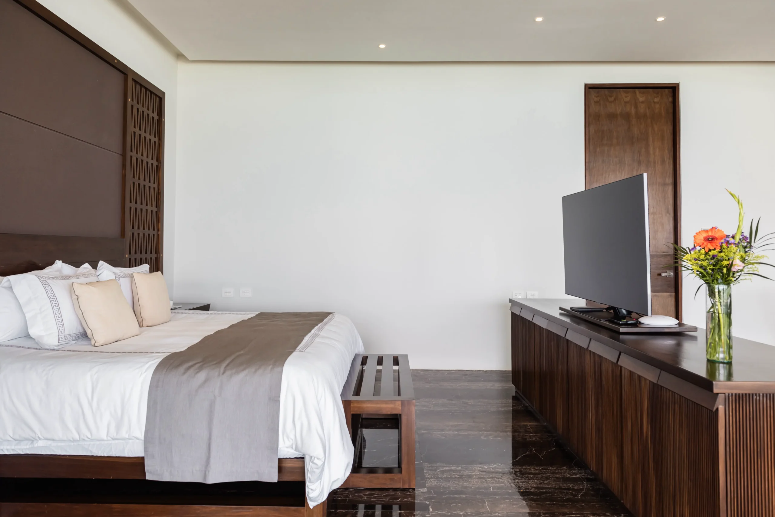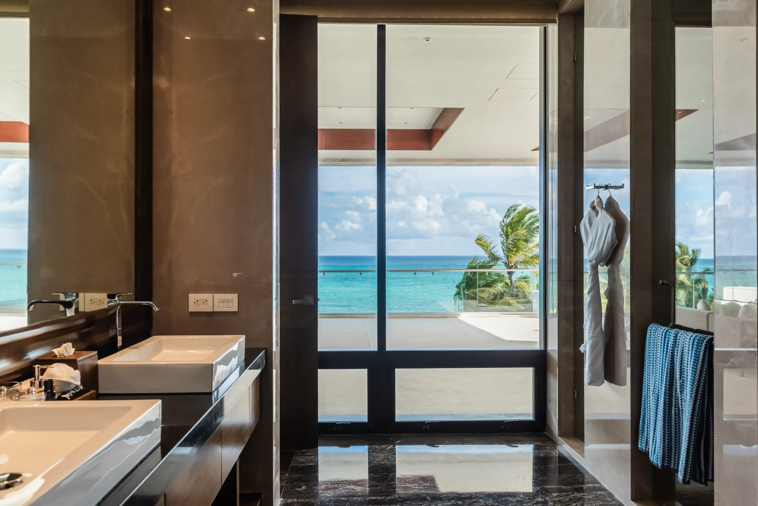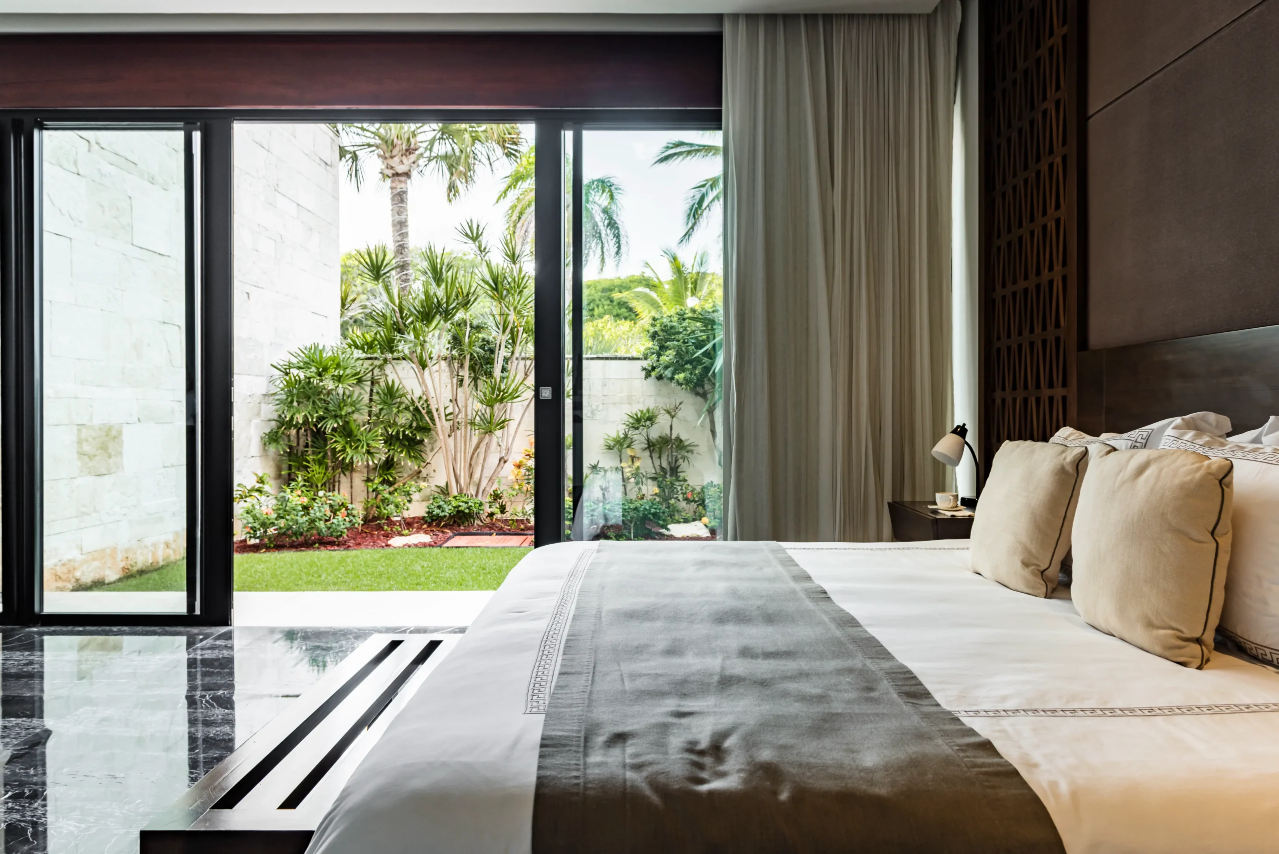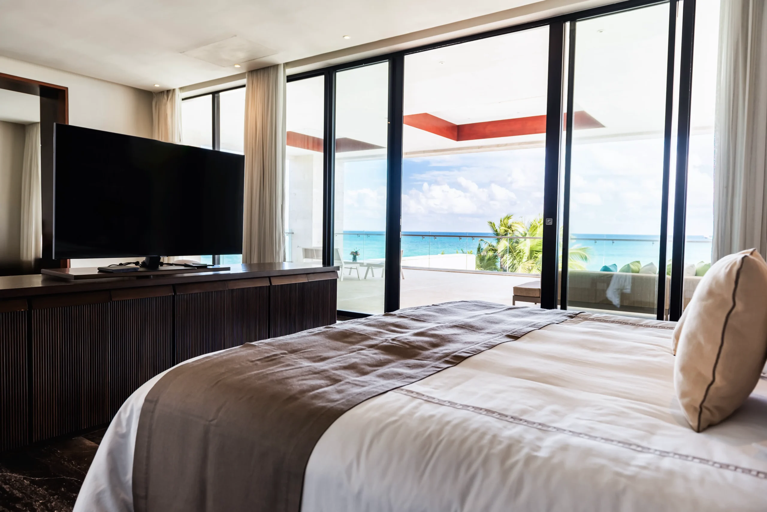 Featuring two full beds, this suite opens directly to the beach and poolside, offering a serene connection to the outdoors and easy access for a dip in the ocean.