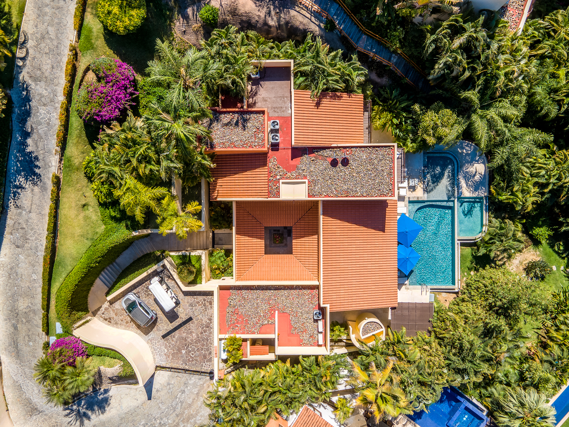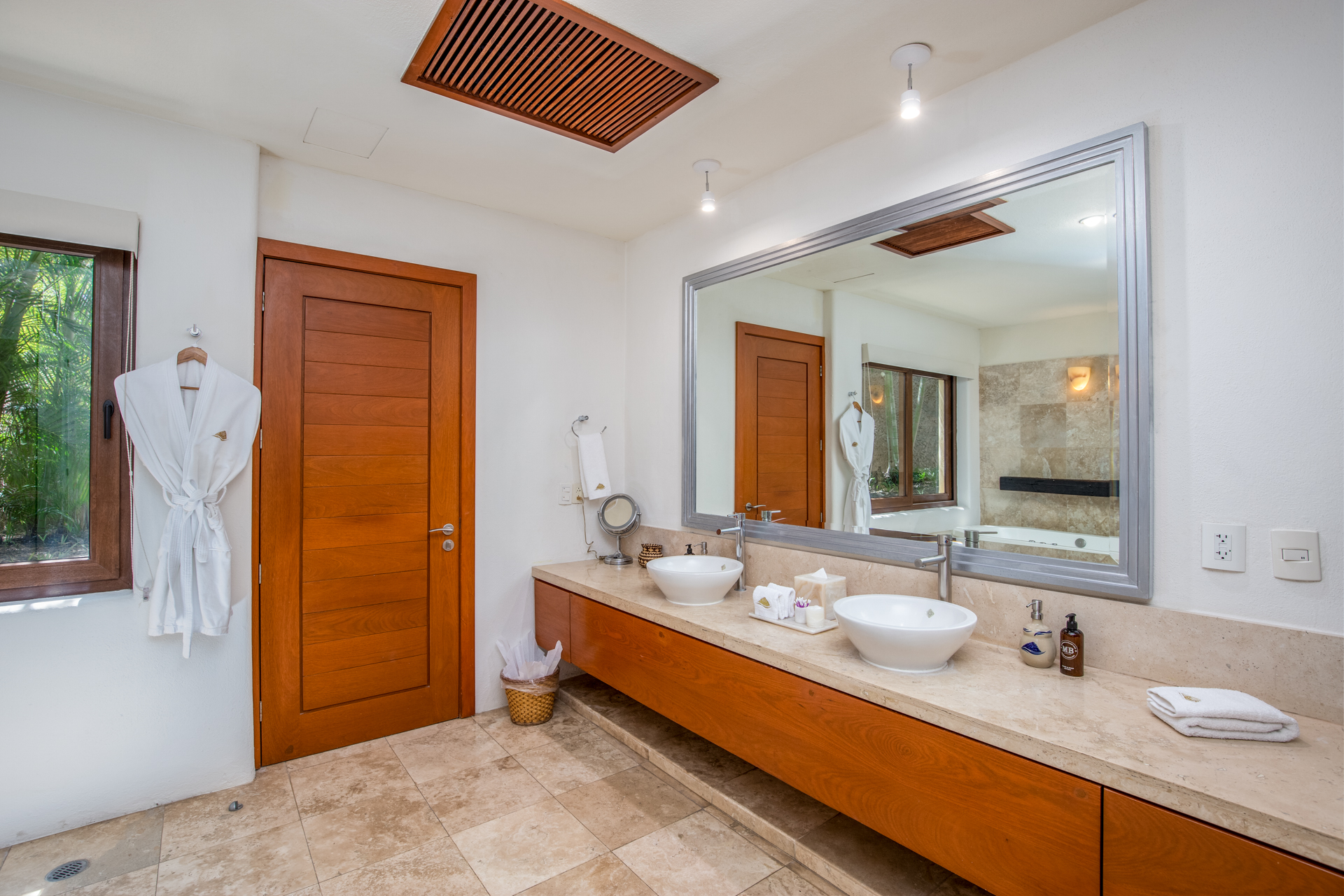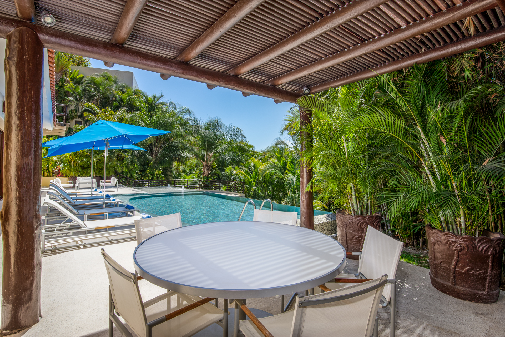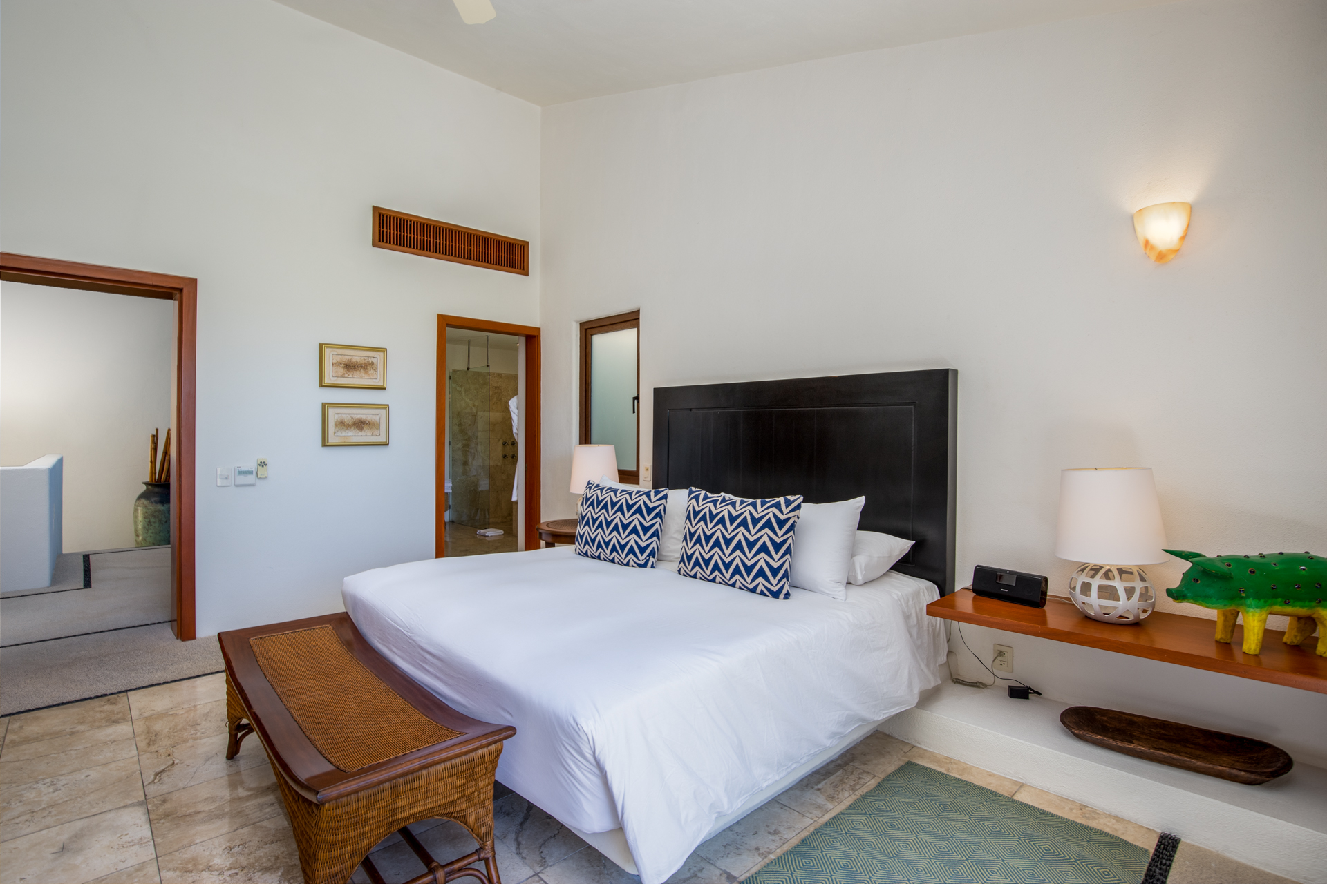 Step into the luxurious Casa Patio, nestled in the heart of the gated Real Del Mar resort. Designed for families, this villa becomes a paradise away from home. Upon entering, you’ll instantly notice the high ceilings, which, coupled with vast windows, let sea breezes dance through. A tranquil palette of calm blues mirrors the Riviera Nayarit’s serene ambiance. As you step outside, tropical palms embrace the sprawling infinity pool and jacuzzi, setting a peaceful backdrop.