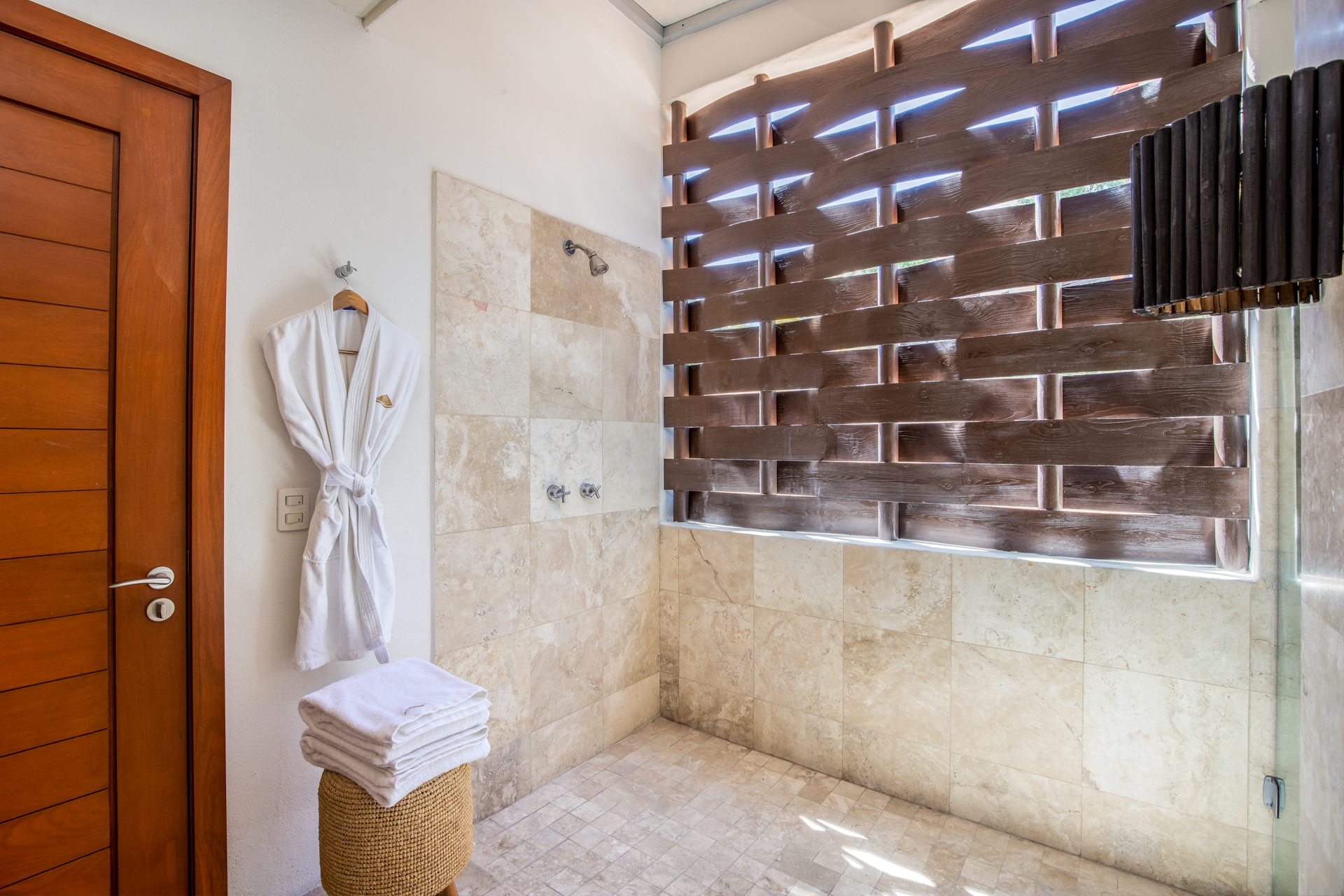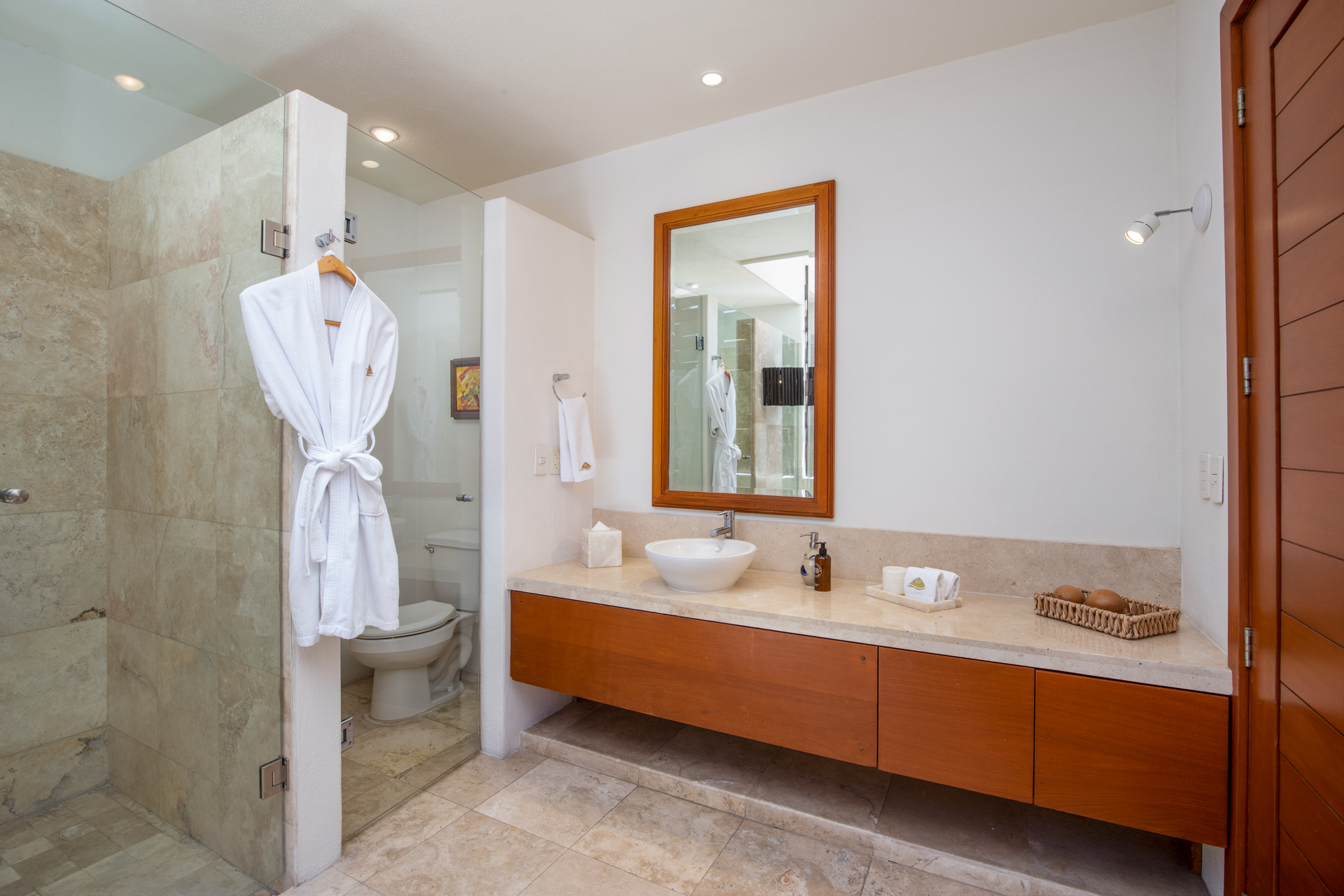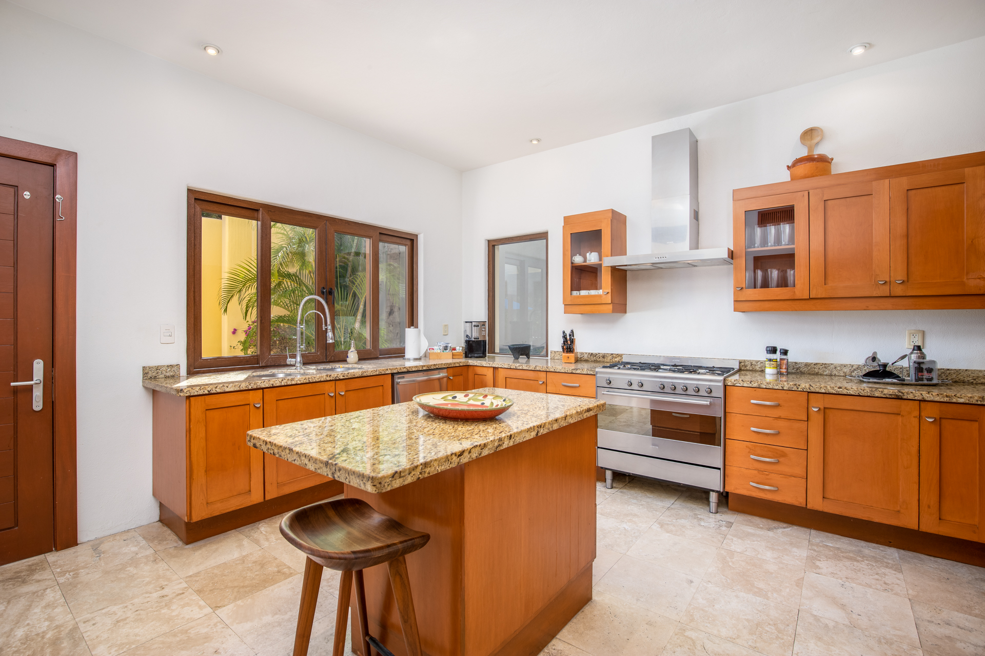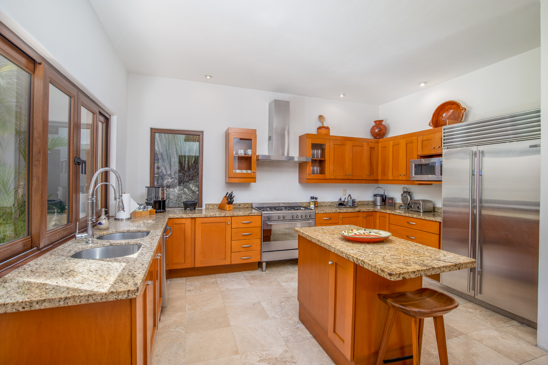 Every corner of Casa Patio exudes comfort: four opulent suites welcome guests, each adorned with essential toiletries and plush bathrobes. Moreover, a well-equipped media room promises hours of entertainment. The modern kitchen, boasting high-end appliances, offers a dining area that comfortably accommodates all guests. But you’ll feel right at home.