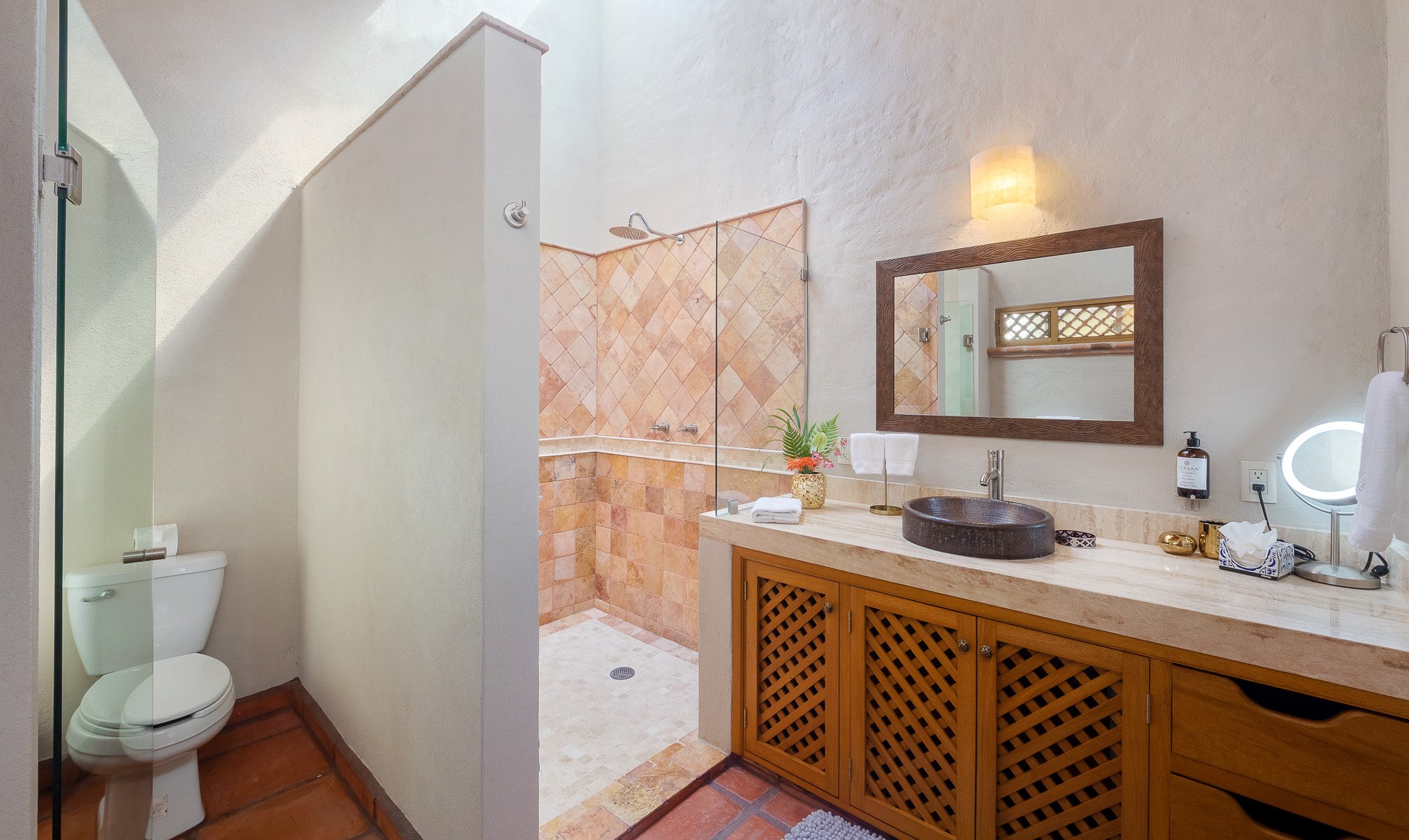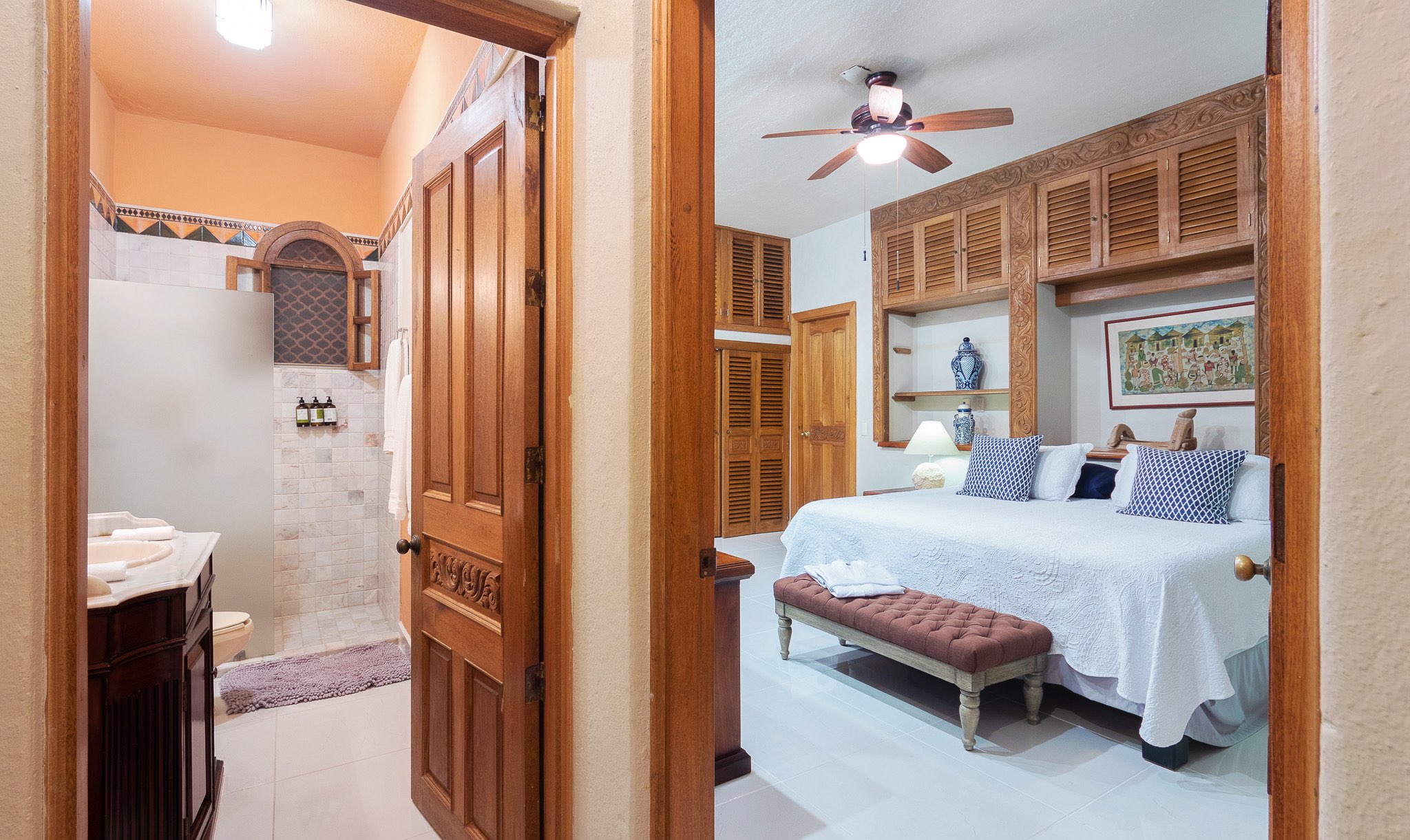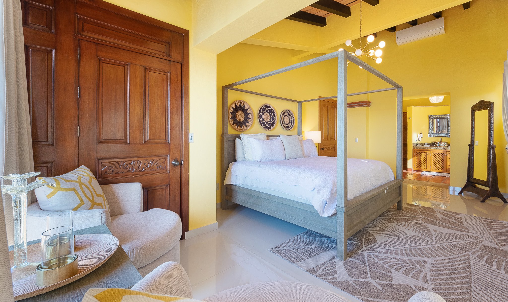 With ten thoughtfully distributed suites, Casa Peregrina accommodates up to 20 guests in comfort and privacy. Each bedroom has its own personality and setting within the estate. On the upper level, Marco’s Master features a king-size bed, ocean view, private terrace, sitting area, TV, and ensuite bathroom, while the Yellow Master offers a king-size bed, ocean view, and ensuite bath. The Canopy Room includes a king-size canopy bed with partial ocean view and ensuite, and the Cupula Room provides two double beds, a peek-a-boo view, TV, and ensuite bathroom.