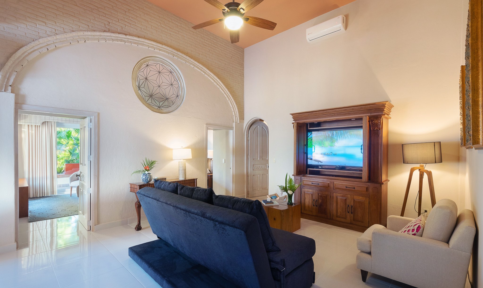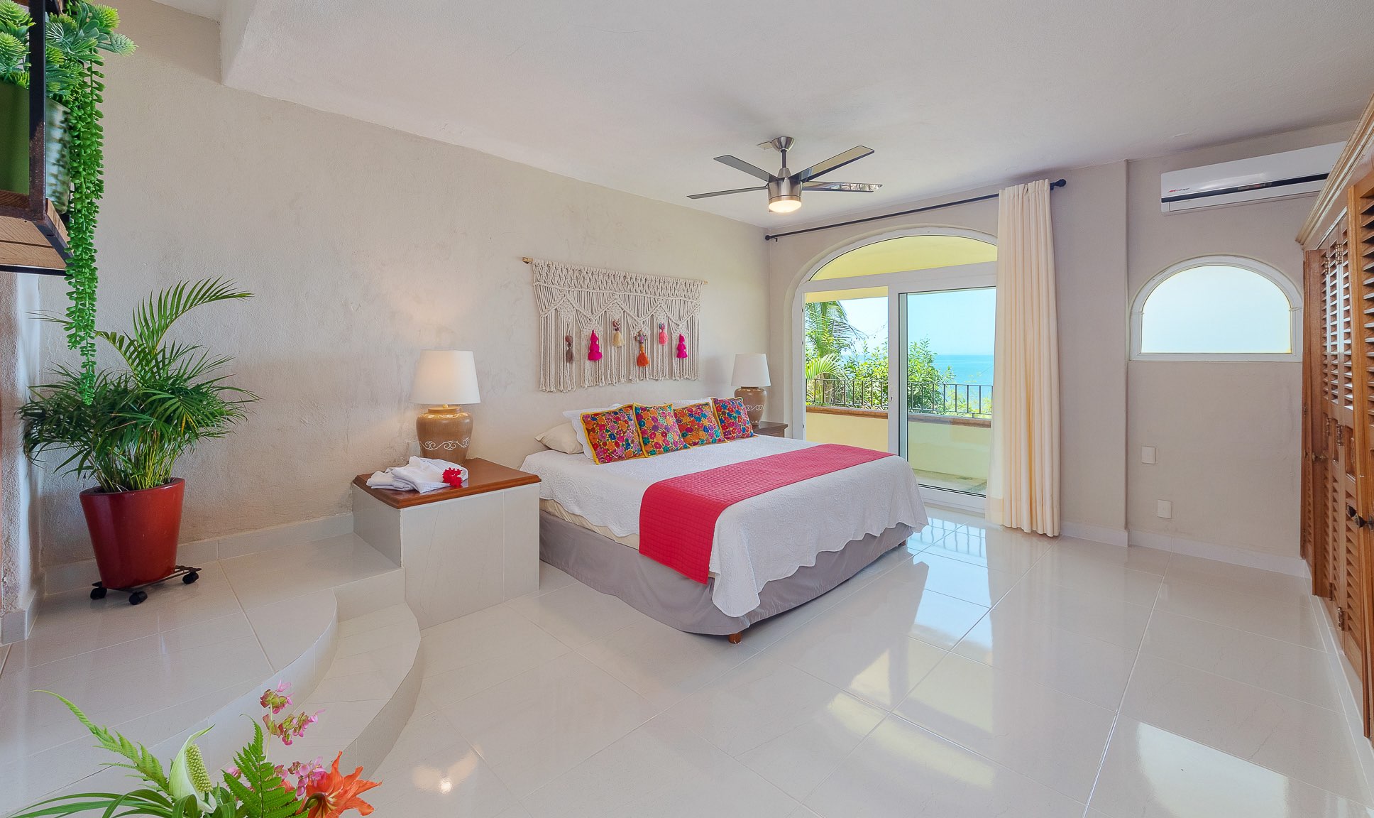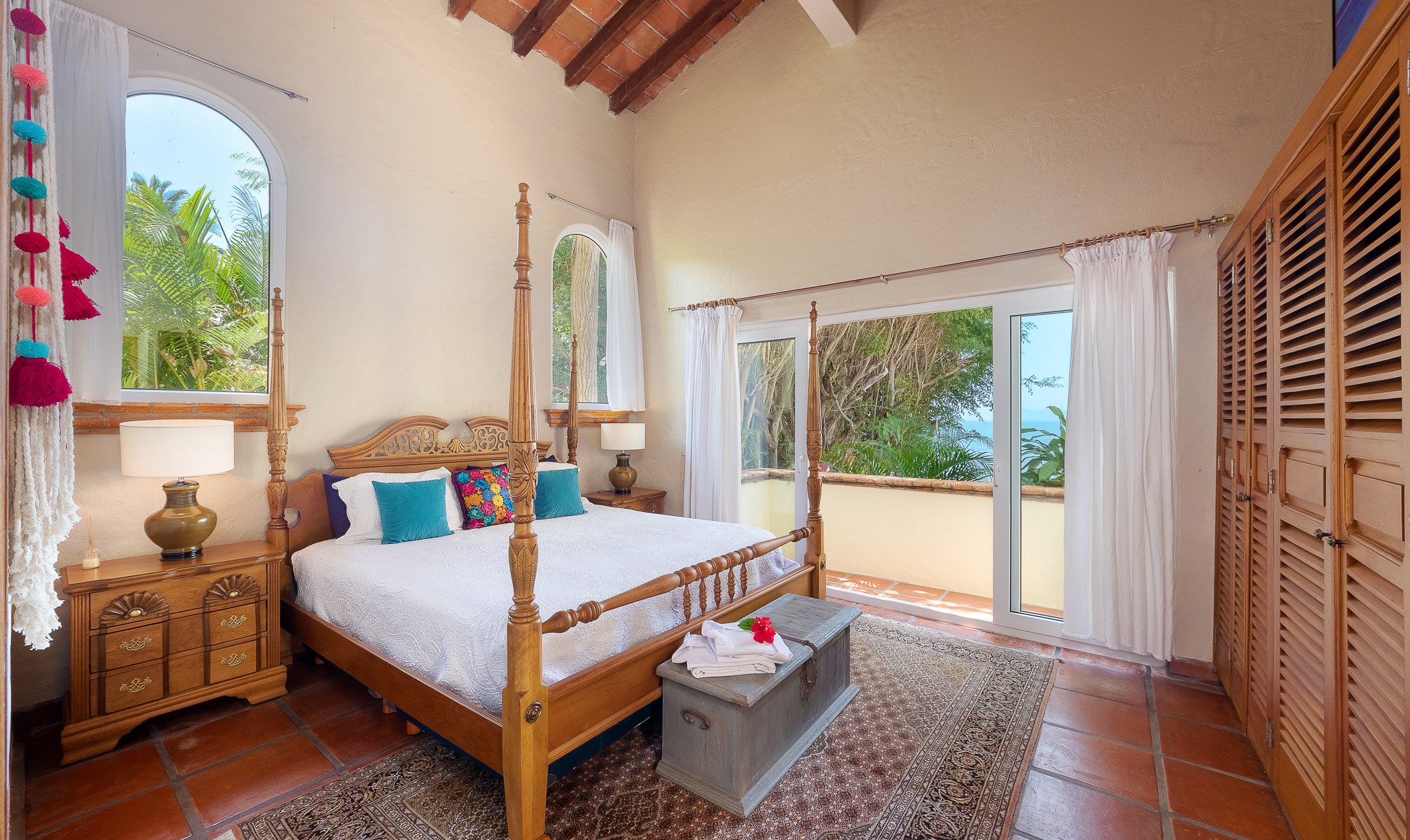 With ten thoughtfully distributed suites, Casa Peregrina accommodates up to 20 guests in comfort and privacy. Each bedroom has its own personality and setting within the estate. On the upper level, Marco’s Master features a king-size bed, ocean view, private terrace, sitting area, TV, and ensuite bathroom, while the Yellow Master offers a king-size bed, ocean view, and ensuite bath. The Canopy Room includes a king-size canopy bed with partial ocean view and ensuite, and the Cupula Room provides two double beds, a peek-a-boo view, TV, and ensuite bathroom.