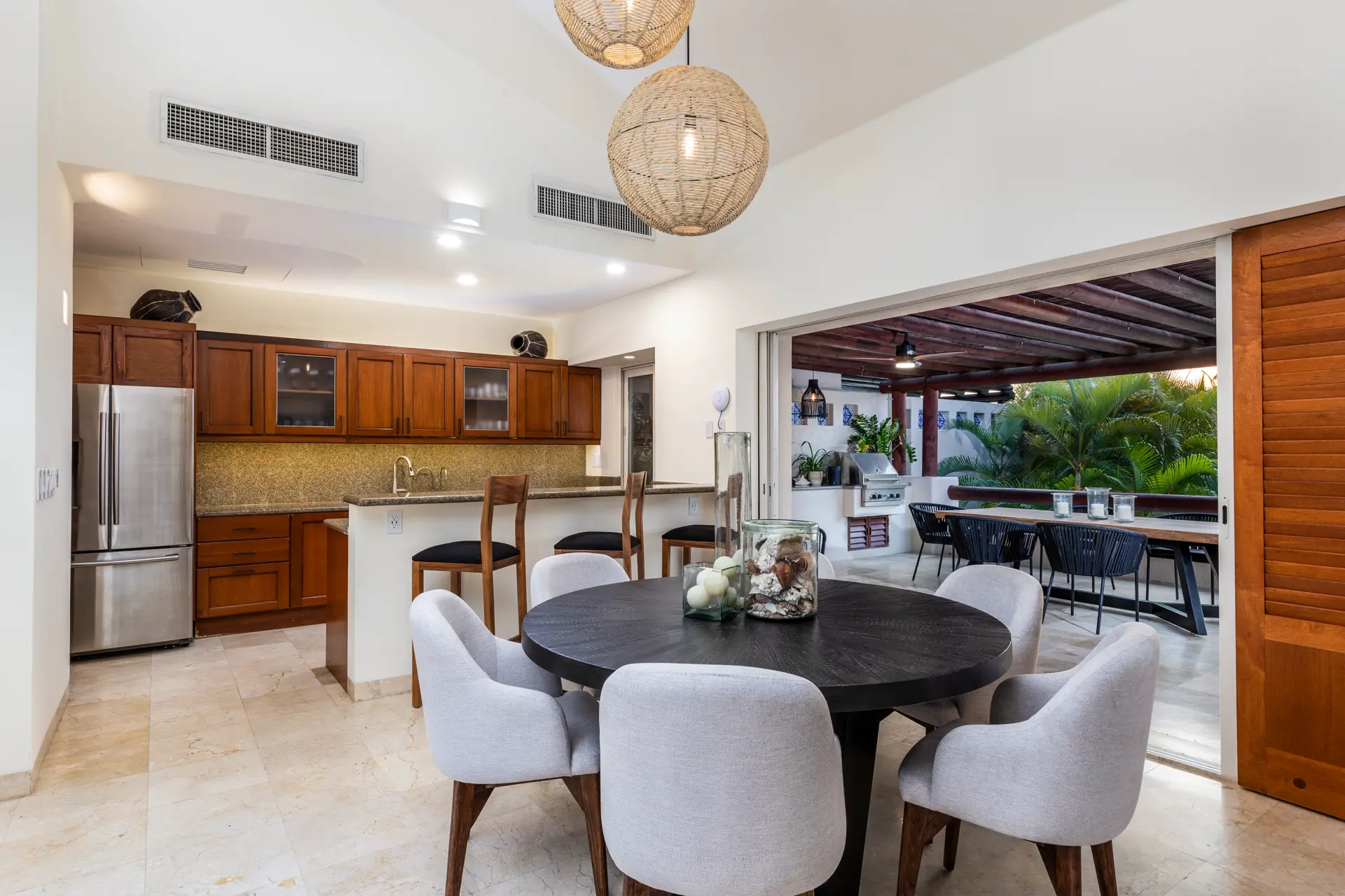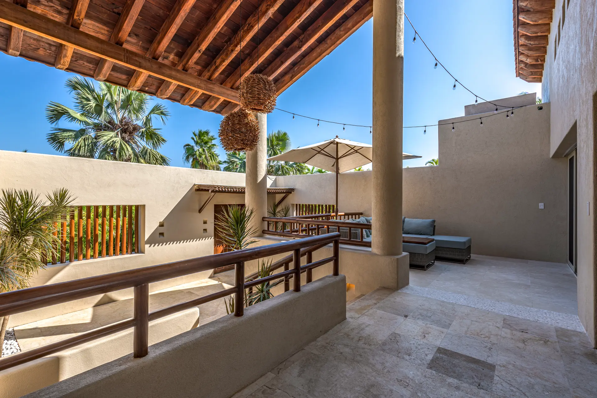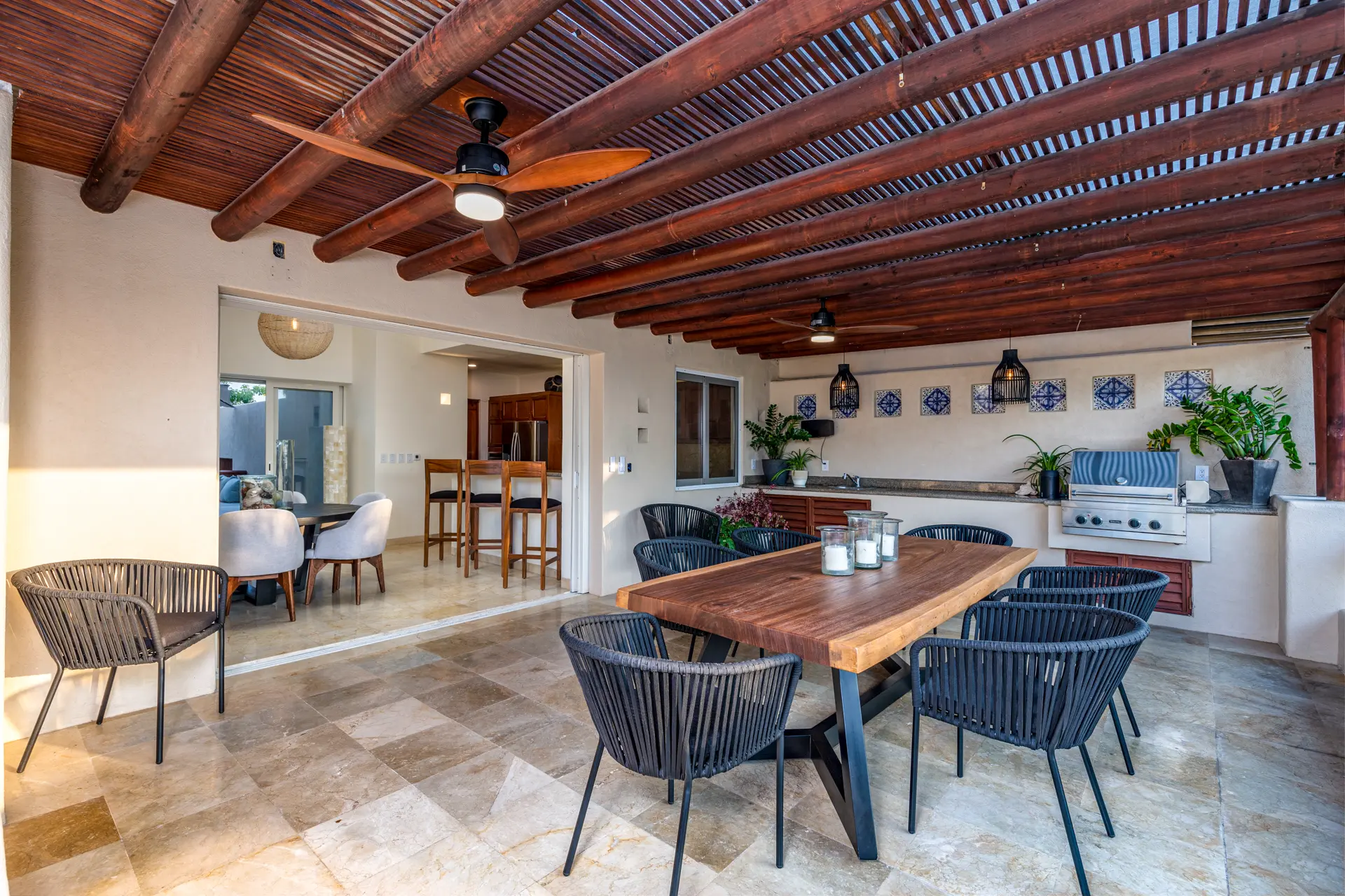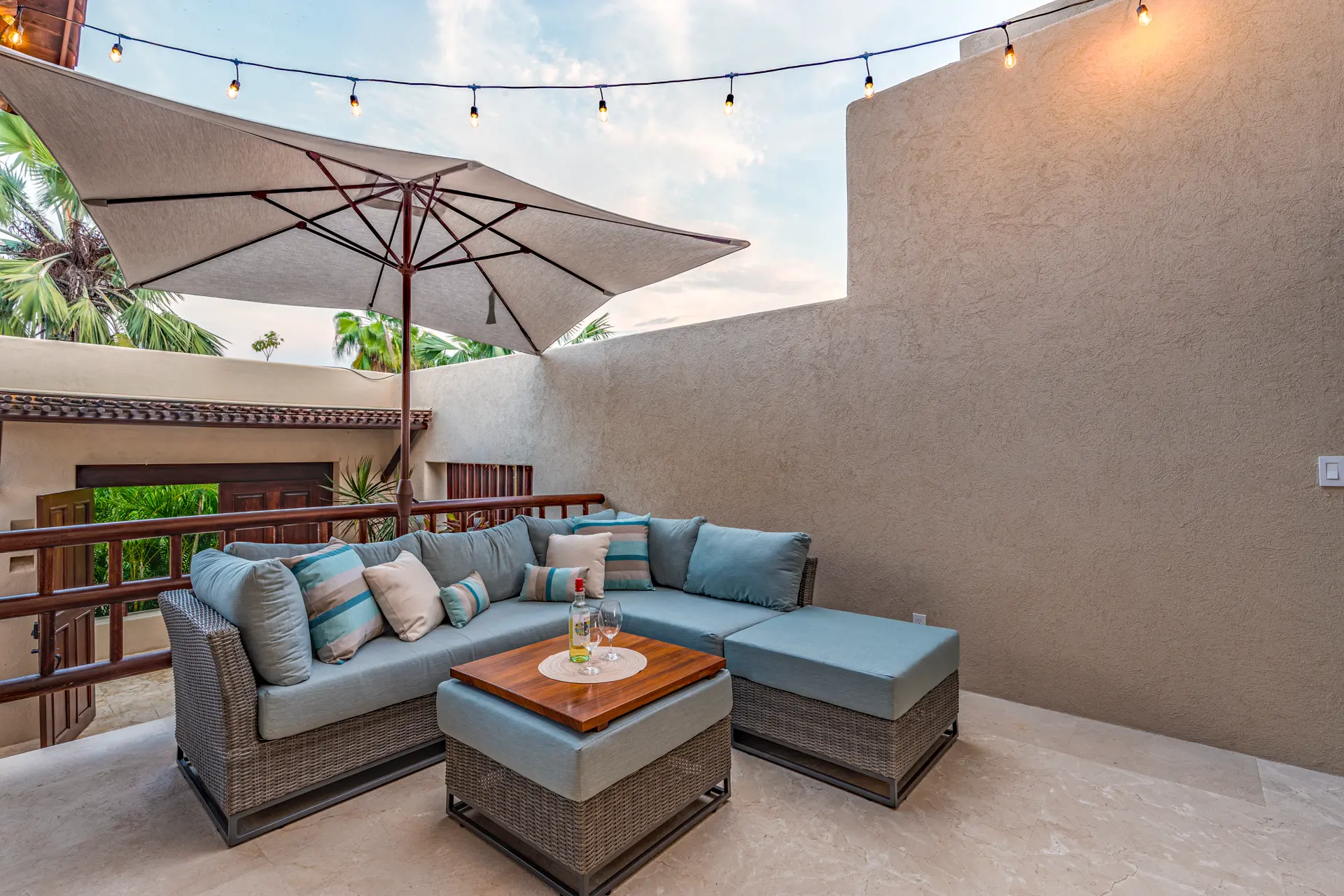 Inside Casa Rayo De Sol, you’ll find high-end furnishings and modern amenities. The main living area features a 75” smart TV, a dining table for eight, and opens to both front and back terraces for additional dining options. The fully equipped kitchen boasts granite counters, stainless steel appliances, and a built-in cappuccino machine. An adjacent terrace includes an 8-person Parota wood dining table and a Viking grill. Additional amenities include a separate TV room with a queen sofa bed, an air-conditioned gym with a Lifecycle and yoga mats, and a 14’ by 11’ fitness room with a flat-screen TV.