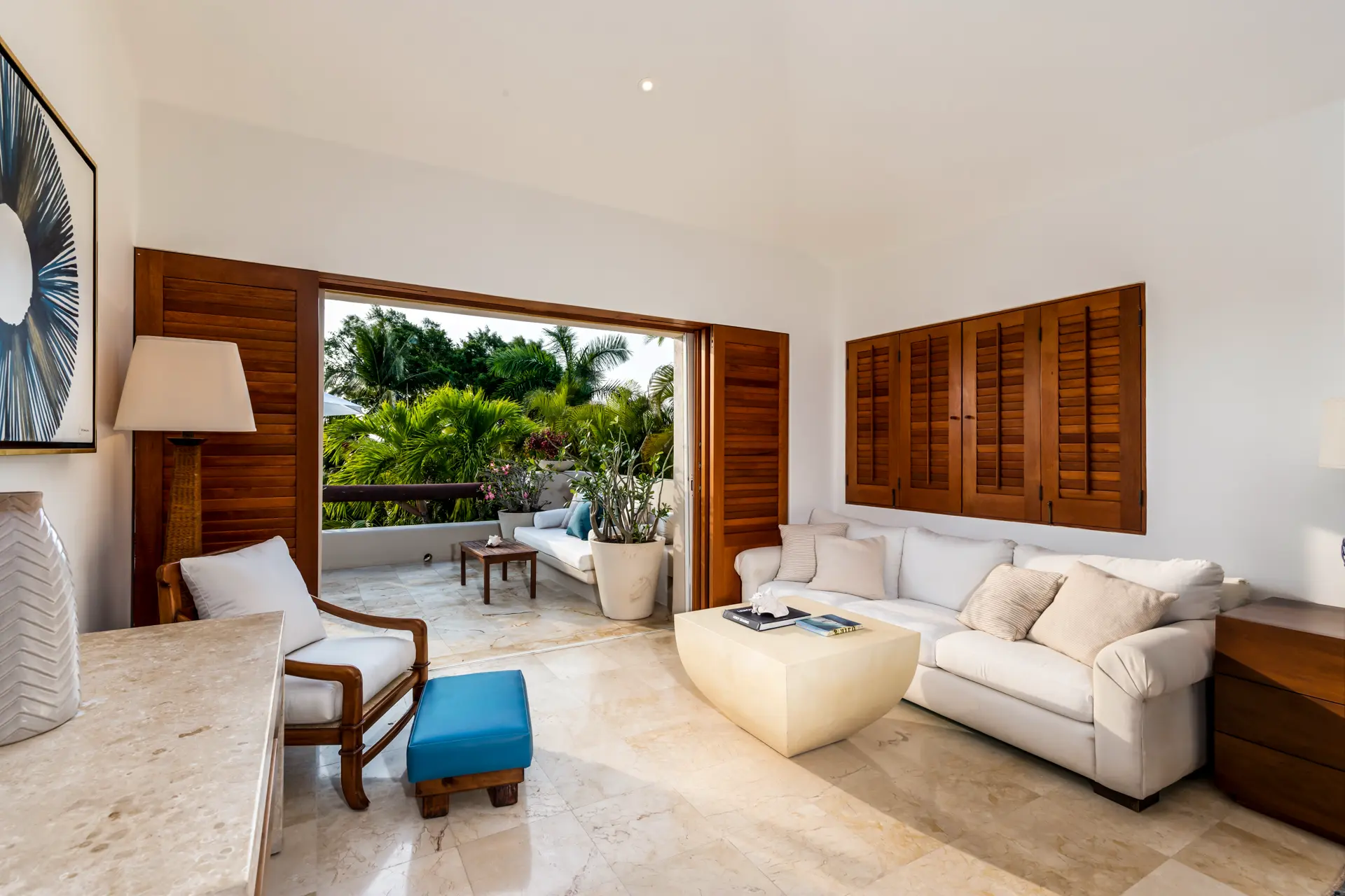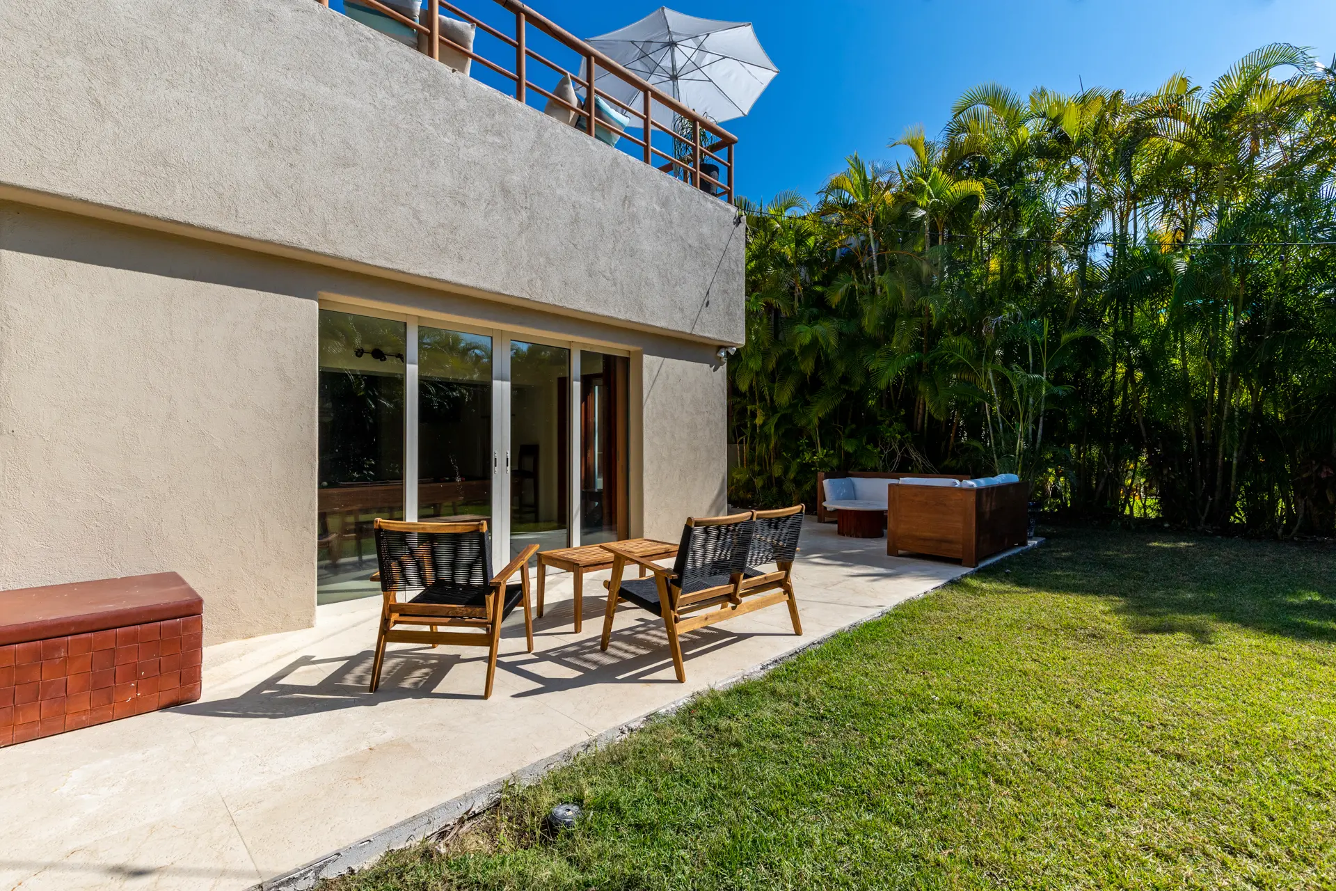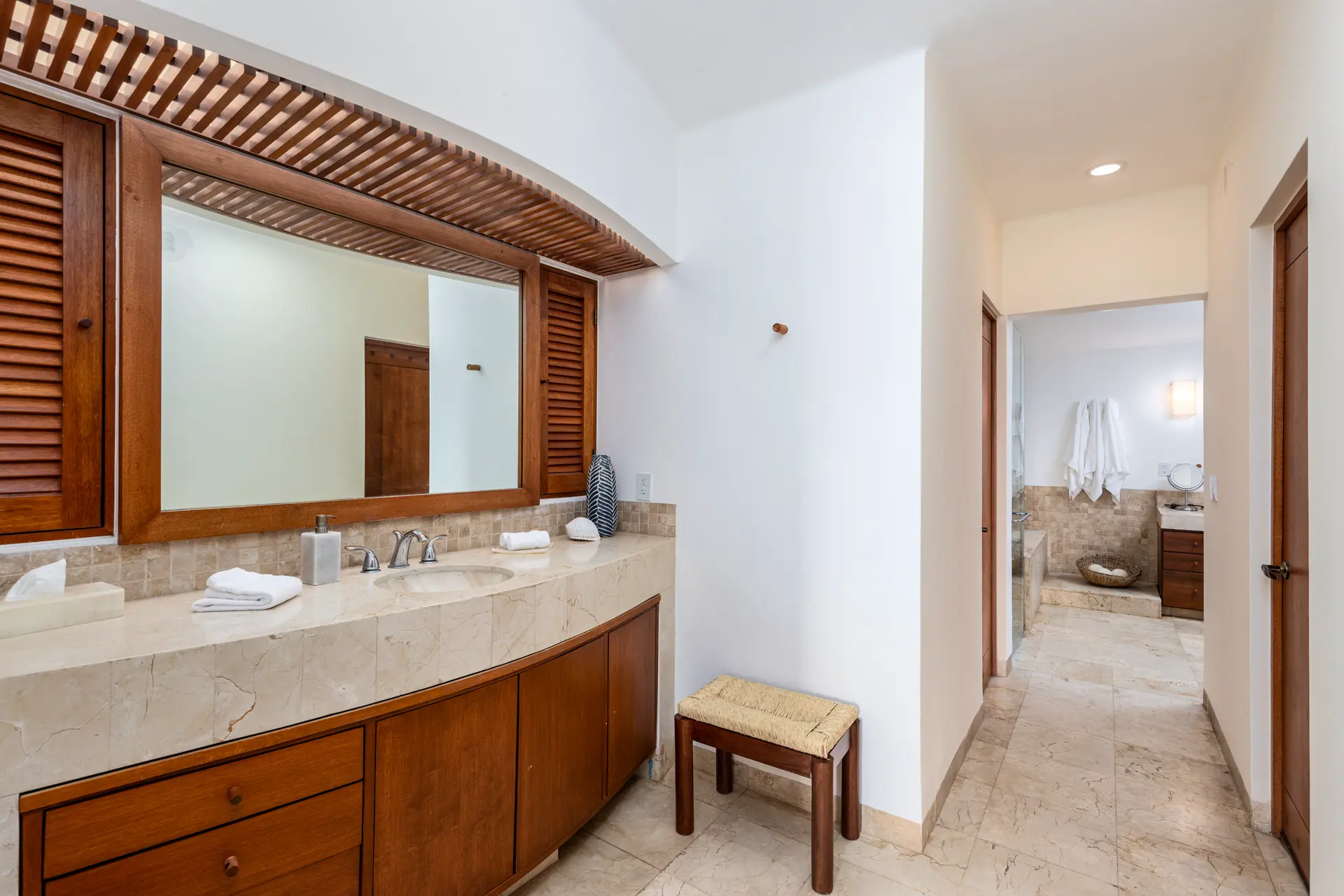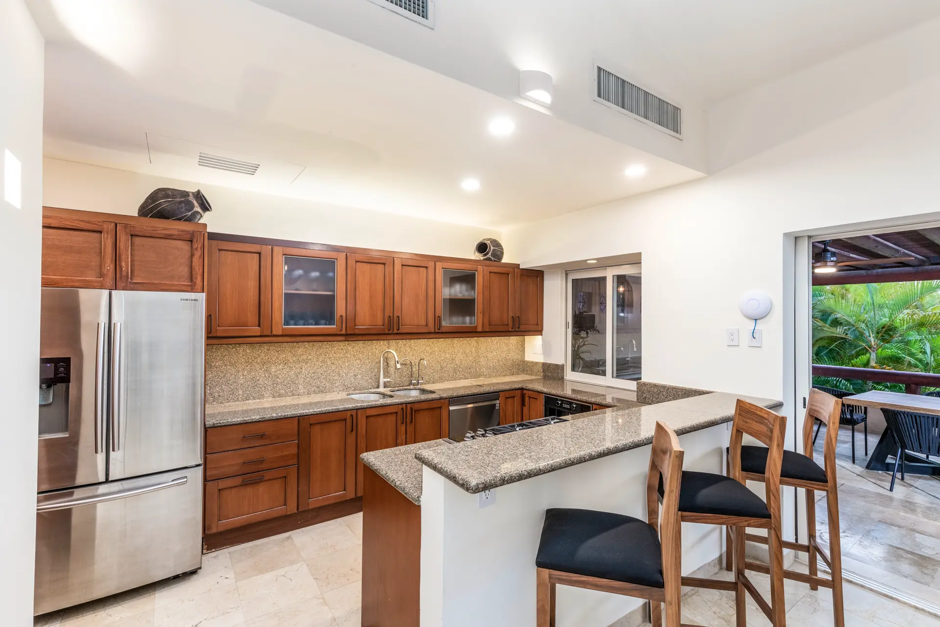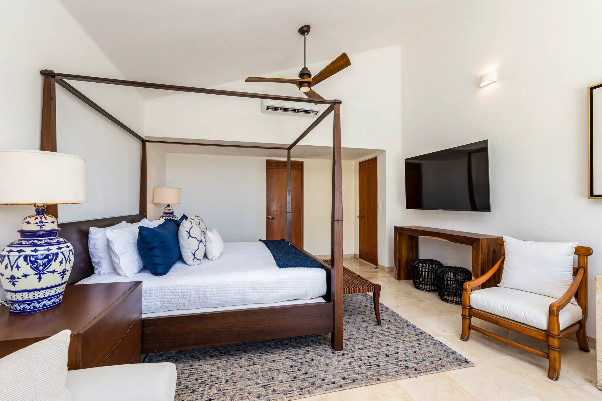 Inside Casa Rayo De Sol, you’ll find high-end furnishings and modern amenities. The main living area features a 75” smart TV, a dining table for eight, and opens to both front and back terraces for additional dining options. The fully equipped kitchen boasts granite counters, stainless steel appliances, and a built-in cappuccino machine. An adjacent terrace includes an 8-person Parota wood dining table and a Viking grill. Additional amenities include a separate TV room with a queen sofa bed, an air-conditioned gym with a Lifecycle and yoga mats, and a 14’ by 11’ fitness room with a flat-screen TV.