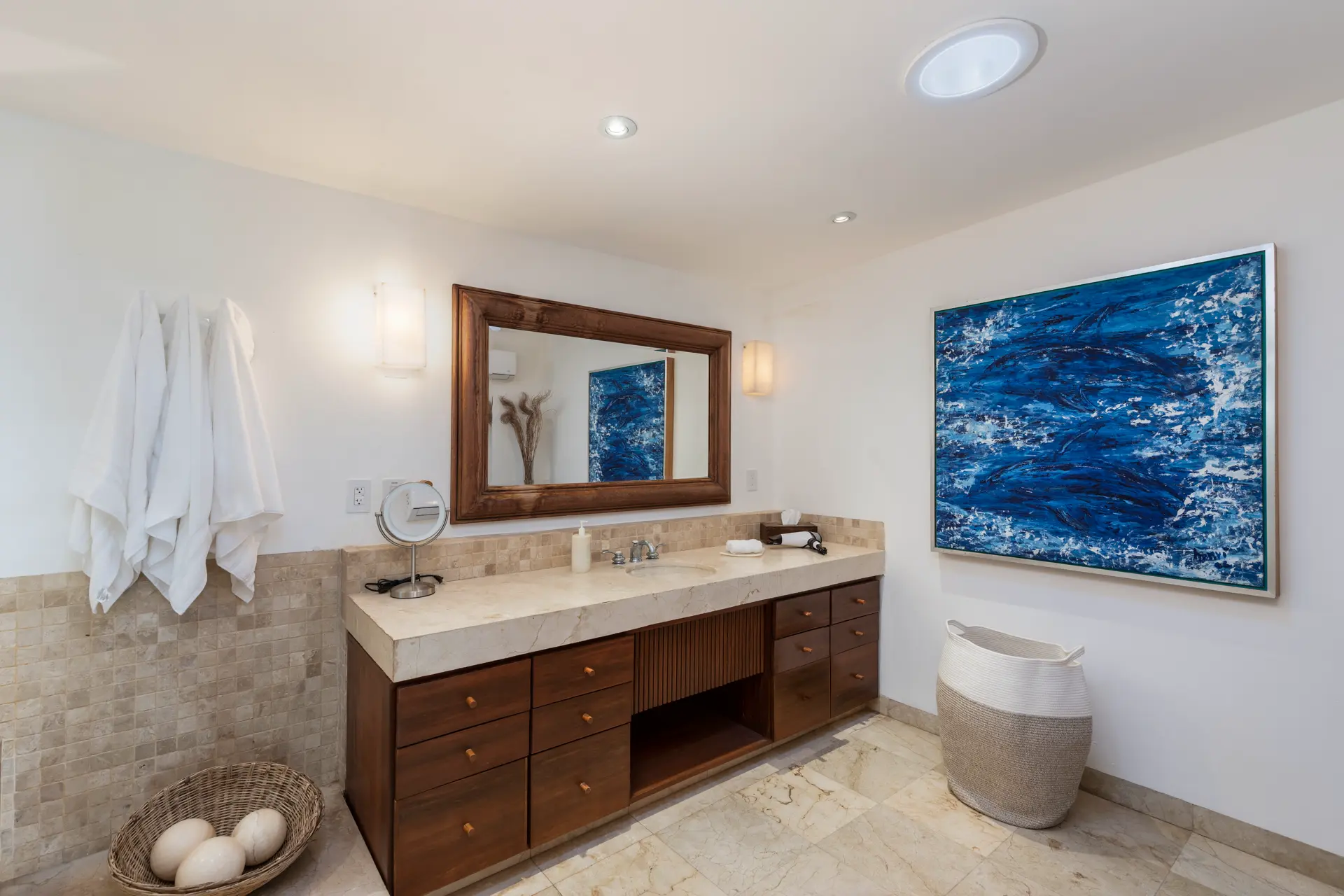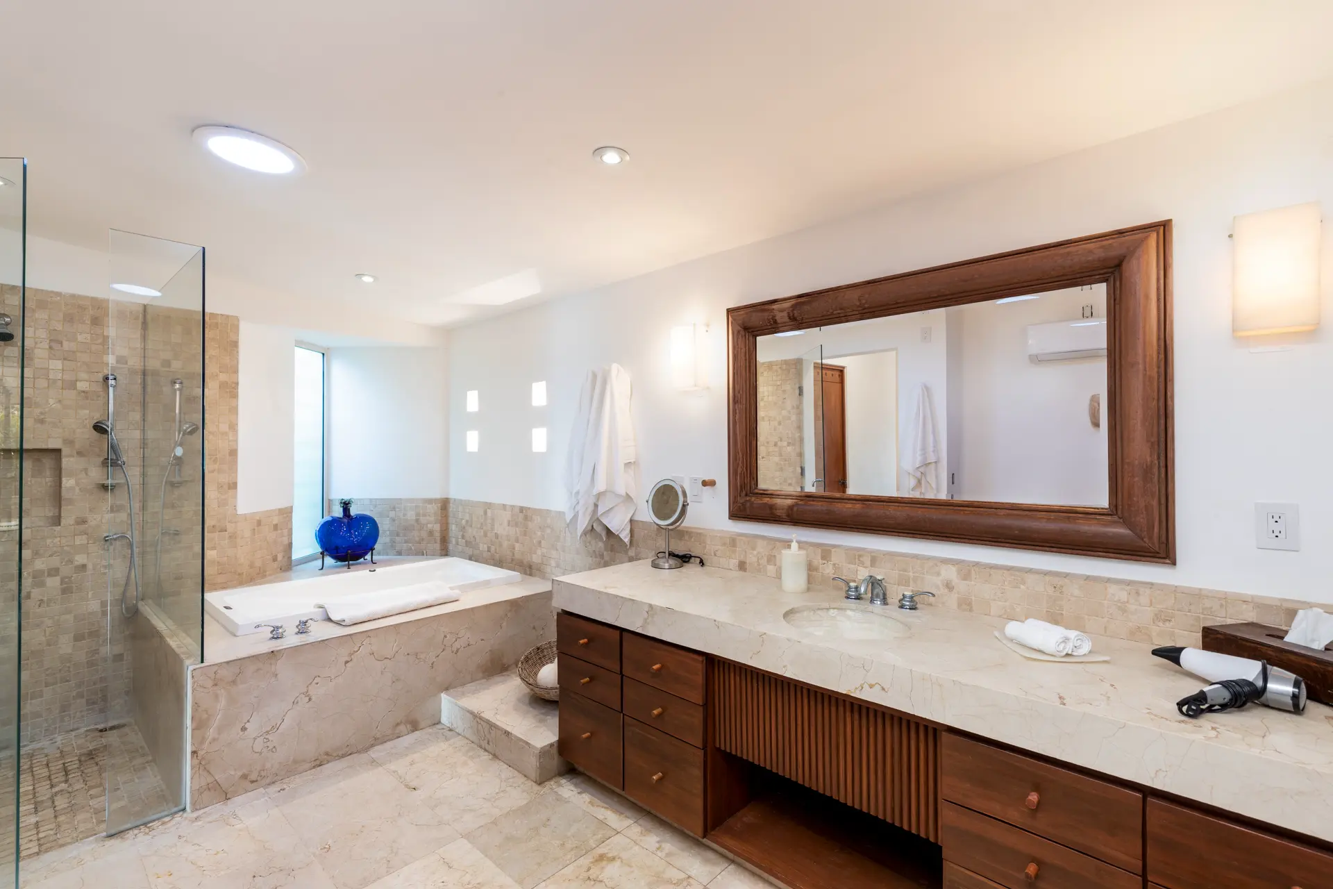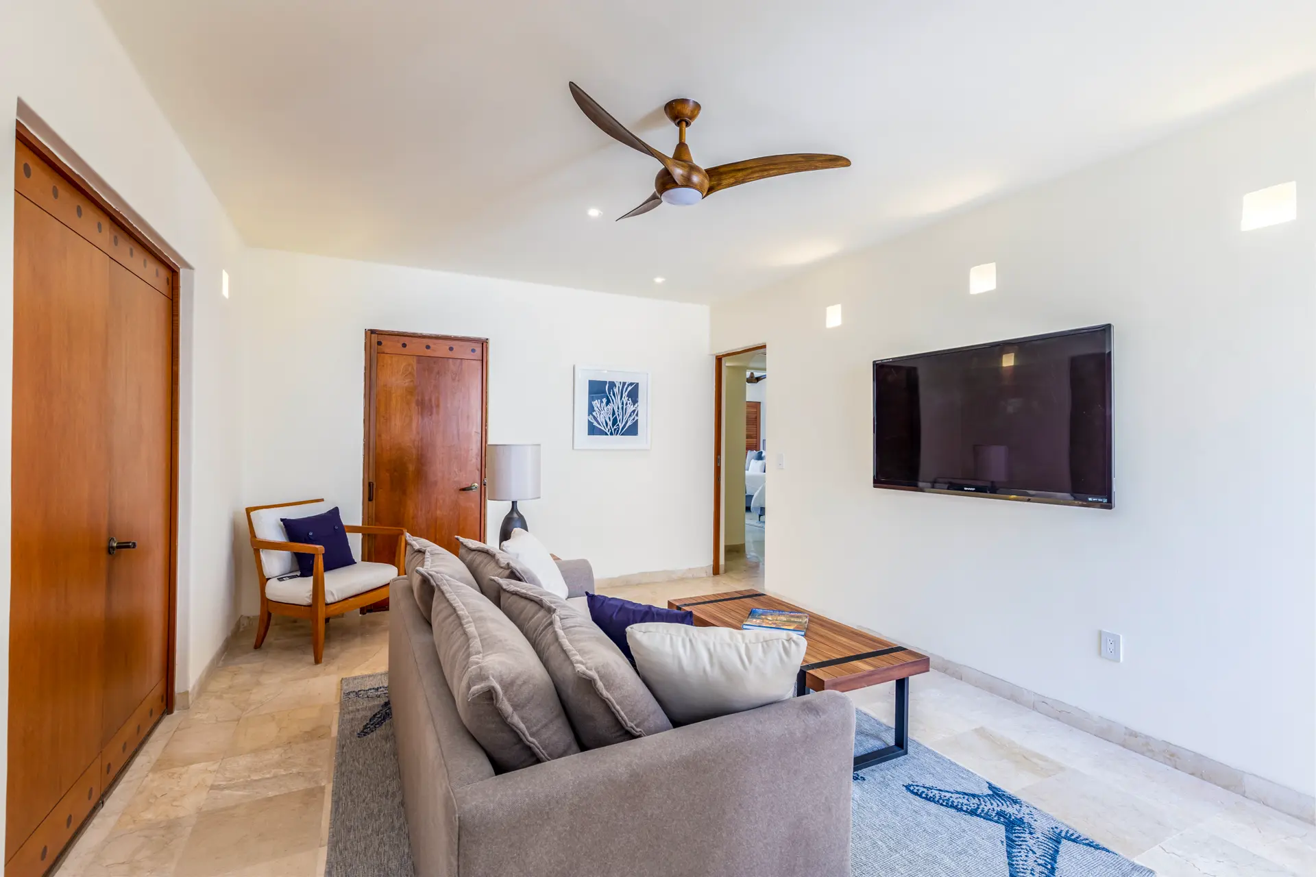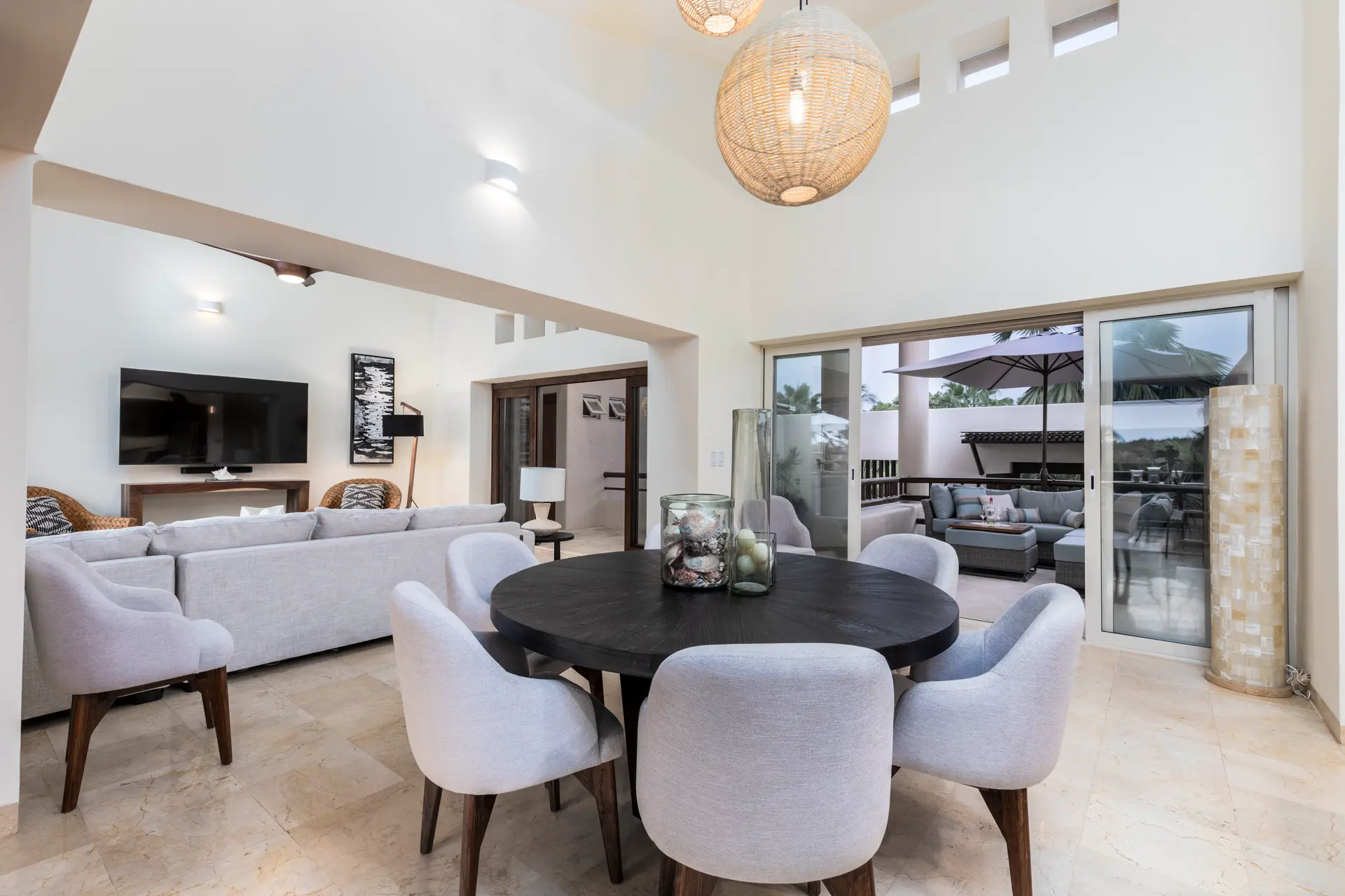 Inside Casa Rayo De Sol, you’ll find high-end furnishings and modern amenities. The main living area features a 75” smart TV, a dining table for eight, and opens to both front and back terraces for additional dining options. The fully equipped kitchen boasts granite counters, stainless steel appliances, and a built-in cappuccino machine. An adjacent terrace includes an 8-person Parota wood dining table and a Viking grill. Additional amenities include a separate TV room with a queen sofa bed, an air-conditioned gym with a Lifecycle and yoga mats, and a 14’ by 11’ fitness room with a flat-screen TV.