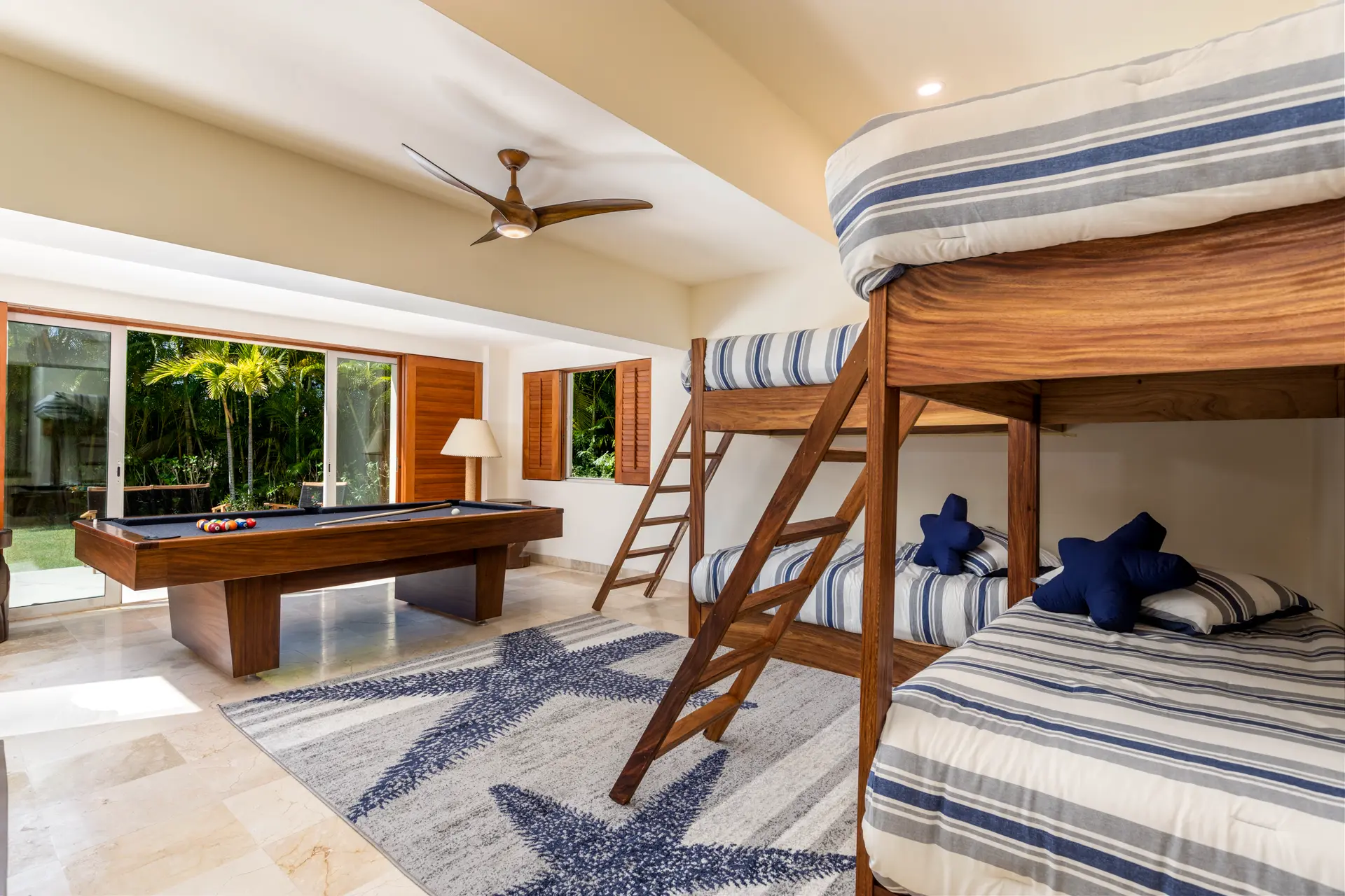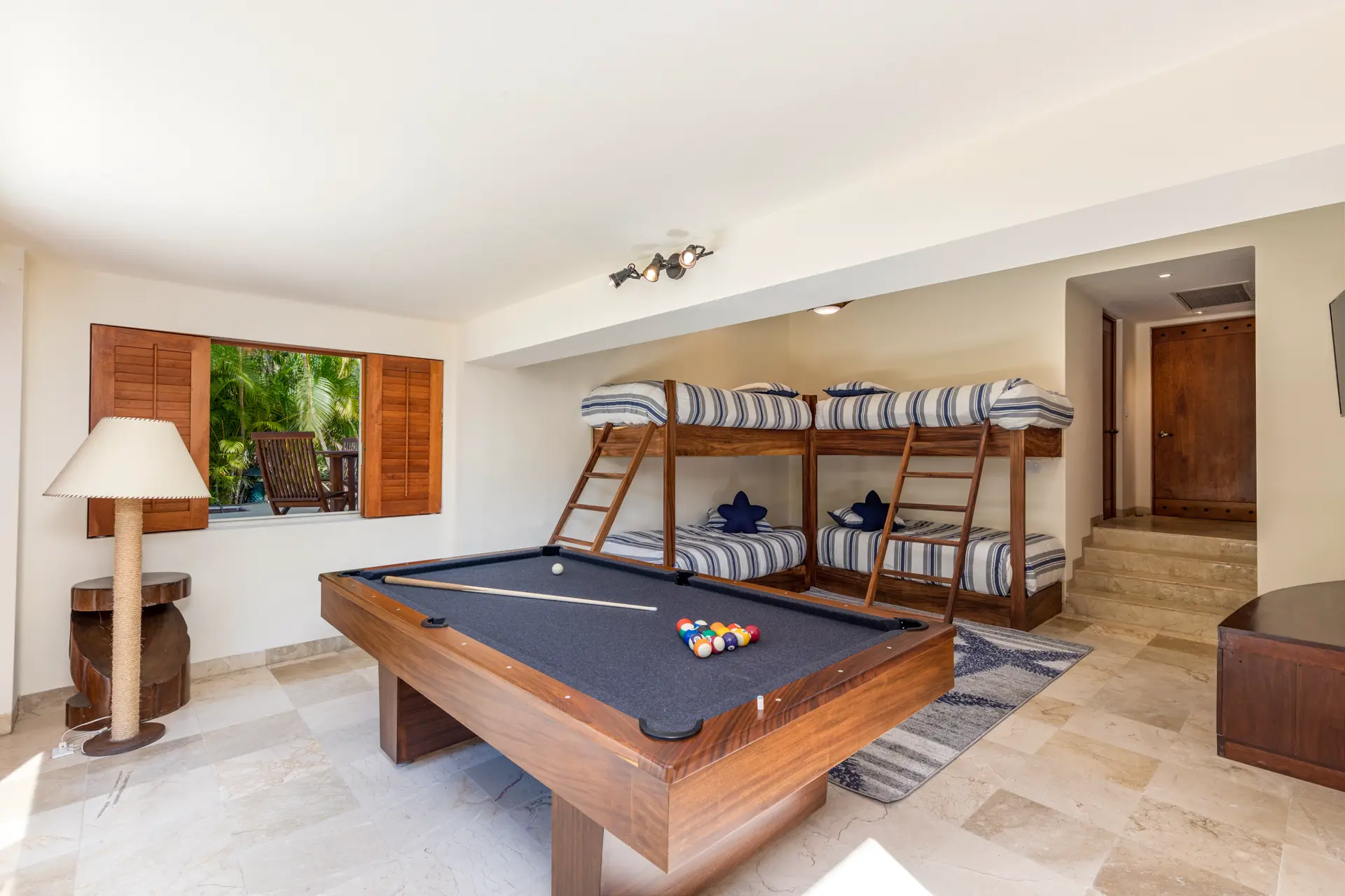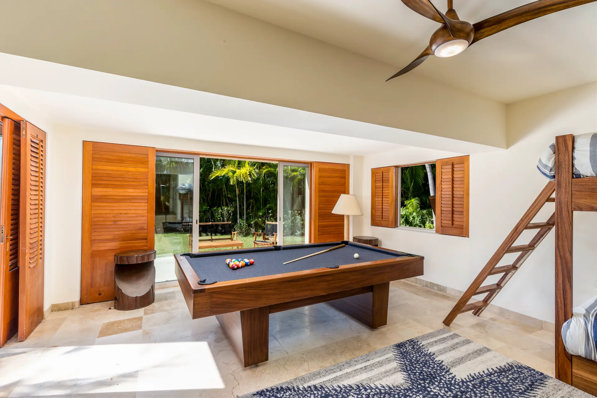 The fourth bedroom, a game room, features two bunk beds, a flat-screen TV, and an 8-foot pool table. It opens to the backyard patio and includes built-in closets and a bathroom with a shower.