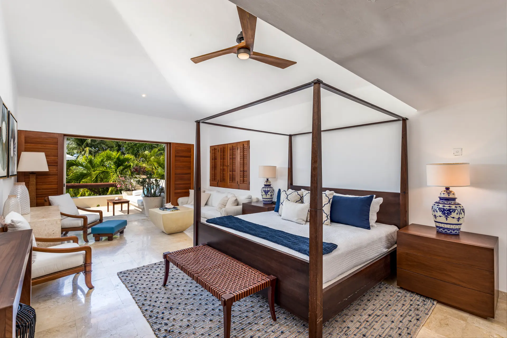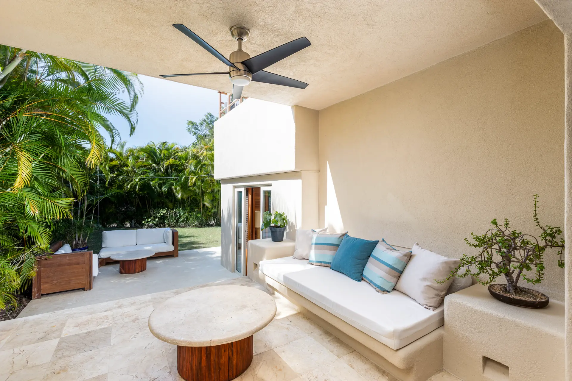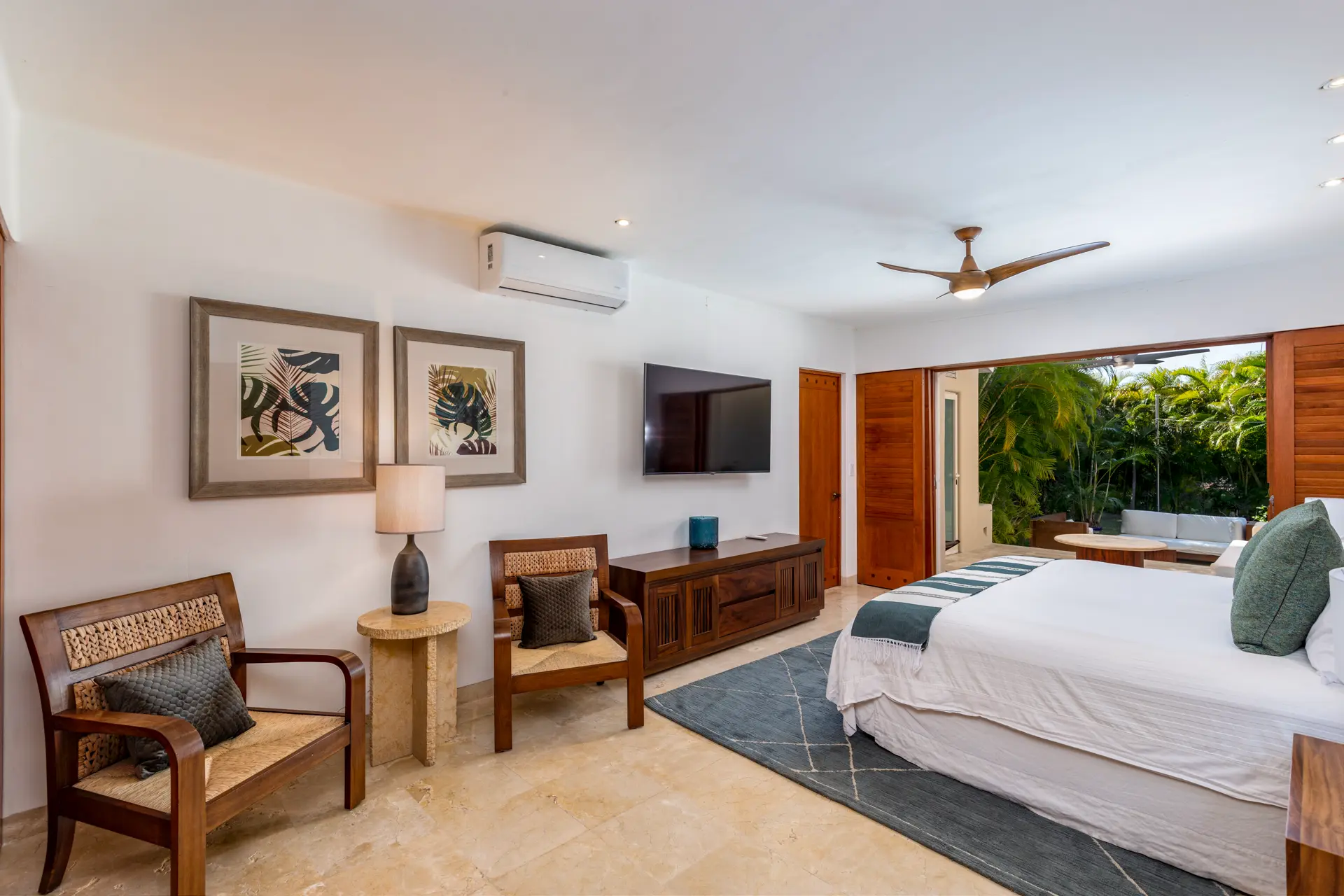 The second main bedroom offers a king bed, a flat-screen TV, and an ensuite bathroom with a double shower and an outdoor tub. This room opens to a private covered patio with a daybed and a fan, providing views of the lush backyard landscaping.