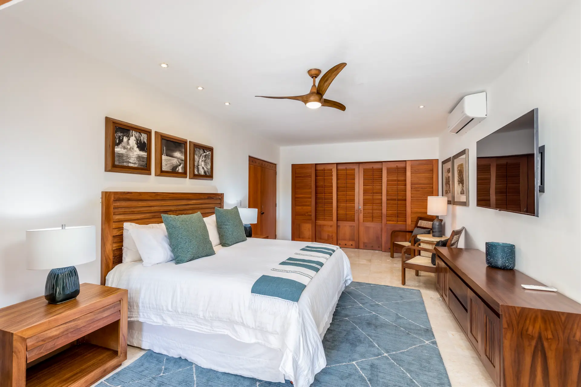 The upstairs main suite features a king bed, flat-screen TV, and an extra-large bathroom with two separate vanity areas, a shower, a bathtub, and a large walk-in closet. The suite also includes a toilet and a bidet and opens to an expansive terrace.