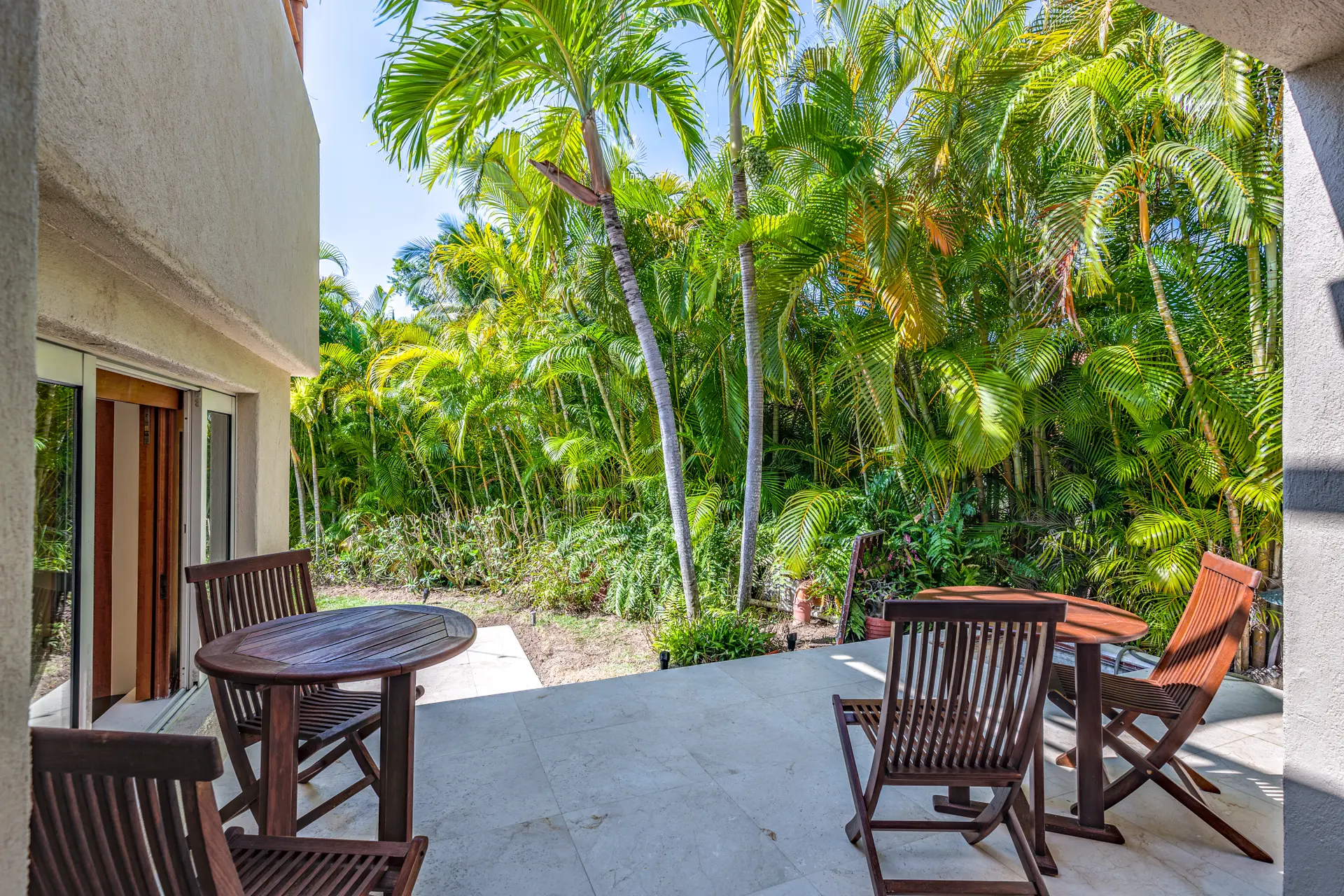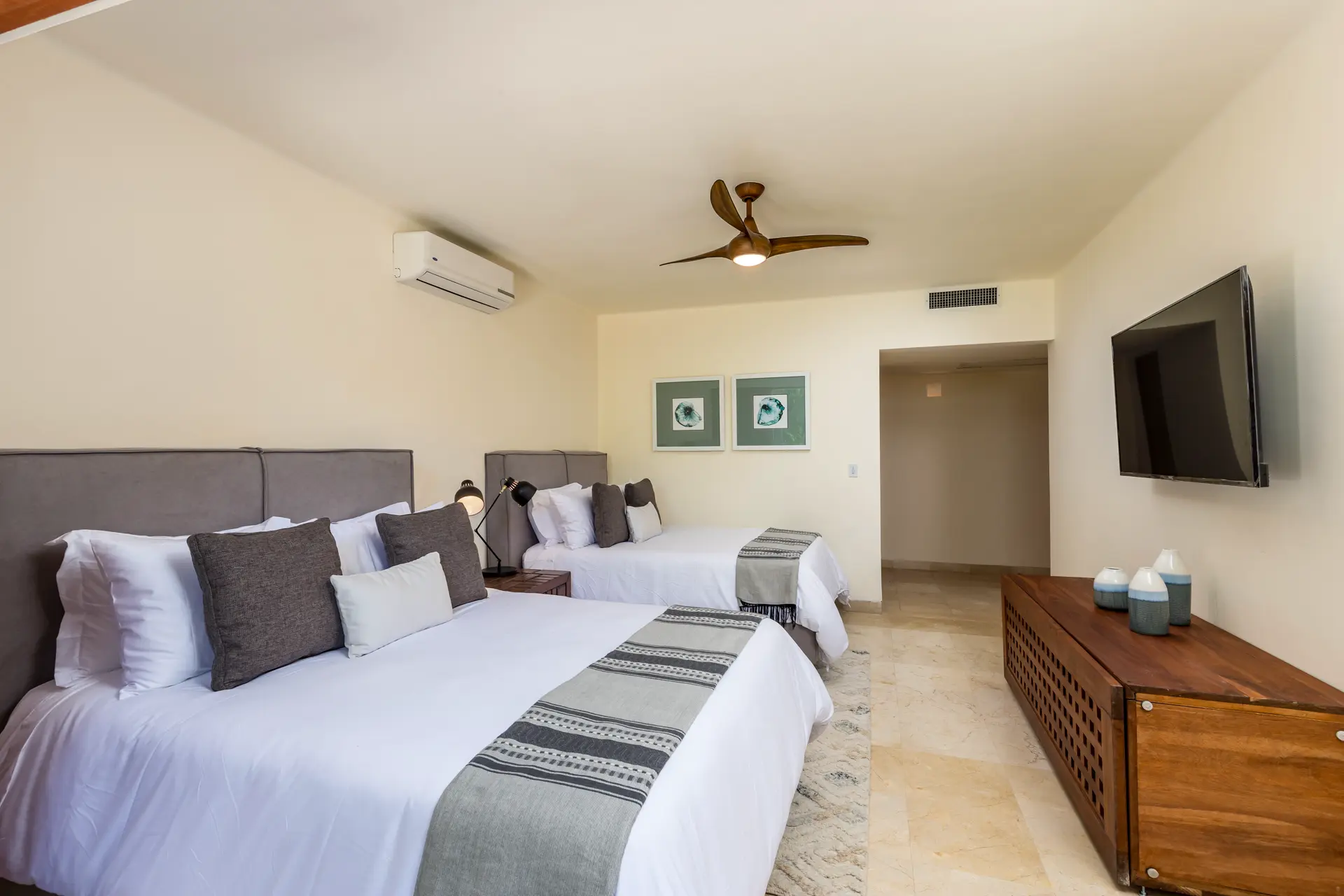 The third bedroom includes two queen beds, a large walk-in closet, a tub, and a shower. It opens to a private outside patio, offering a tranquil retreat.