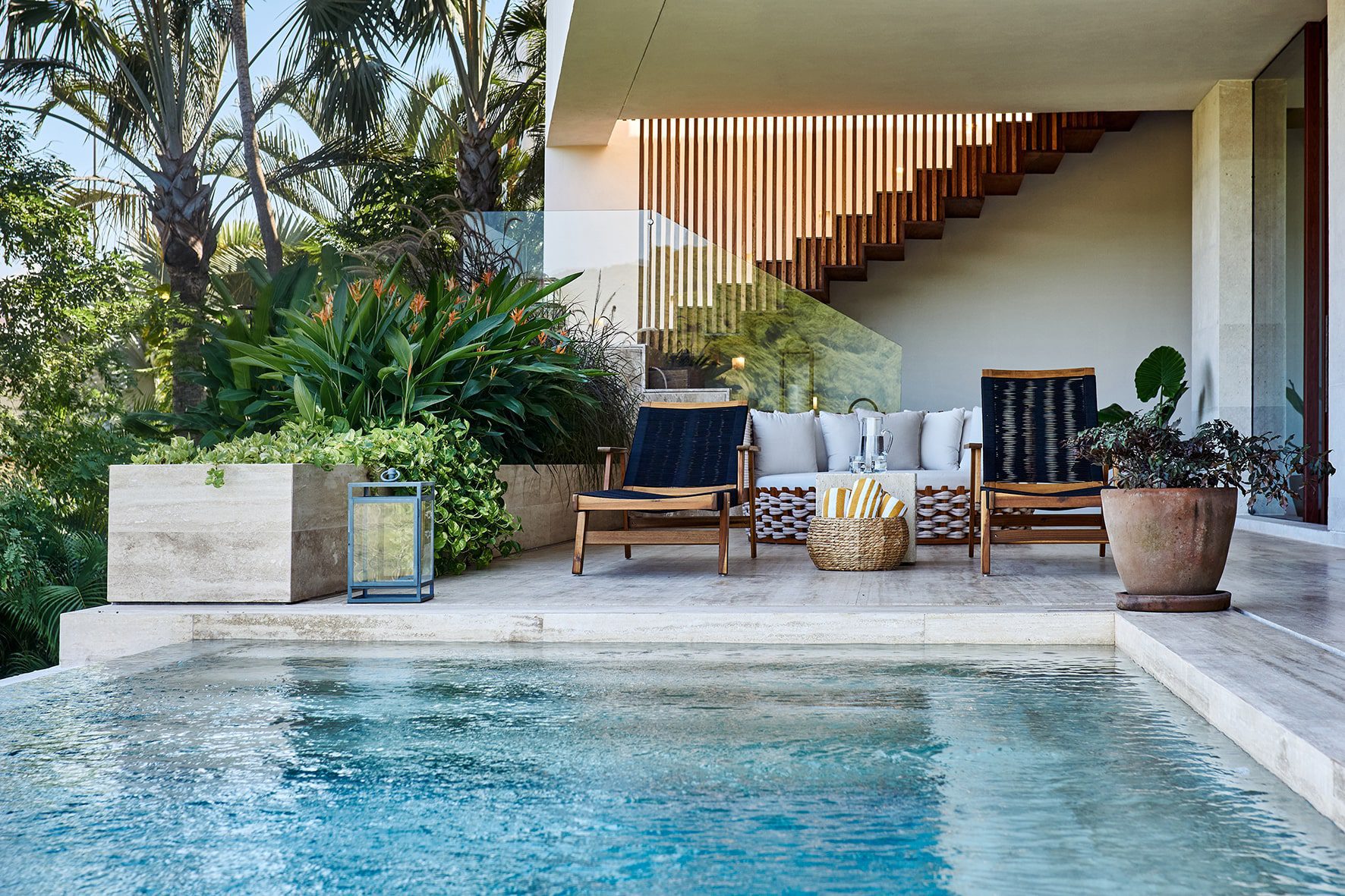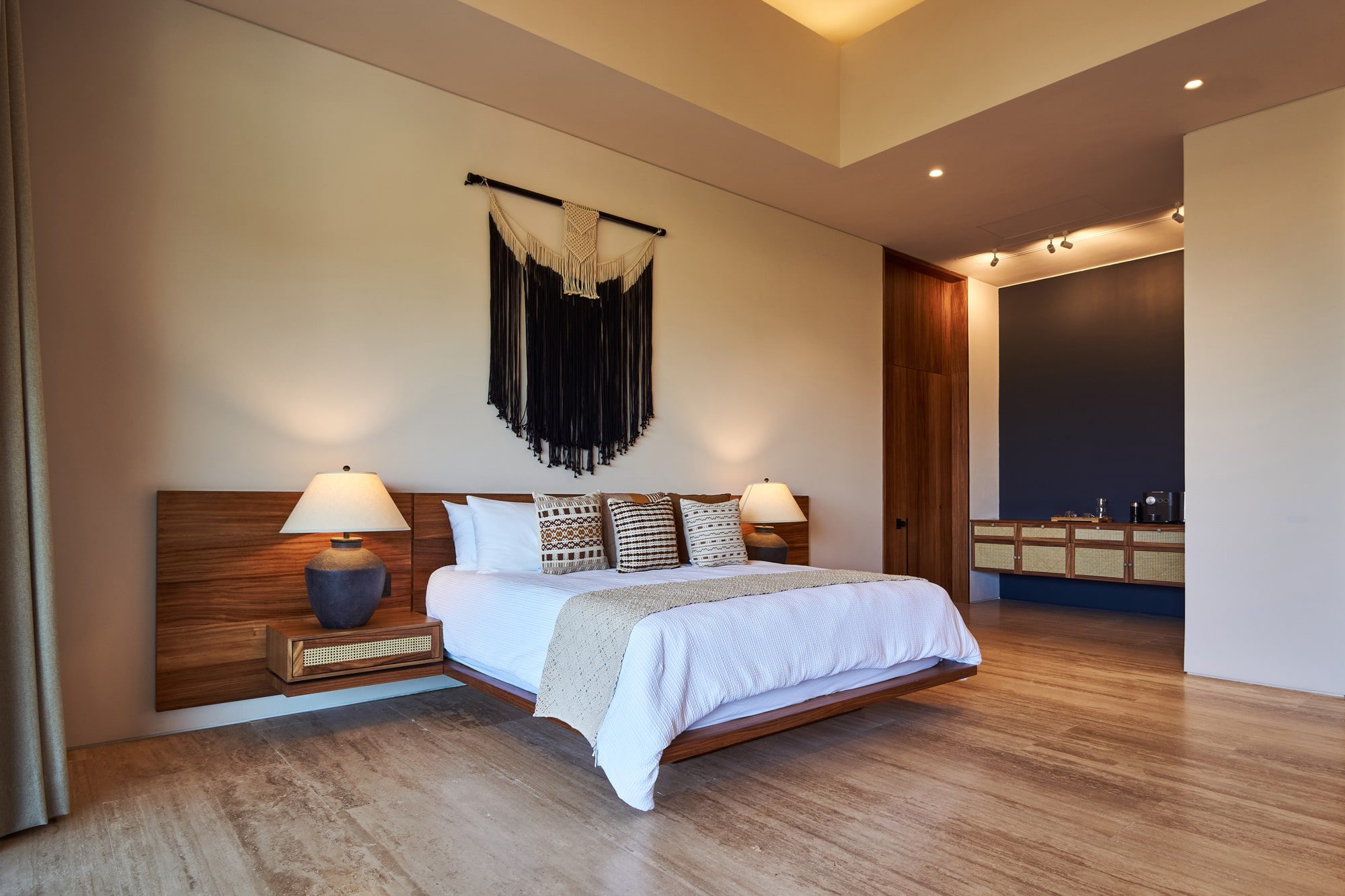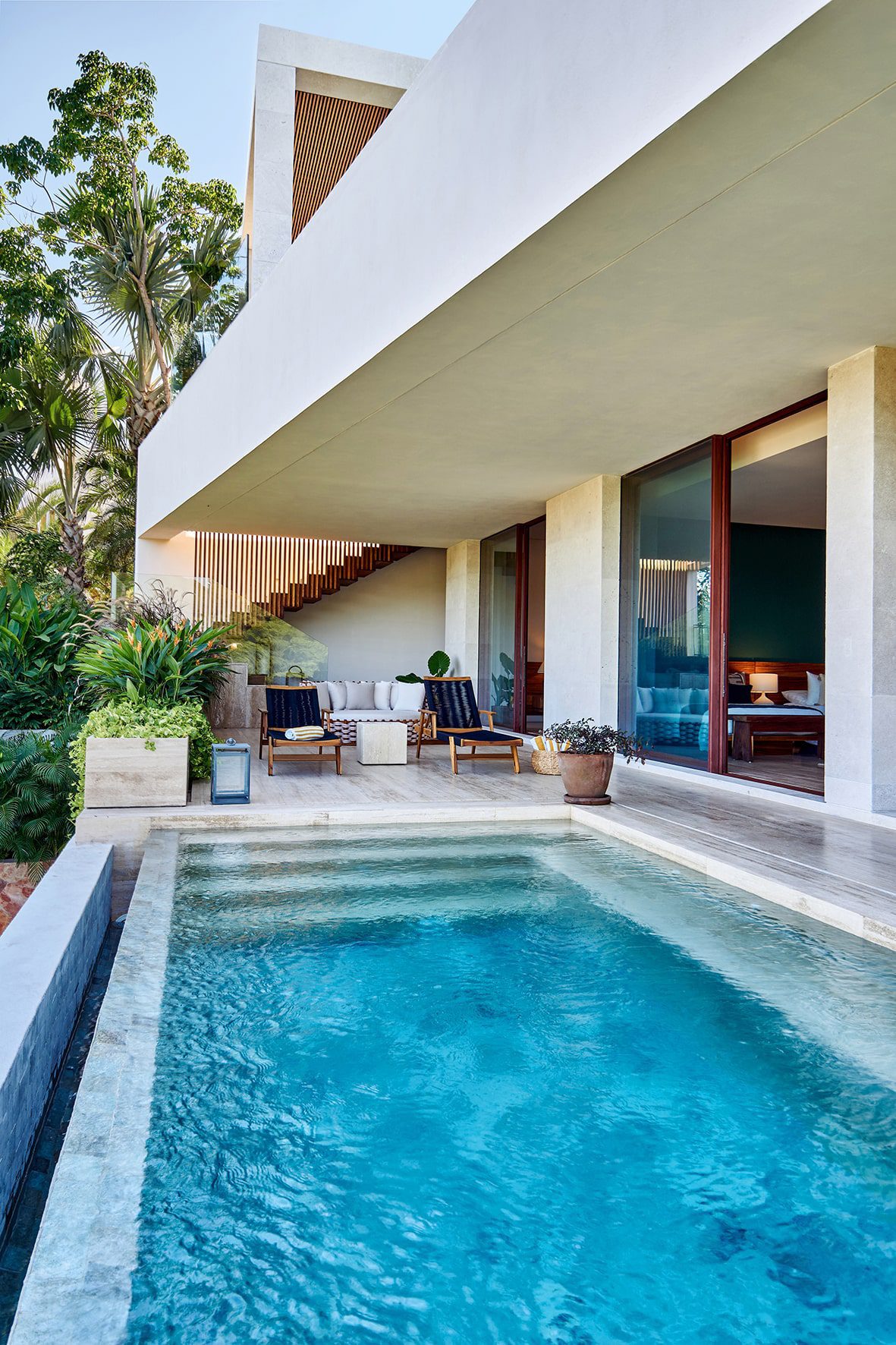 With two private pools and five well-appointed bedrooms, Casa Sirenas is spacious. An adaptive media room can also serve as an extra bedroom, comfortably housing up to 12 guests. The villa’s design emphasizes natural materials and neutral colors, peppered with distinct Mexican touches.